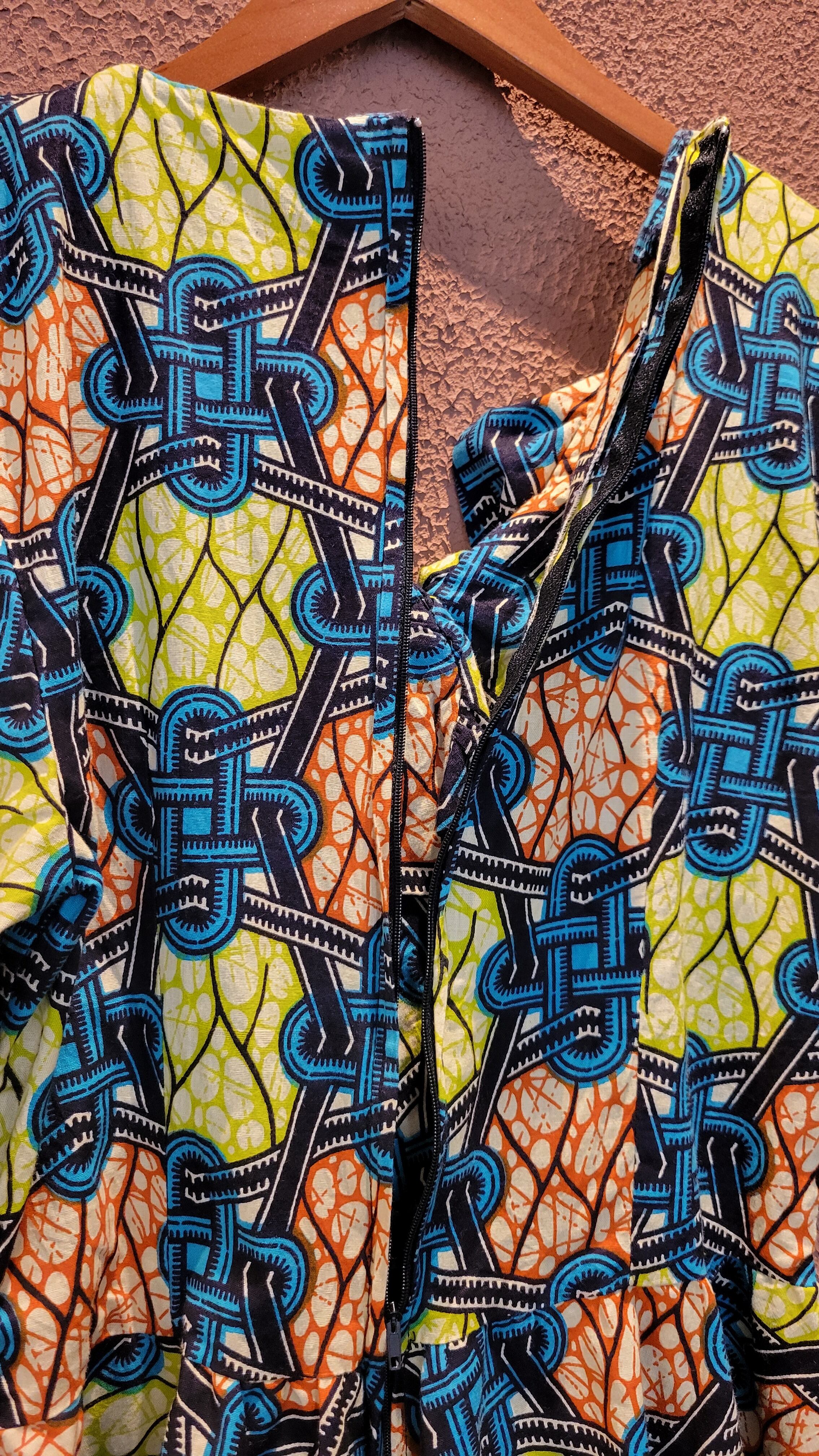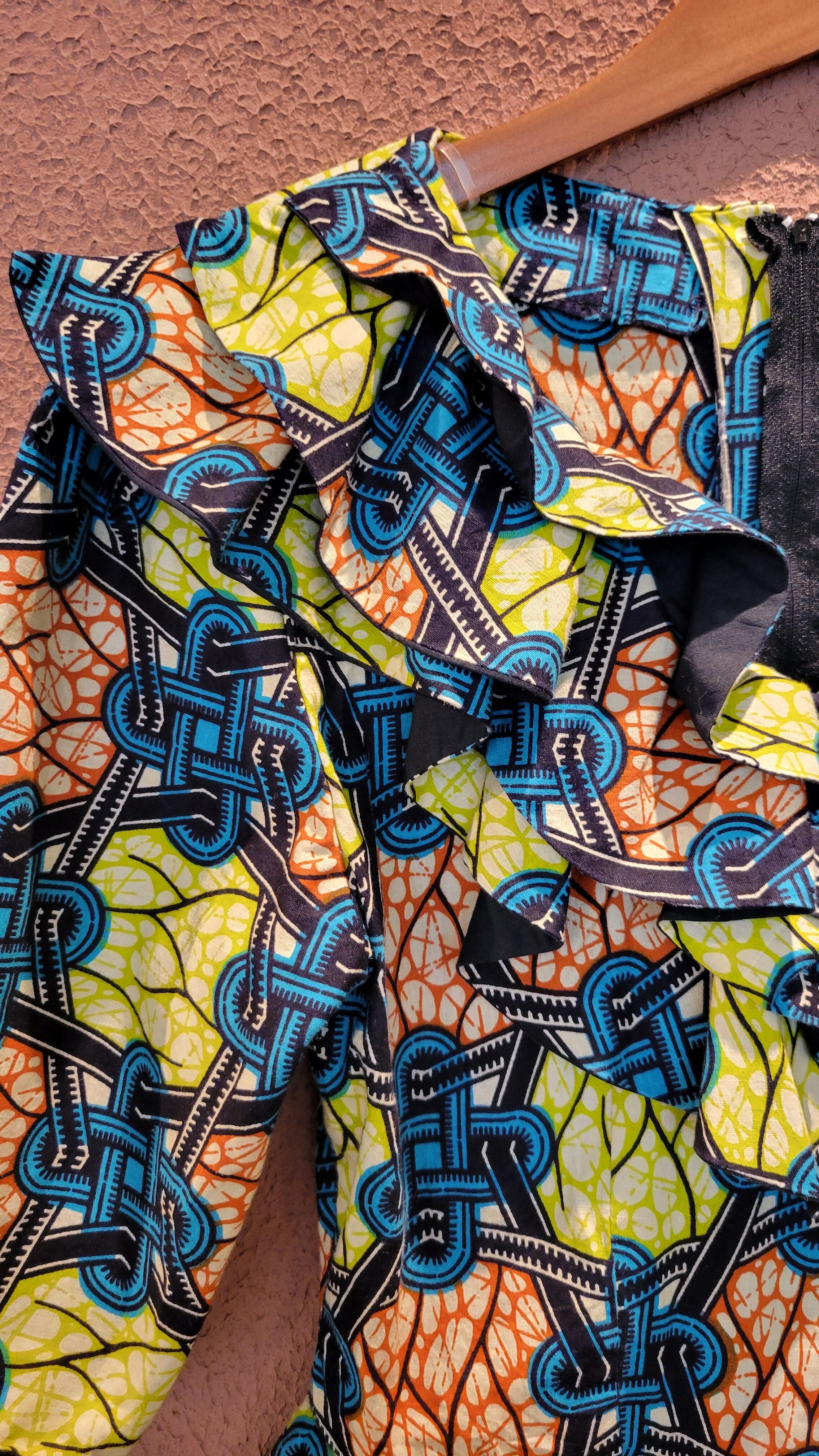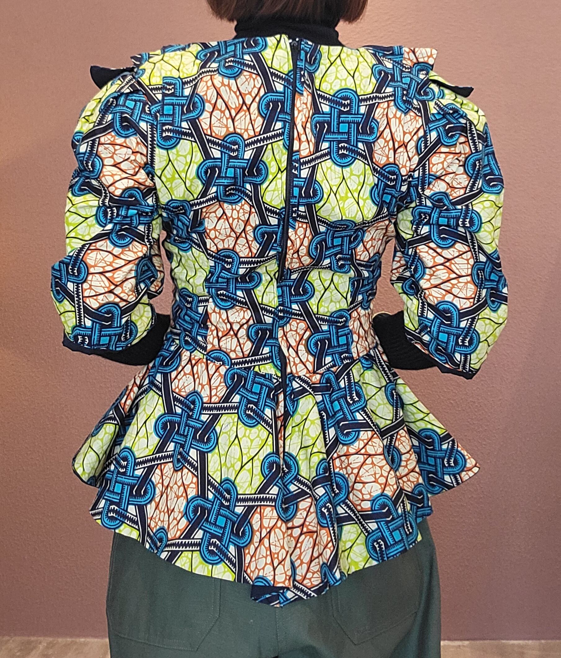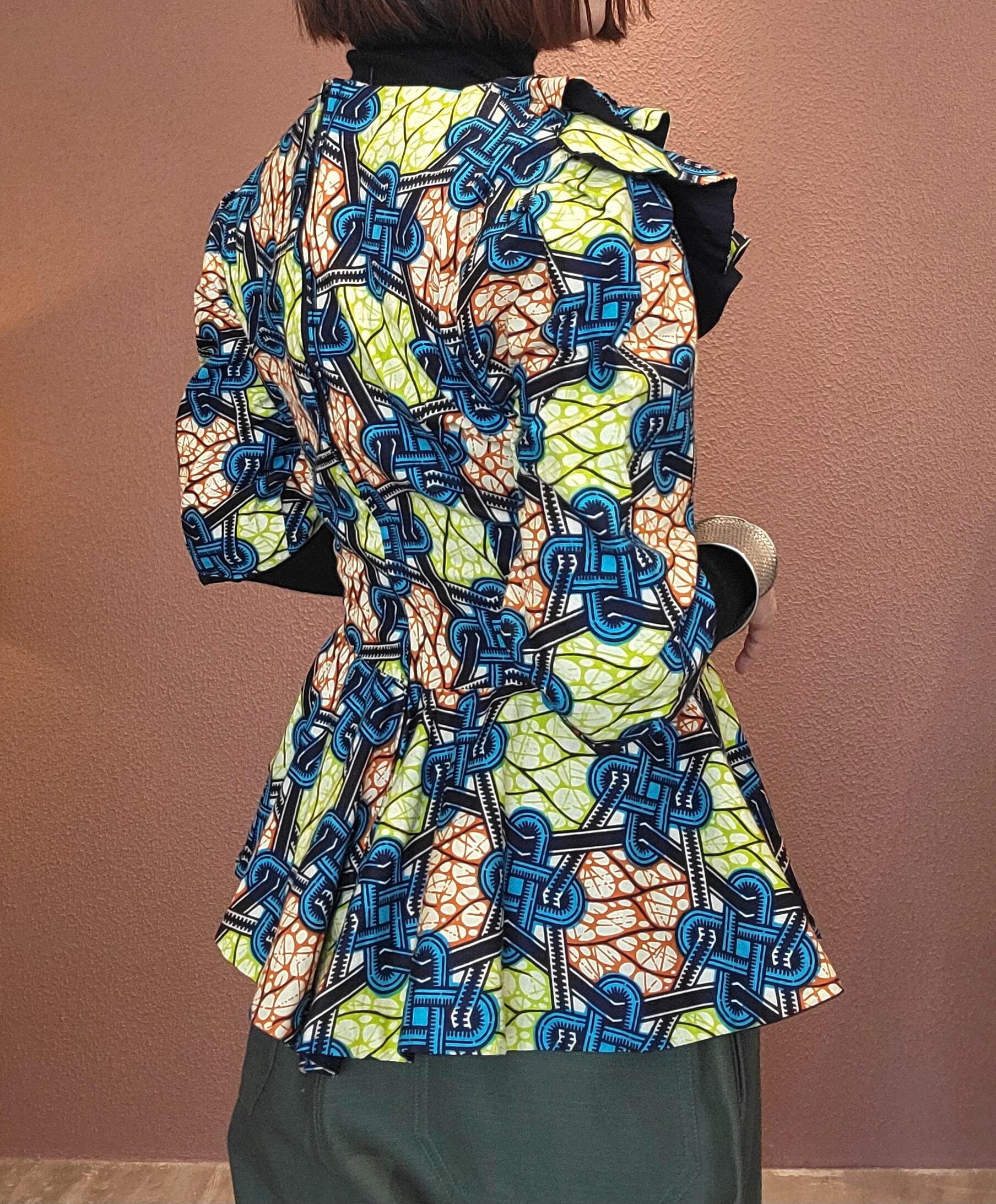 ヴィンテージのアフリカンバティックのトップス。素材表記はありませんが張り感のあるしっかりしたコットンです。バックファスナー付きで着脱がスムーズ。程よい深さのVネックとフリルがお顔周りを華やかに。ウエストは細身できゅっと締まり裾にかけてフレアが広がるペプラムデザインです。