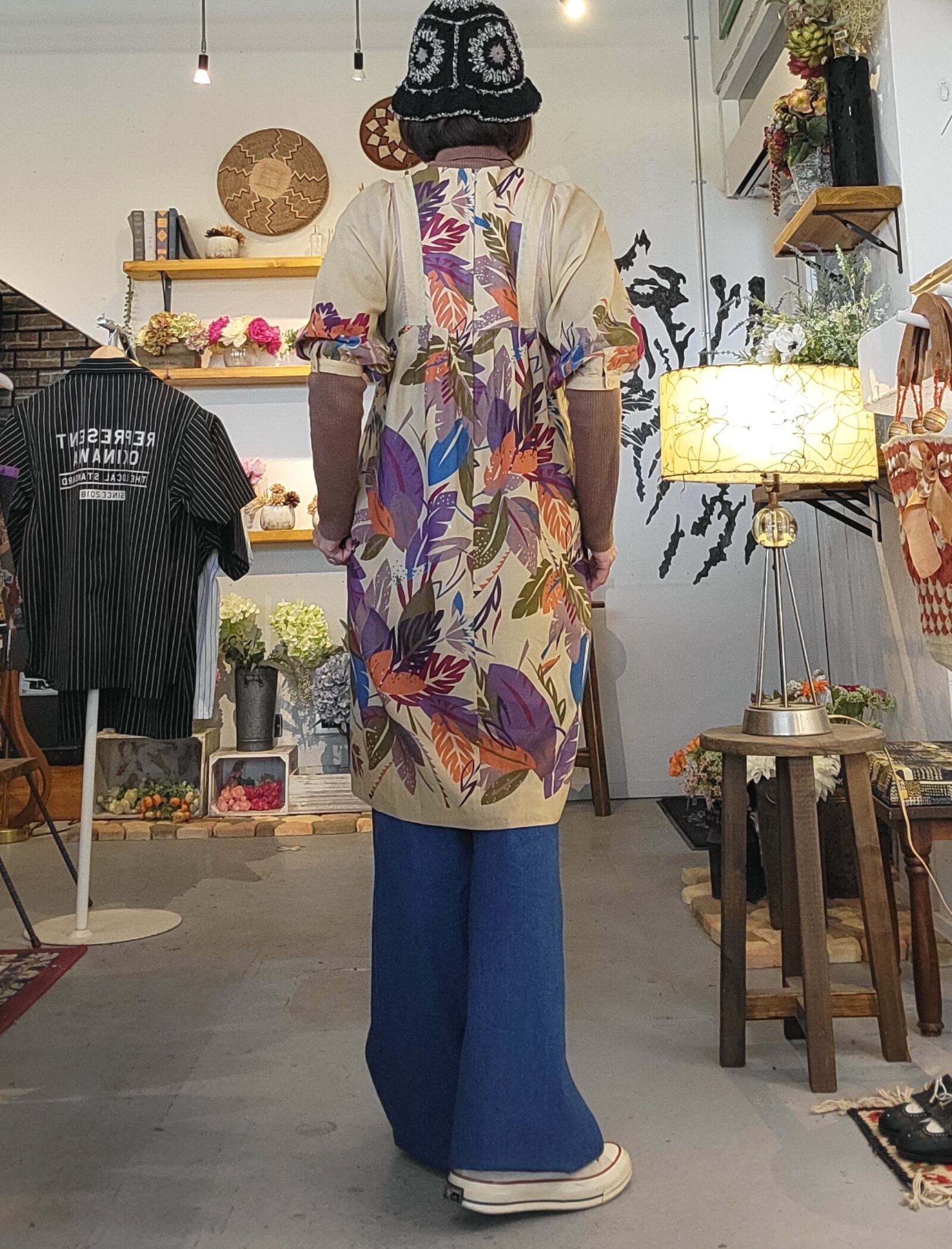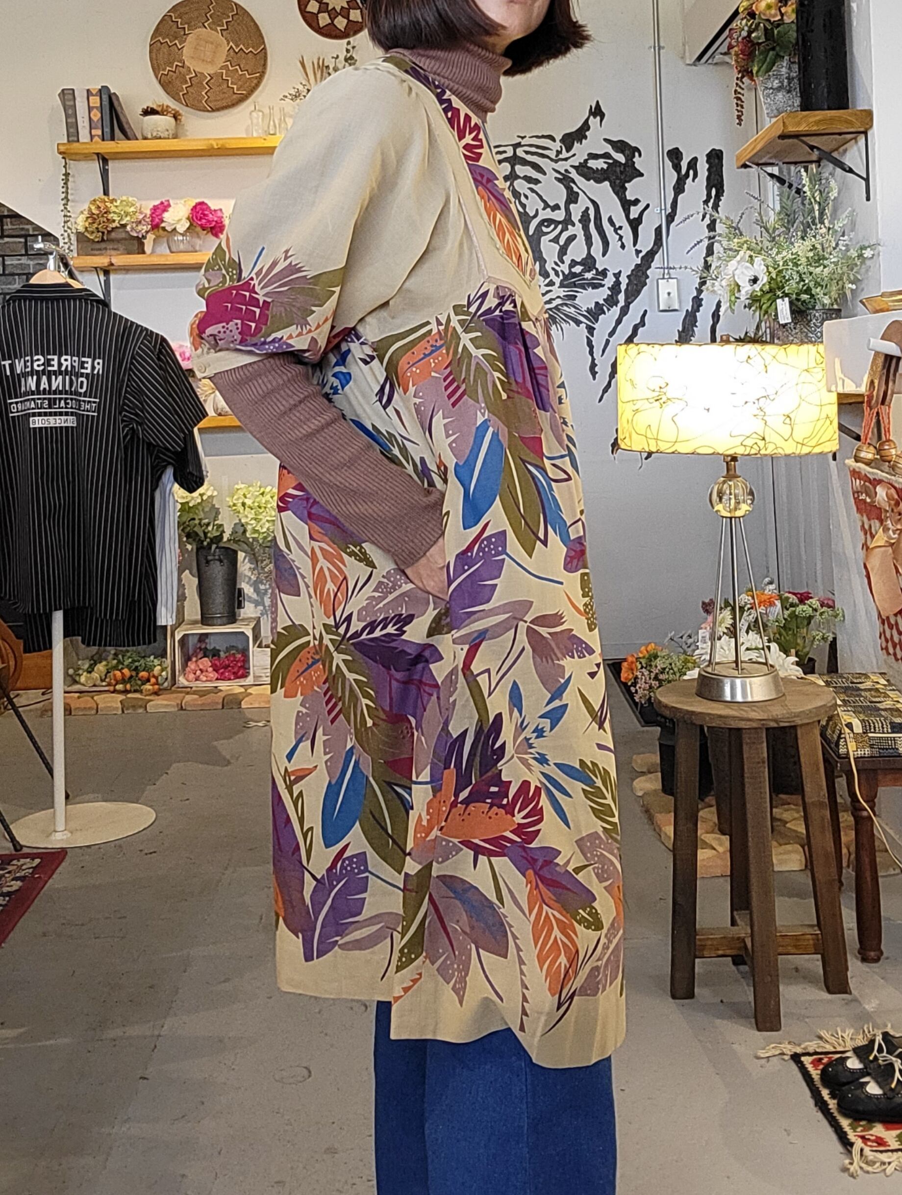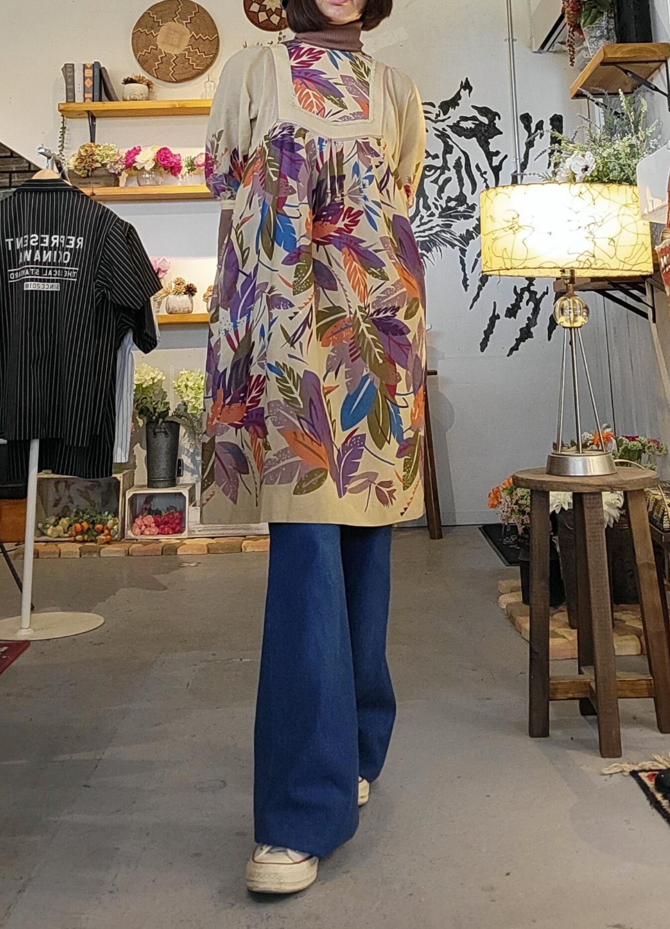 ヴィンテージのボタニカル柄のチュニック/ ワンピース。素材表記はありませんがやわらかい薄手のコットンのようです。裏地付きで透けません。伸縮性はありません。ボトムにパンツやスカートを合わせやすい丈感。ベルトでウエストマークしても素敵です。落ち着いたカラーで普段使いにぴったりの1枚。