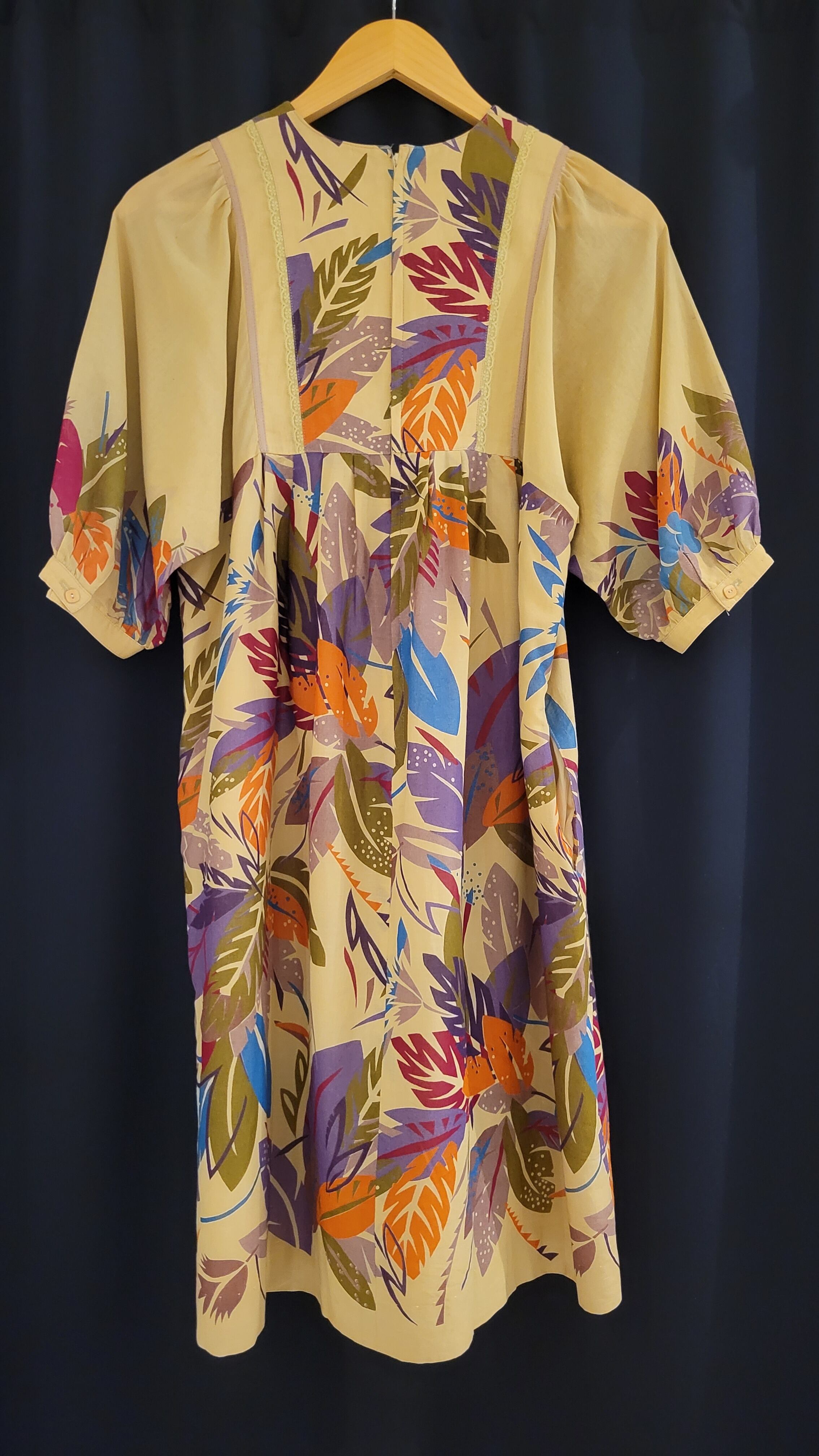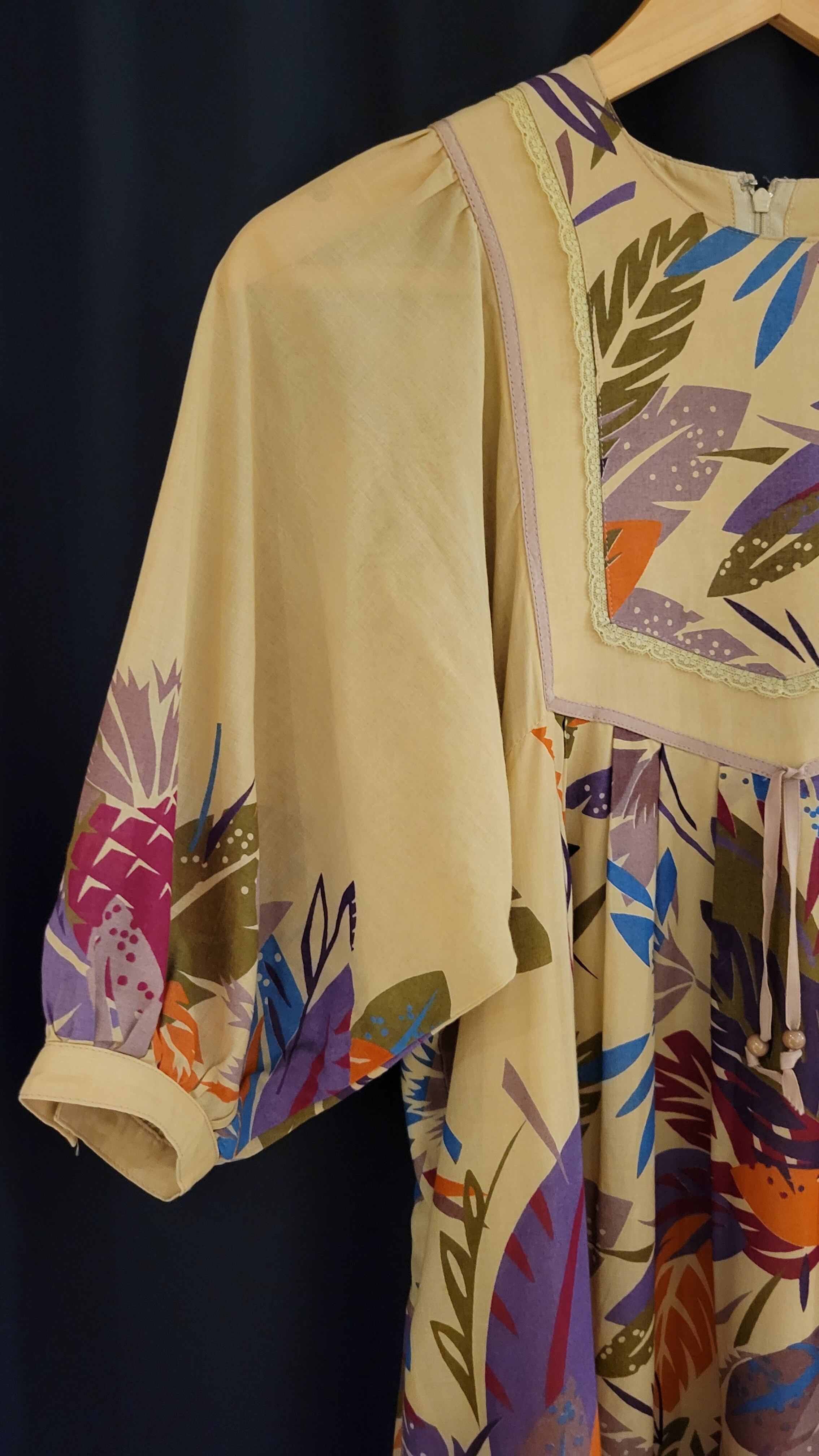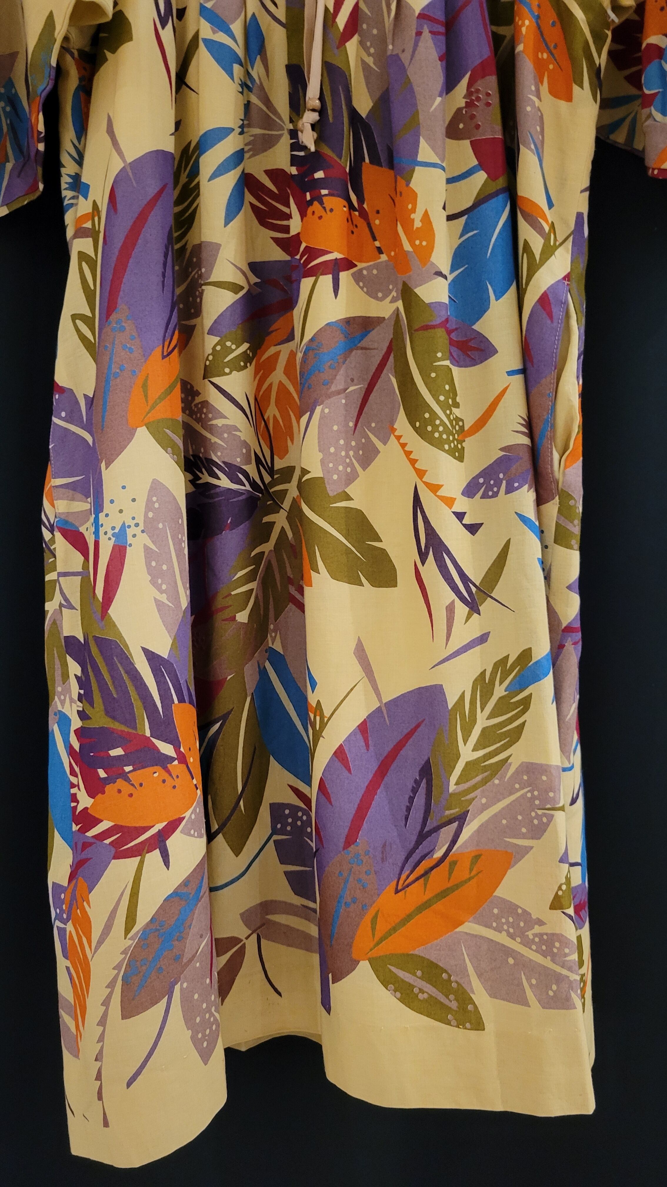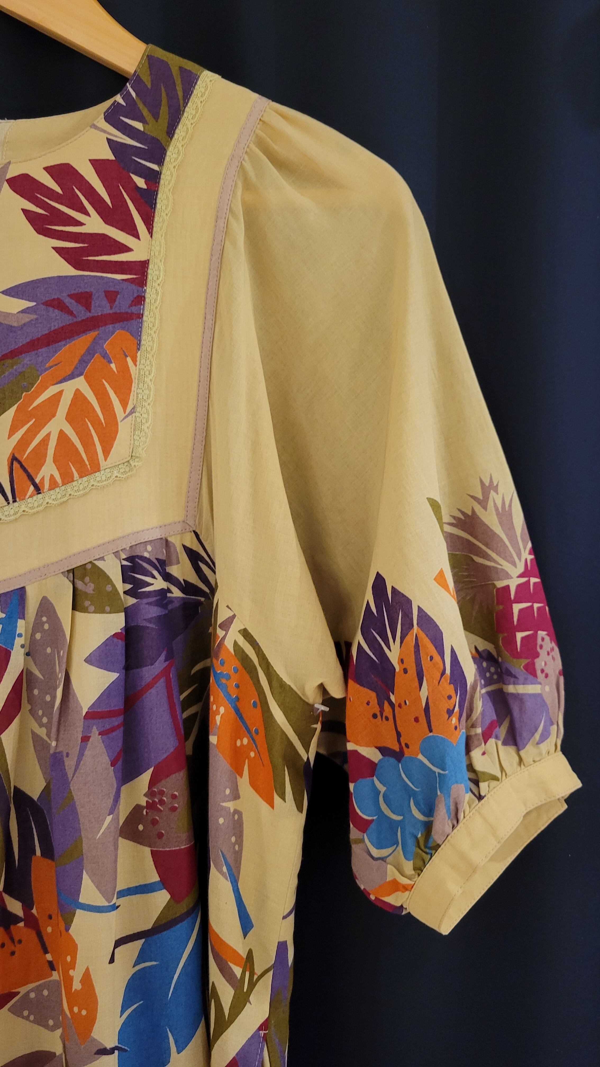 ヴィンテージのボタニカル柄のチュニック/ ワンピース。素材表記はありませんがやわらかい薄手のコットンのようです。裏地付きで透けません。伸縮性はありません。ボトムにパンツやスカートを合わせやすい丈感。ベルトでウエストマークしても素敵です。落ち着いたカラーで普段使いにぴったりの1枚。