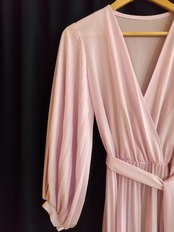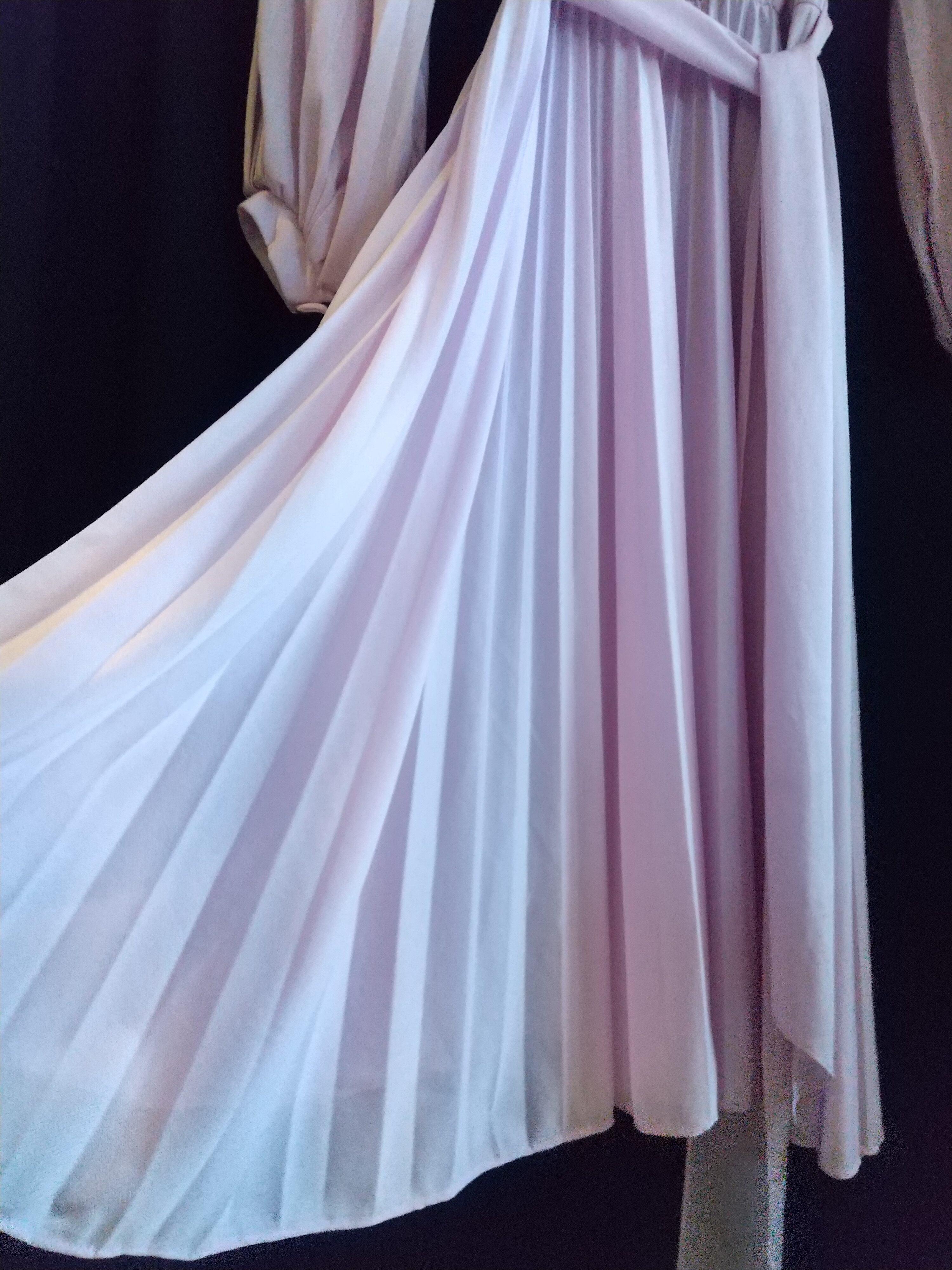 淡いラベンダーカラーのヴィンテージカシュクールワンピース。ふんわりボリューム袖とシアー素材が優しい印象です。ウエストリボンはフロント、サイド、バック、お好きな位置で結んでいただけます。*背中側に1mmほどの小穴があります。画像にてご確認ください。