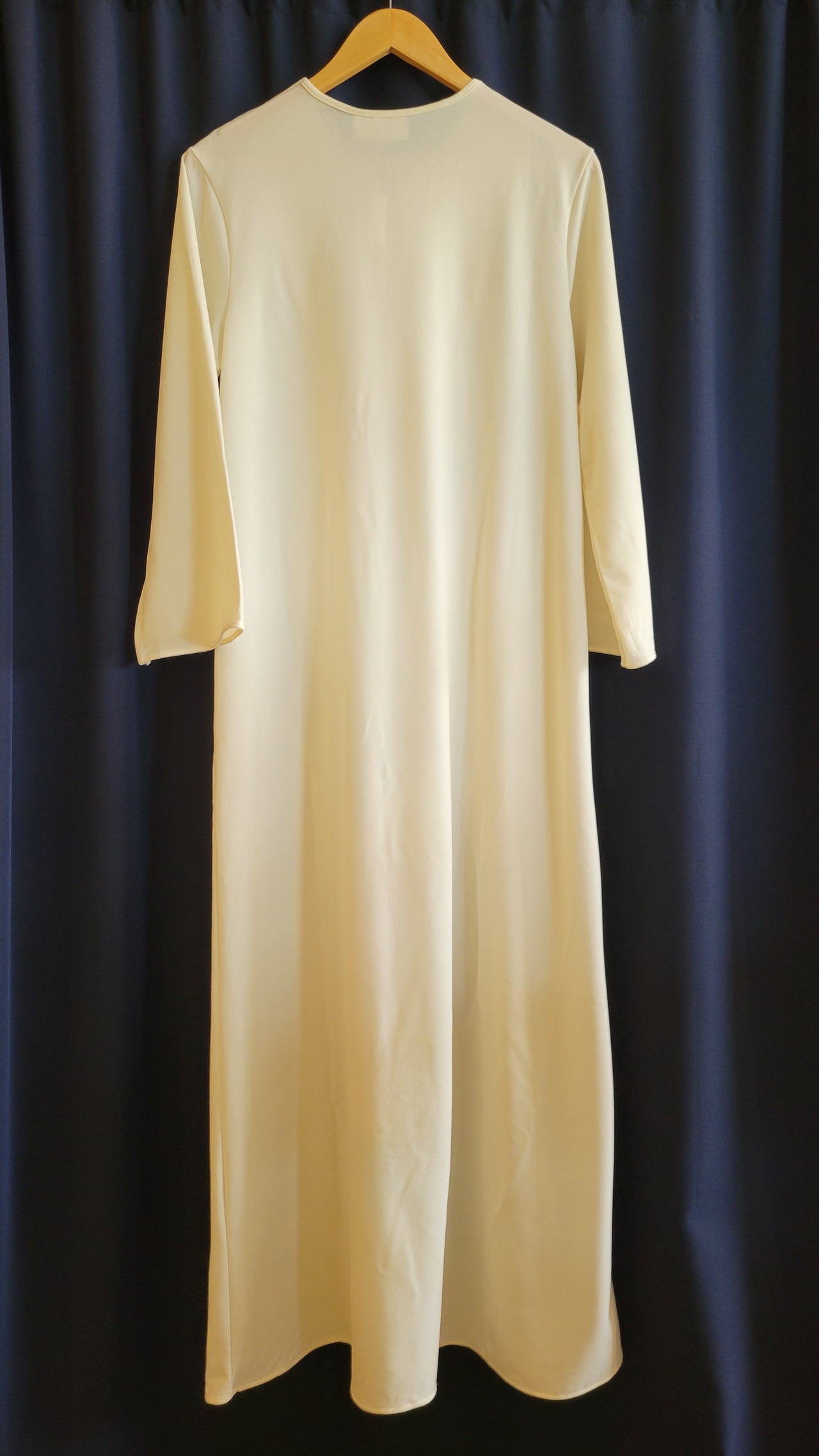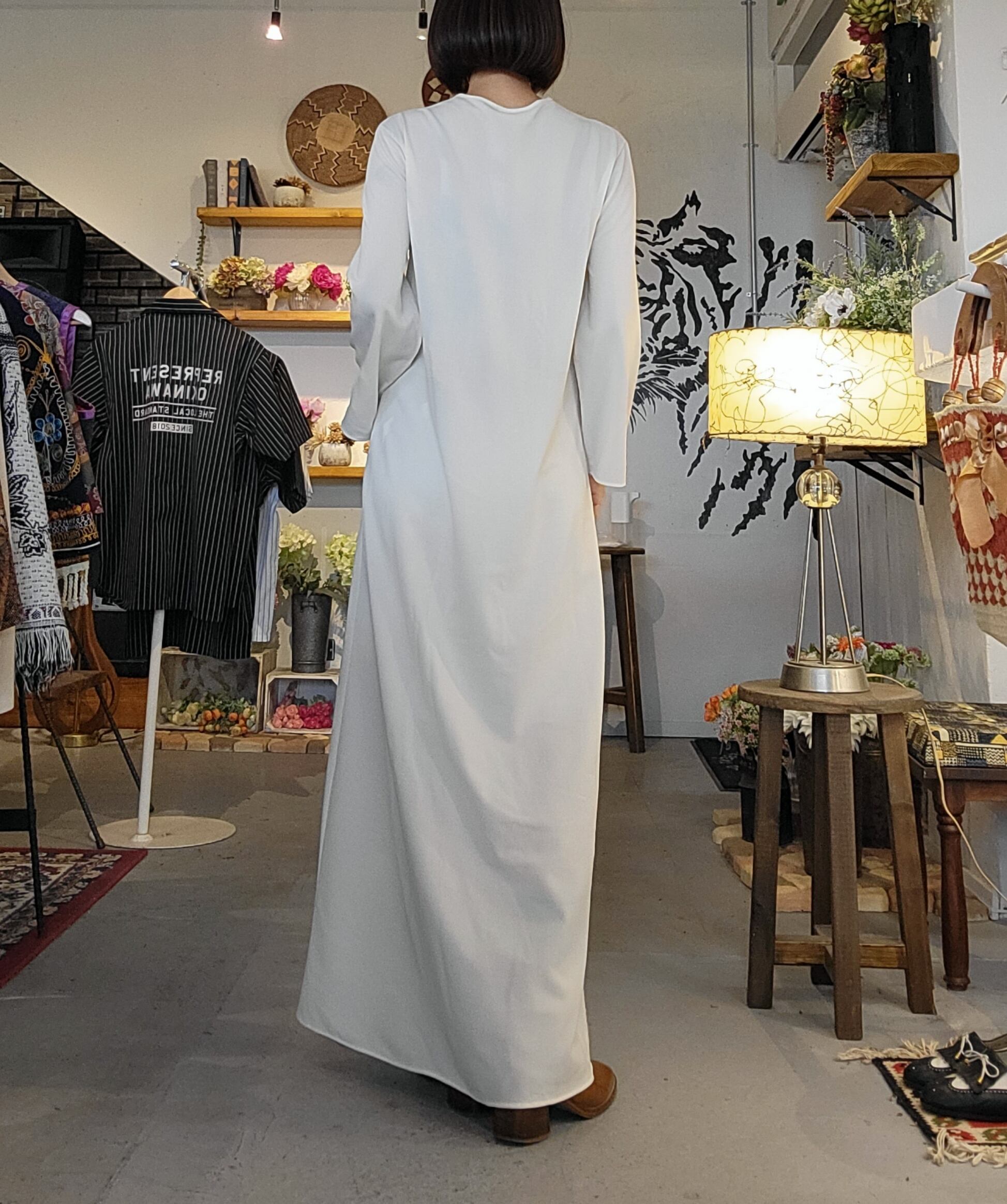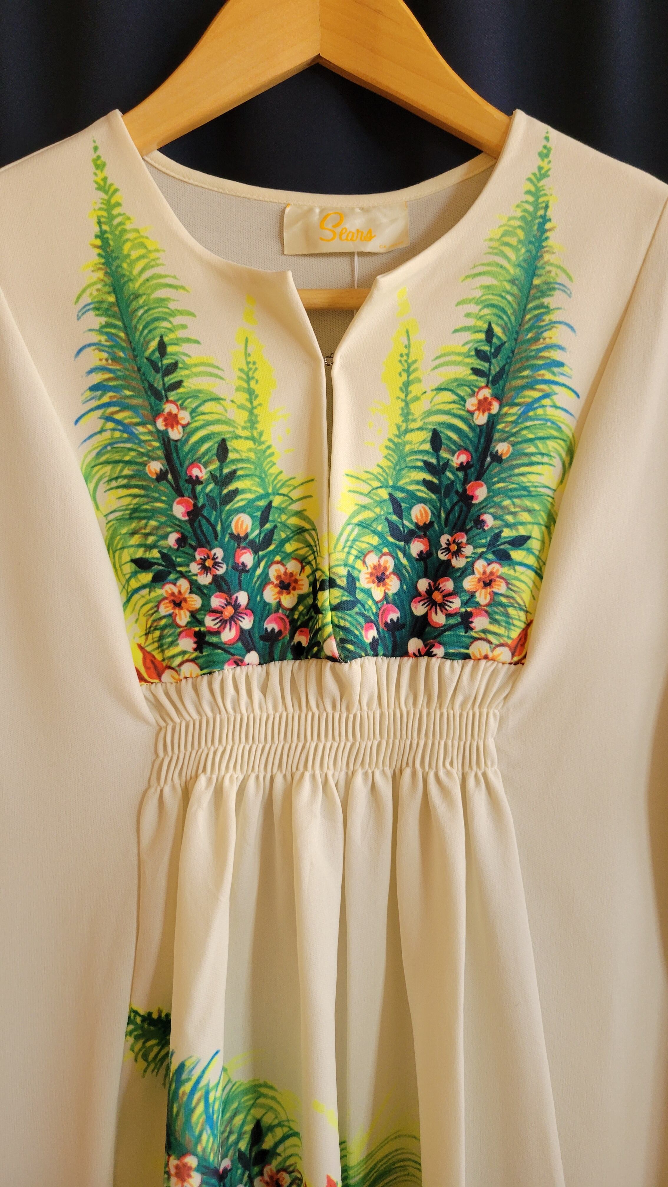 SEARSのヴィンテージのラウンジマキシドレス。素材表記はありませんがポリウレタンのような伸縮性があります。生地の白い部分は若干の透け感があります。元々は部屋着として作られたもののため、締め付け感無くストレスフリーな着心地です。胸元に小さなホックがひとつ付いています。カラーは真っ白ではなくクリーム色です。