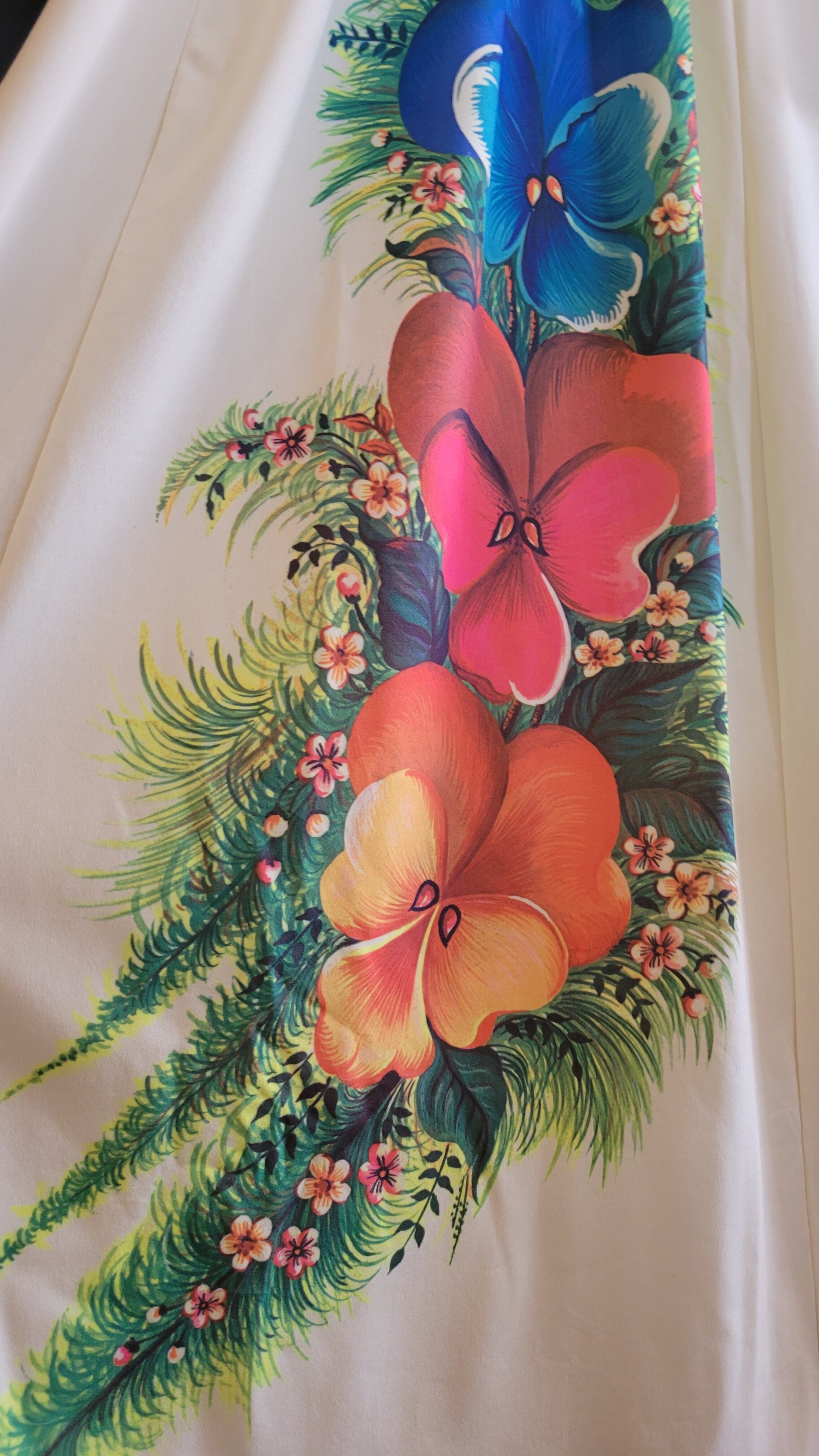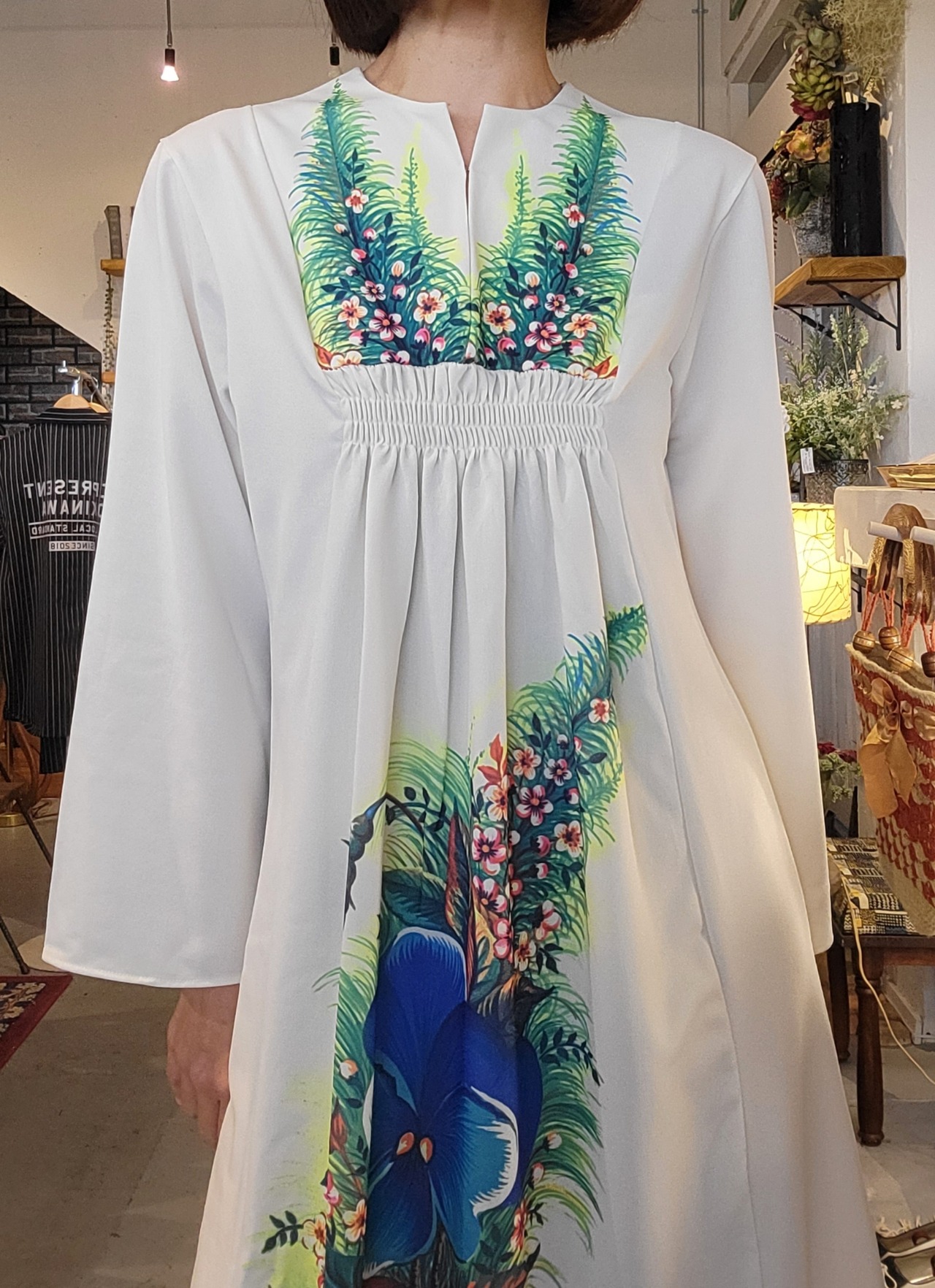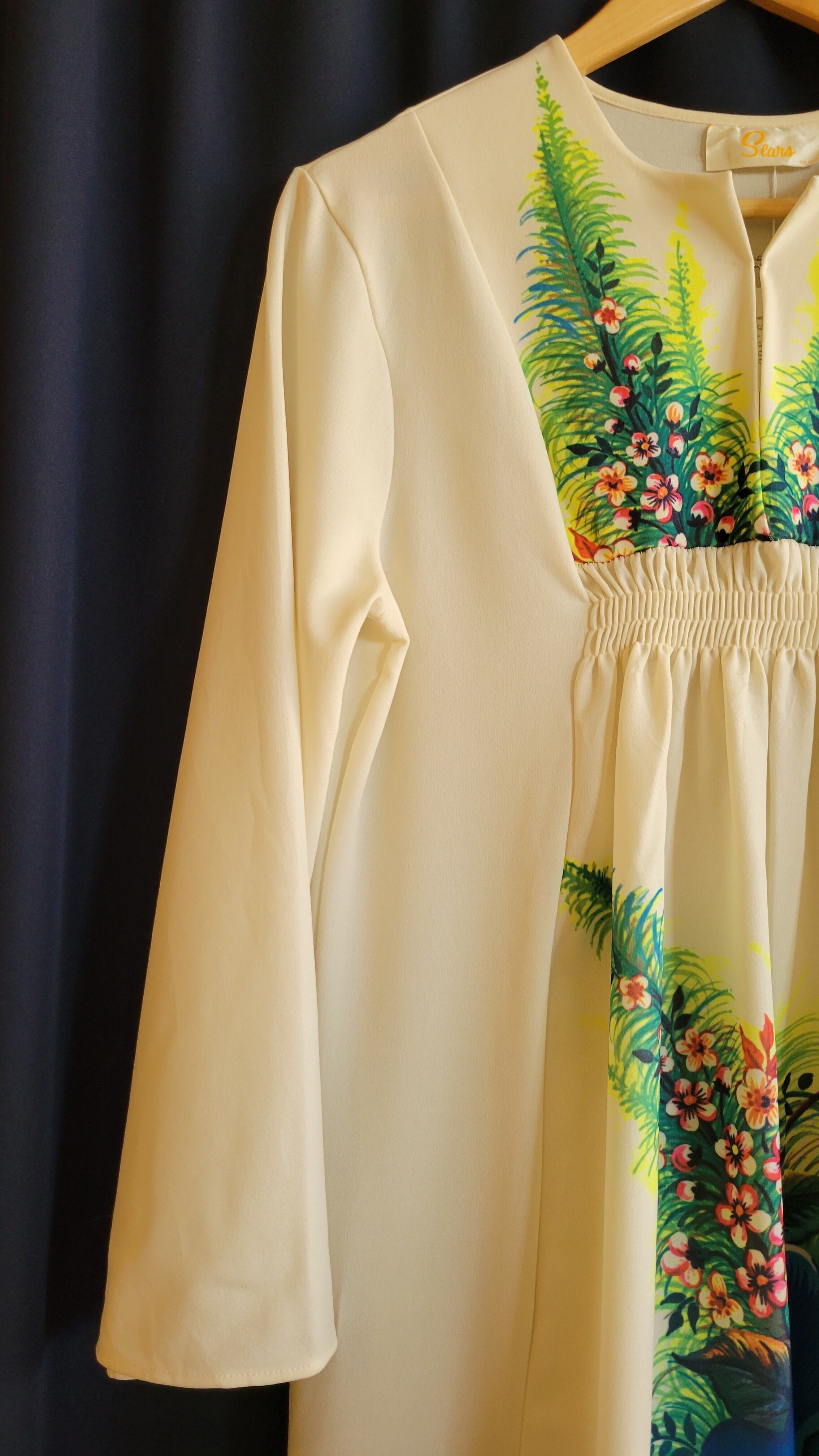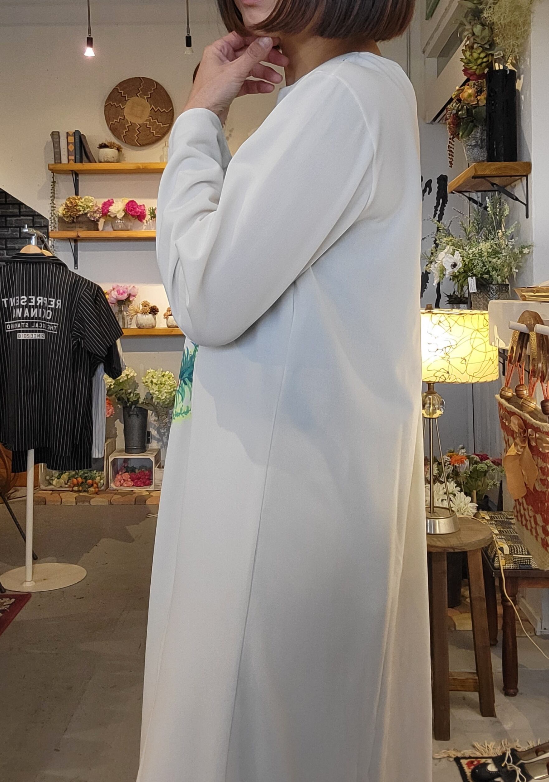 SEARSのヴィンテージのラウンジマキシドレス。素材表記はありませんがポリウレタンのような伸縮性があります。生地の白い部分は若干の透け感があります。元々は部屋着として作られたもののため、締め付け感無くストレスフリーな着心地です。胸元に小さなホックがひとつ付いています。カラーは真っ白ではなくクリーム色です。