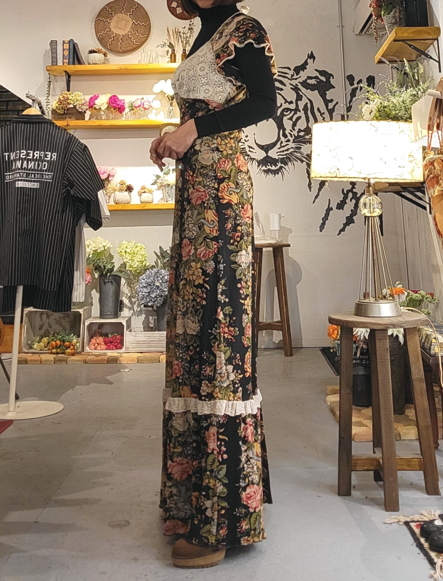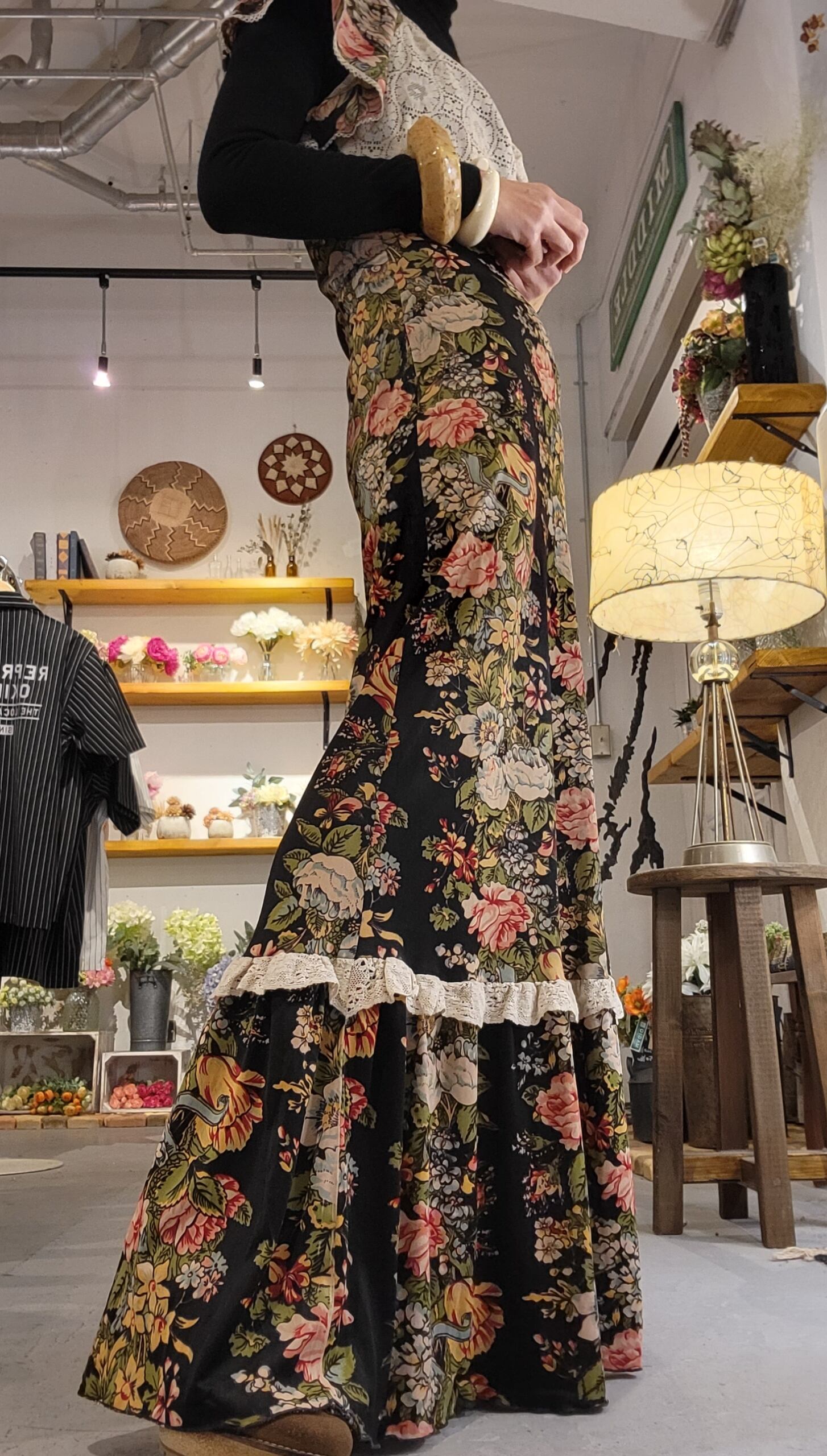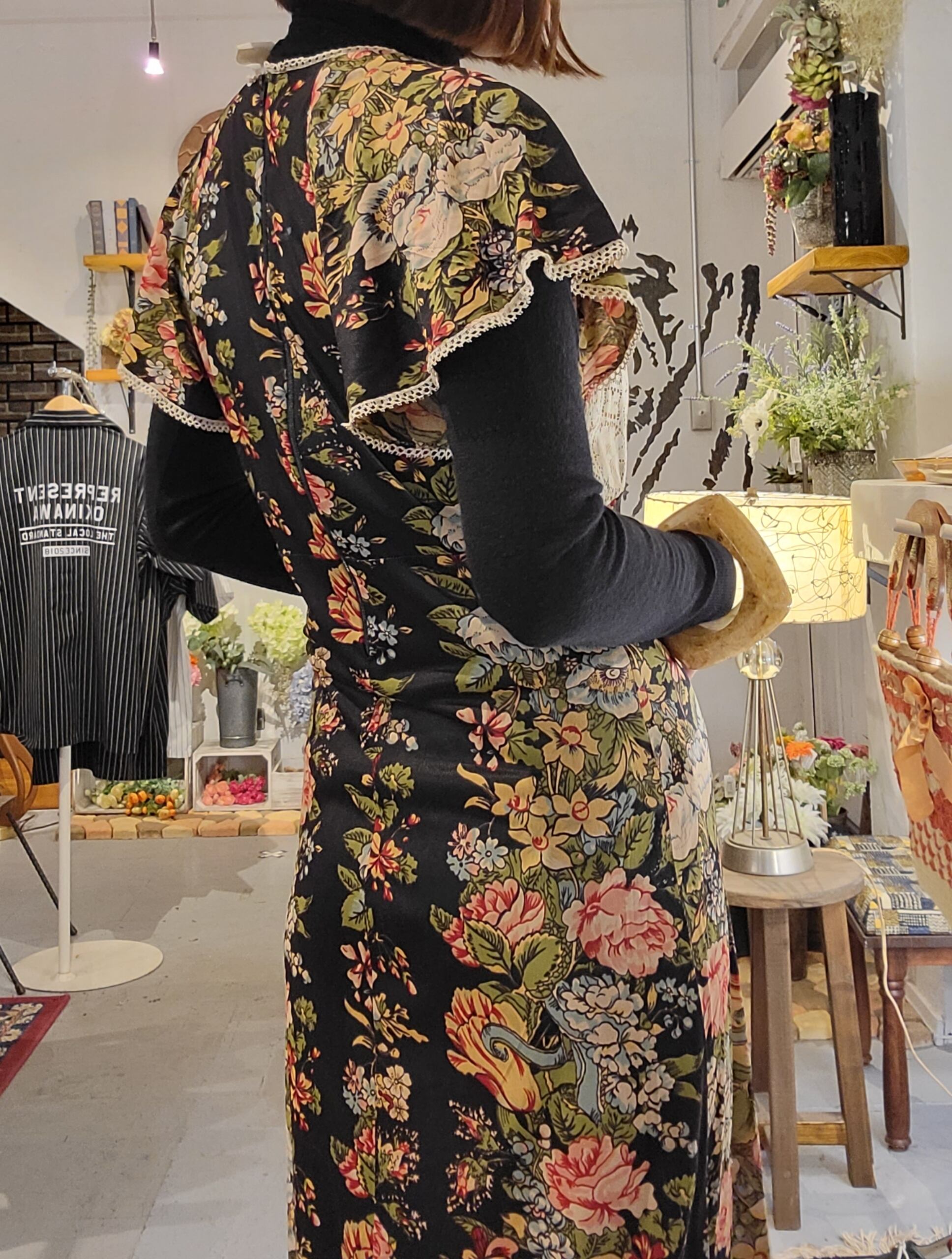 ヴィンテージの花柄マキシドレス。素材表記が消えてしまっていますが、若干の伸縮性と透け感のあるランジェリーに近い薄手の素材感です。落ち感のあるシルエットが繊細で華奢な雰囲気を際立たせます。生地のダメージを数ヶ所修繕済みです。画像のような修繕跡が約5ケ所見られます。ほとんど目立ちませんがこちらはヴィンテージに慣れていらっしゃる方、ご理解のある方へおすすめいたします。