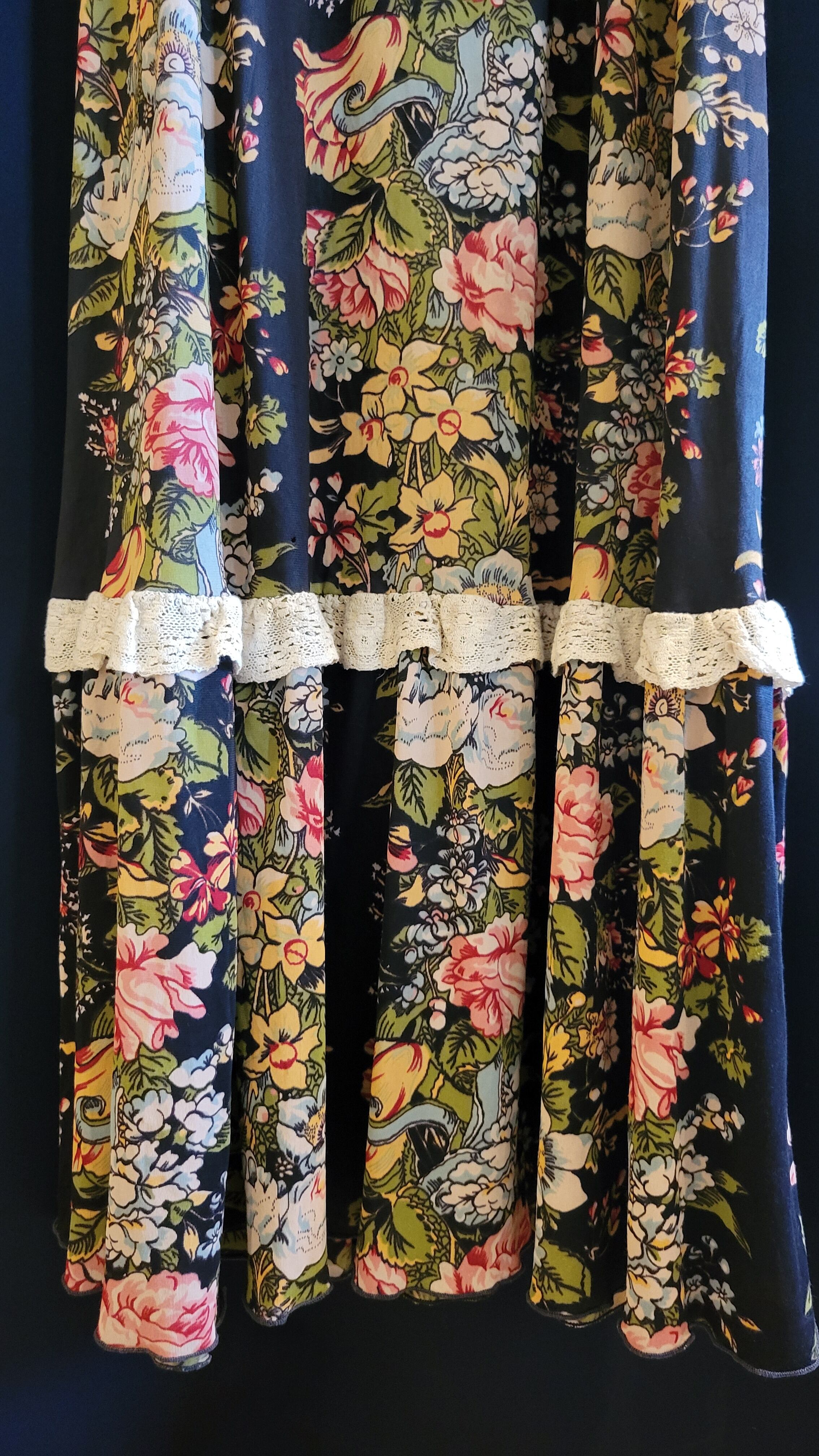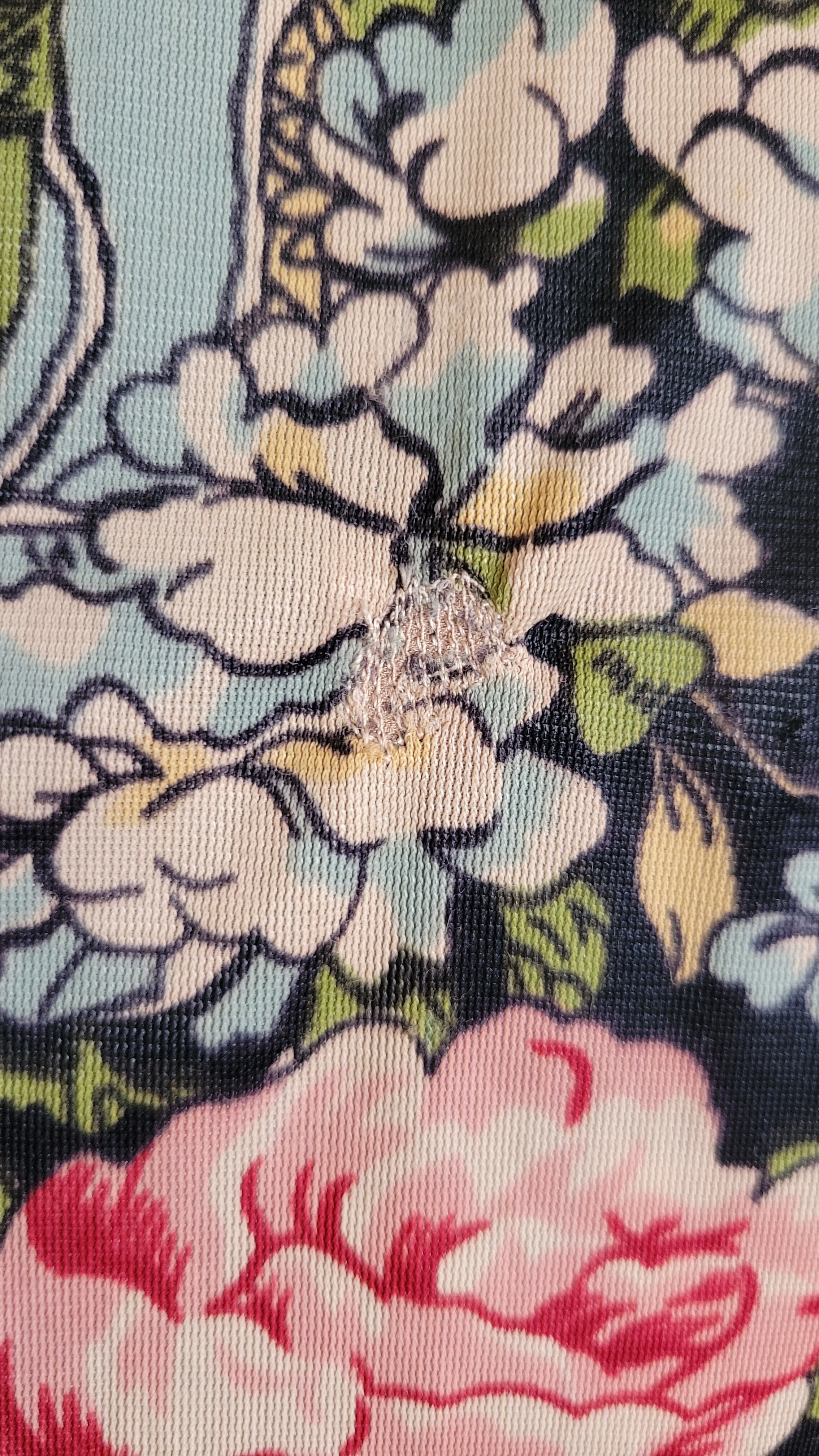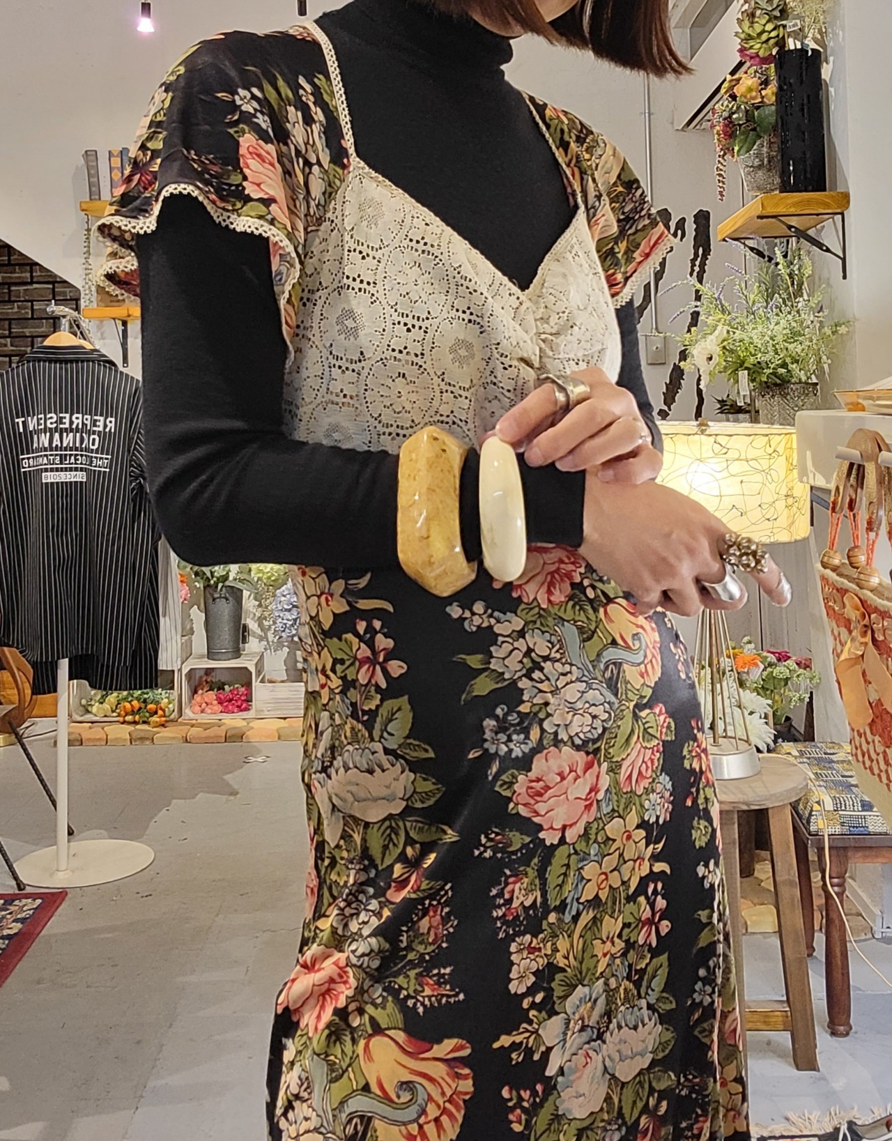 ヴィンテージの花柄マキシドレス。素材表記が消えてしまっていますが、若干の伸縮性と透け感のあるランジェリーに近い薄手の素材感です。落ち感のあるシルエットが繊細で華奢な雰囲気を際立たせます。生地のダメージを数ヶ所修繕済みです。画像のような修繕跡が約5ケ所見られます。ほとんど目立ちませんがこちらはヴィンテージに慣れていらっしゃる方、ご理解のある方へおすすめいたします。