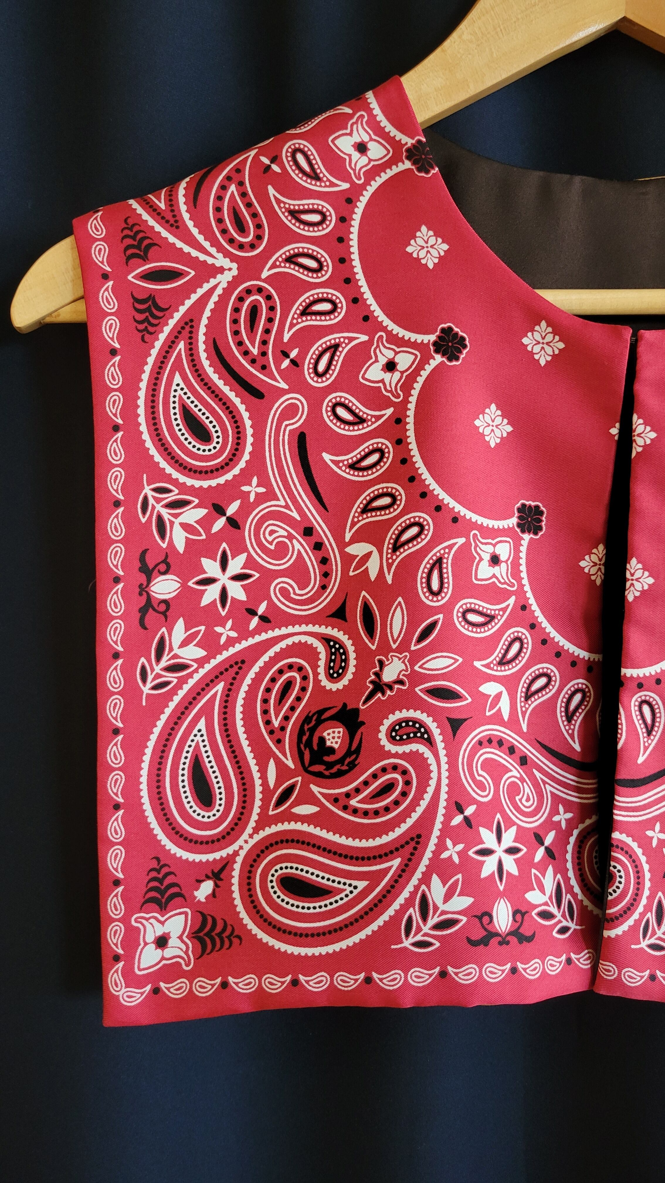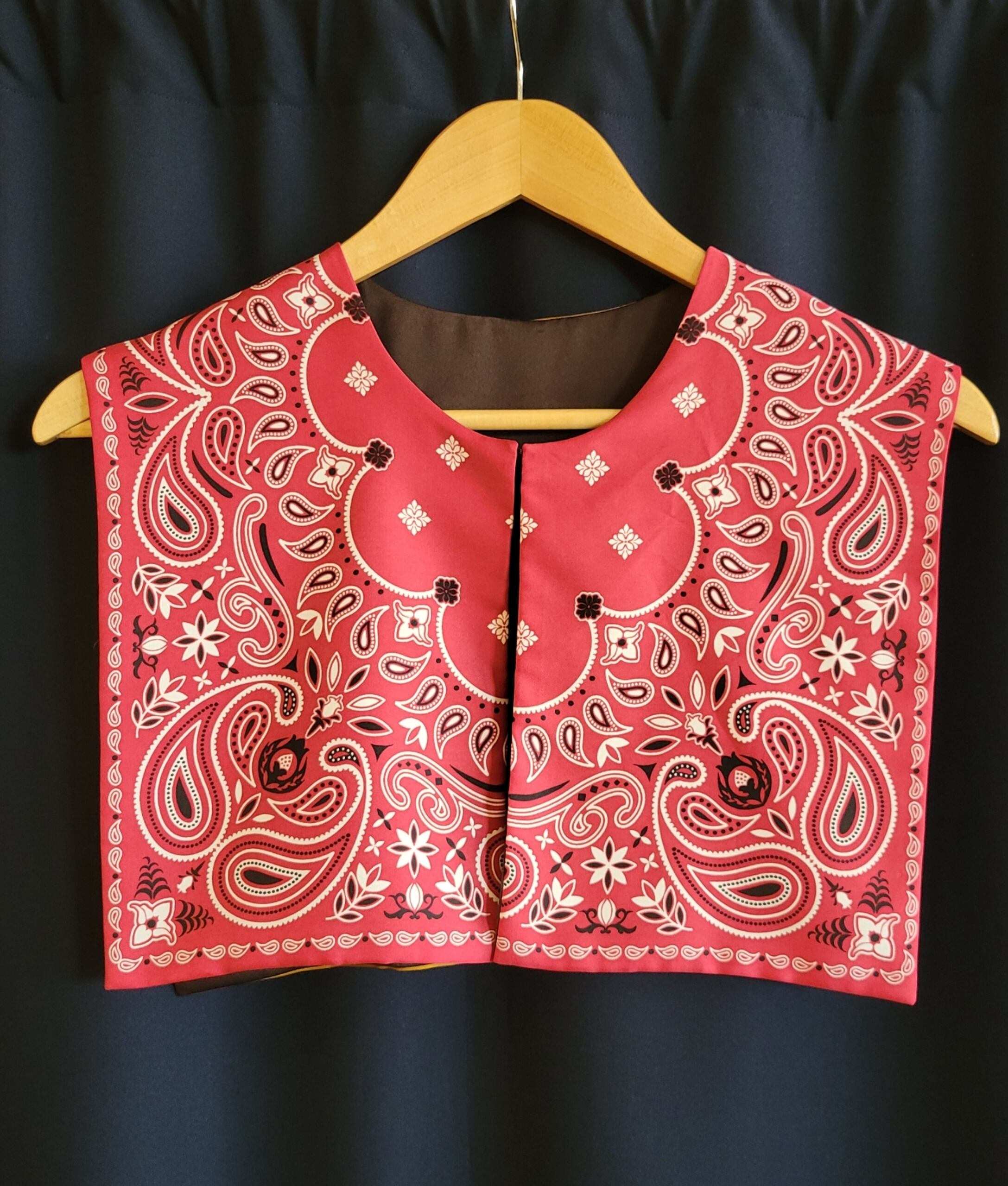 ヴィンテージスカーフをリメイクした付け襟です。素材はポリエステルです。サテンの裏地付きで薄手過ぎず、きちんと感があります。首もとに小さなホック付き。リバーシブルでの着用可(その場合ホックが表に見えます)。