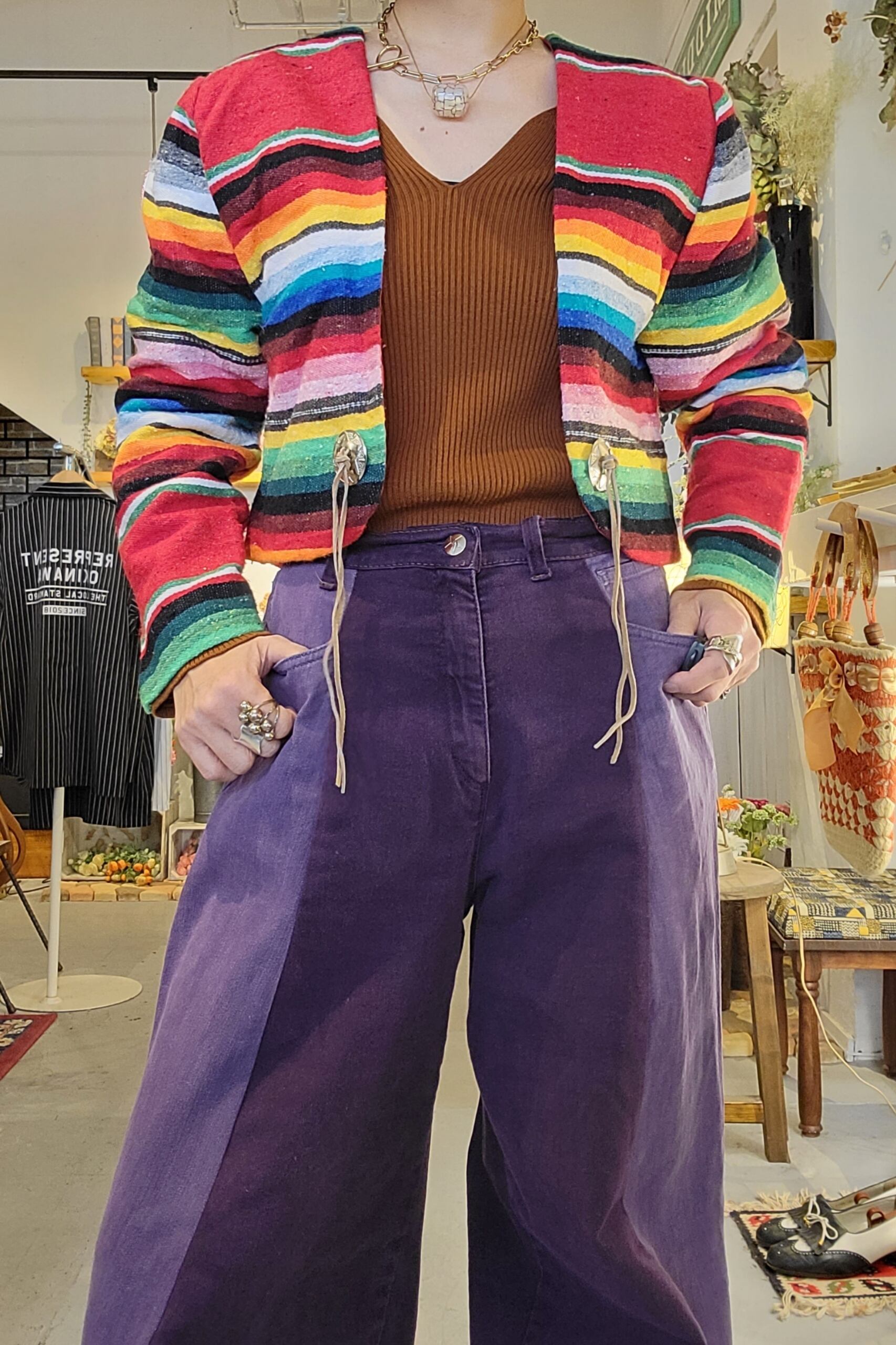 古着のカラーデニムを使用したリメイクパンツ。2本のデニムをドッキングさせワイドパンツに仕立てています。サイドから見るとスカートにも見えるほどワイドな裾幅でインパクトのあるシルエット。ハイウエストで脚長効果も。裾は切りっぱなしのためレングスが長い場合はセルフカットしていただけます(カット後軽く裾をほぐしてください)。