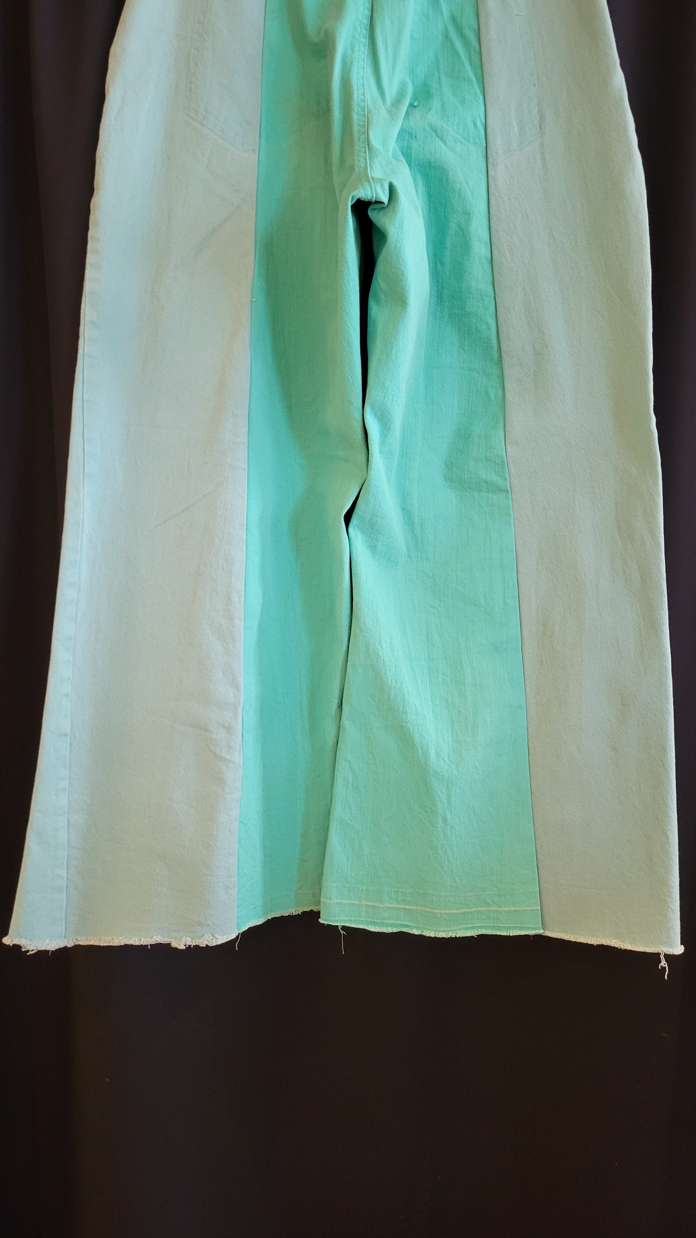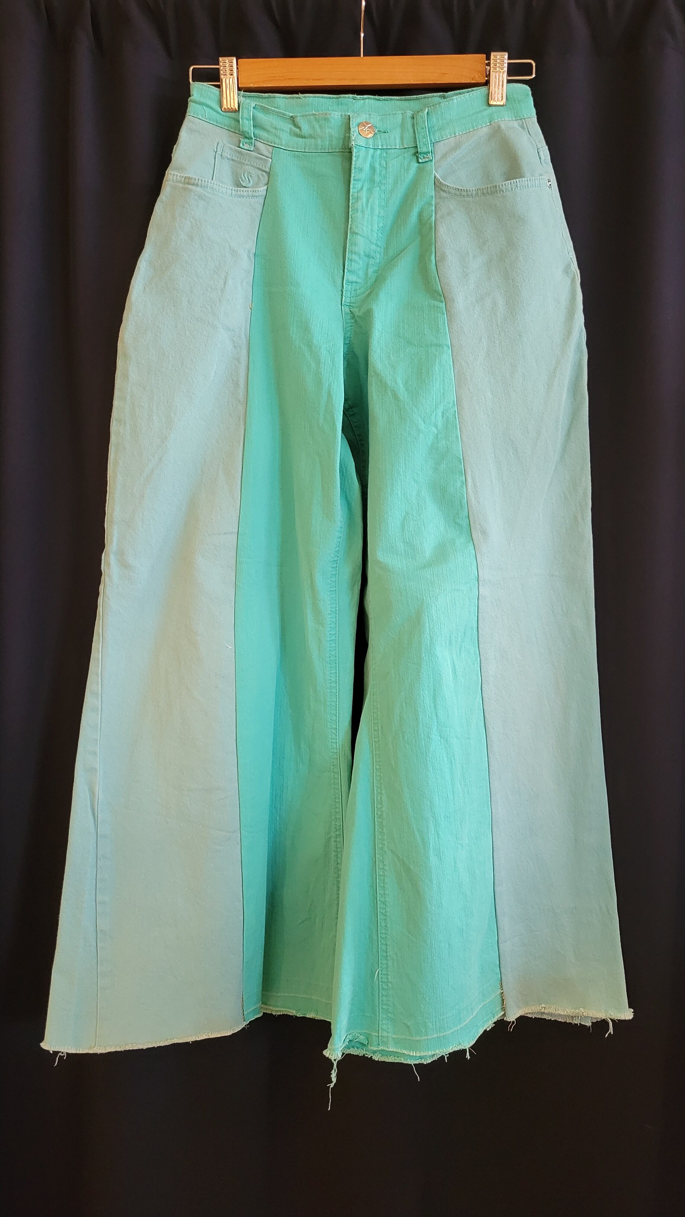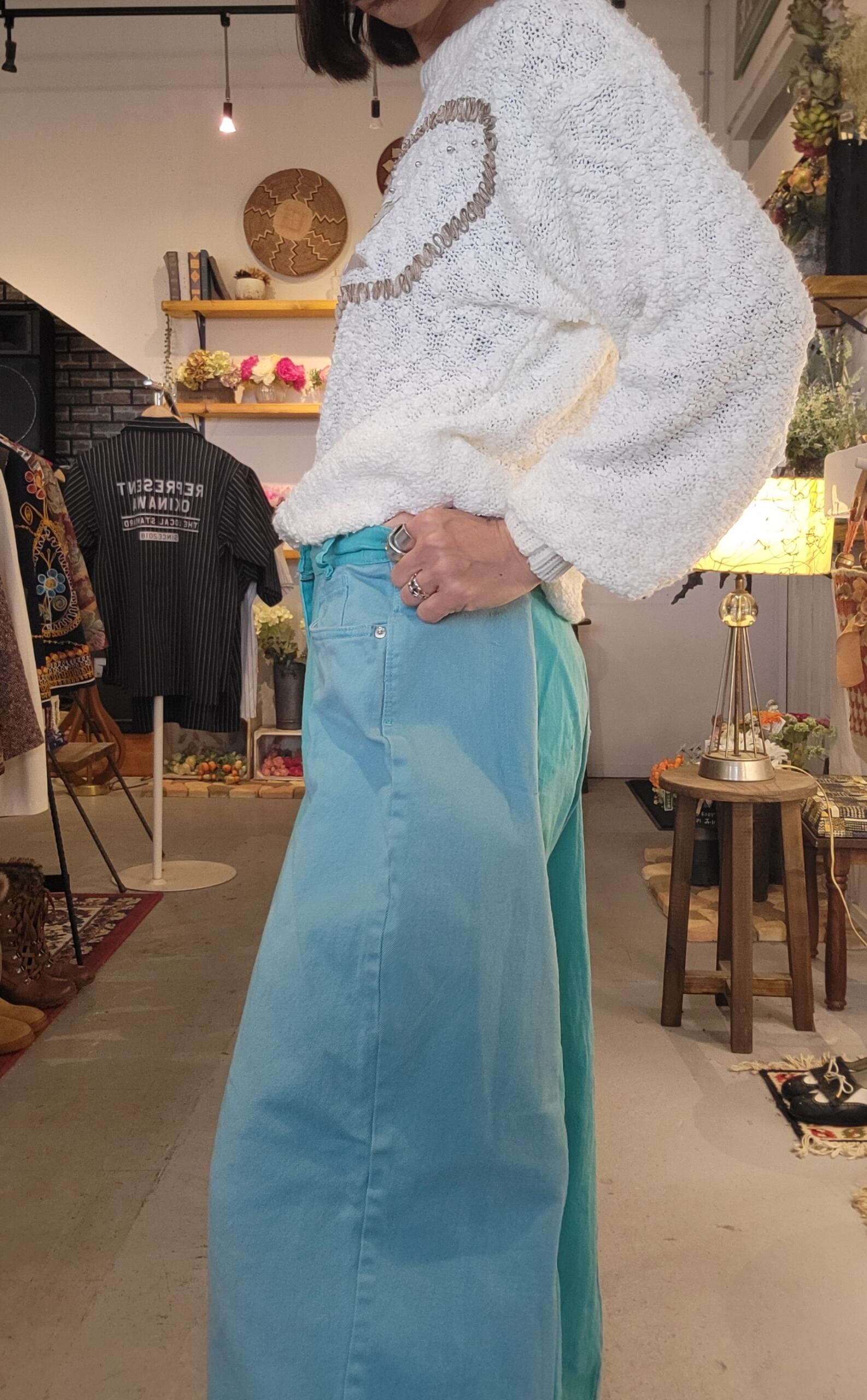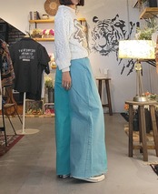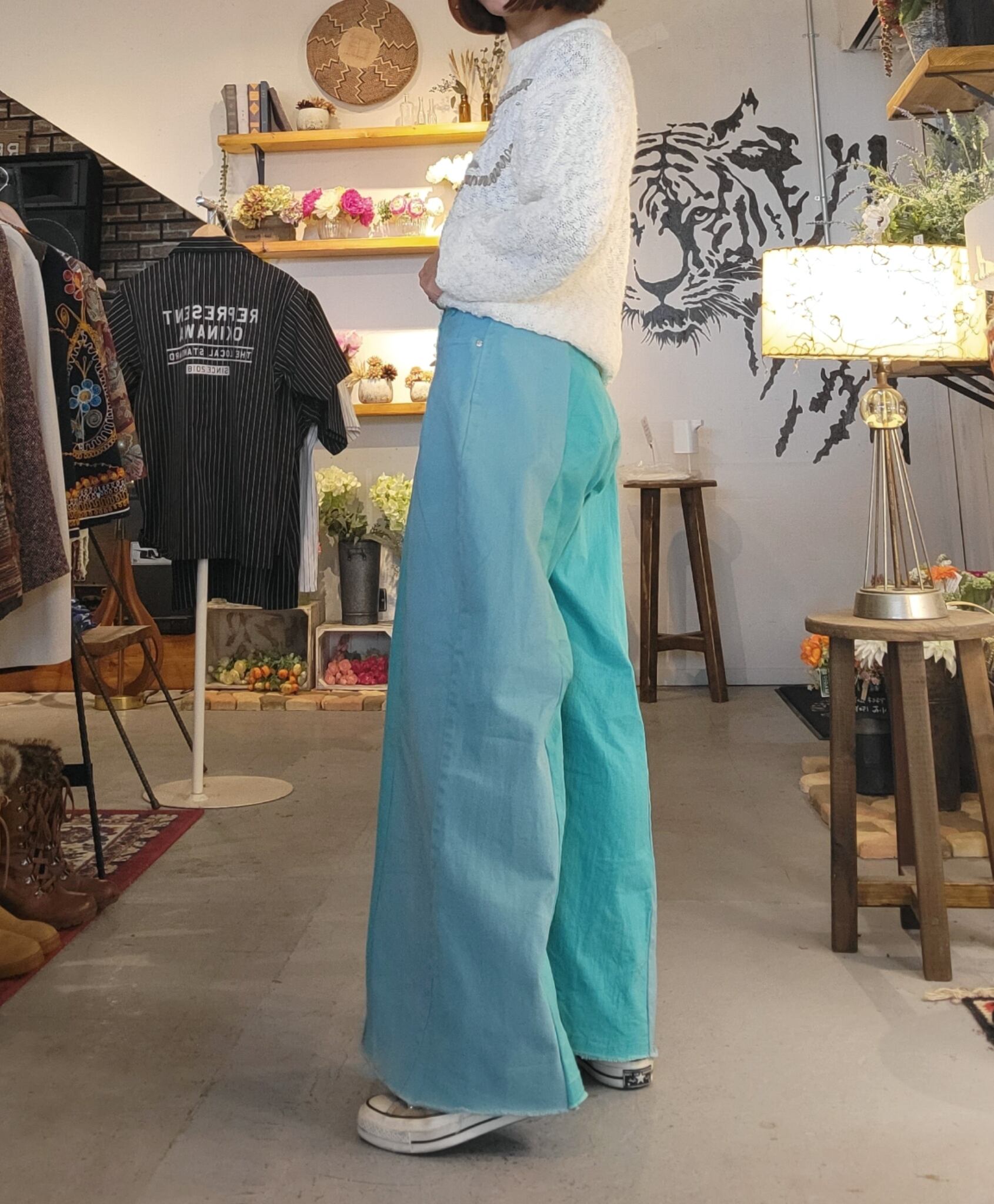 古着のカラーデニムを使用したリメイクパンツ。2本のデニムをドッキングさせワイドパンツに仕立てています。サイドから見るとスカートにも見えるほどワイドな裾幅でインパクトのあるシルエット。ハイウエストで脚長効果も。裾は切りっぱなしのためレングスが長い場合はセルフカットしていただけます(カット後軽く裾をほぐしてください)。