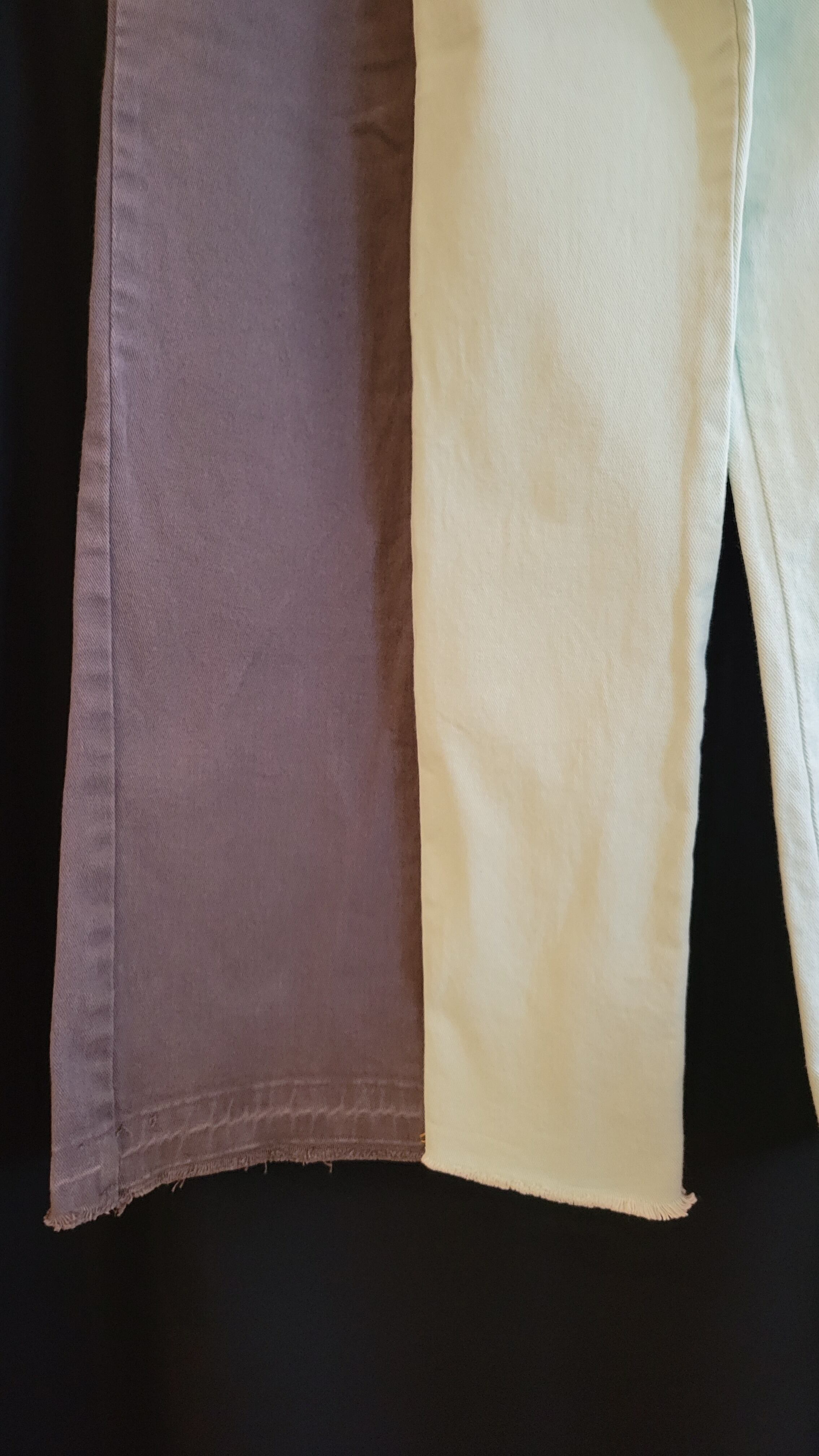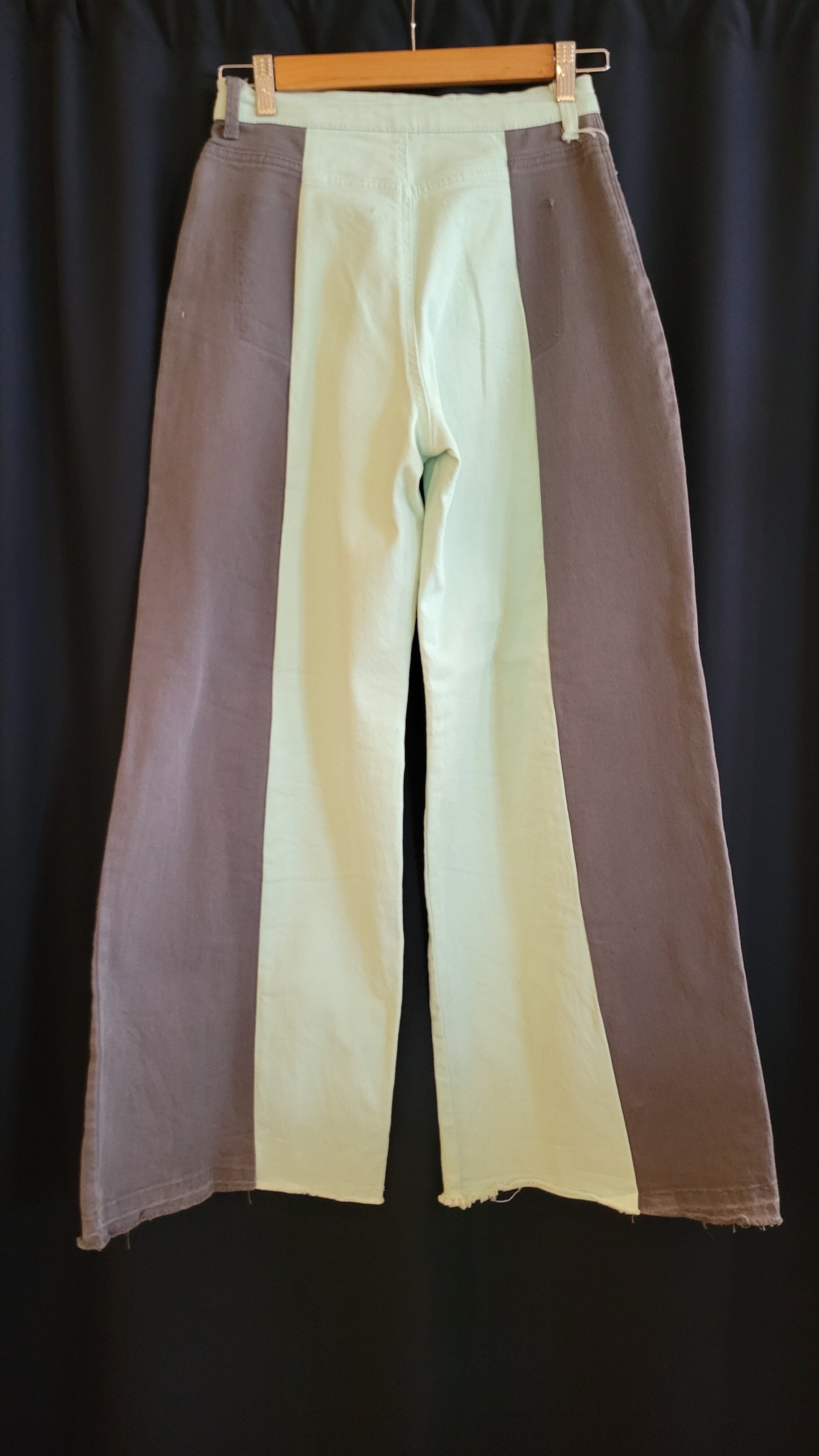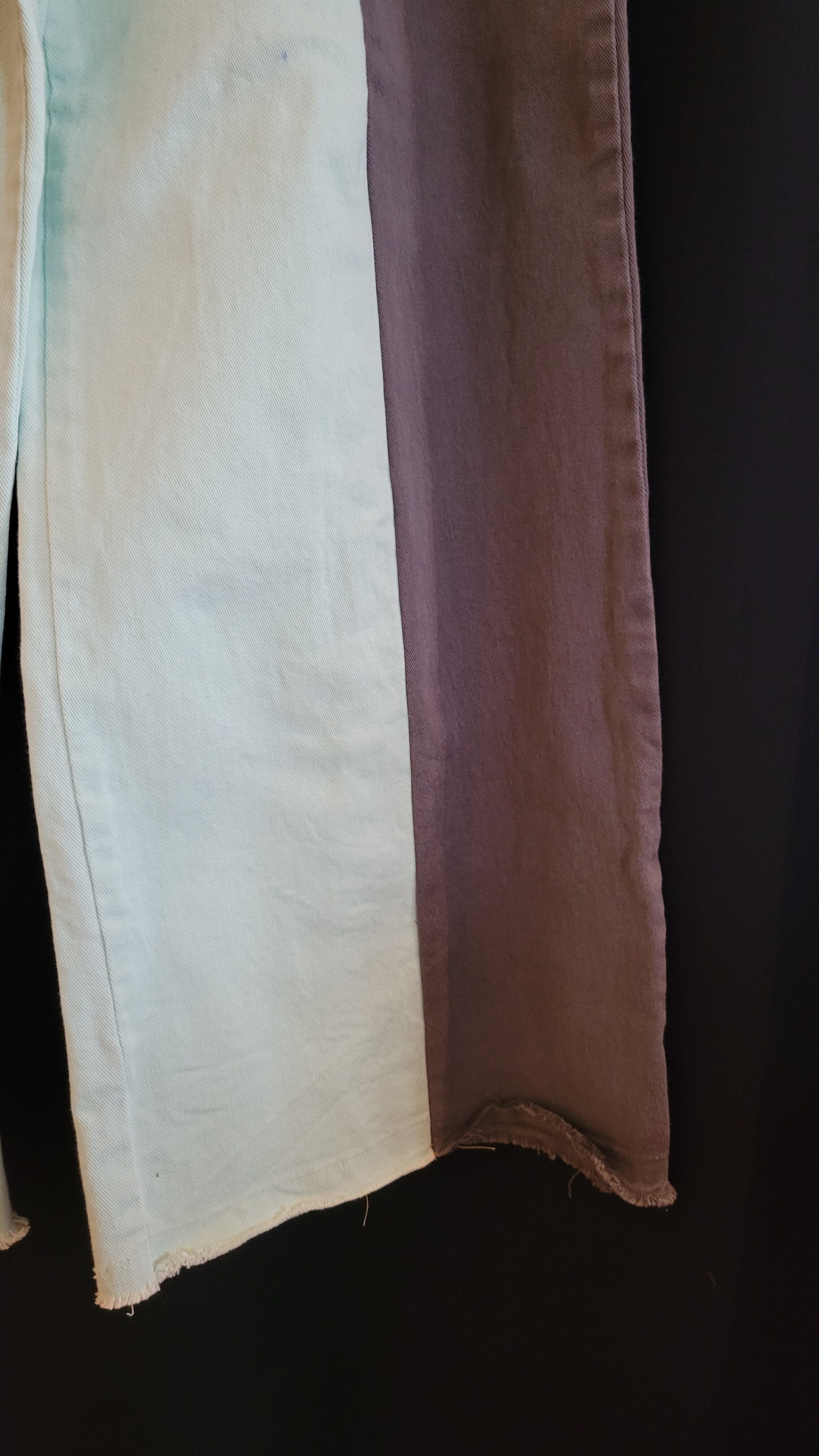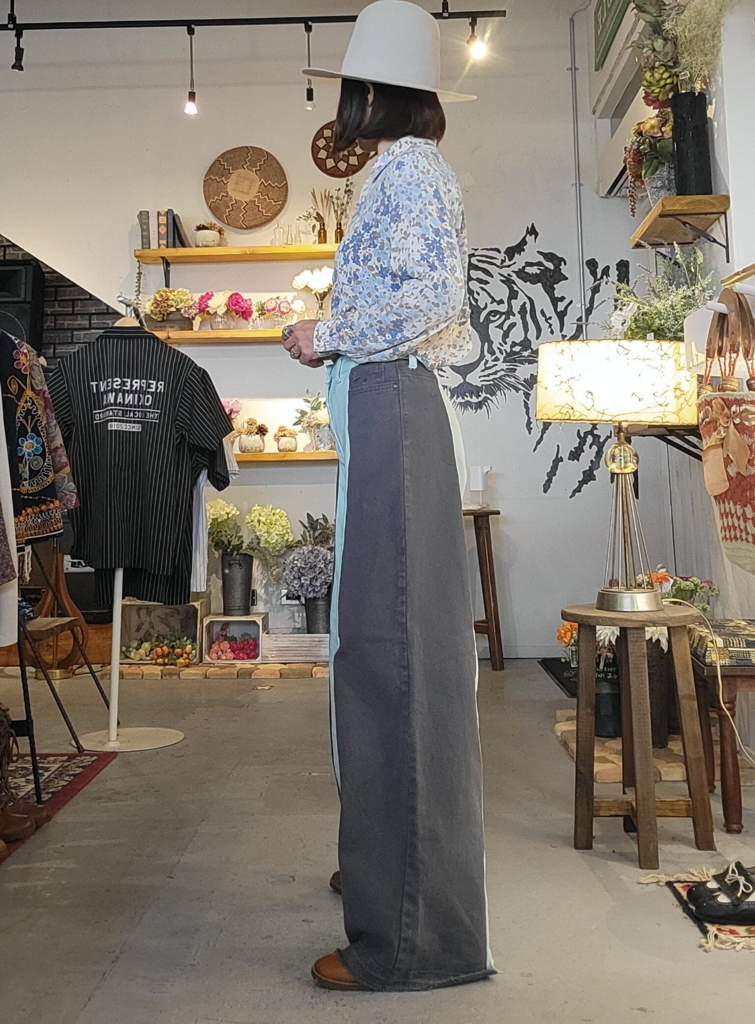 古着のカラーデニムを使用したリメイクパンツ。2本のデニムをドッキングさせワイドパンツに仕立てています。サイドから見るとスカートにも見えるほどワイドな裾幅でインパクトのあるシルエット。ハイウエストで脚長効果も。裾は切りっぱなしのためレングスが長い場合はセルフカットしていただけます(カット後軽く裾をほぐしてください)。