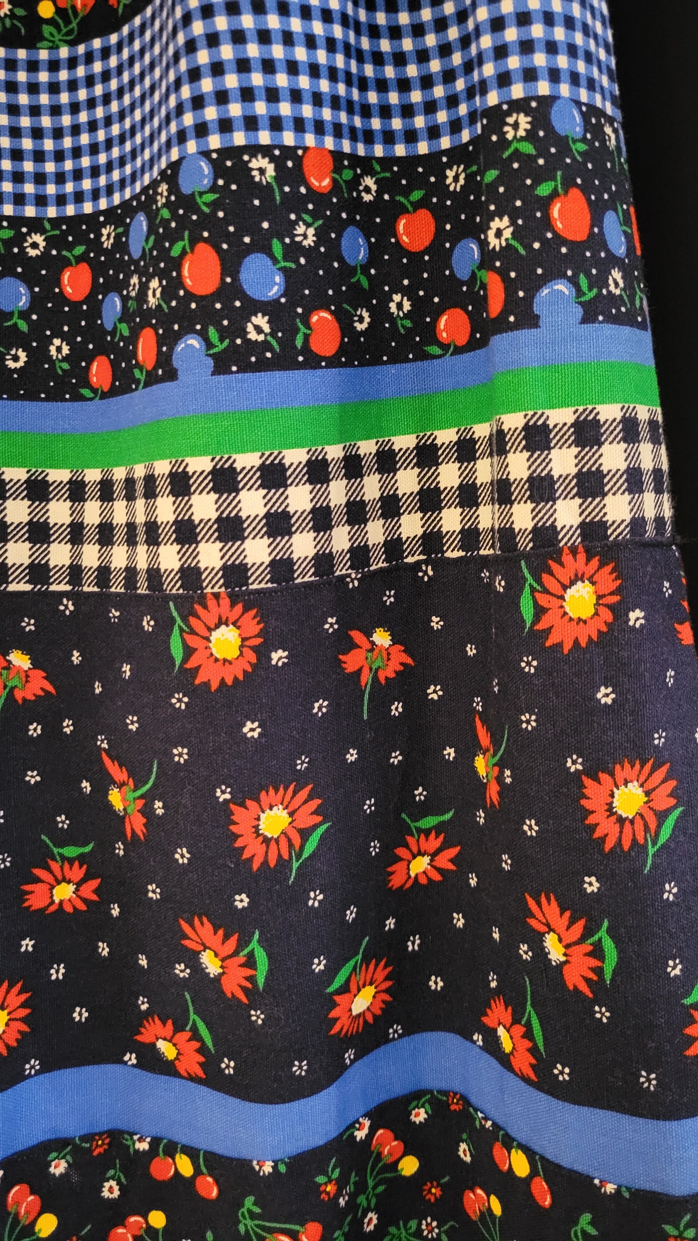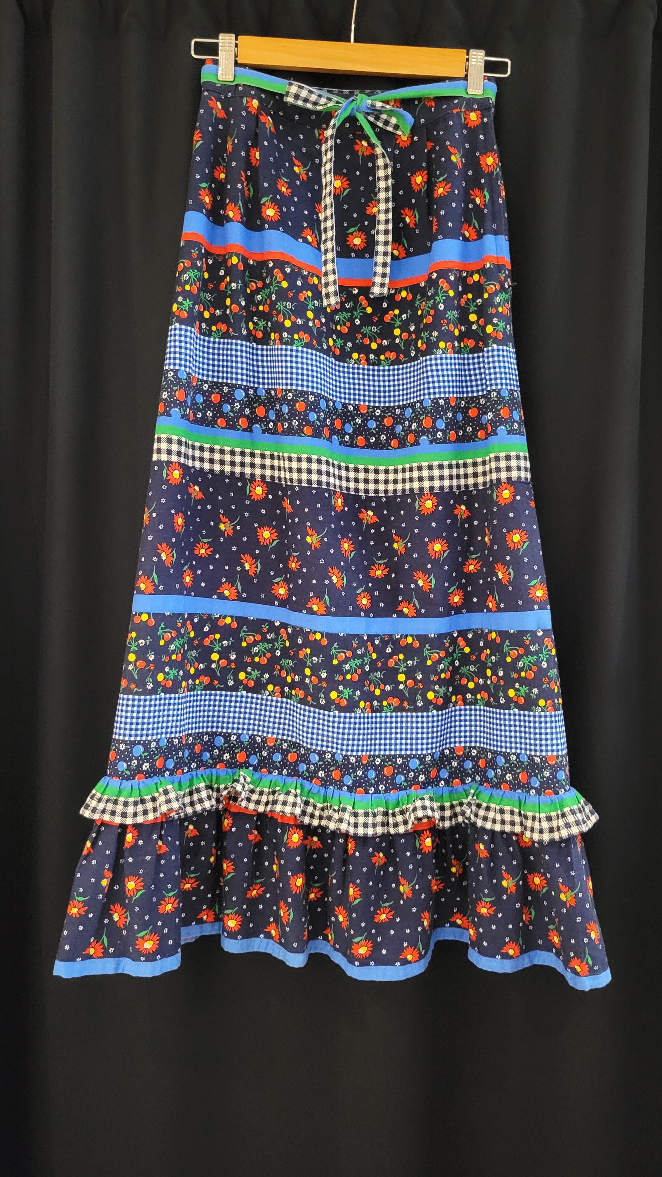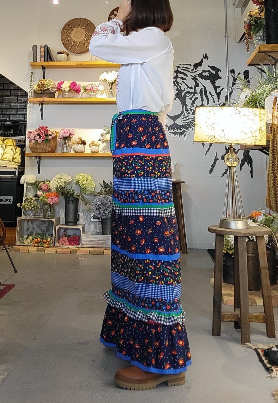 ヴィンテージのマキシスカート。素材表記はありませんがコットンです。左サイドにホック、スナップボタン、ジッパーが付いています。共布リボンが付いていますがスカートにベルトループはありません。ネイビーを基調に大小の異なる花柄とチェック柄の組み合わせがとても可愛いスカートです。