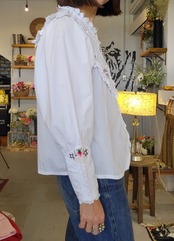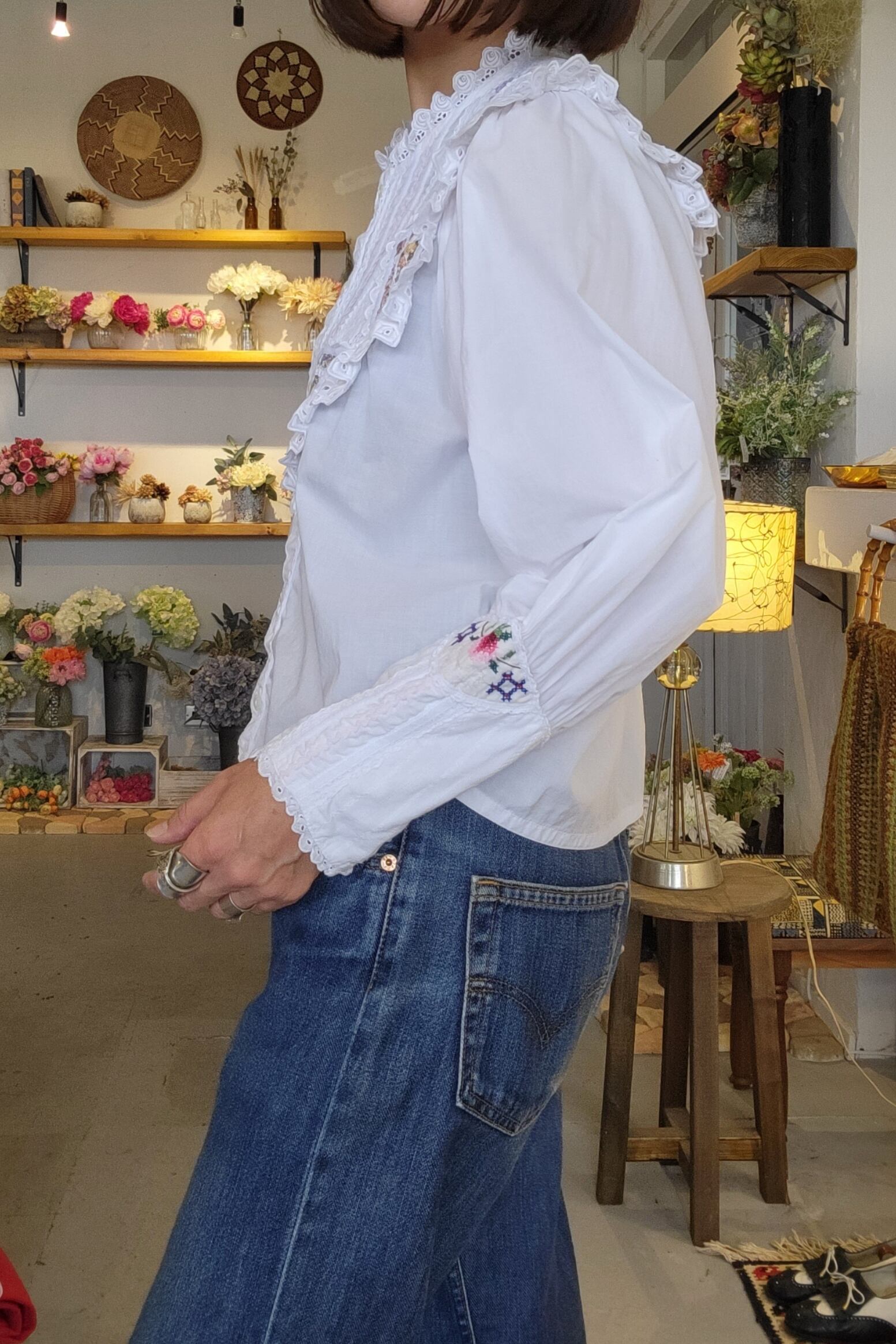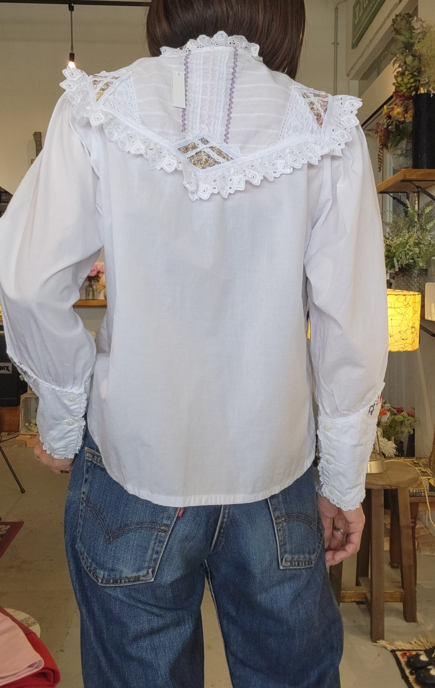 ヴィンテージのコットンブラウス。花柄の別布のパッチワーク等、凝ったデザインが魅力のブラウスです。インでもアウトでもお楽しみいただけます。