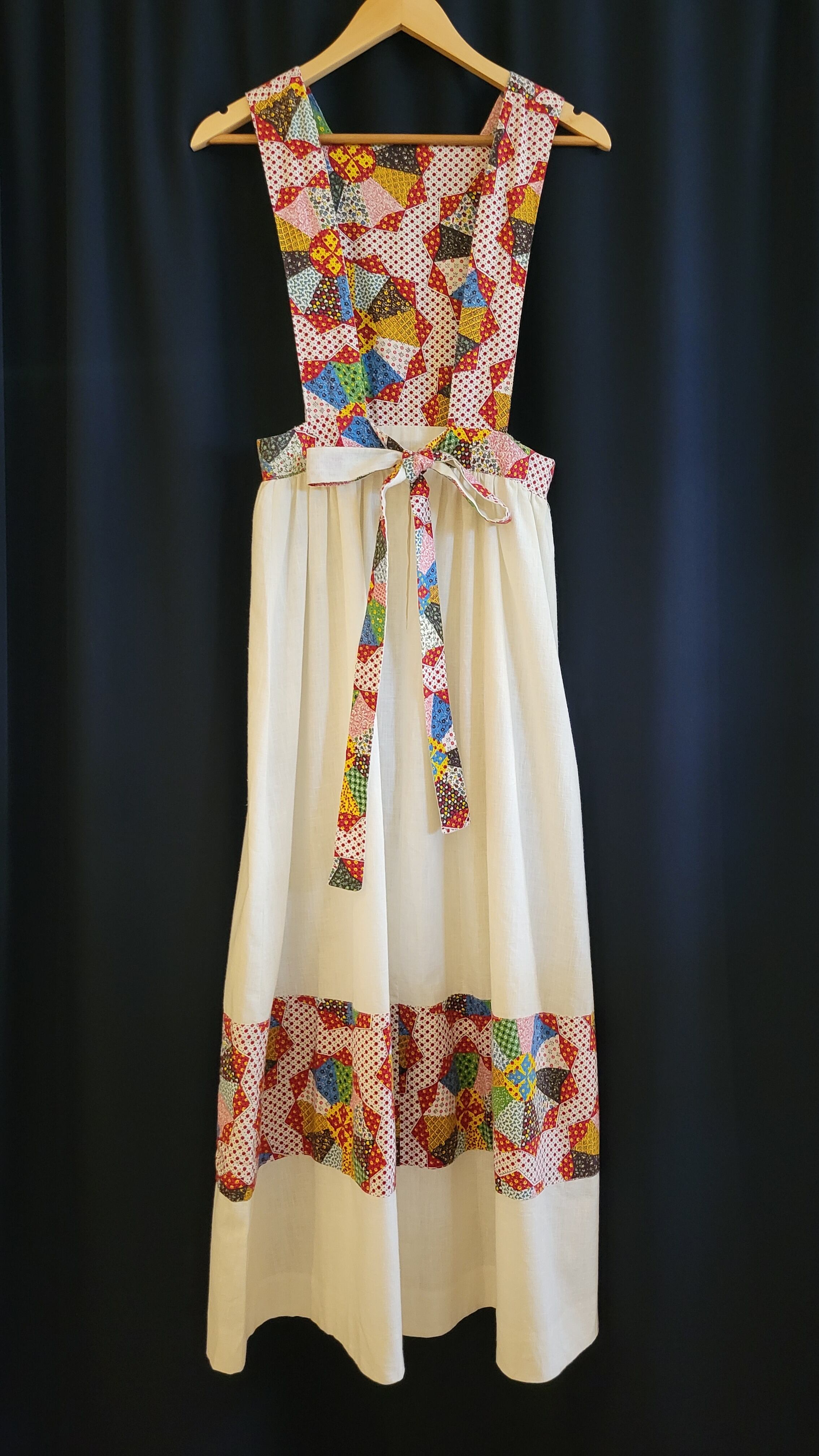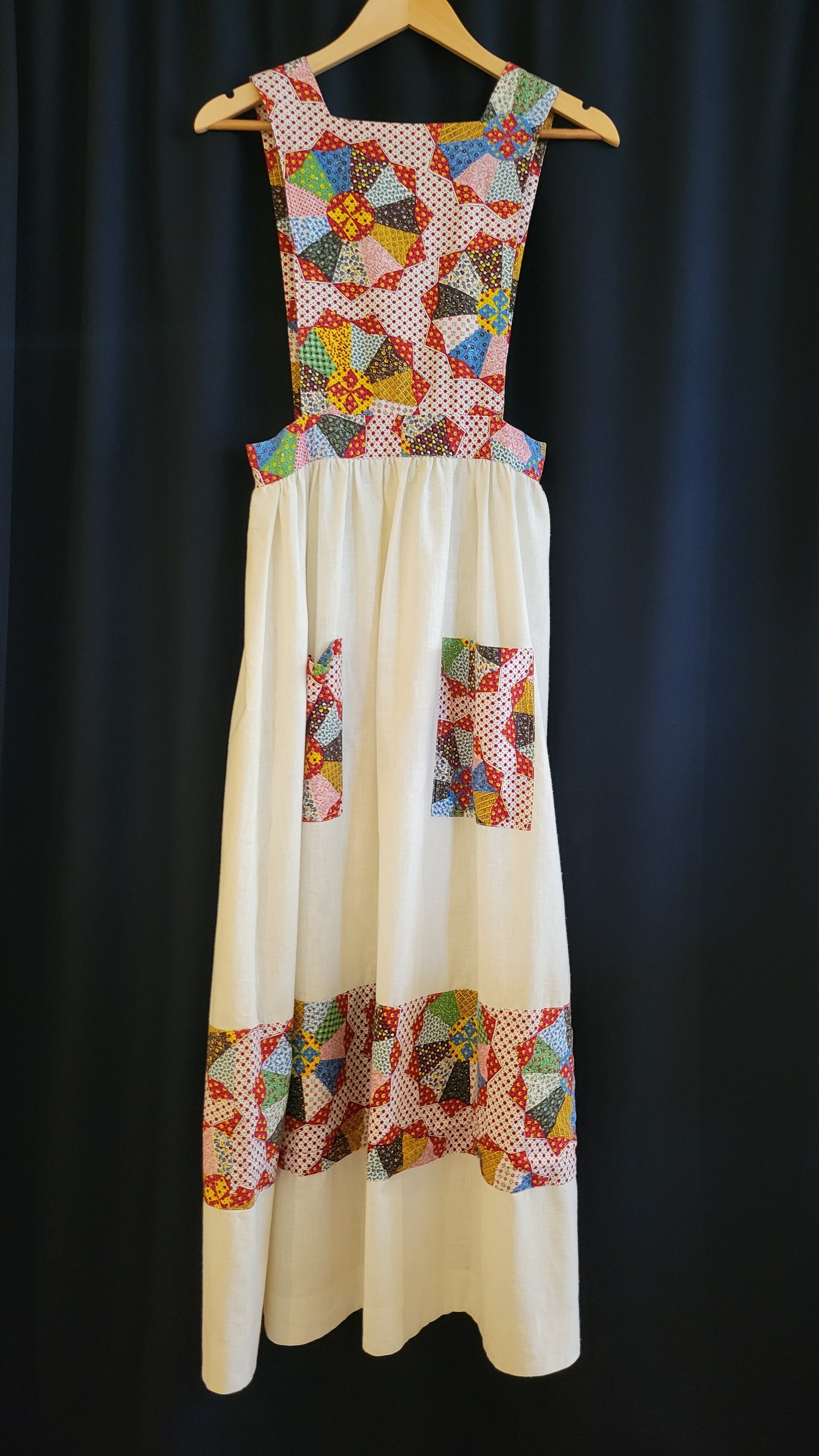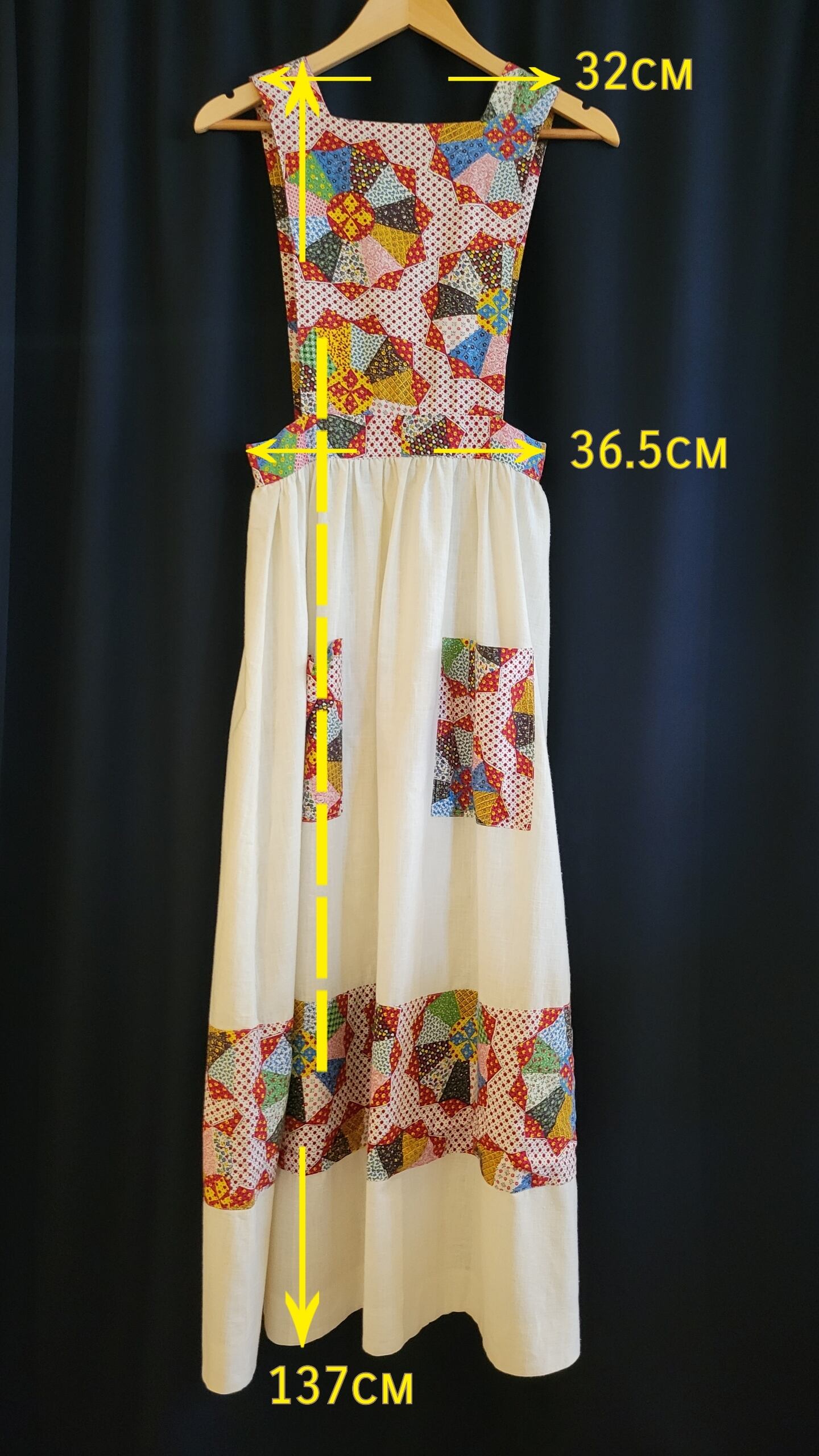 パッチワーク柄のヴィンテージエプロンワンピース。素材表記はありませんがコットンです。珍しいバックファスナー付きで着用時に安定感があります。