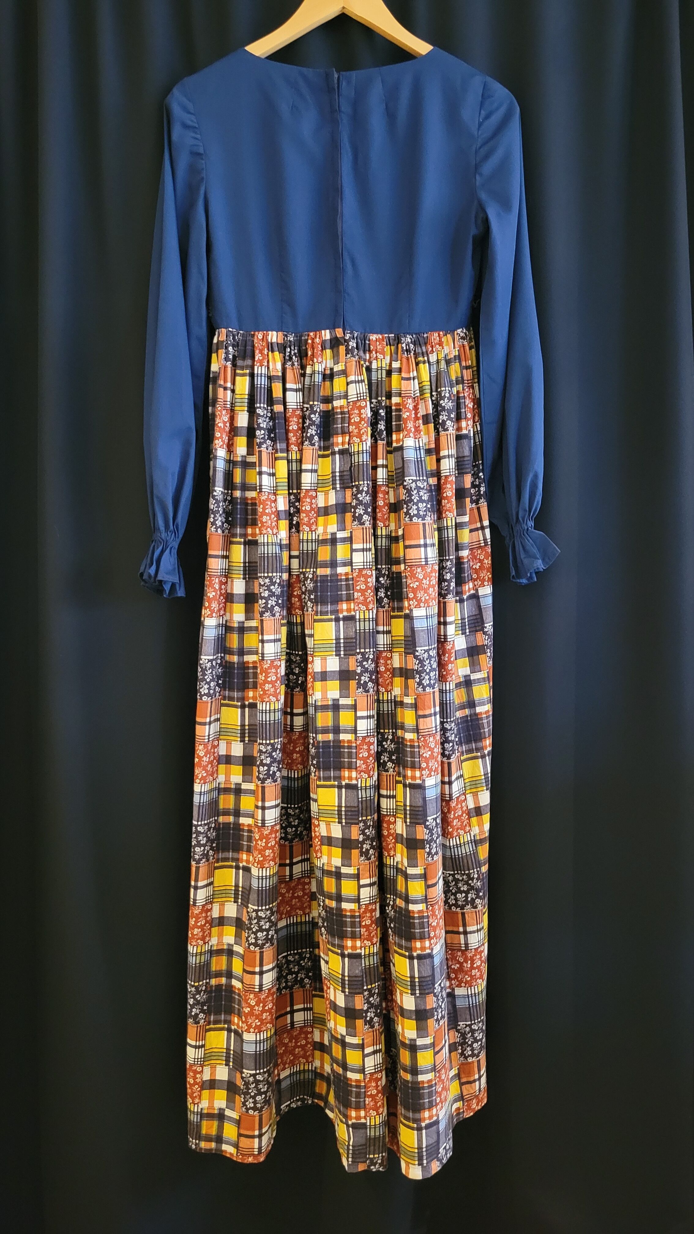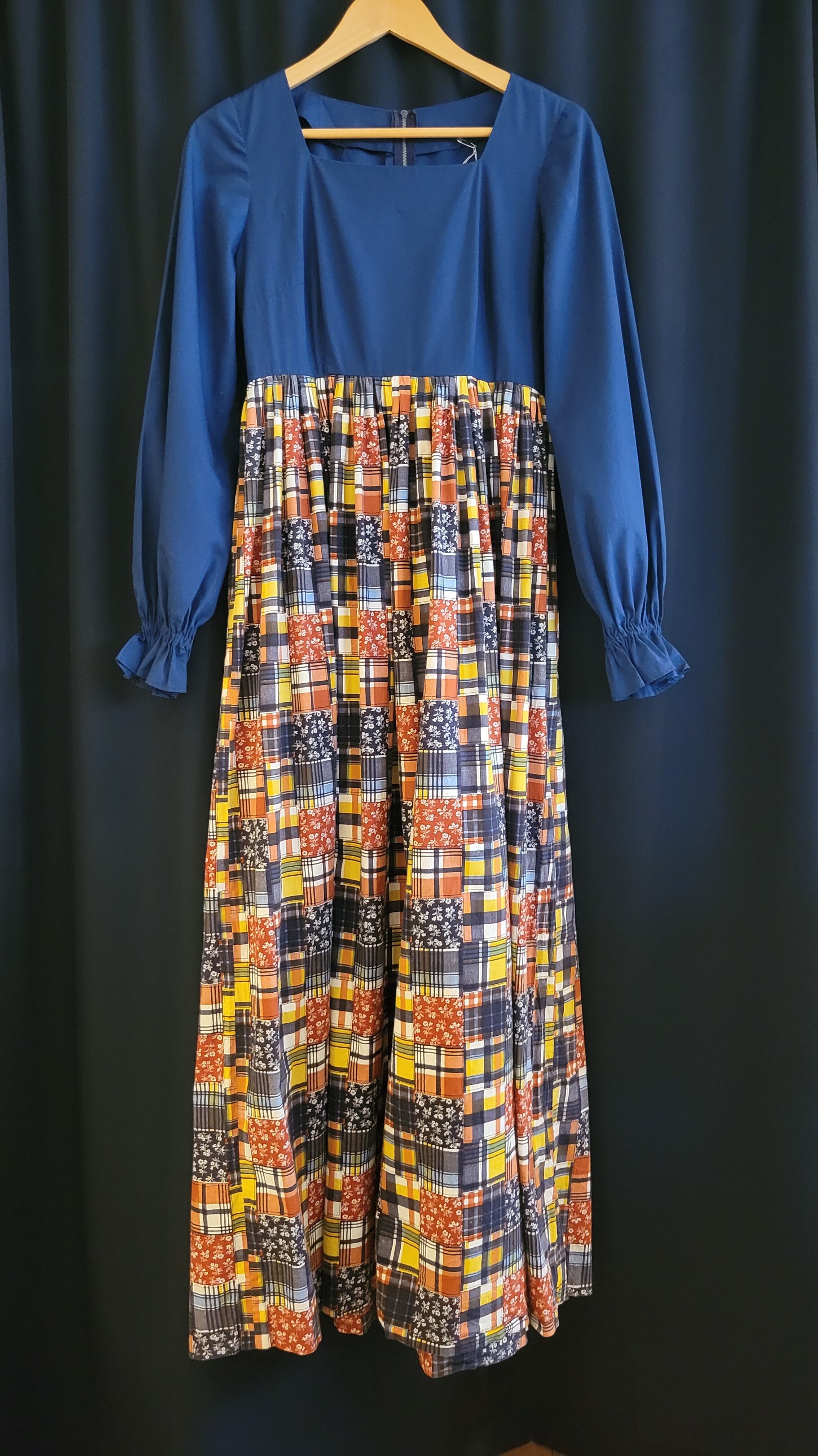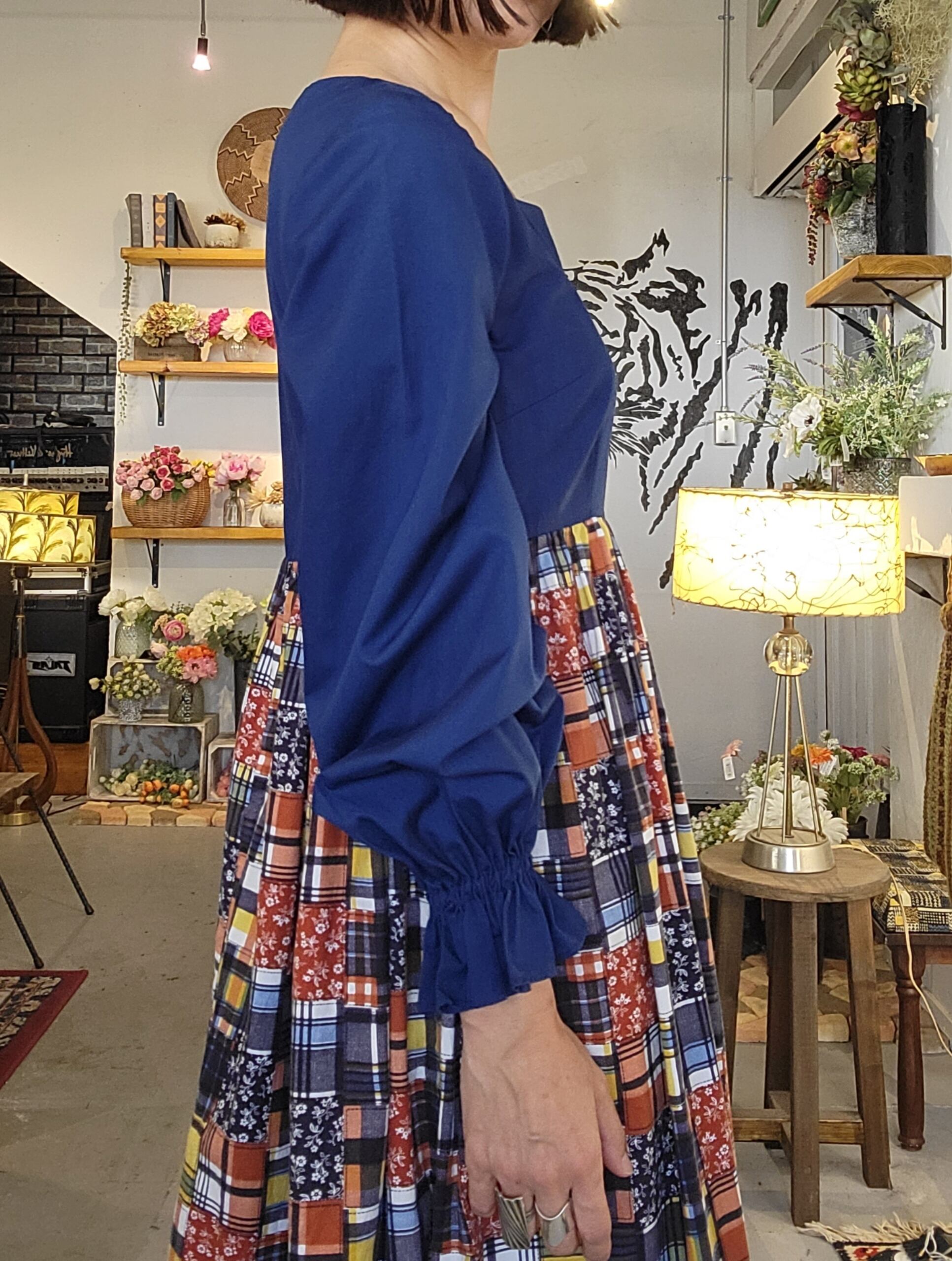 パッチワークプリントのヴィンテージマキシドレス。素材表記はありませんがコットン、もしくはポリエステル混のコットンのようです。伸縮性、透け感はありません。さらりとした肌触り。カフスがゴム仕様できゅっと絞られるふんわりスリーブシルエット。ほどよく開いたデコルテ周りはお顔周りをすっきりと。ハイウエスト位置から広がる生地をたっぷりと使用したマキシ丈は脚長効果も。1枚で仕上がるワンピースです。