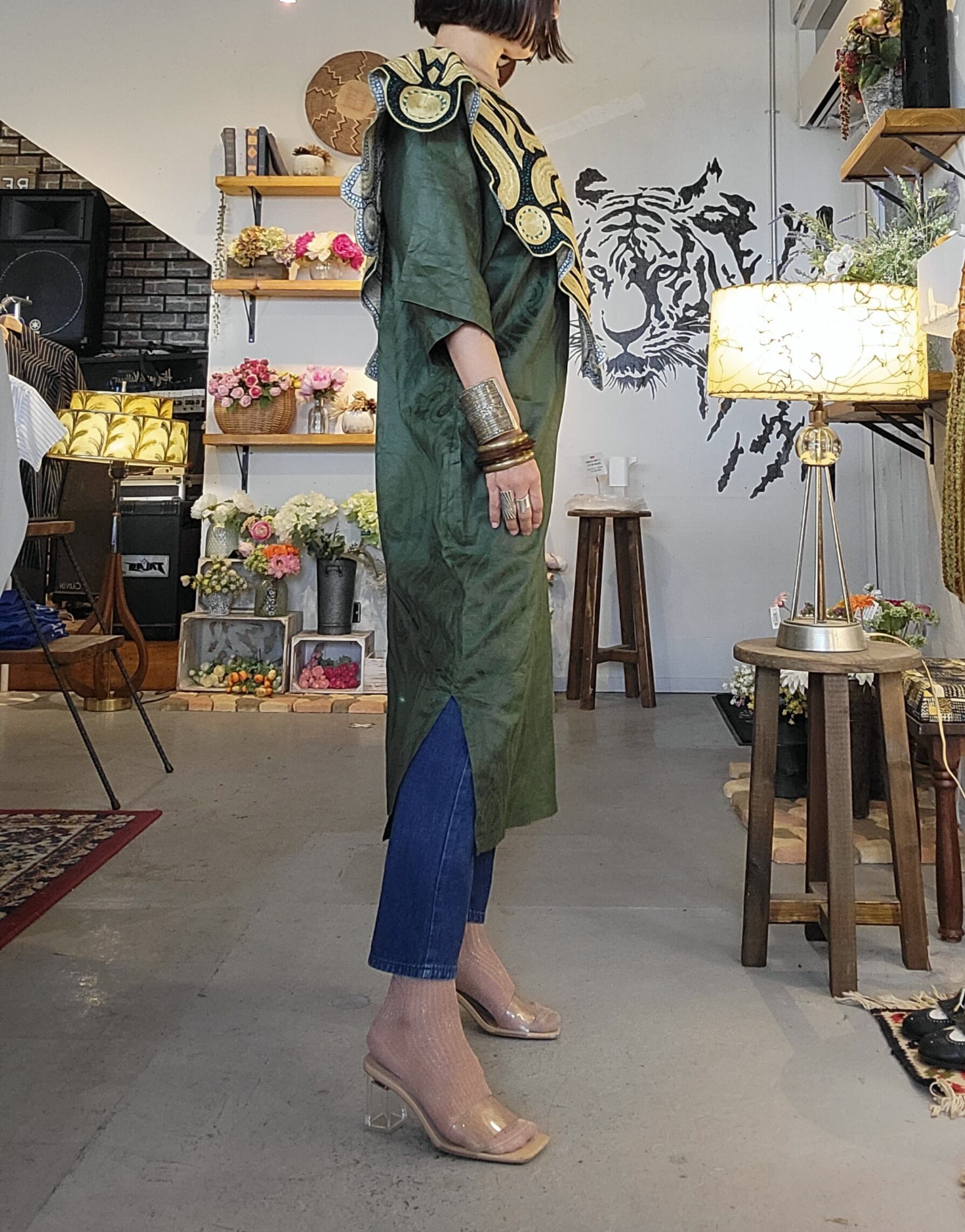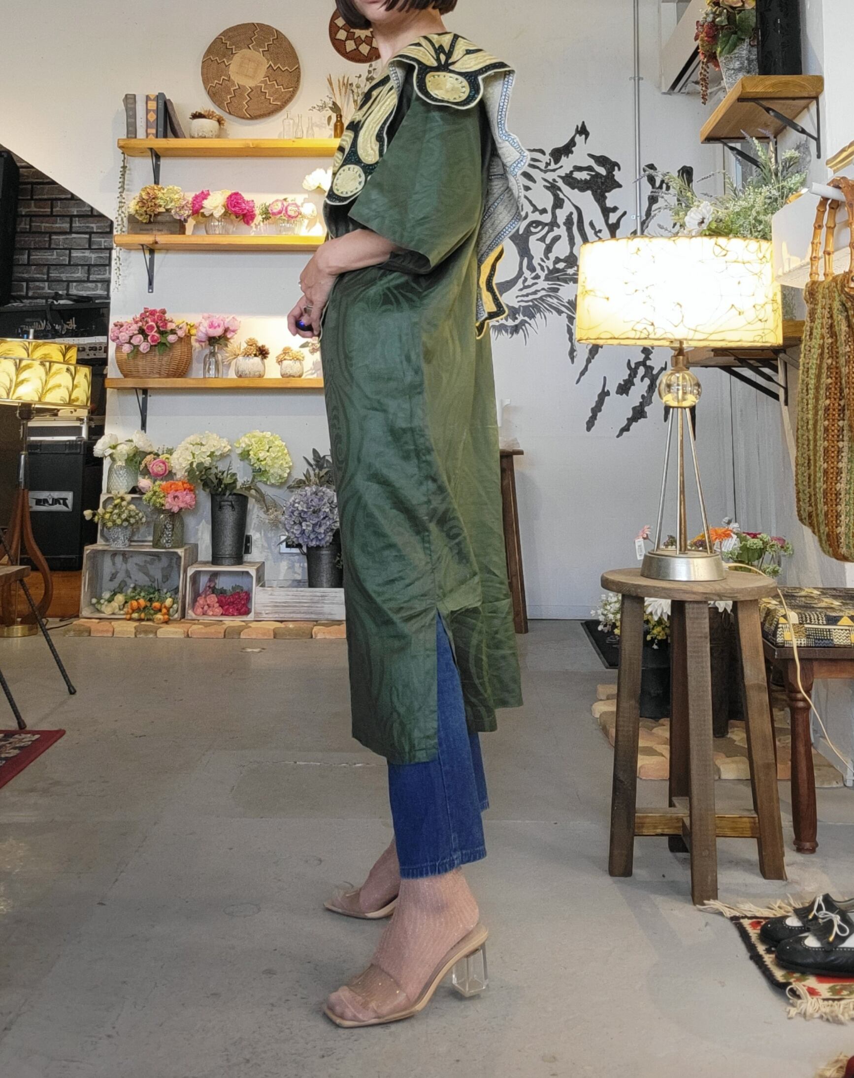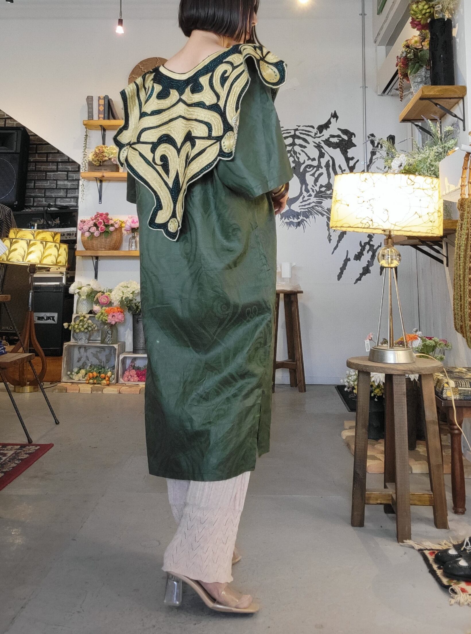 総刺繍の大きな襟が目を引くヴィンテージワンピース。素材表記はありませんが身ごろはやや光沢のある地模様入りでコットンとポリエステルの混紡のような素材感です。伸縮性、透け感はありません。さらりとした肌触り。両サイド裾から20cmのスリット入りで足さばきが楽です。正面、サイド、バックどこから見てもインパクトのある個性的なヴィンテージピース。