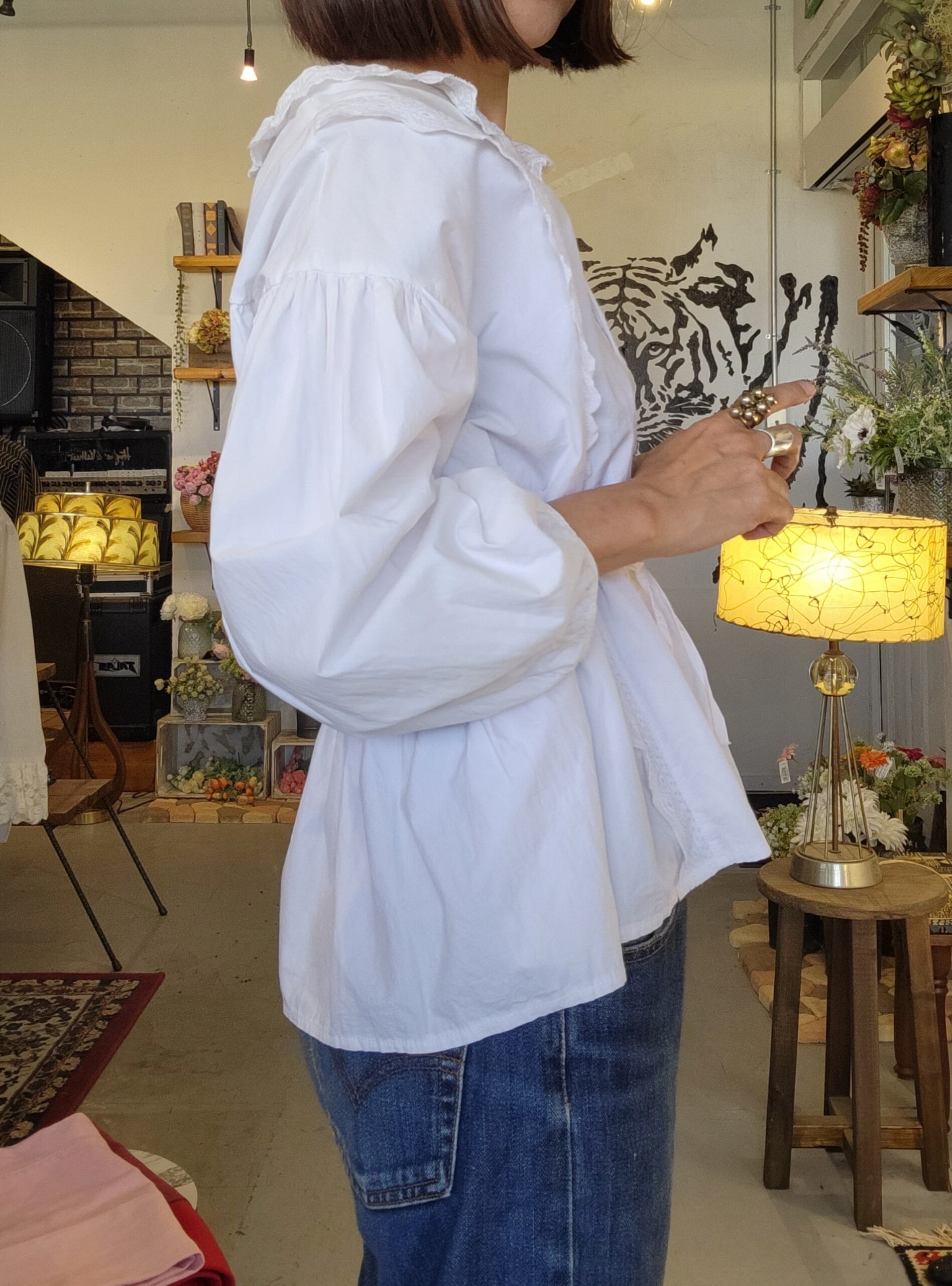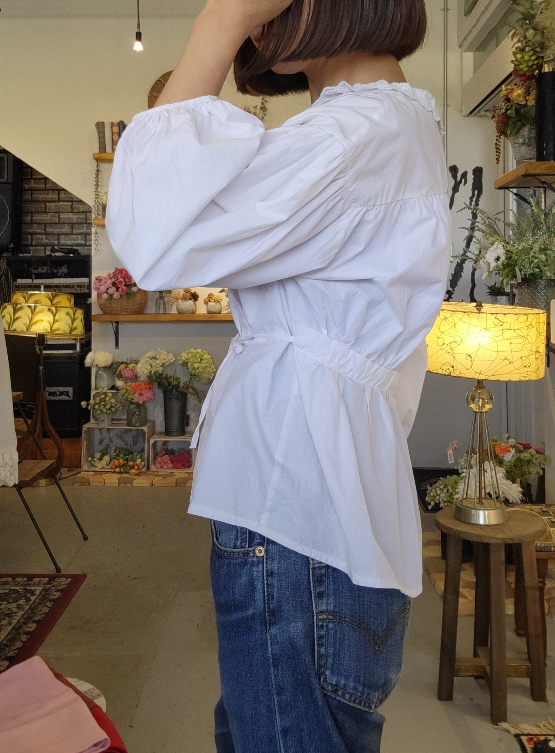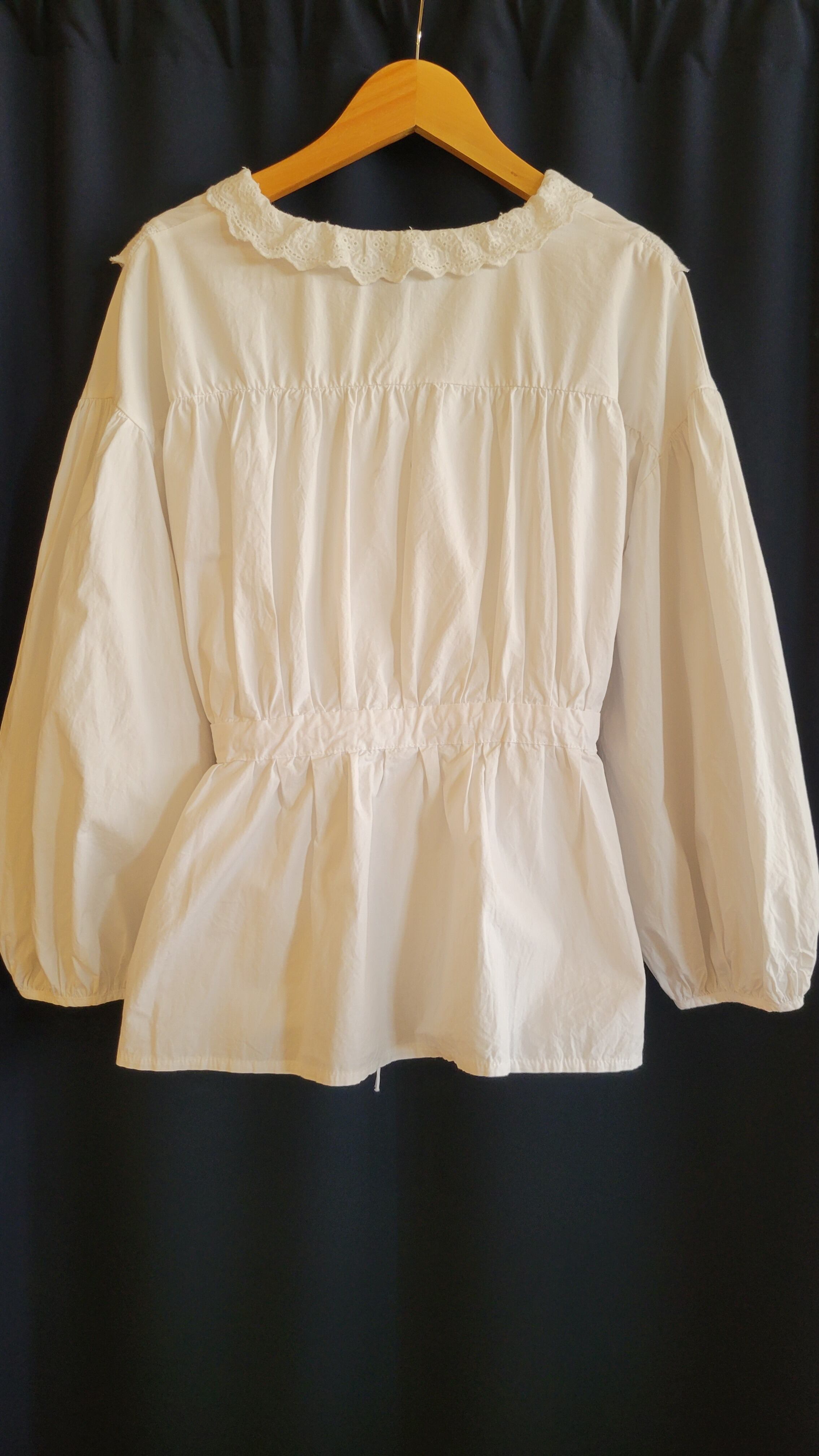 ヴィンテージのホワイトレースブラウス。素材表記はありませんがコットンです。やや張り感があります。伸縮性はありません。ペプラムデザイン&ウエストリボン付きでめりはりのあるきれいなシルエットが叶います。ボトムを選ばず幅広いスタイリングに使える1枚。