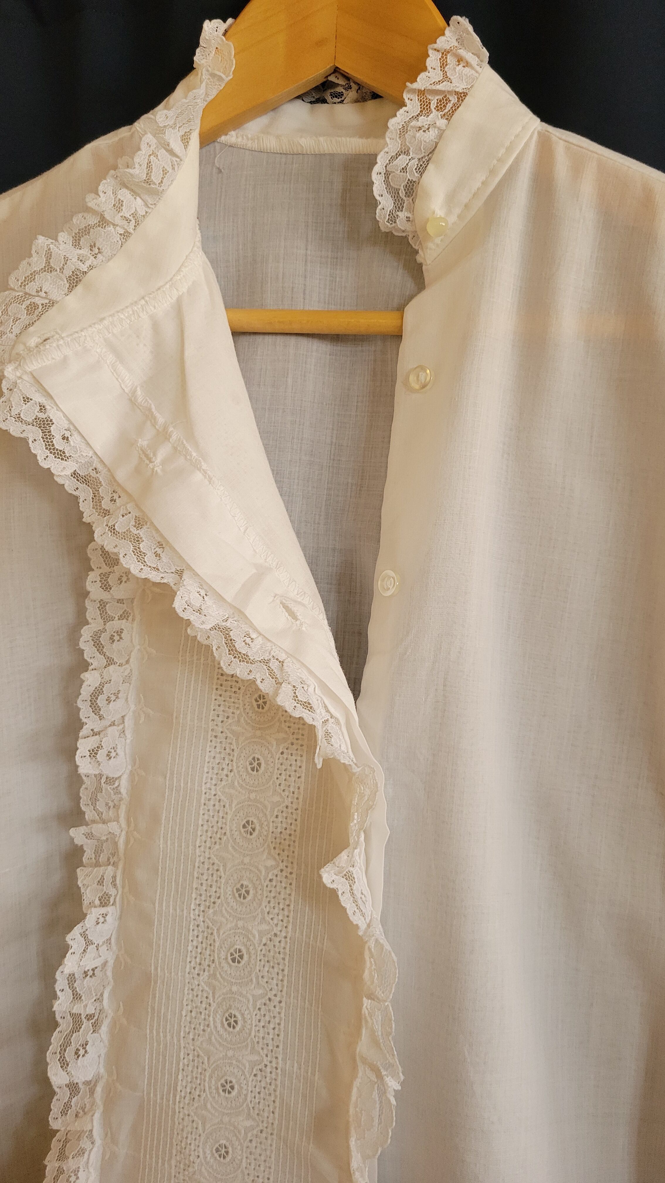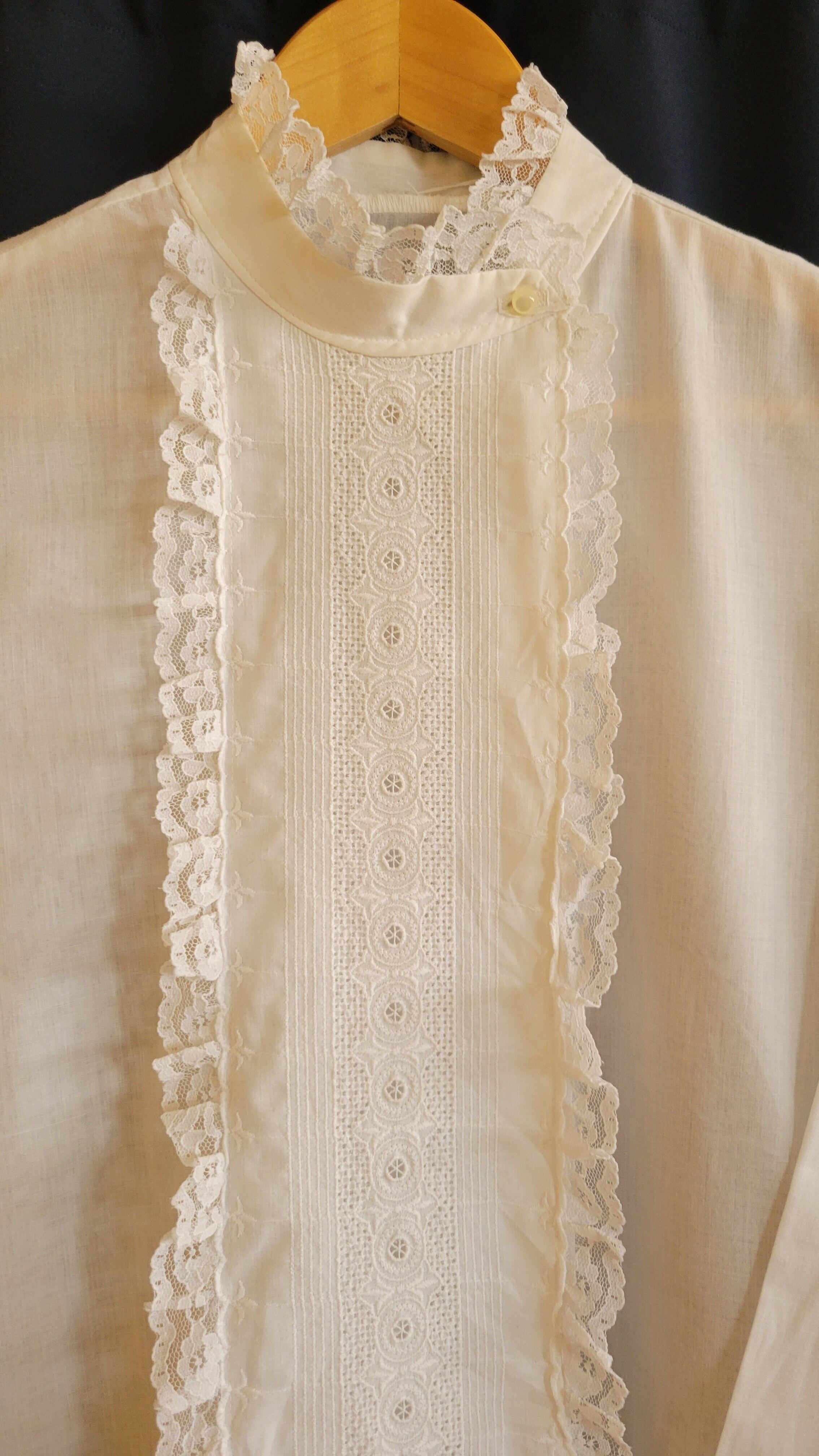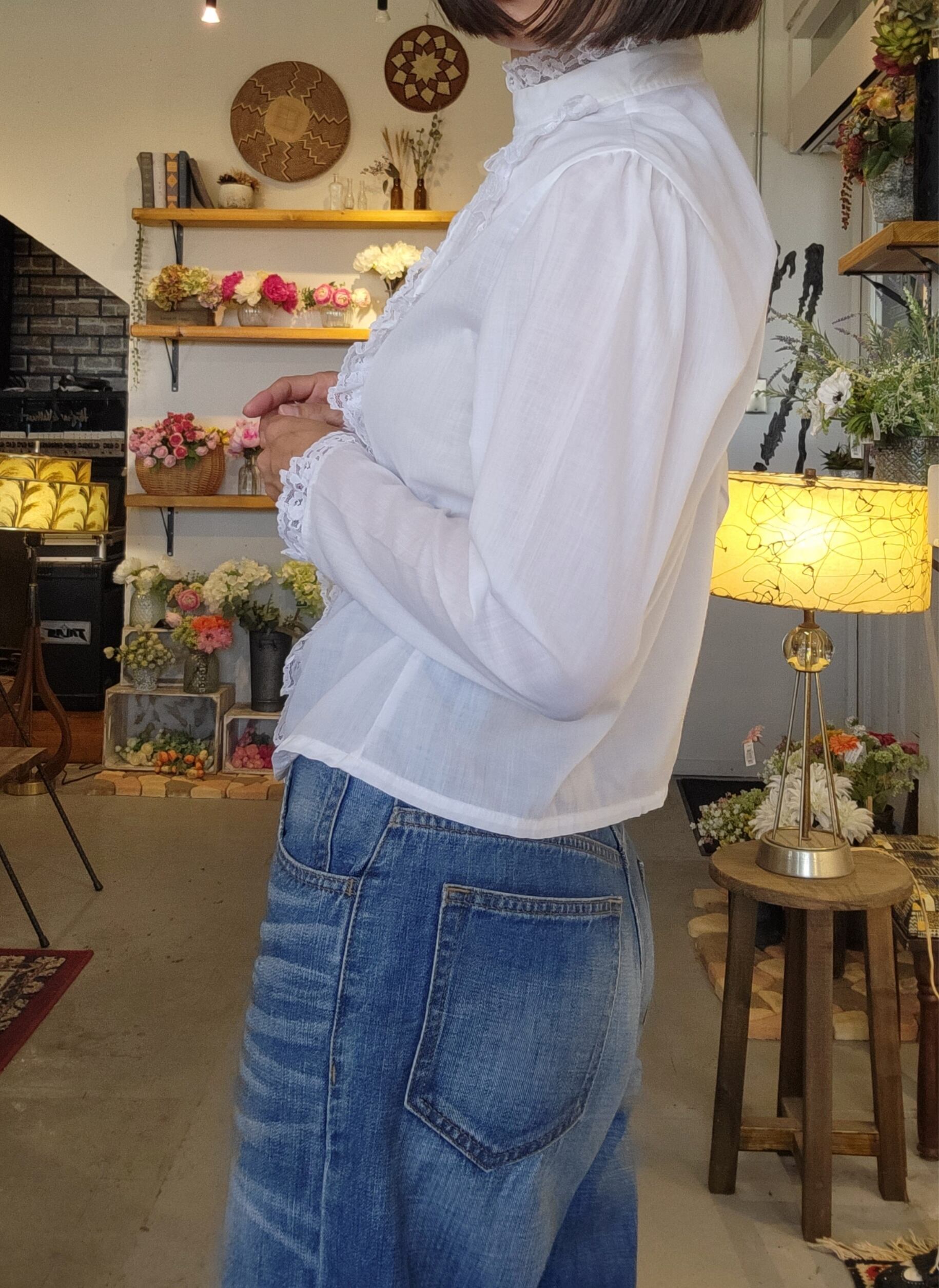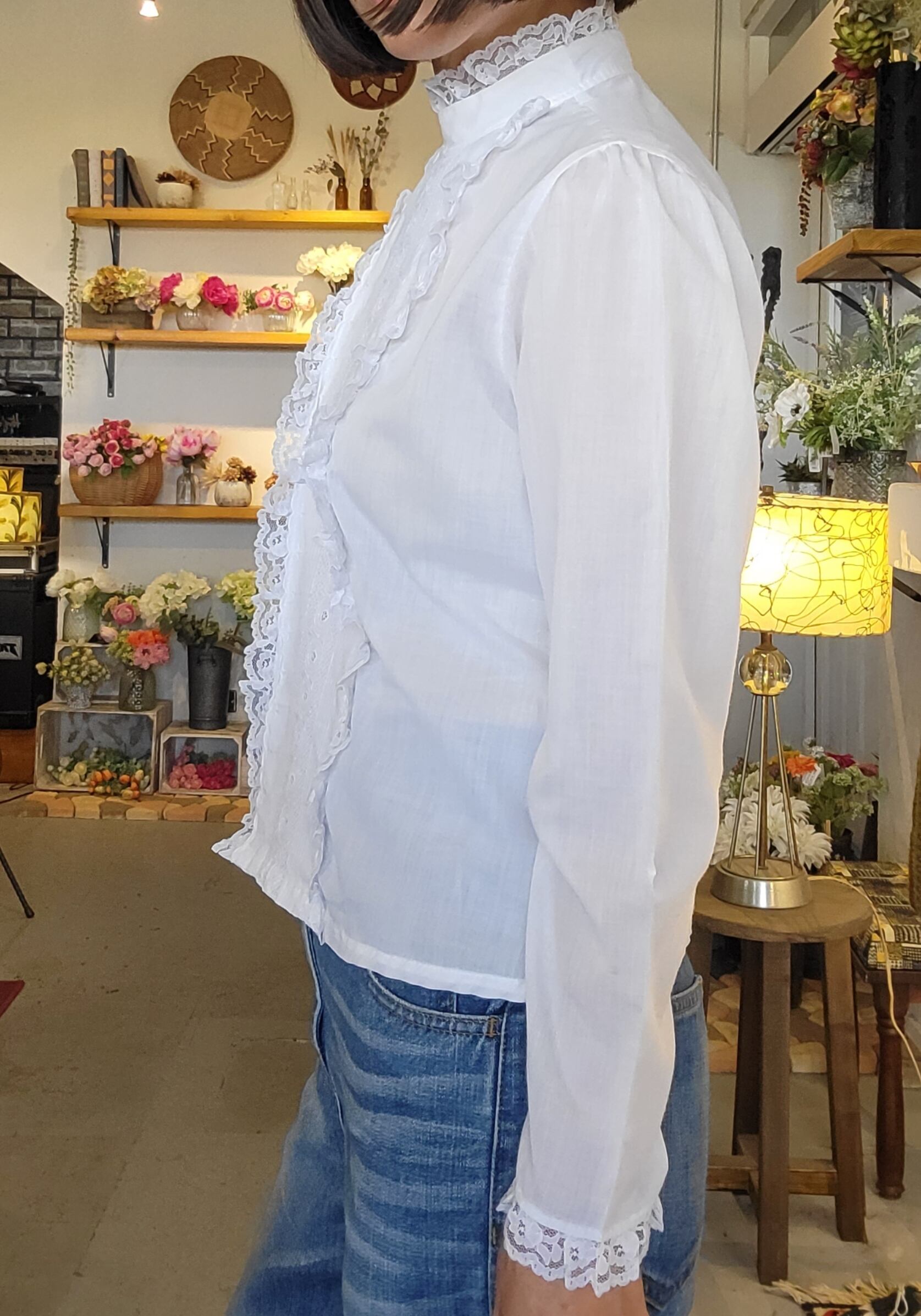 ヴィンテージのホワイトレースブラウス。素材表記はありませんがコットンとポリエステルの混紡のような素材感です。伸縮性は無く若干の透け感があります。柔らかい肌触り。フロントの繊細な刺繍とレース使いが魅力の1枚。きれいめパンツに合わせてフォーマルにも、デニムやワークパンツに合わせてカジュアルにもお楽しみいただけます。
