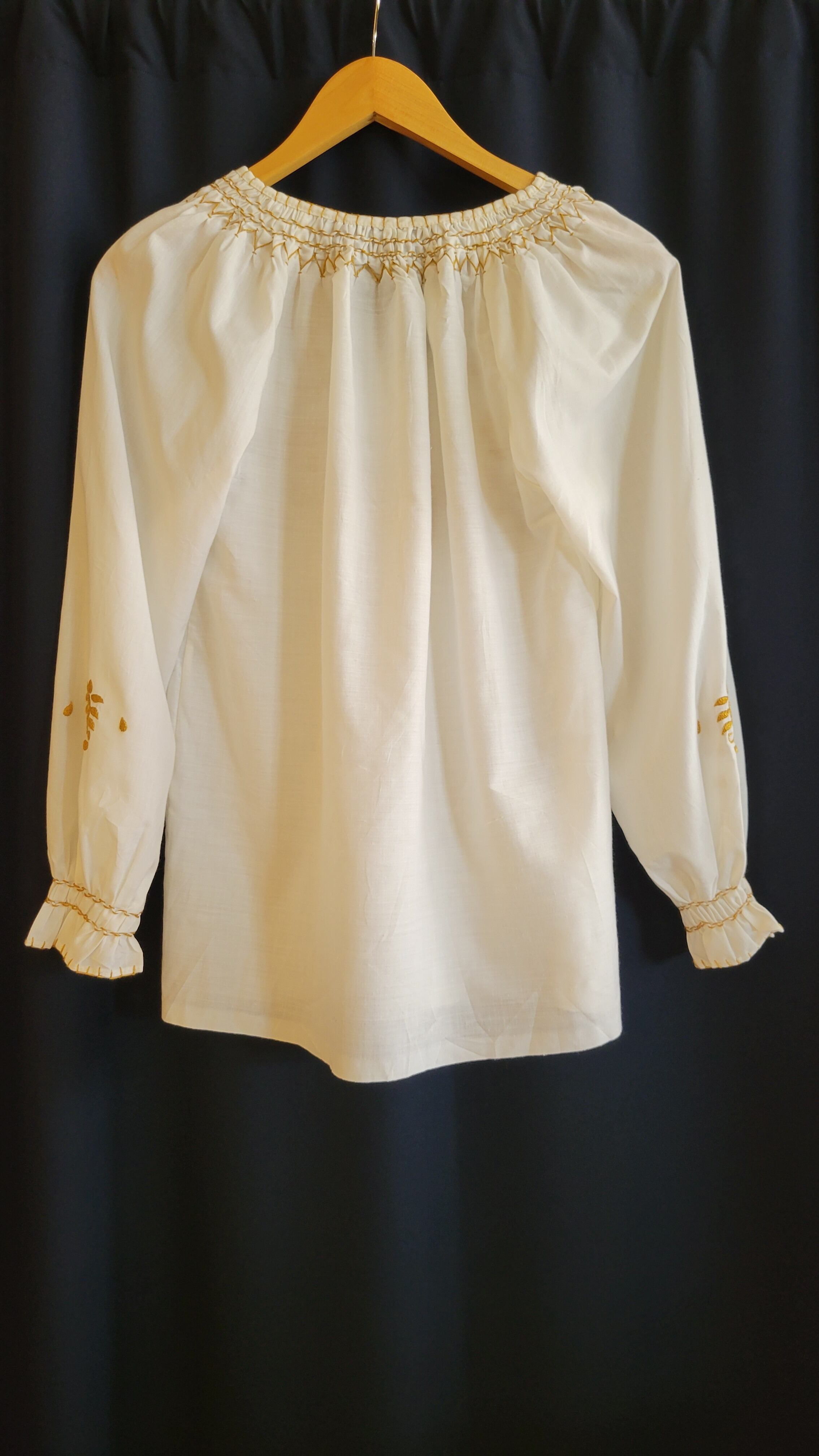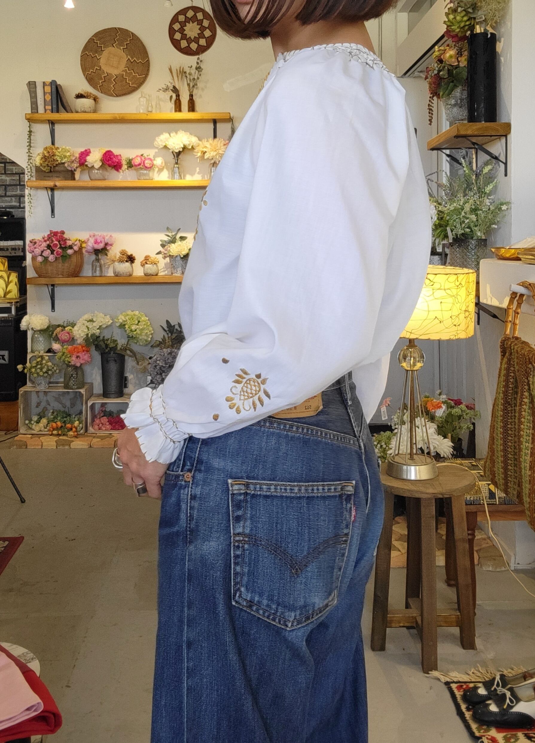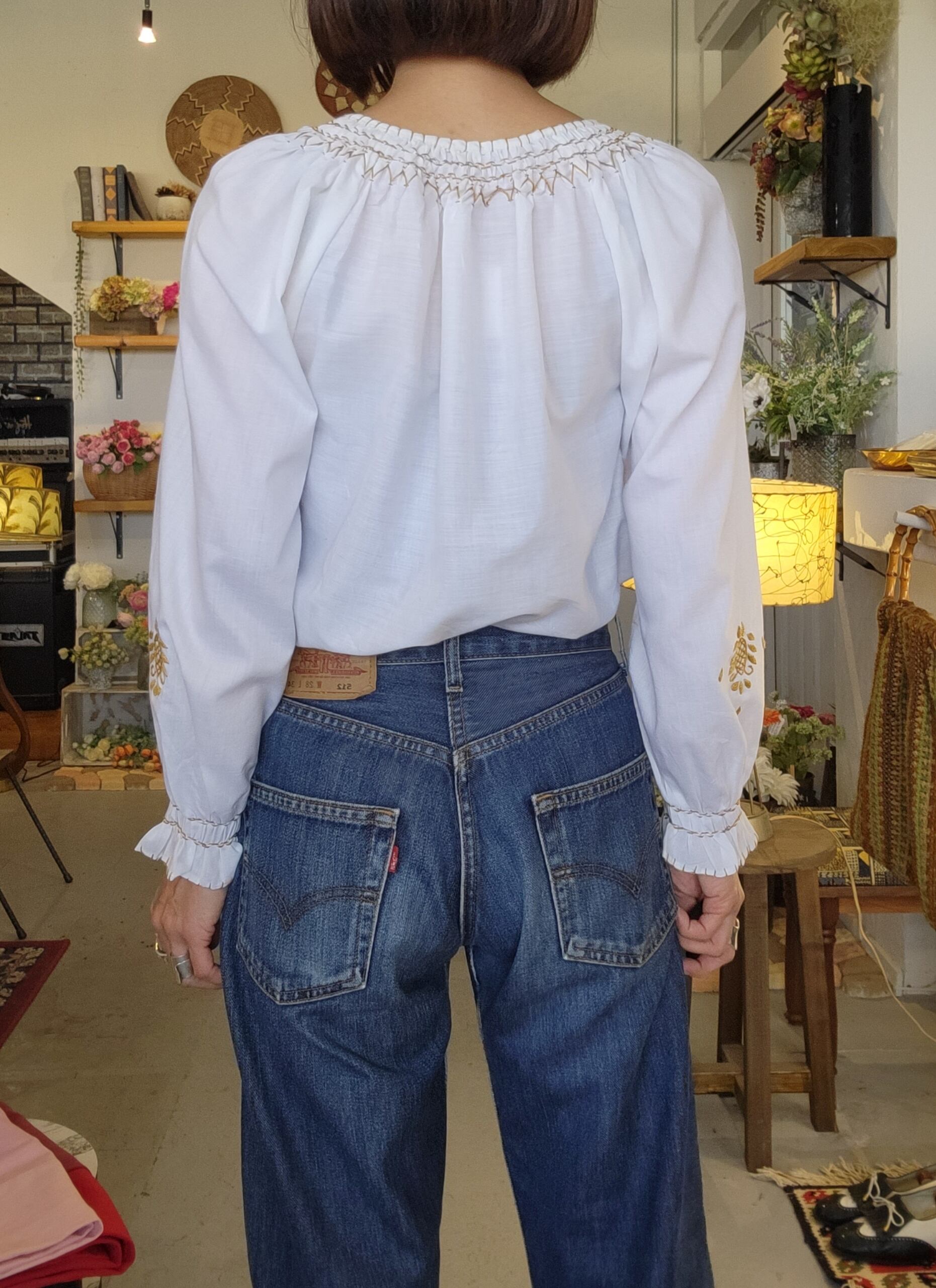 ヴィンテージの手刺繍入りスモックブラウス。素材表記はありませんがコットンとポリエステルの混紡のような素材感です。伸縮性は無く、若干の透け感があります。さらりとした肌触り。首周りやカフスに施された手刺繍と身ごろのギャザーが温かみのある雰囲気。ボトムを選ばない万能トップスです。