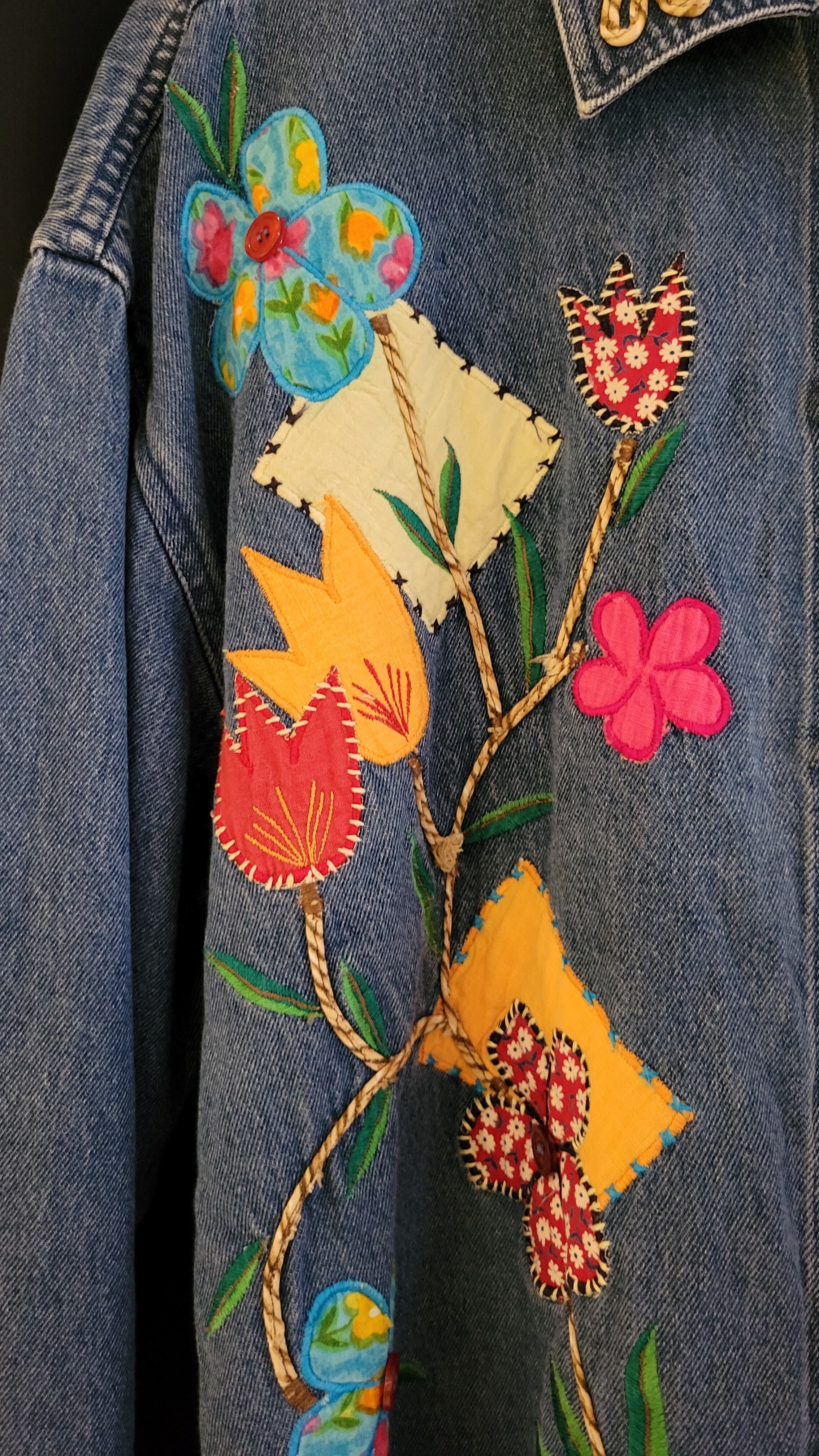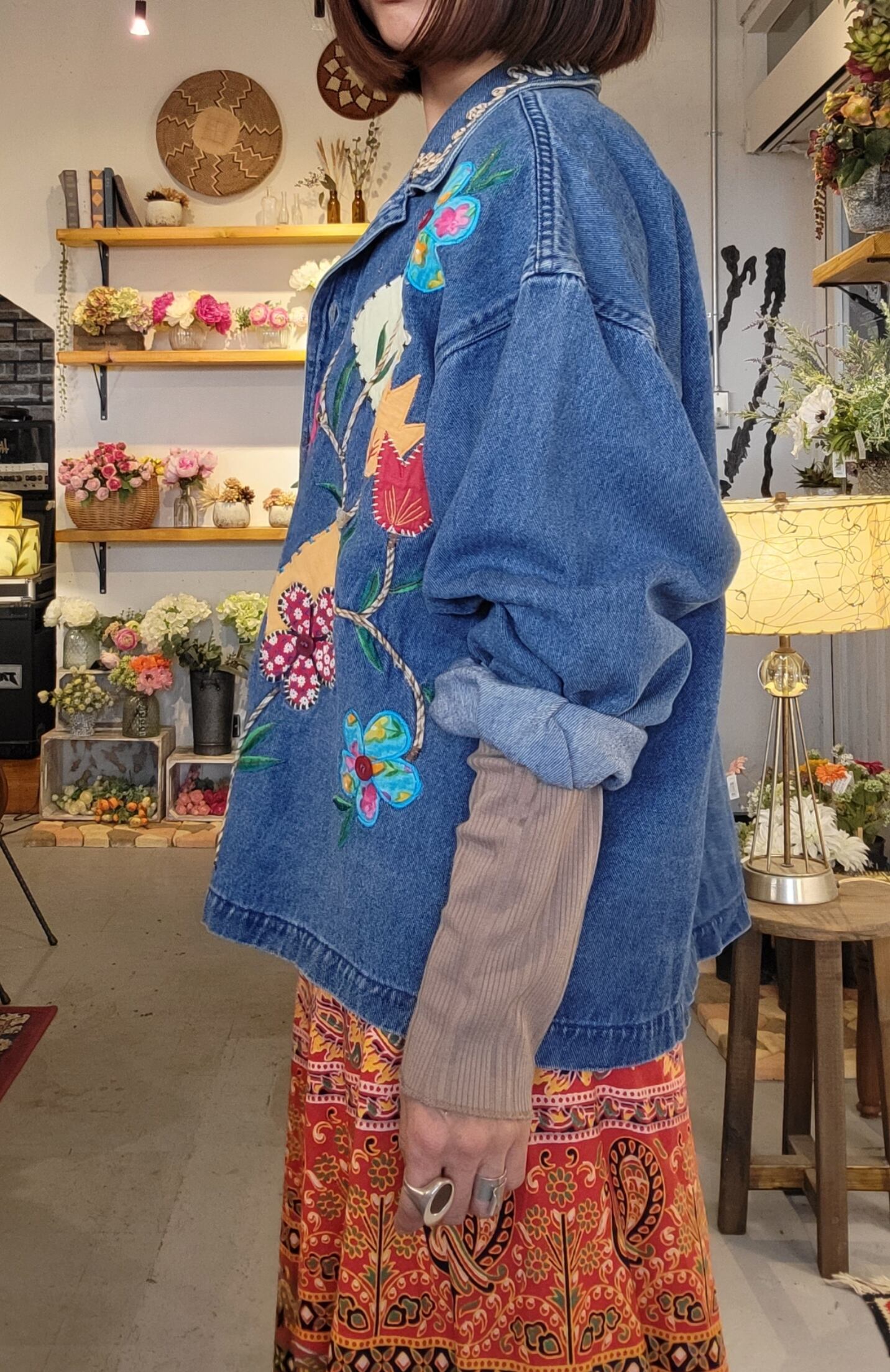 ヴィンテージのデニムシャツジャケット。フロント全面に施された立体的なパッチワークや刺繍が華やかです。デニムはほどよくくたっと馴染んでおり柔らかな着心地。オーバーサイズでゆったりと着てこなれた印象に。