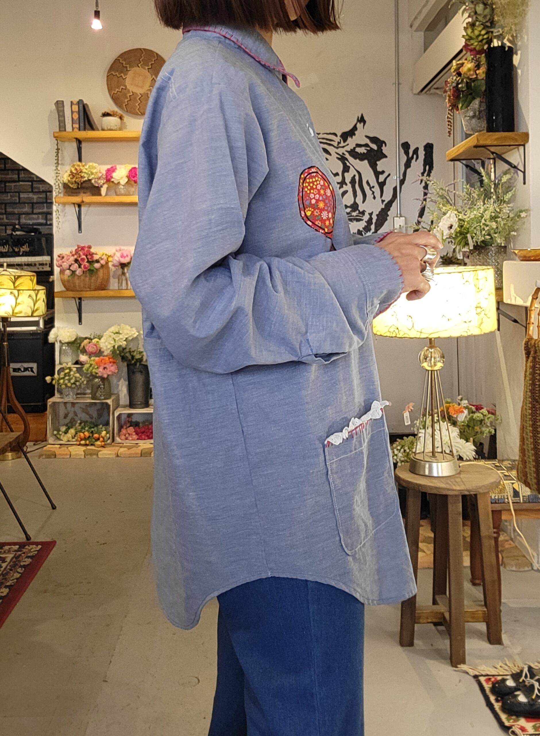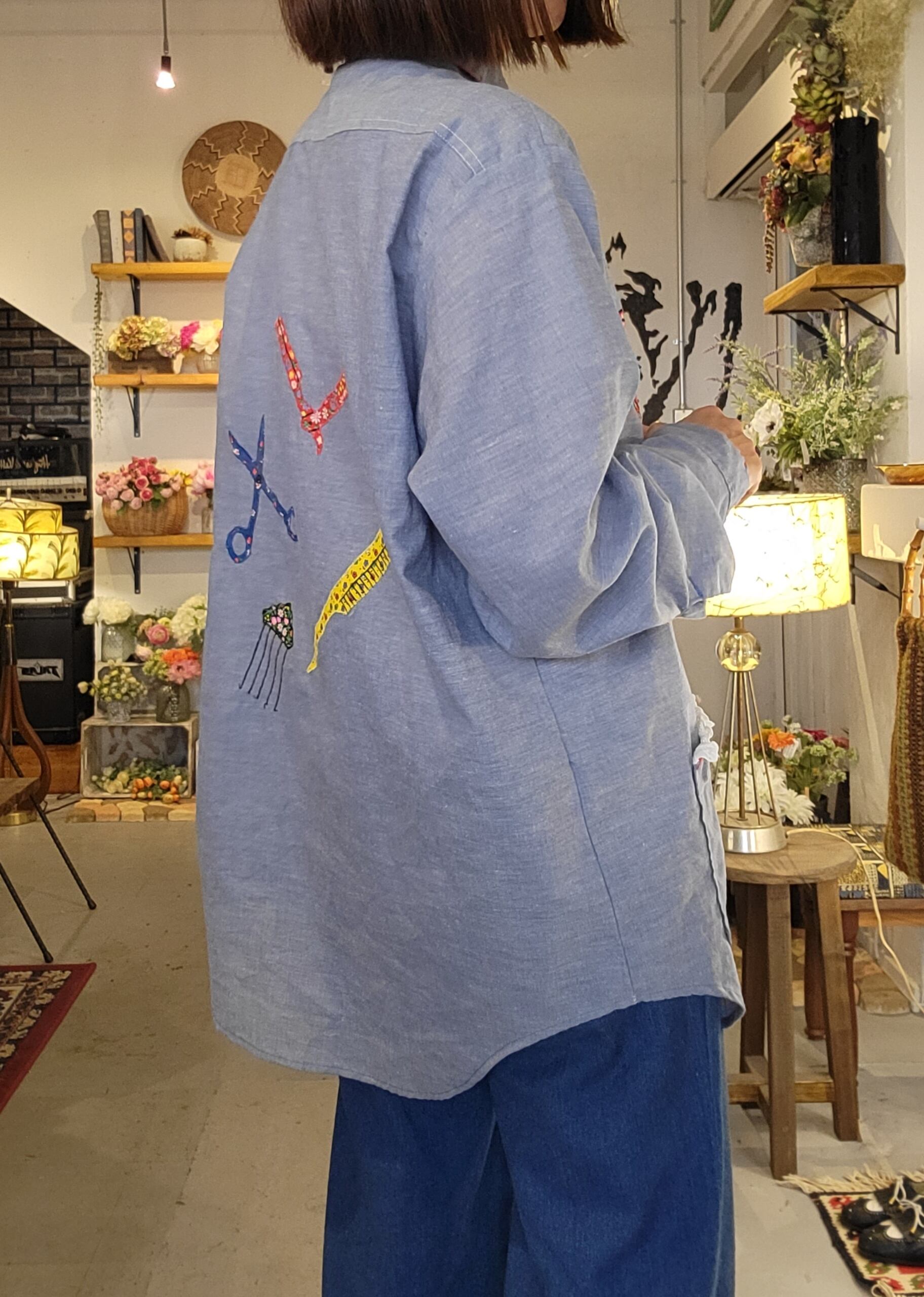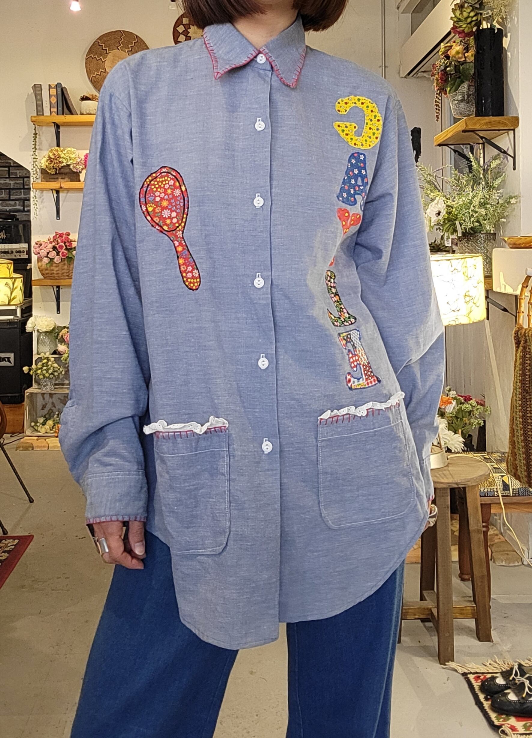 ヴィンテージのBIG MAC シャンブレーシャツ。素材はコットン50% ポリエステル50%です。さらりと涼しい素材感です。パッチワークやハンドステッチが可愛らしい1枚。メンズサイズ・仕様ですが、男性はもちろん、女性がオーバーサイズで着用しても素敵です。ハサミやコームのパッチワークモチーフは美容師さんにもおすすめ。