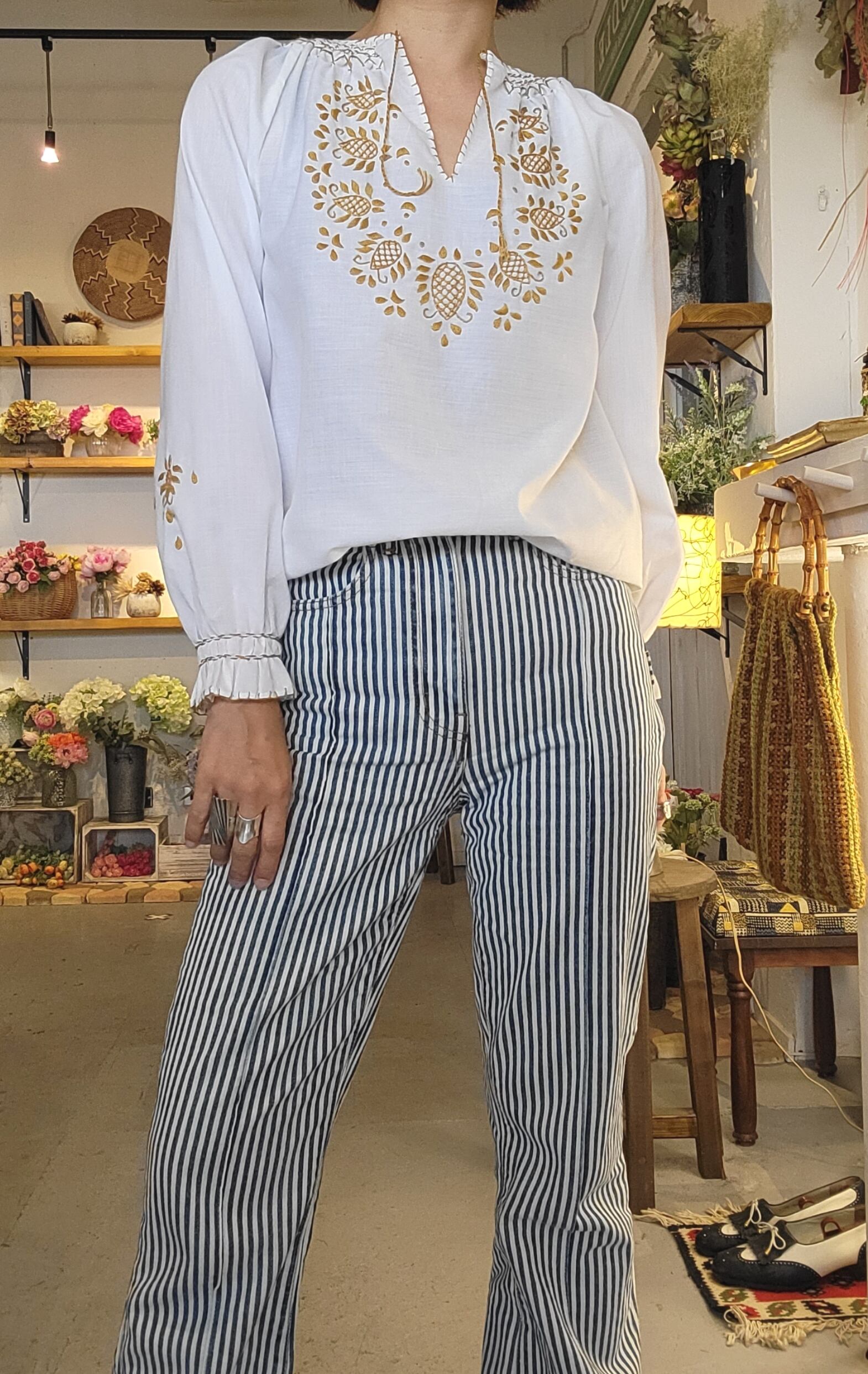 バックスタイル星モチーフの切り替えが可愛いヒッコリーパンツ。ハイウエスト&フレアのきれいなシルエットです。