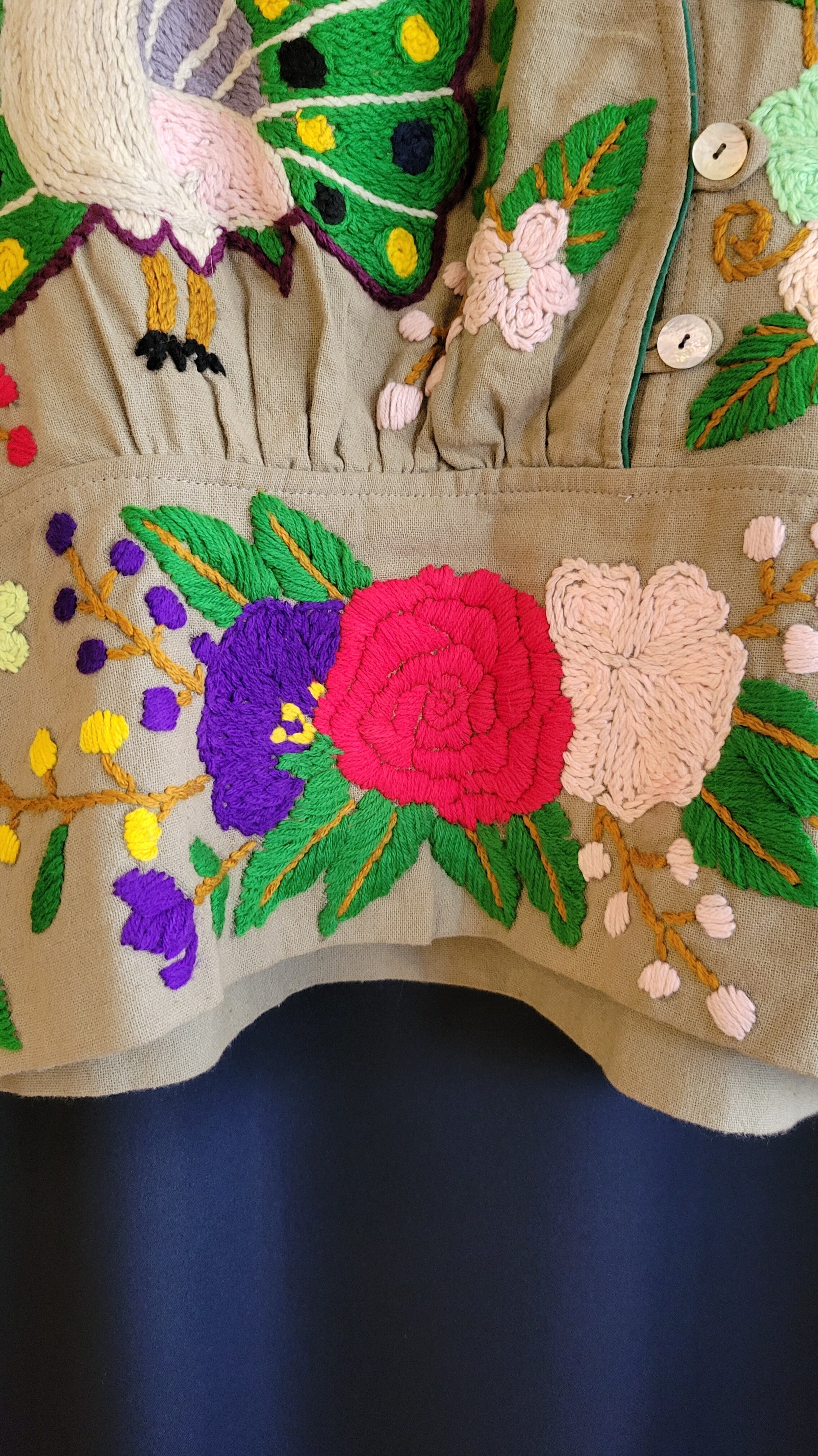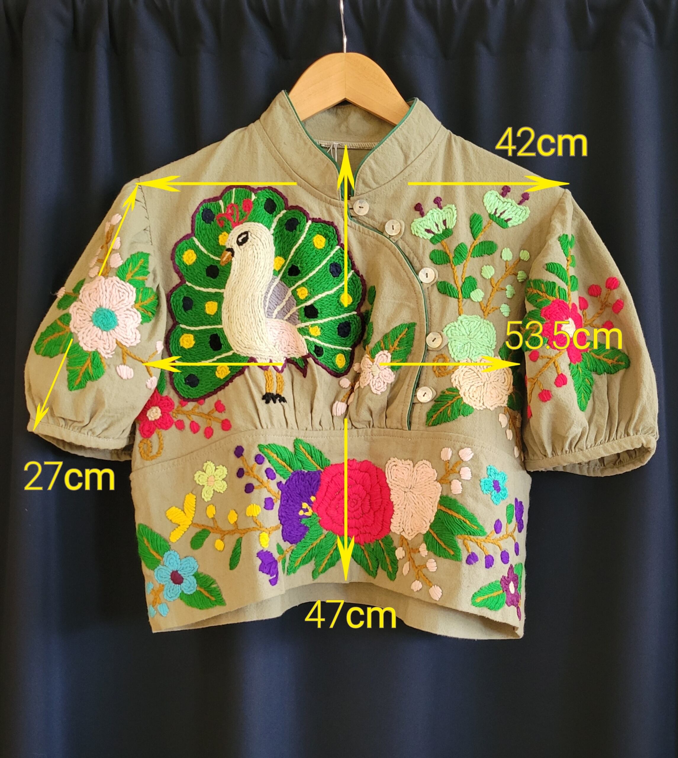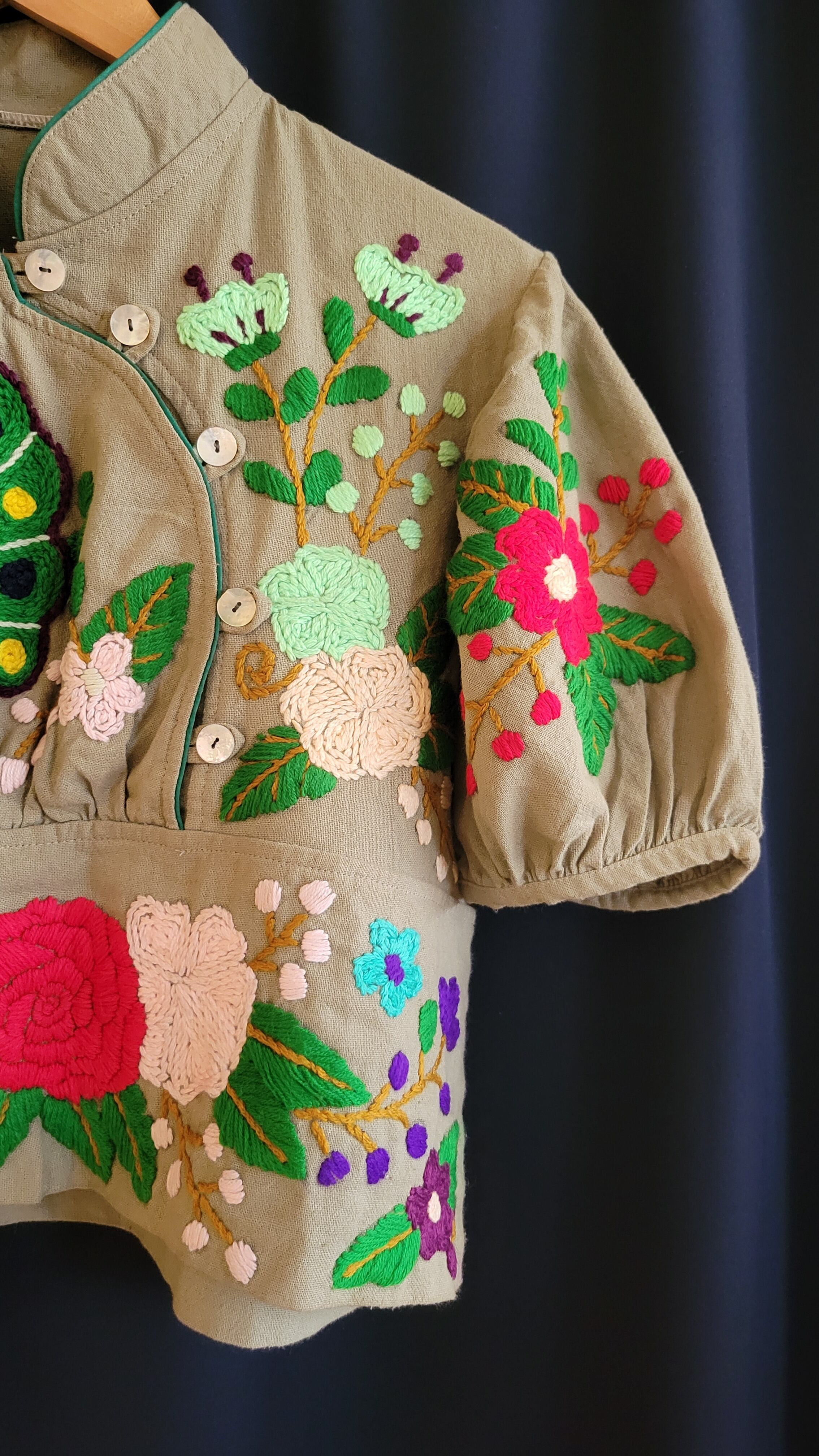 ヴィンテージの手刺繍ブラウス。素材表記はありませんがコットンです。フロント全面の立体的な手刺繍はもちろんのこと、立ち襟やボタンの配置、パフスリーブ、ショート丈等、ひとつひとつのディテールが絶妙な唯一無二のスペシャルピースです。