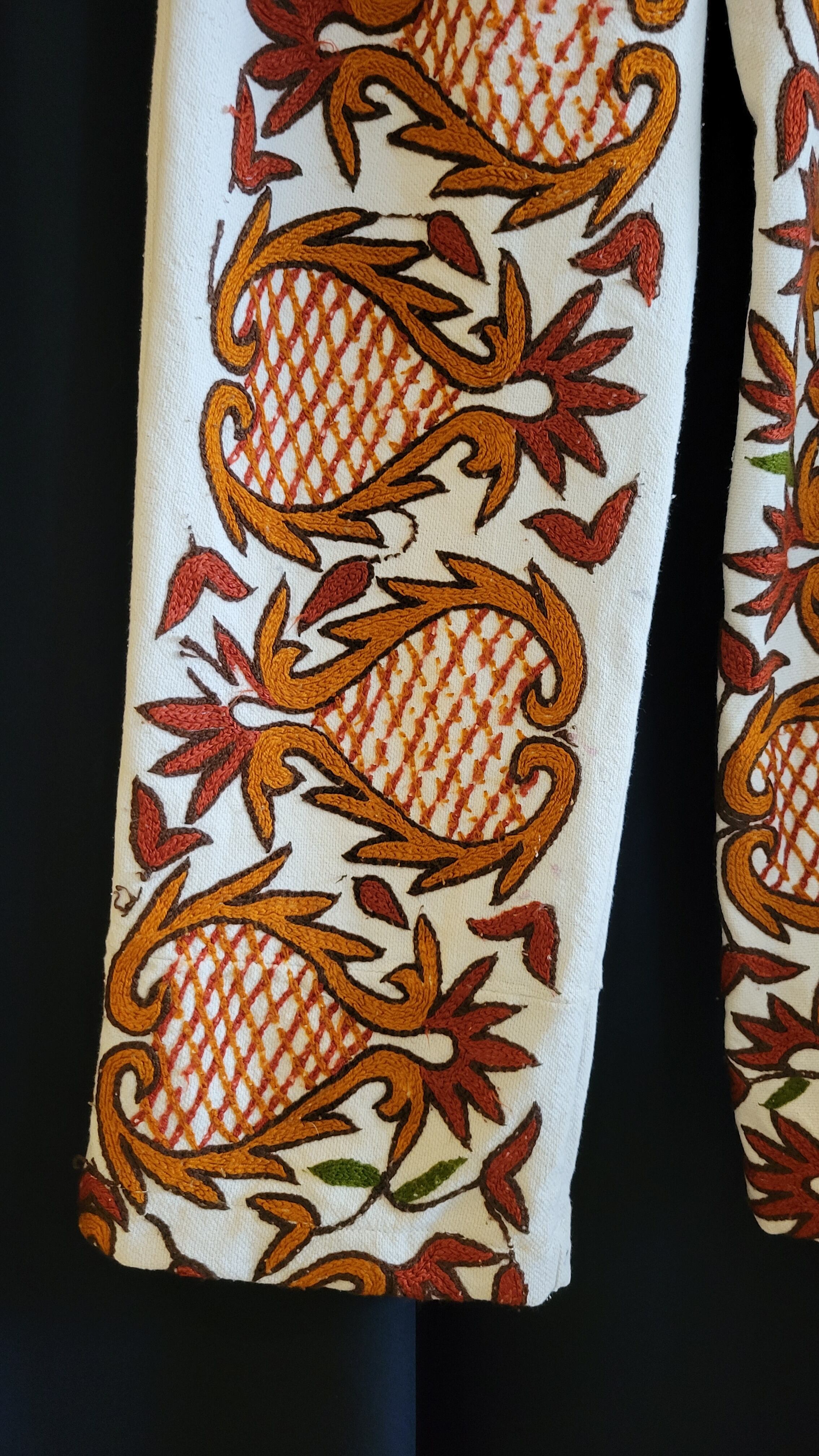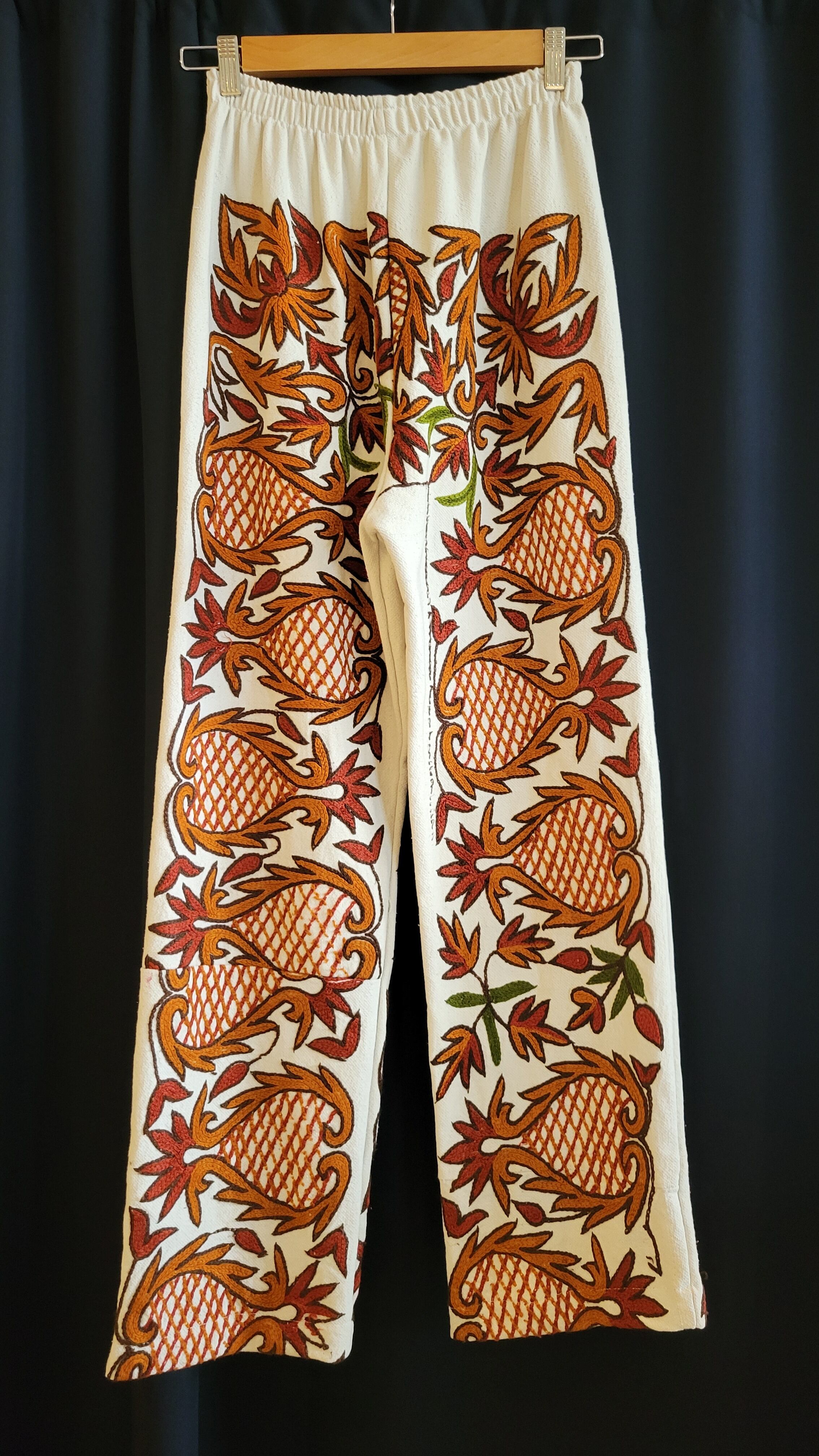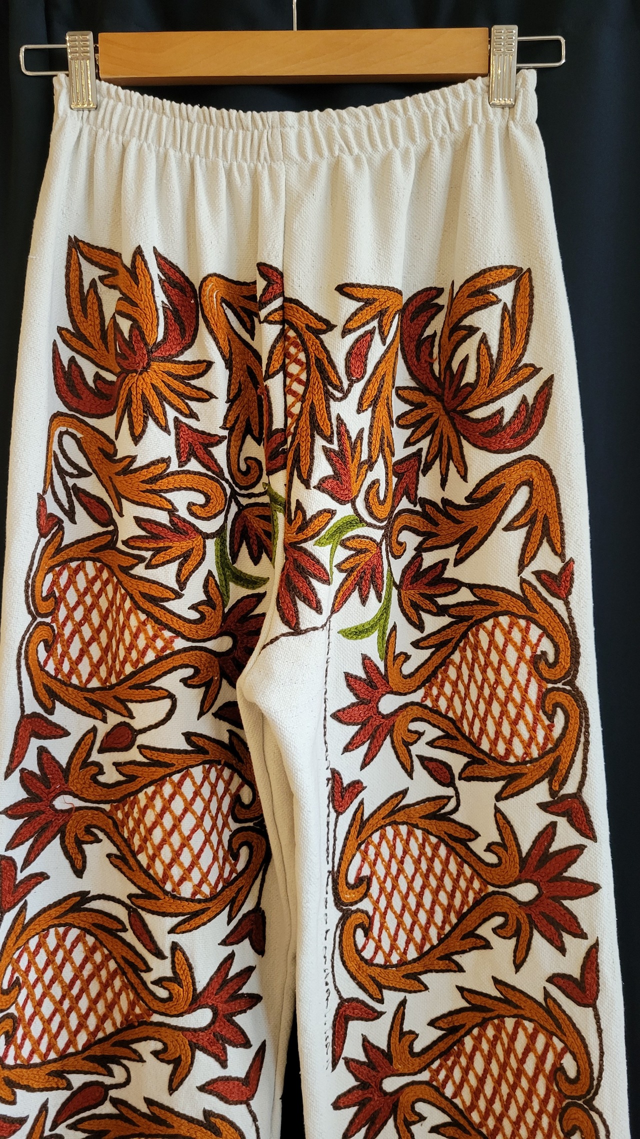 総刺繍のヴィンテージクロスをリメイクしたイージーパンツです。前後に総刺繍が施されているため、やや重量感がありますが着用時に不快に感じるほどのものではありません。太過ぎず細身過ぎず、リネンの落ち感も相まってスマートなシルエットです。カジュアルにもきれいめにも幅広いスタイリングが叶う主役級の1本です。