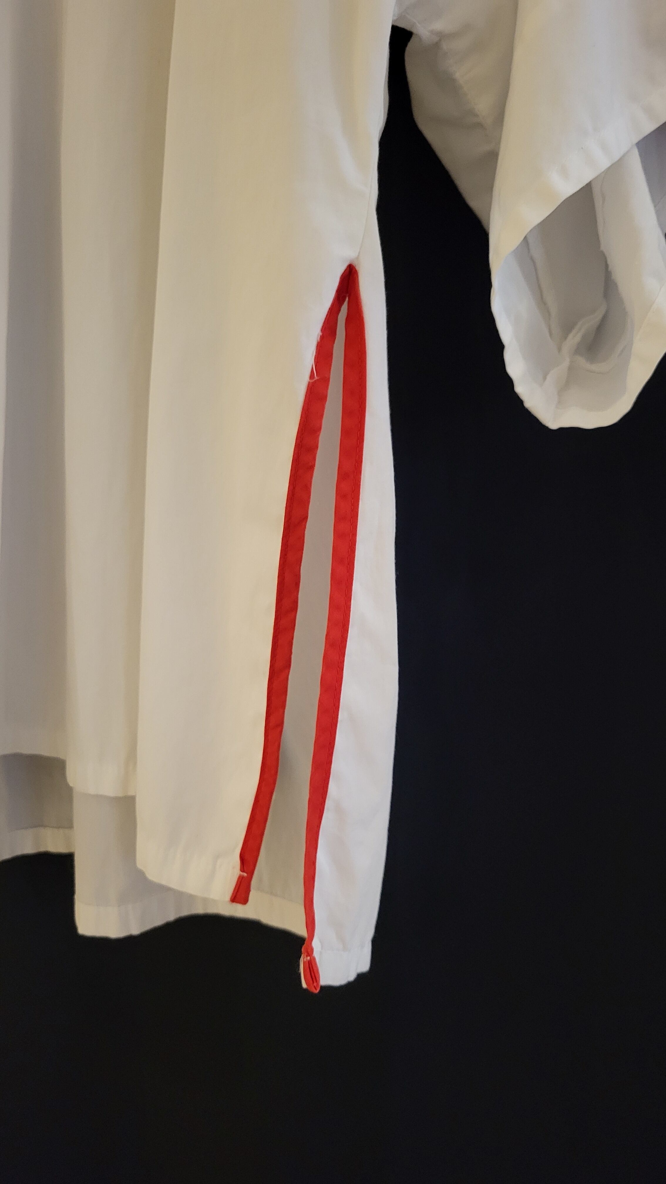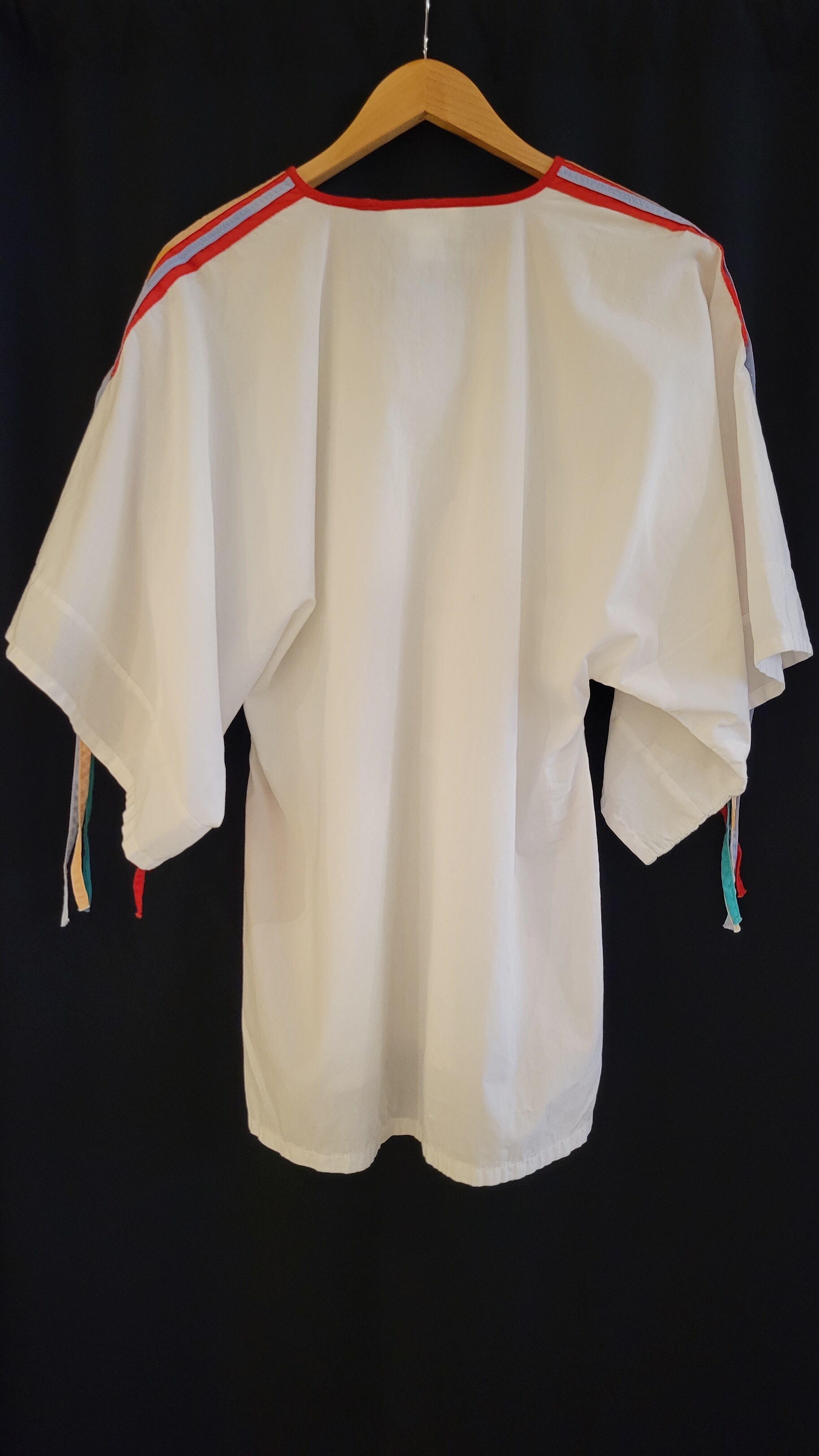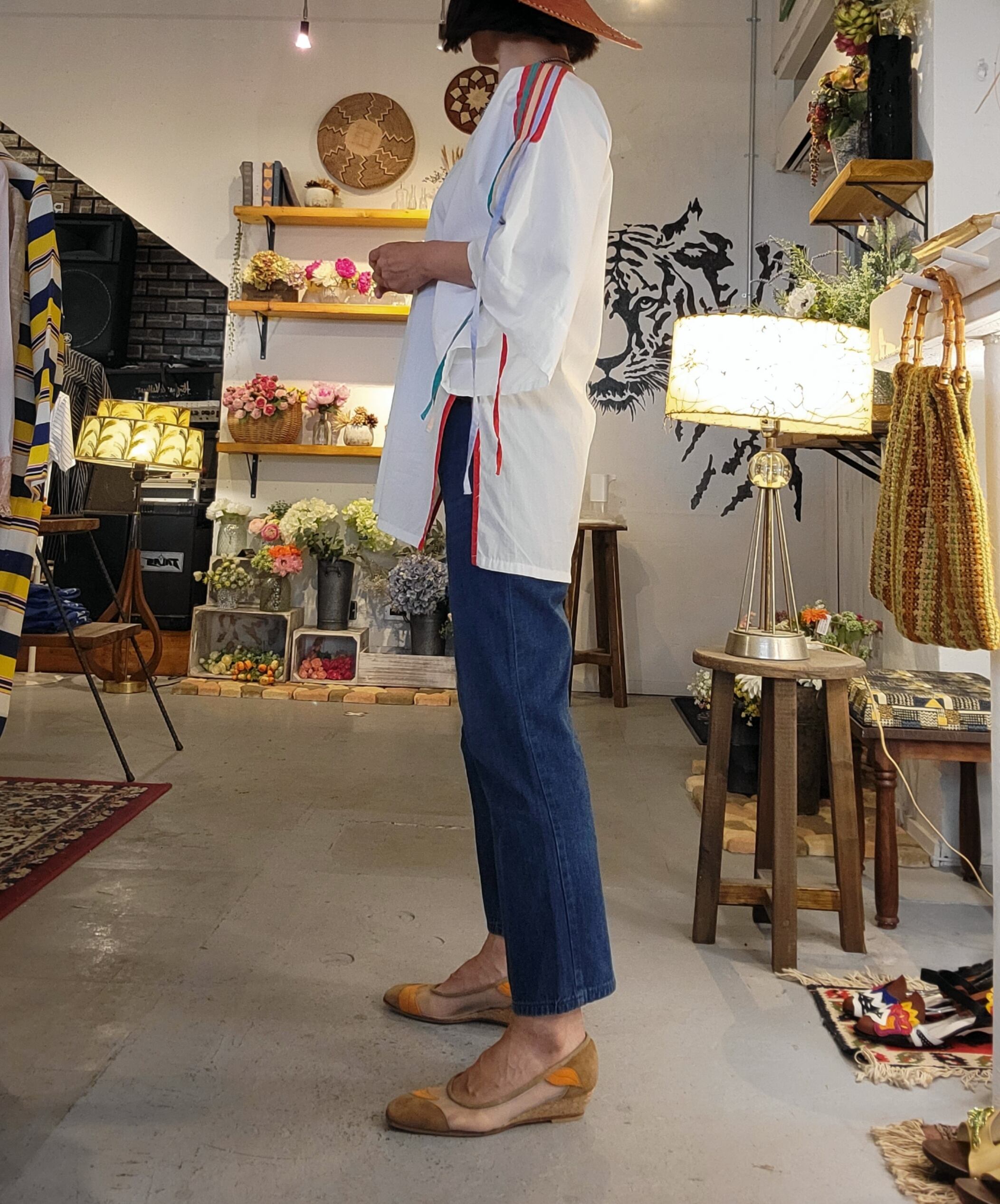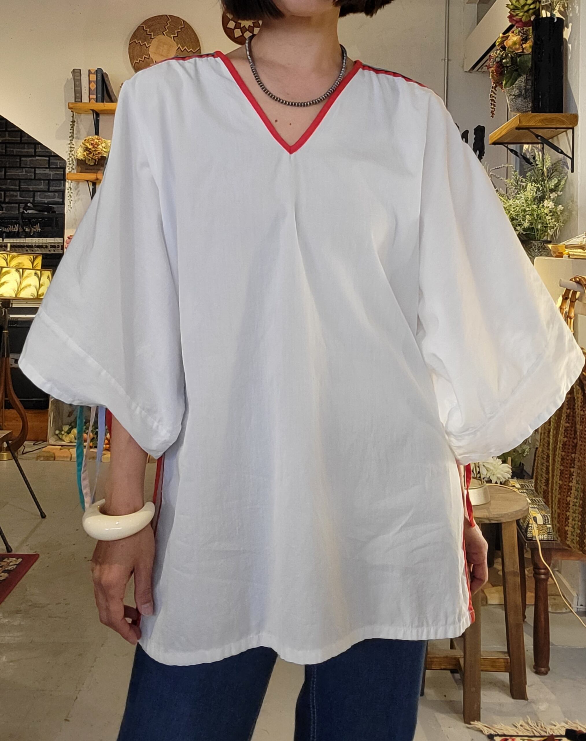ヴィンテージのプルオーバートップ。タグの素材表記が消えてしまっていますがコットンです。さらりとした肌触りと体のラインを拾わないゆったりシルエットでストレスフリーな着心地。程よい深さのVネックとサイドスリットが抜け感をプラス。肩のカラフルな飾り紐が可愛らしい1枚です。*実際の色は着画のような白色です。
