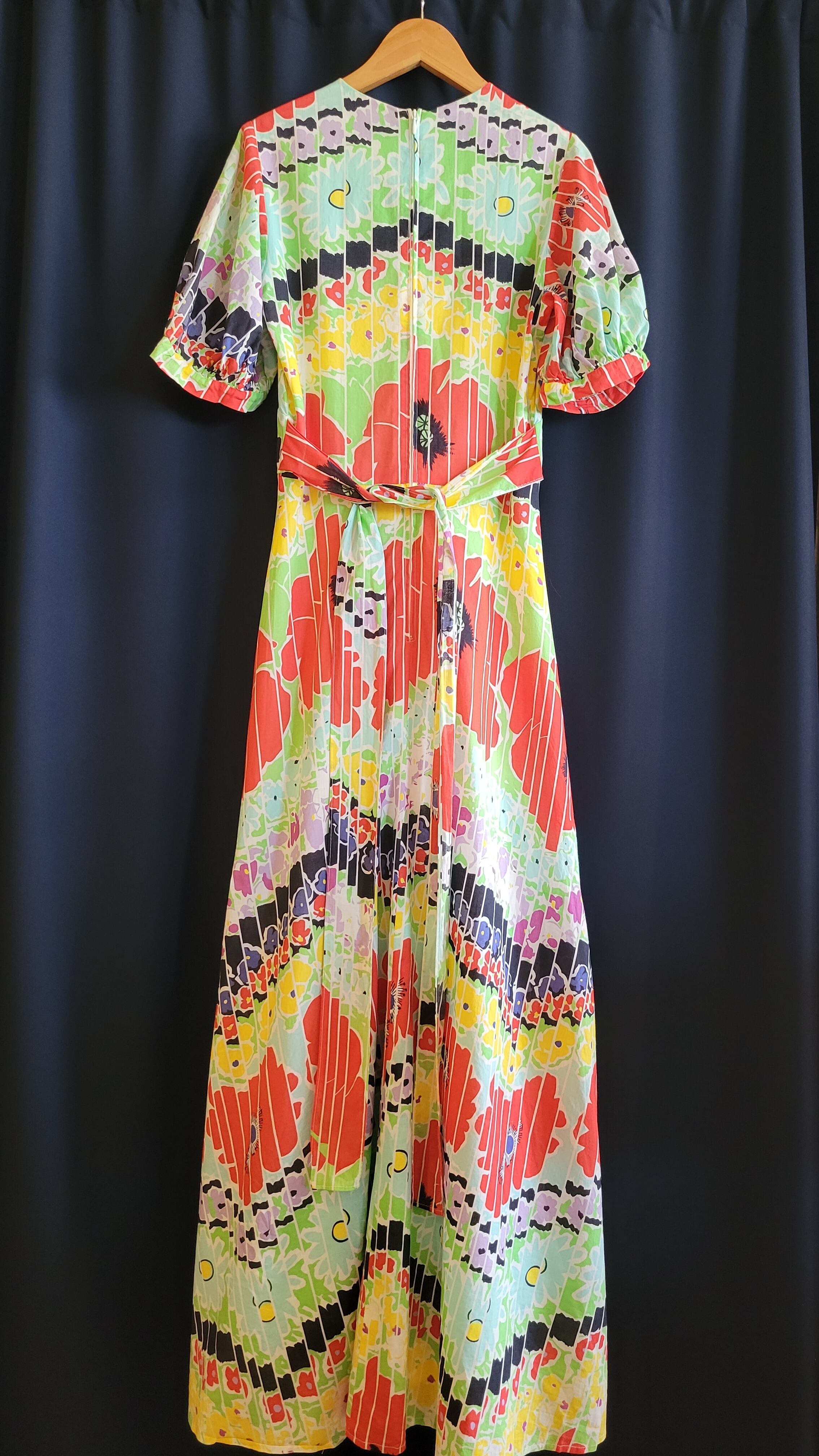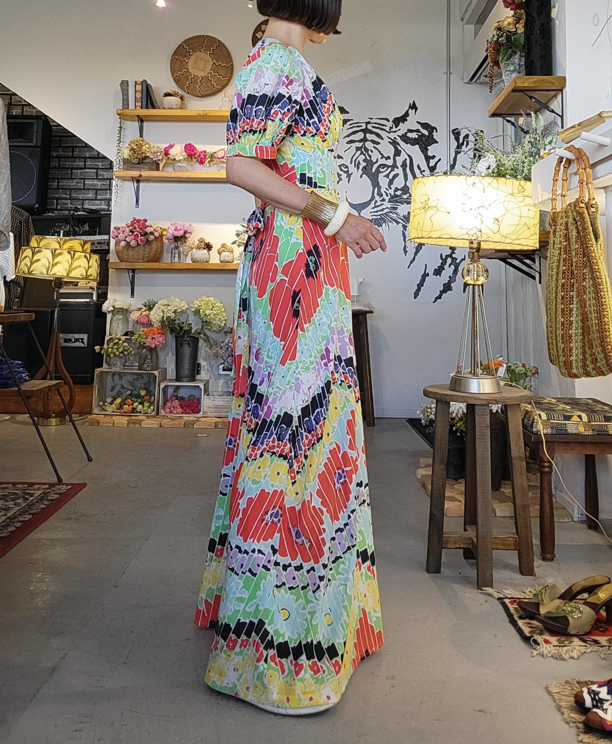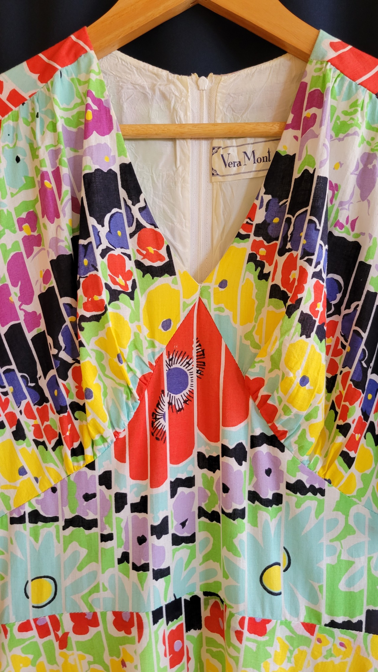 VERA MONT のヴィンテージマキシドレス。素材はコットン、裏地はヴィスコースです。鮮やかなプリントとゆるやかなフレアシルエットがエレガントな1枚。1枚で仕上がります。