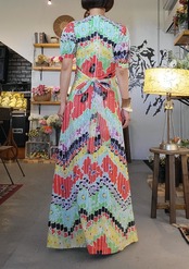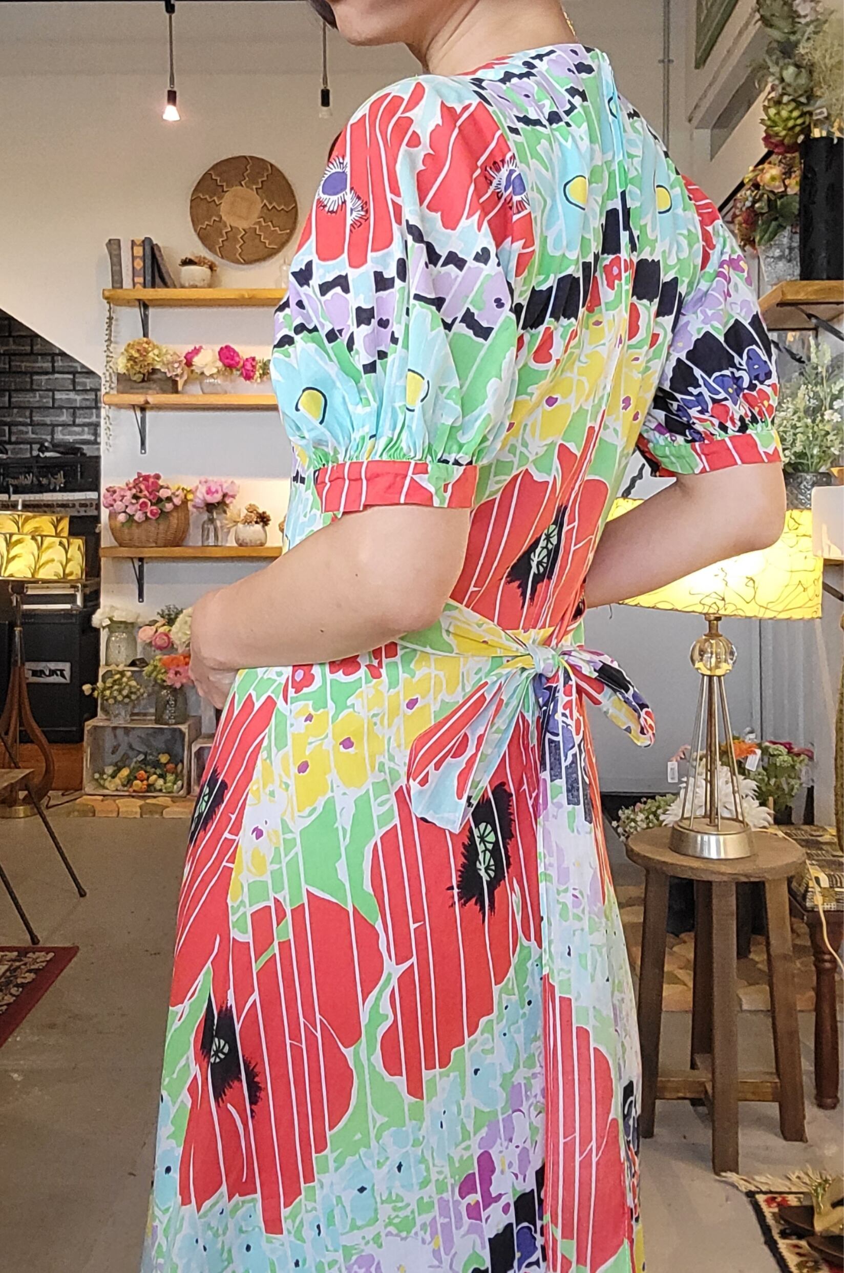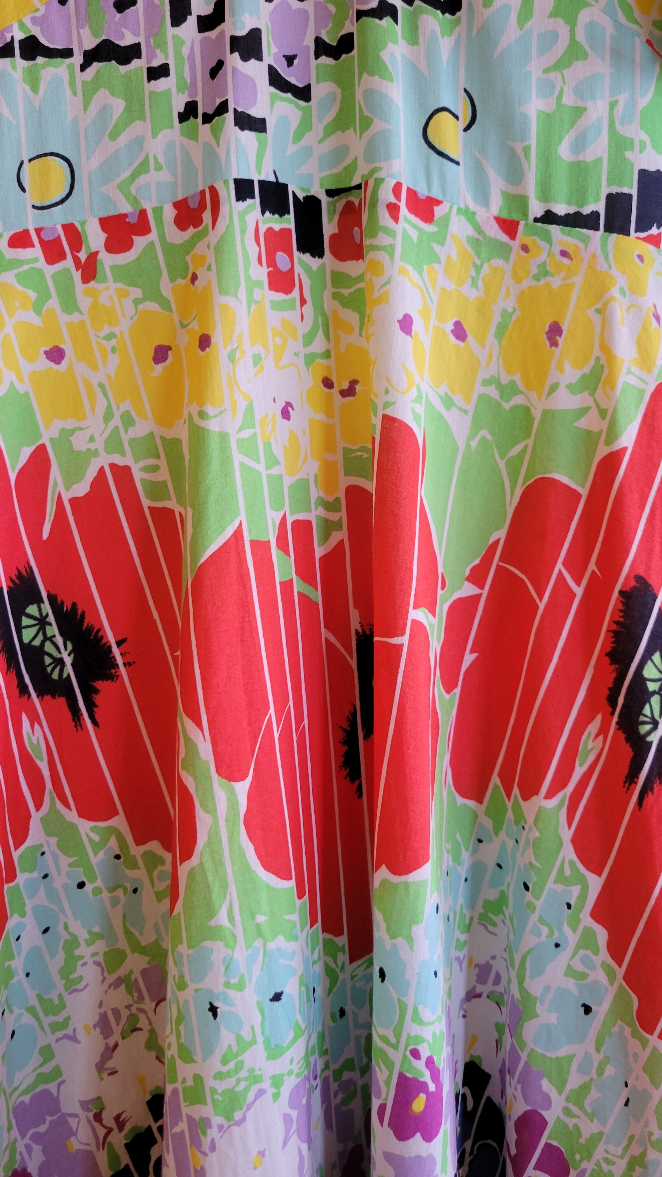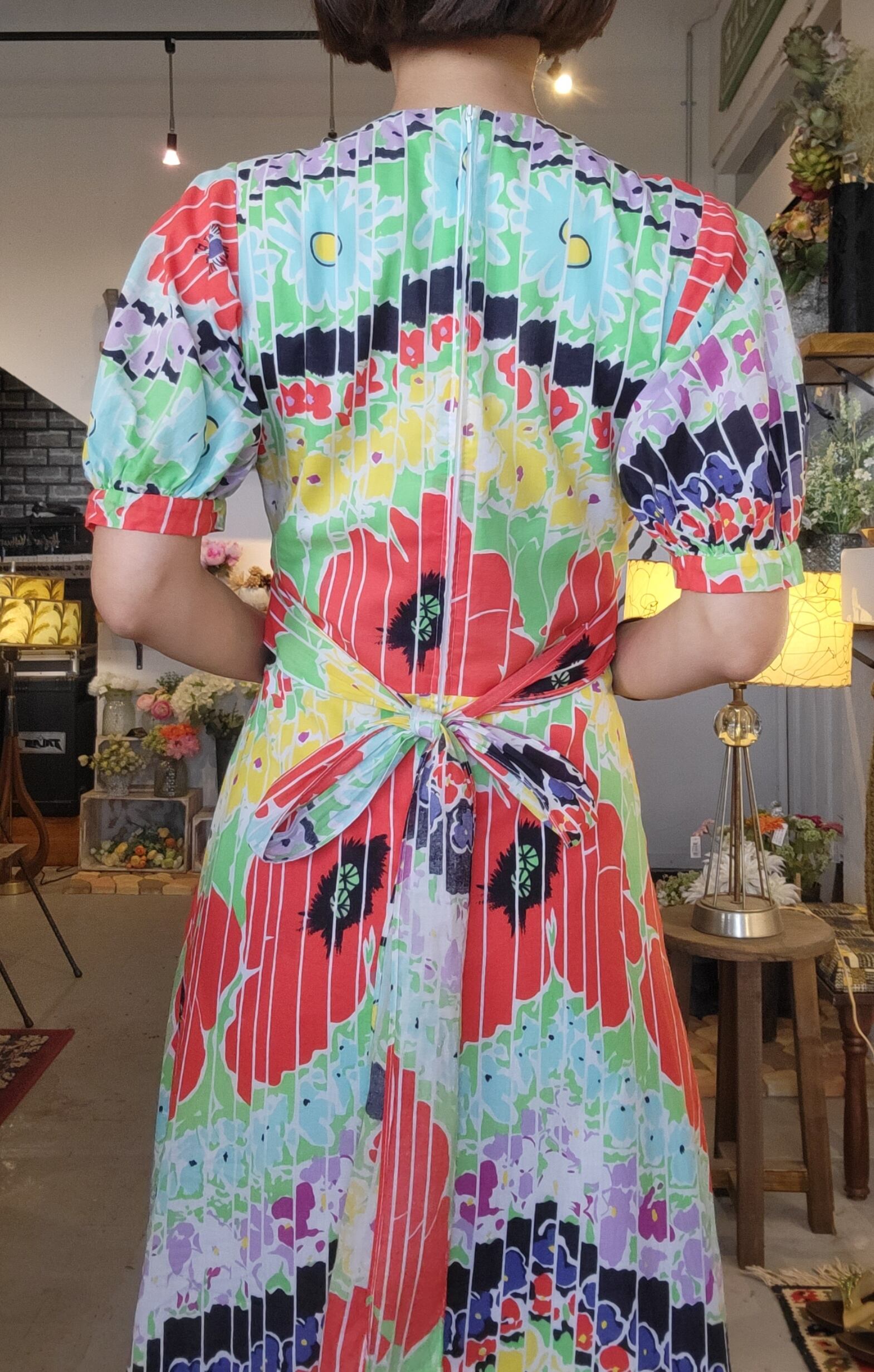 VERA MONT のヴィンテージマキシドレス。素材はコットン、裏地はヴィスコースです。鮮やかなプリントとゆるやかなフレアシルエットがエレガントな1枚。1枚で仕上がります。