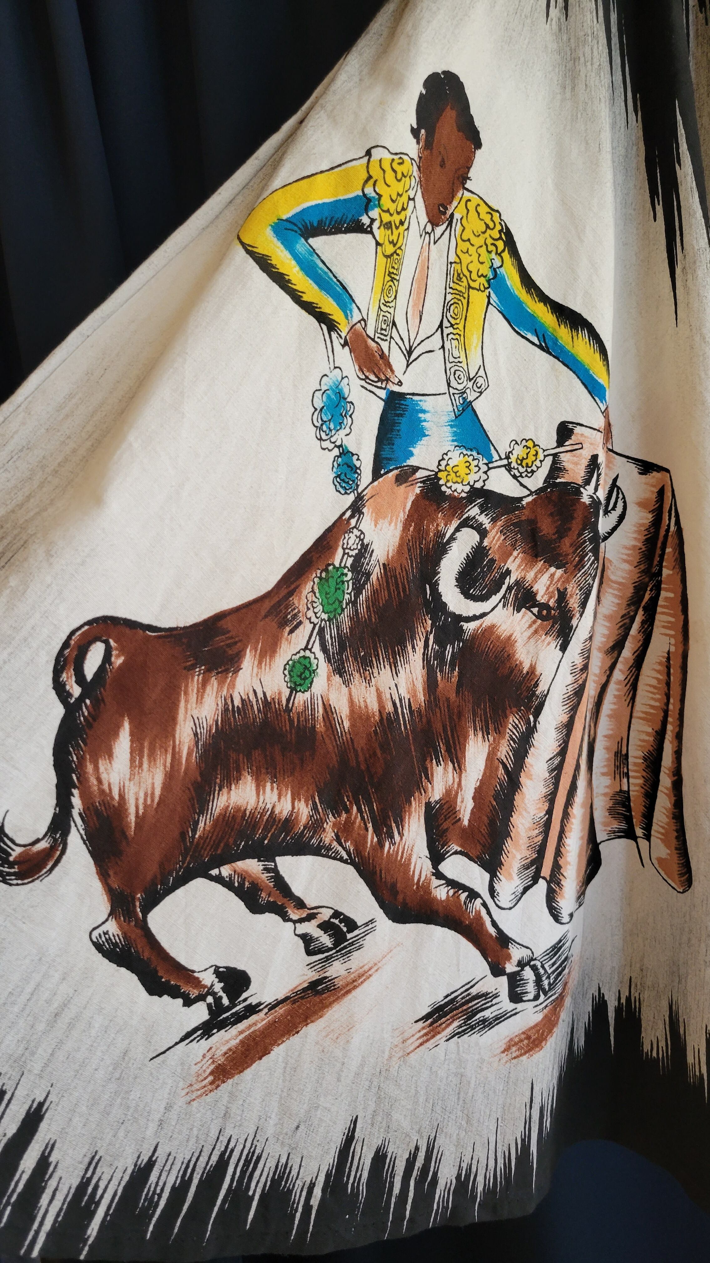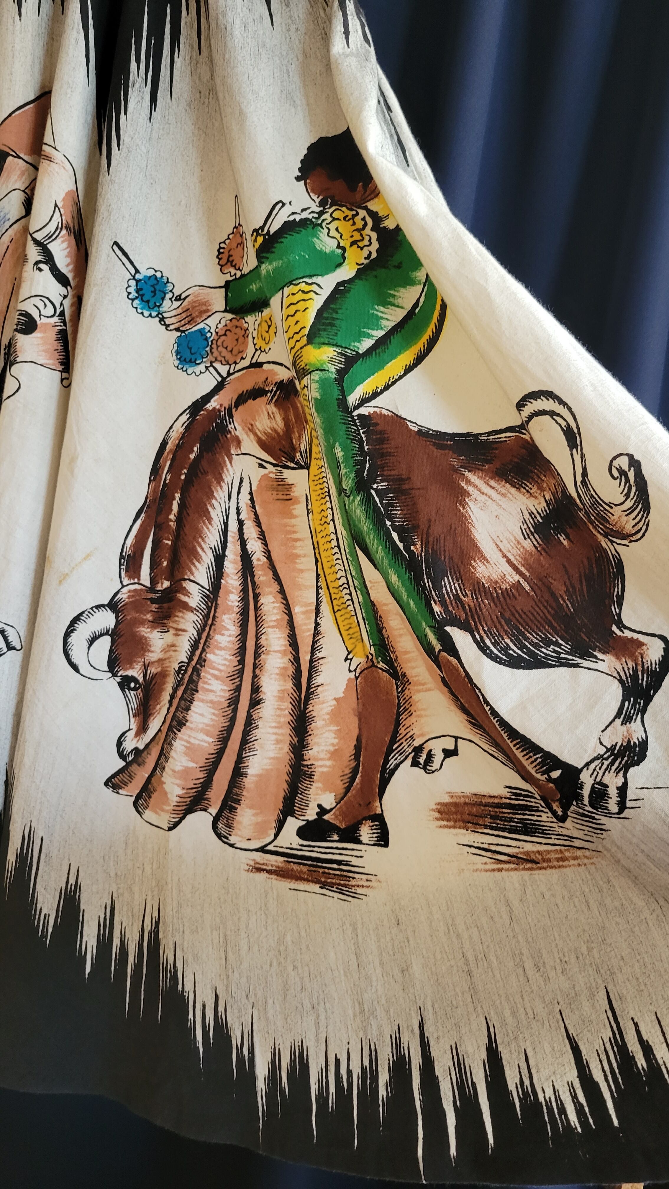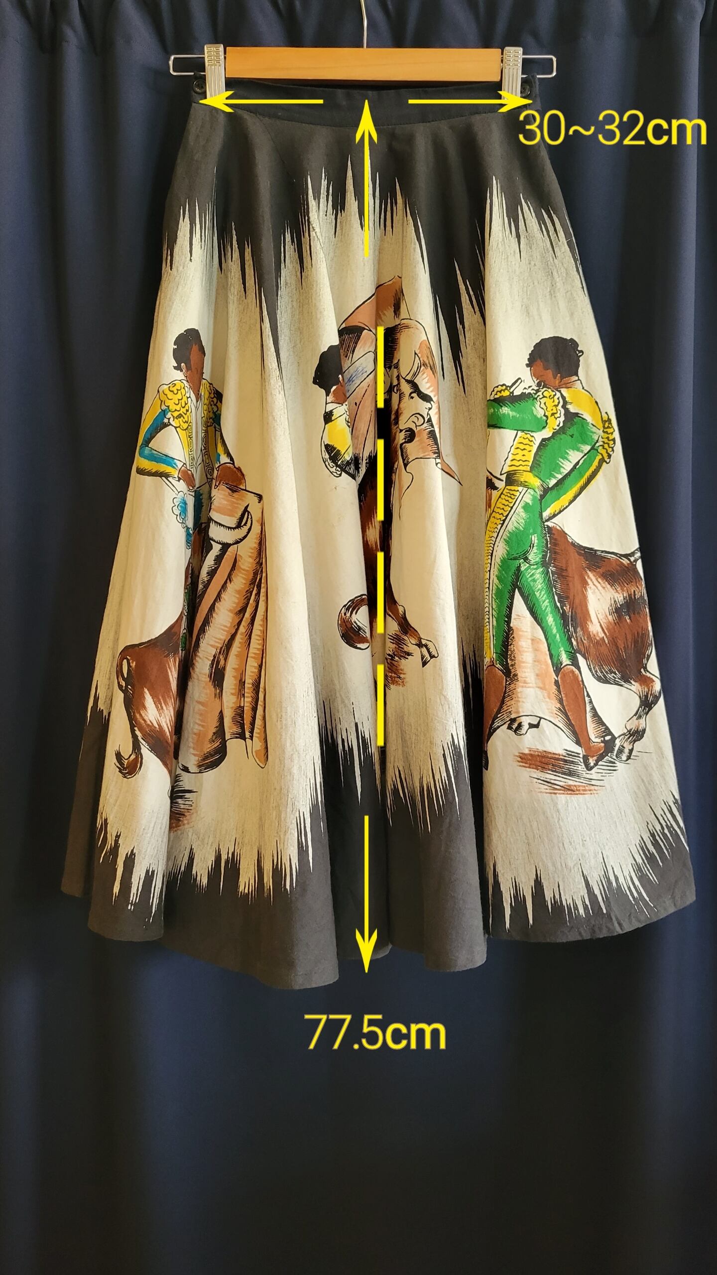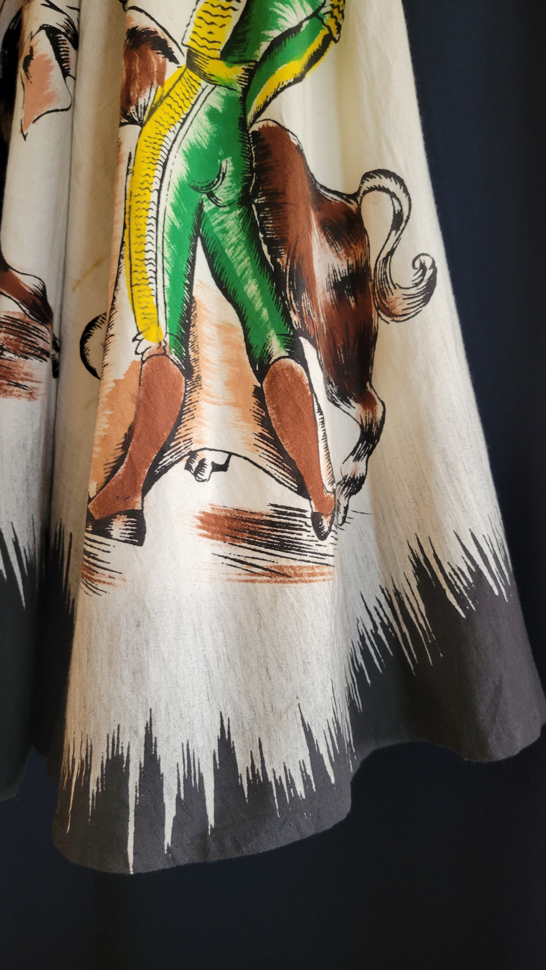 ハンドペイントが美しい1950年代のヴィンテージサーキュラースカート。素材はコットンです。ウエストの仕様は左にボタンが2つ、右に1つ、ファスナーは付いていません。渋めのカラーで大人の雰囲気です。生地に引っかいたような傷、シミが1ヶ所ありますので画像でご確認ください。着用時にはほとんど気にならないものですが、こちらはヴィンテージに慣れていらっしゃる方、ご理解のある方へおすすめいたします。