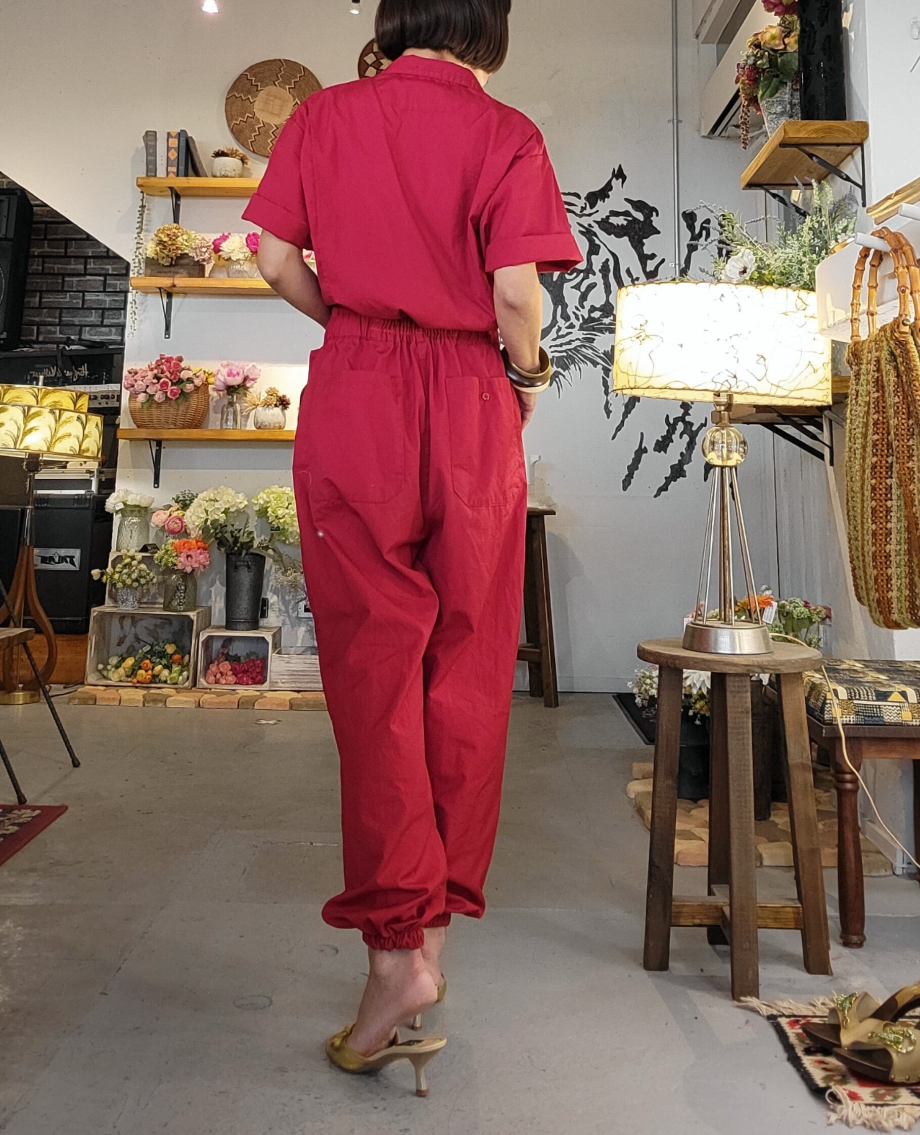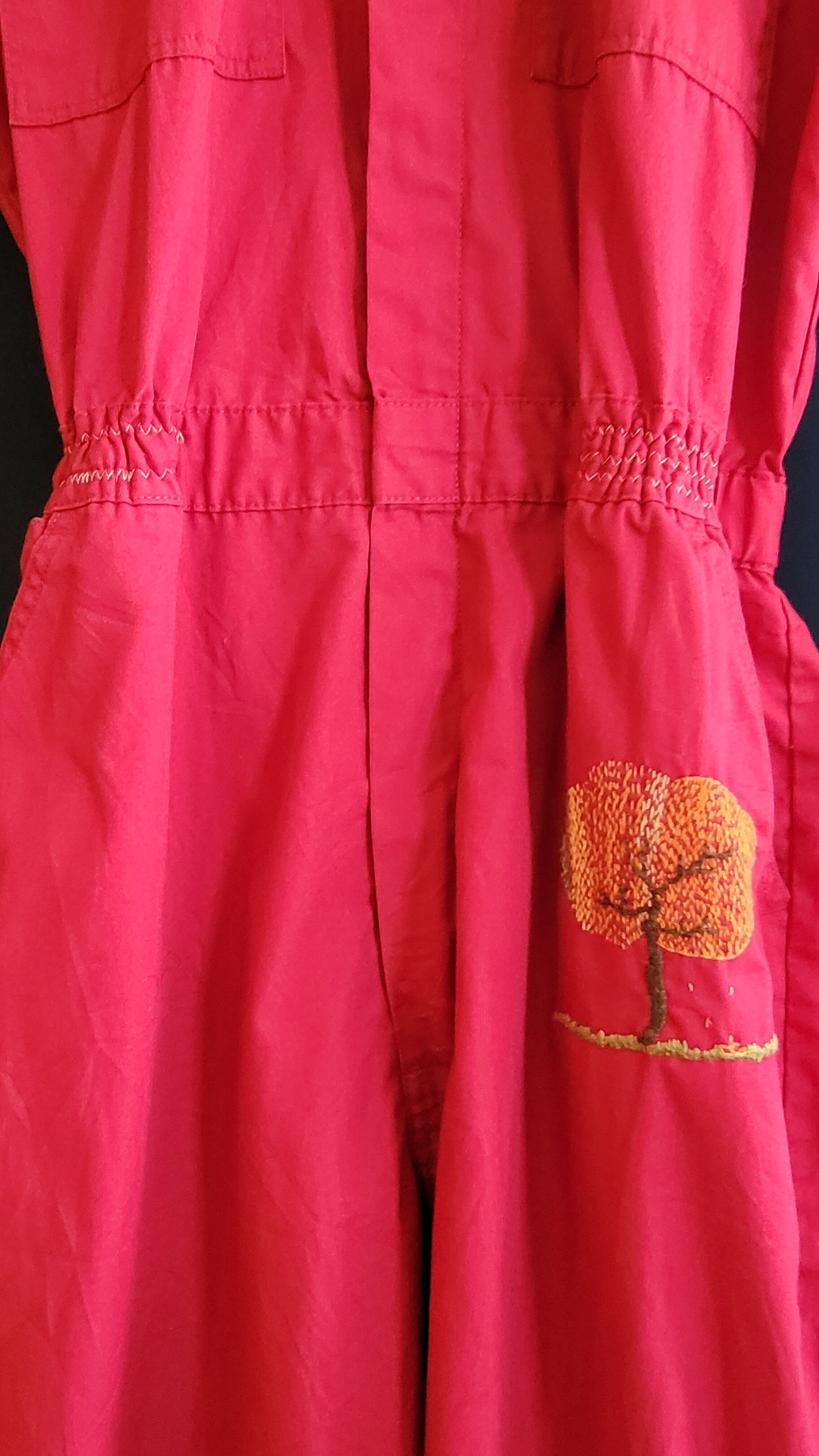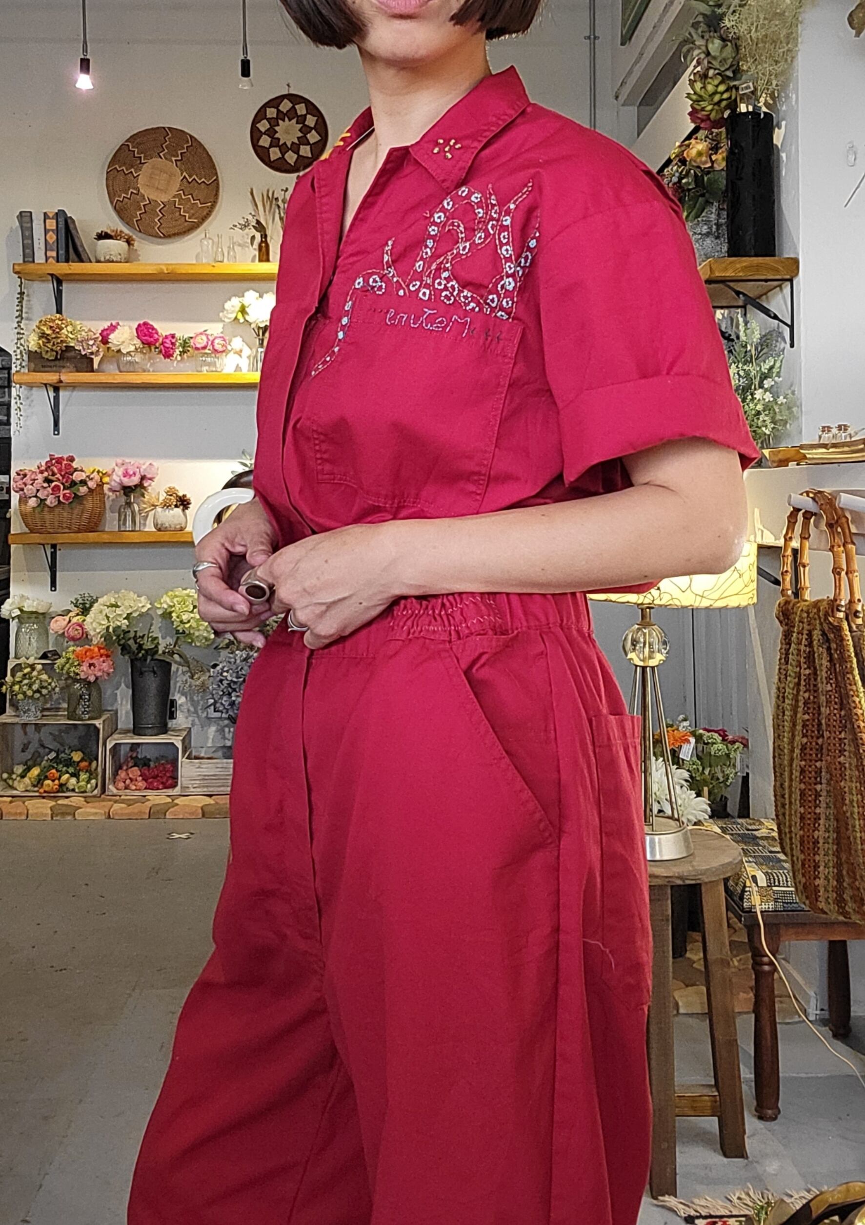 ヴィンテージの手刺繍入りジャンプスーツ。素材表記はありませんがコットンのようです。ウエストと裾がゴム仕様のため丈の調整が効きます。フロントはジッパーとスナップボタン2個付き。スニーカーでカジュアルにも、華奢なヒールに合わせてドレスアップにもおすすめです。