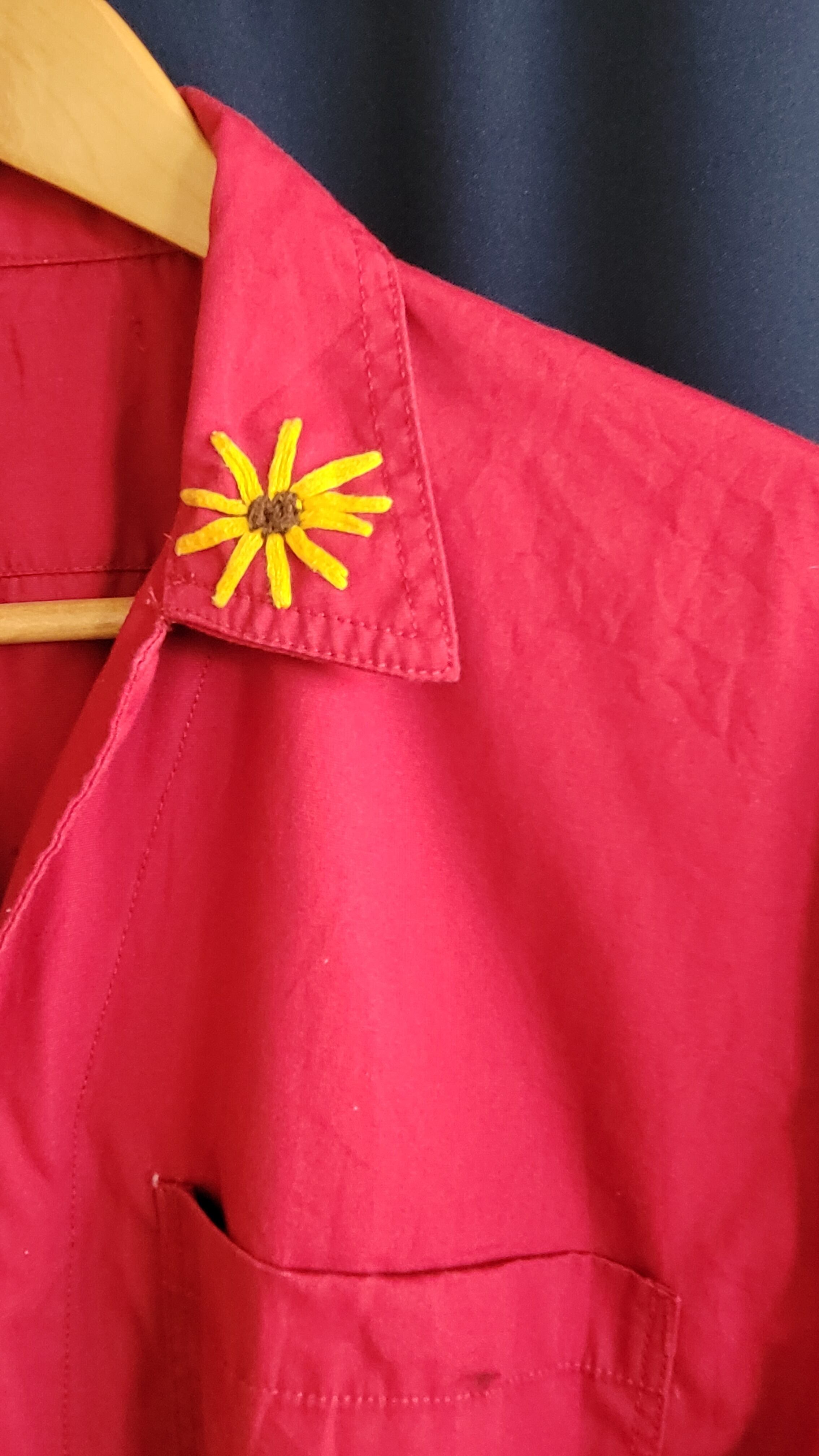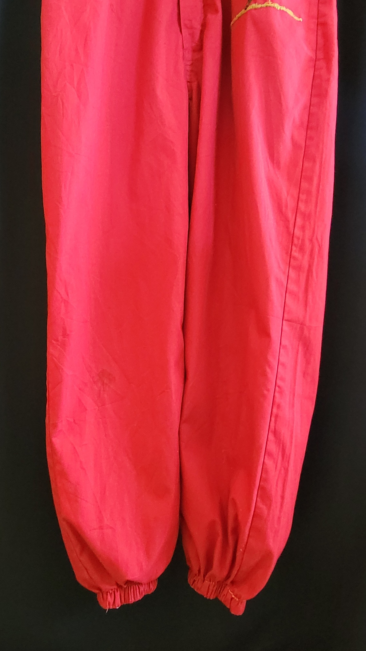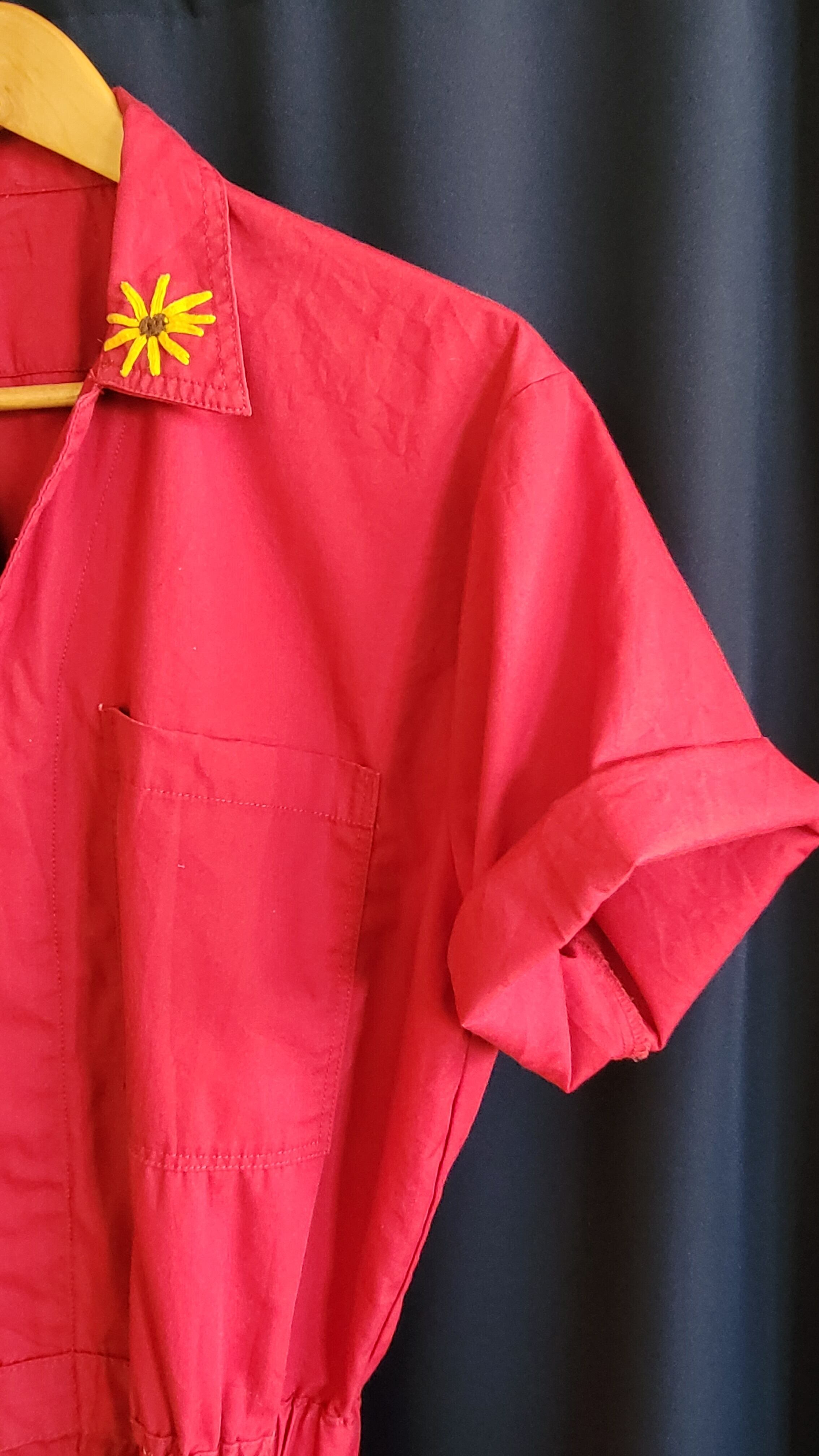 ヴィンテージの手刺繍入りジャンプスーツ。素材表記はありませんがコットンのようです。ウエストと裾がゴム仕様のため丈の調整が効きます。フロントはジッパーとスナップボタン2個付き。スニーカーでカジュアルにも、華奢なヒールに合わせてドレスアップにもおすすめです。
