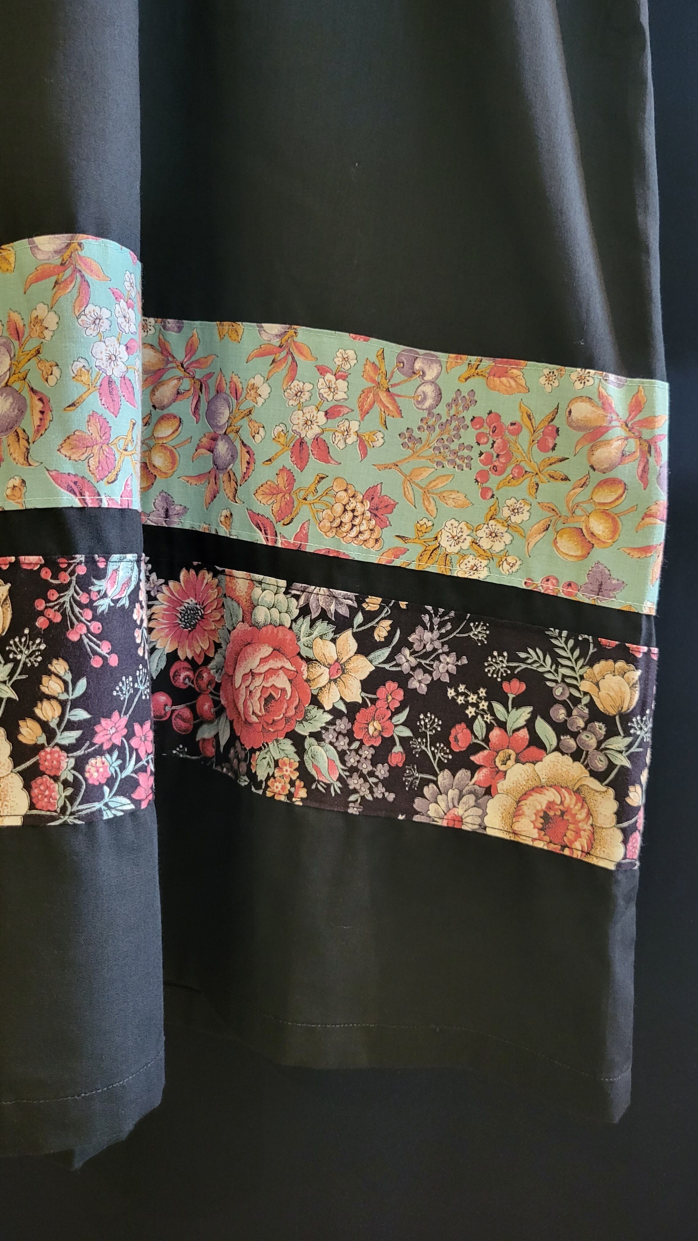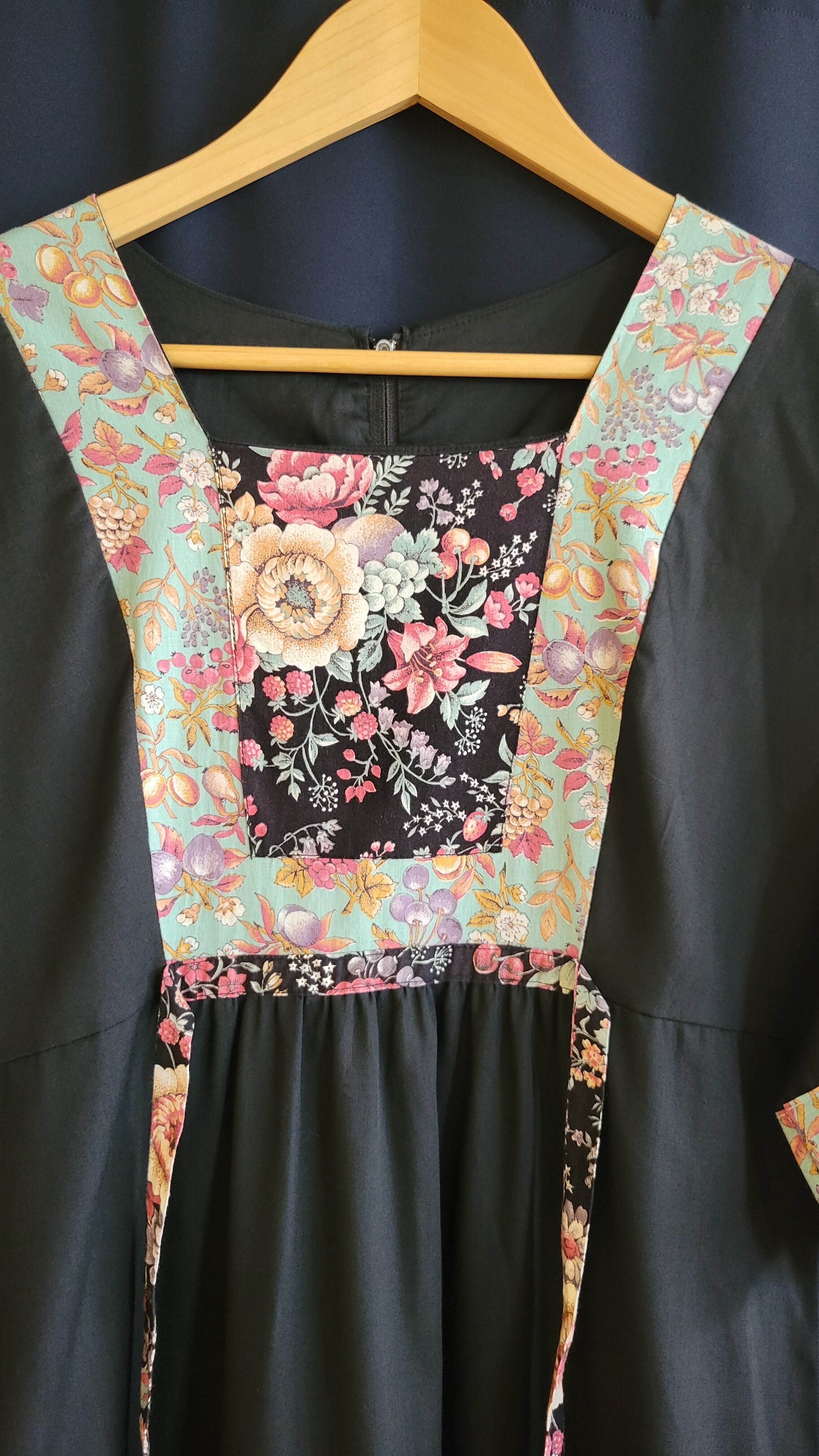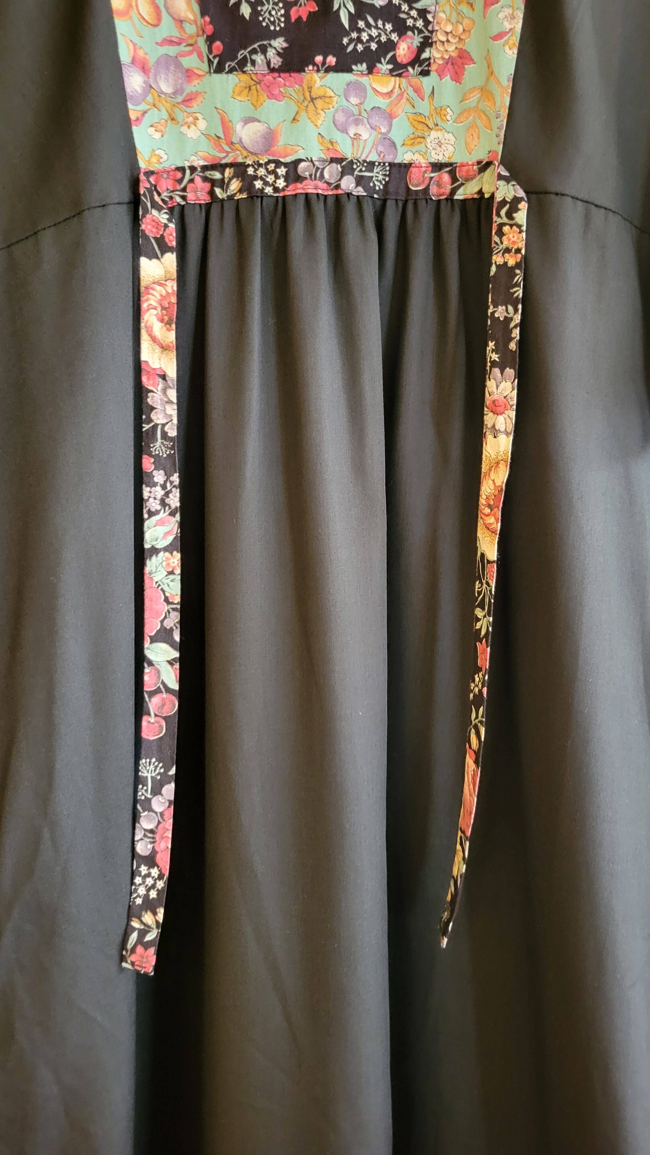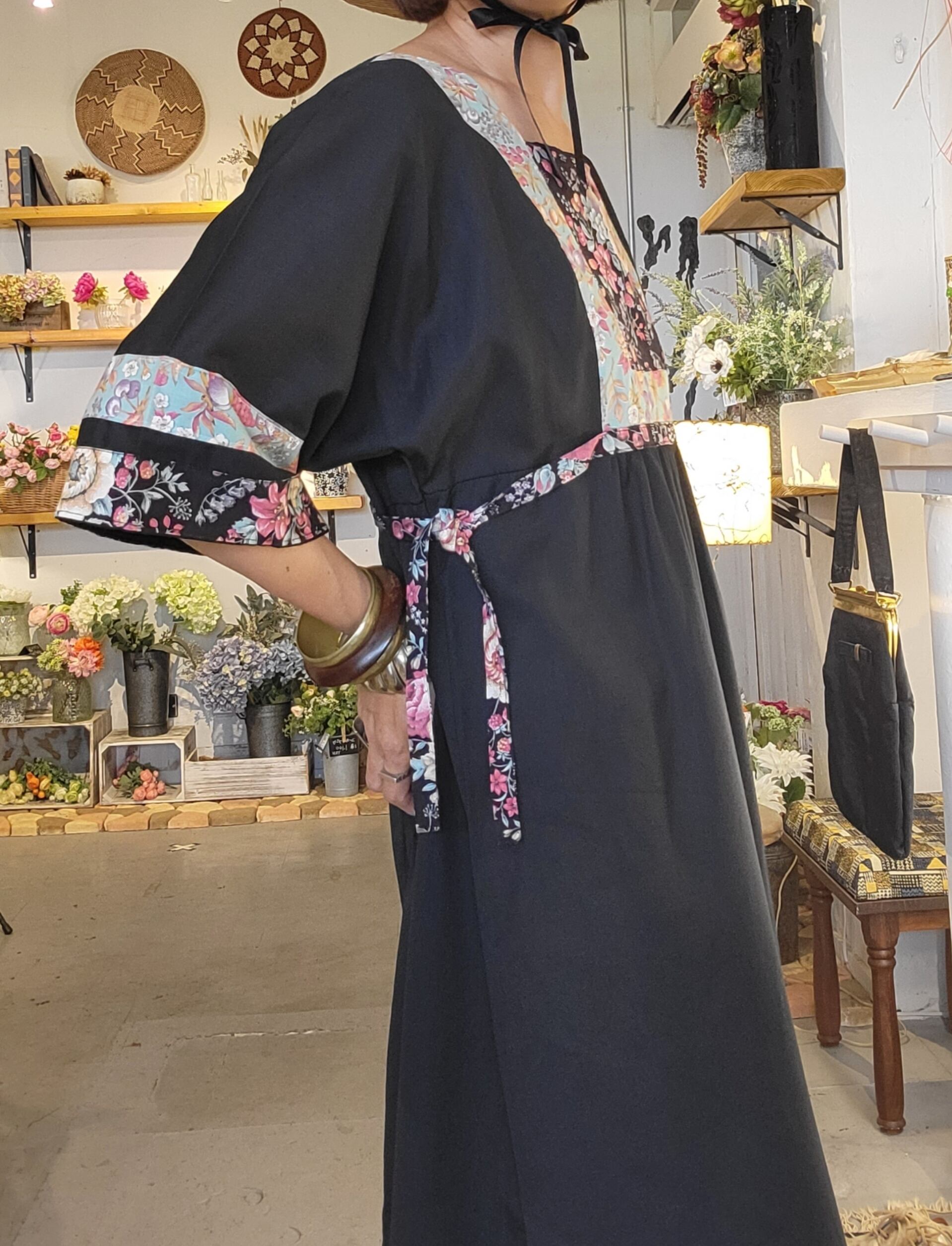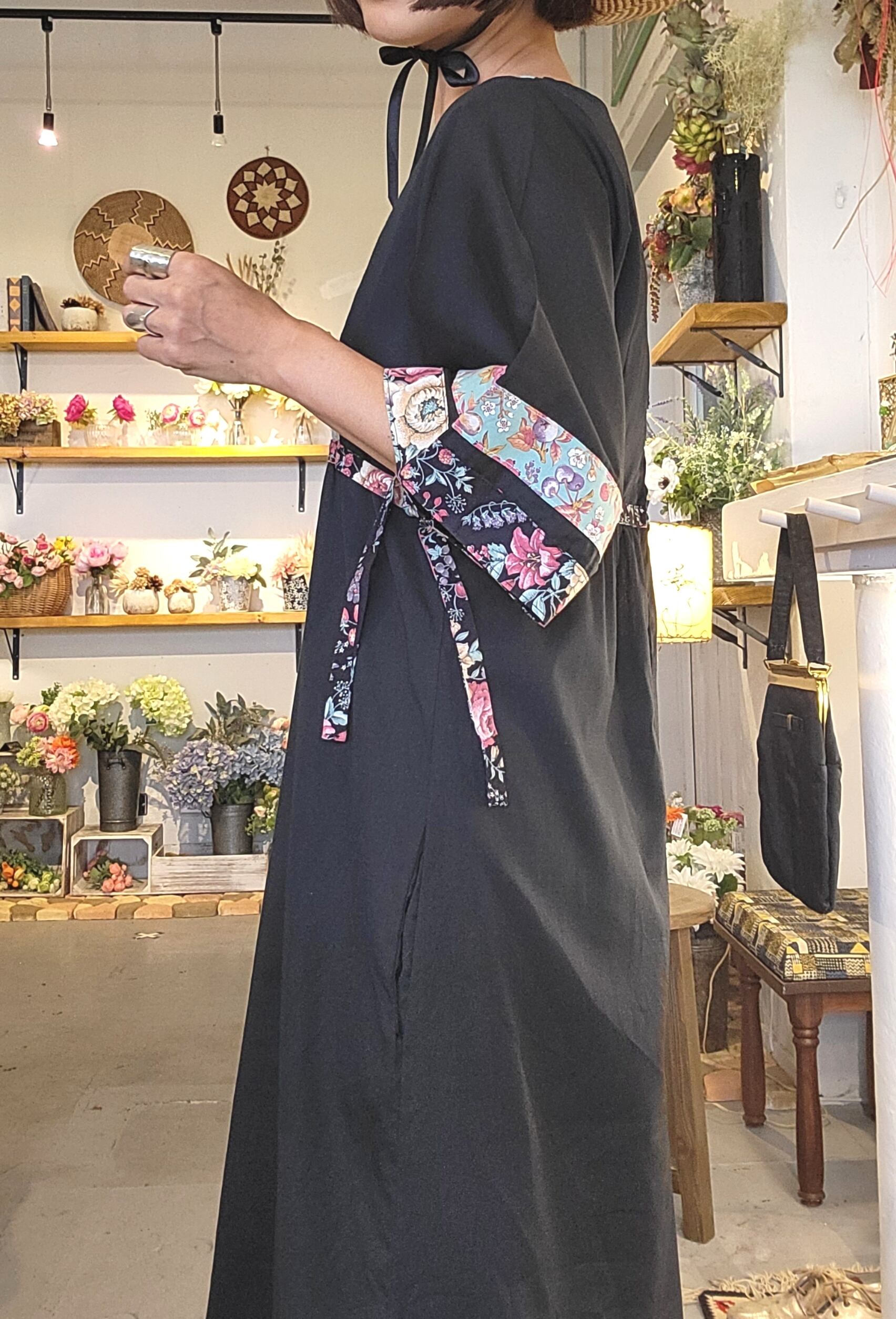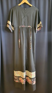 ヴィンテージのマキシドレス。素材表記はありませんがコットン、またはコットンとポリエステルの混紡のような素材感です。さらりとした肌触り。伸縮性、透け感はありません。サイドリボンは結んでもそのまま垂らした状態でも可愛いです。バックファスナーで着脱がスムーズ。1枚で仕上がり涼しく着られるドレスです。