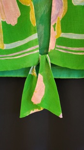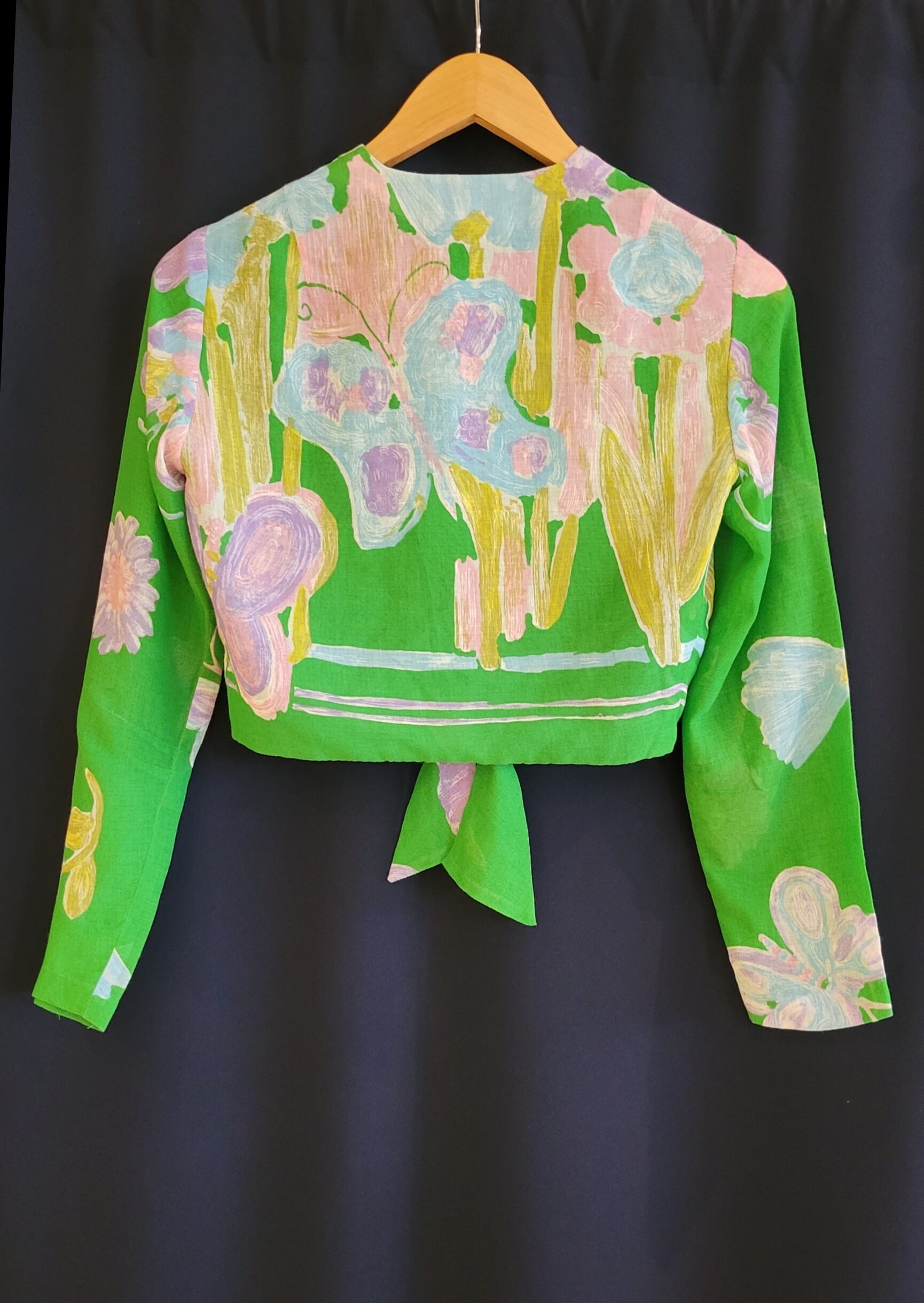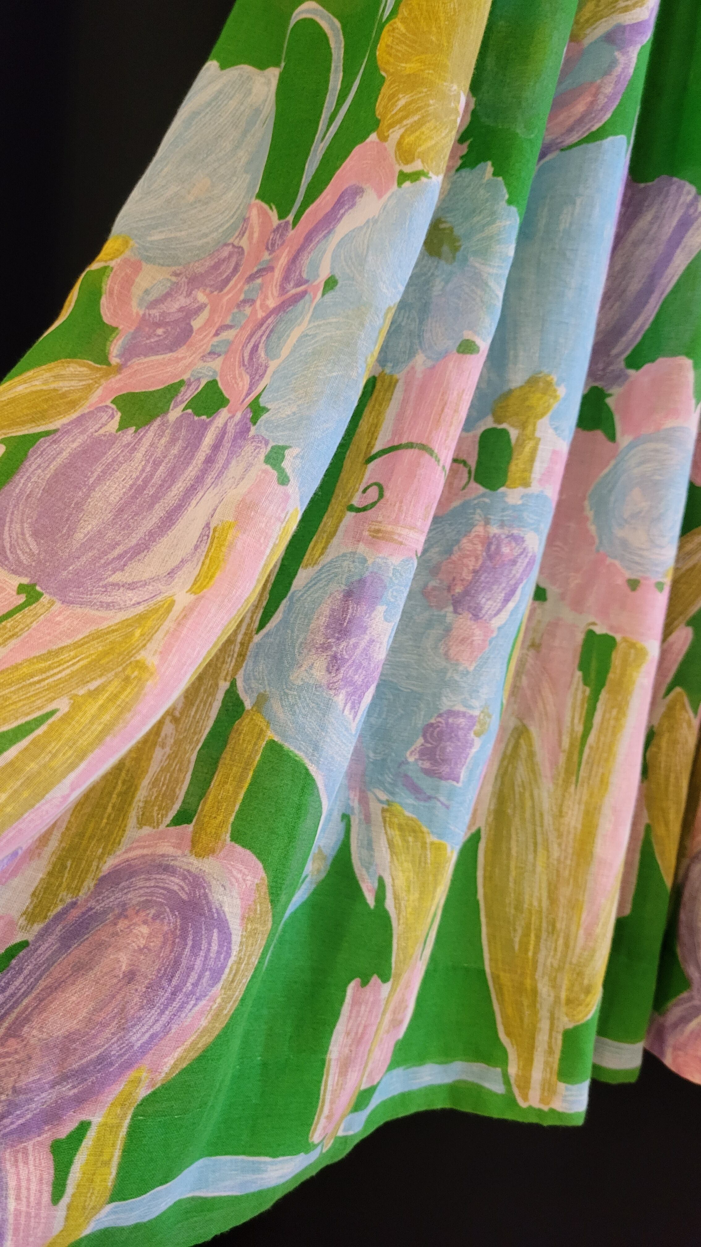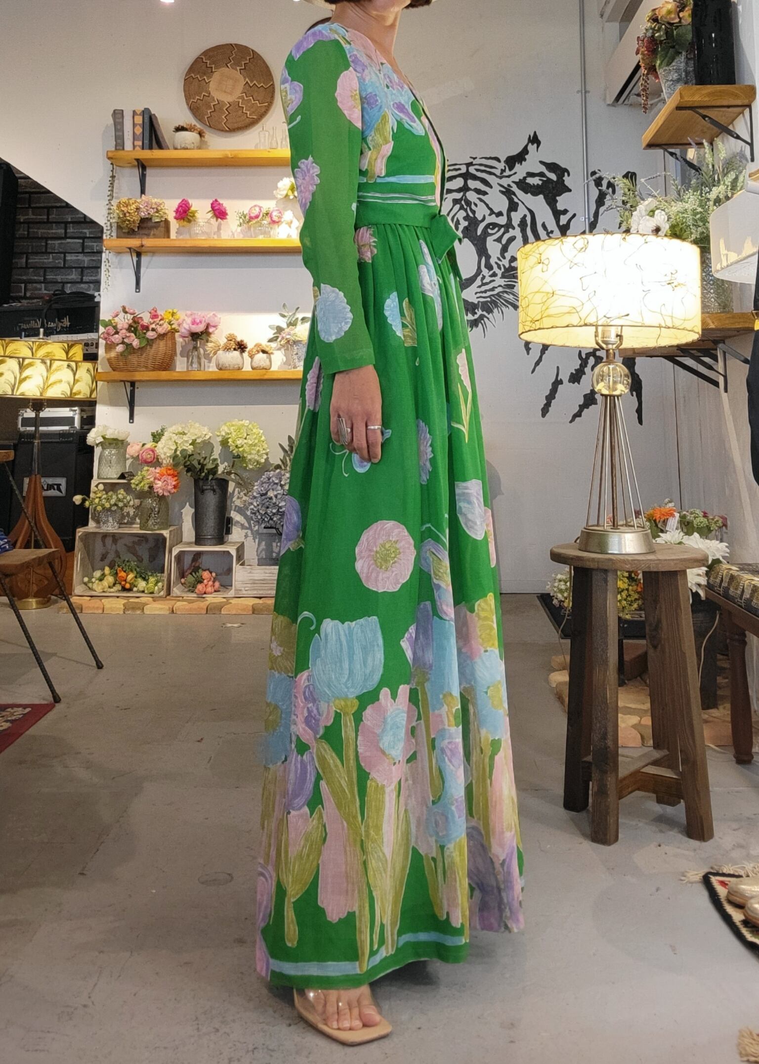 ボレロ付きのヴィンテージマキシドレスの2ピースセットアップ。素材表記はありませんが、ボレロとワンピースのスカート部分は薄手のコットンガーゼ、ワンピースのトップス部分はポリウレタンのような伸縮性のある素材です。スカート部分は裏地付きで透けません。ふんわり軽く心地よい素材感でカジュアル寄りのドレスアップスタイルにぴったりです。*前身ごろ裾あたりに2mm程度の小穴があります。着用時にはフレアに隠れ見えませんが、こちらはヴィンテージに慣れている方、ご理解のある固いへおすすめいたします。