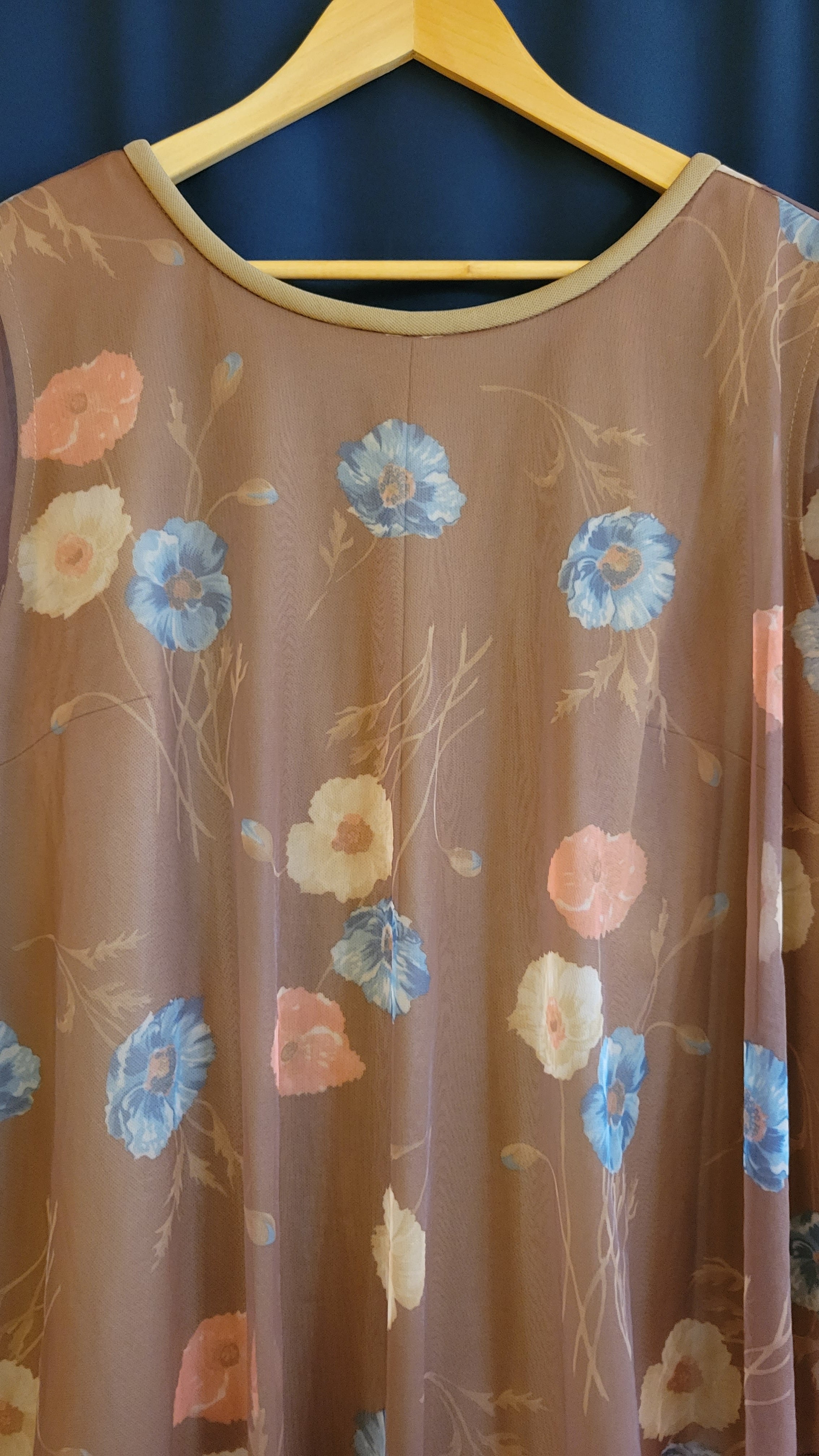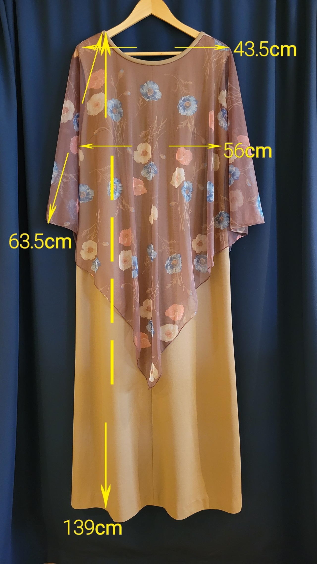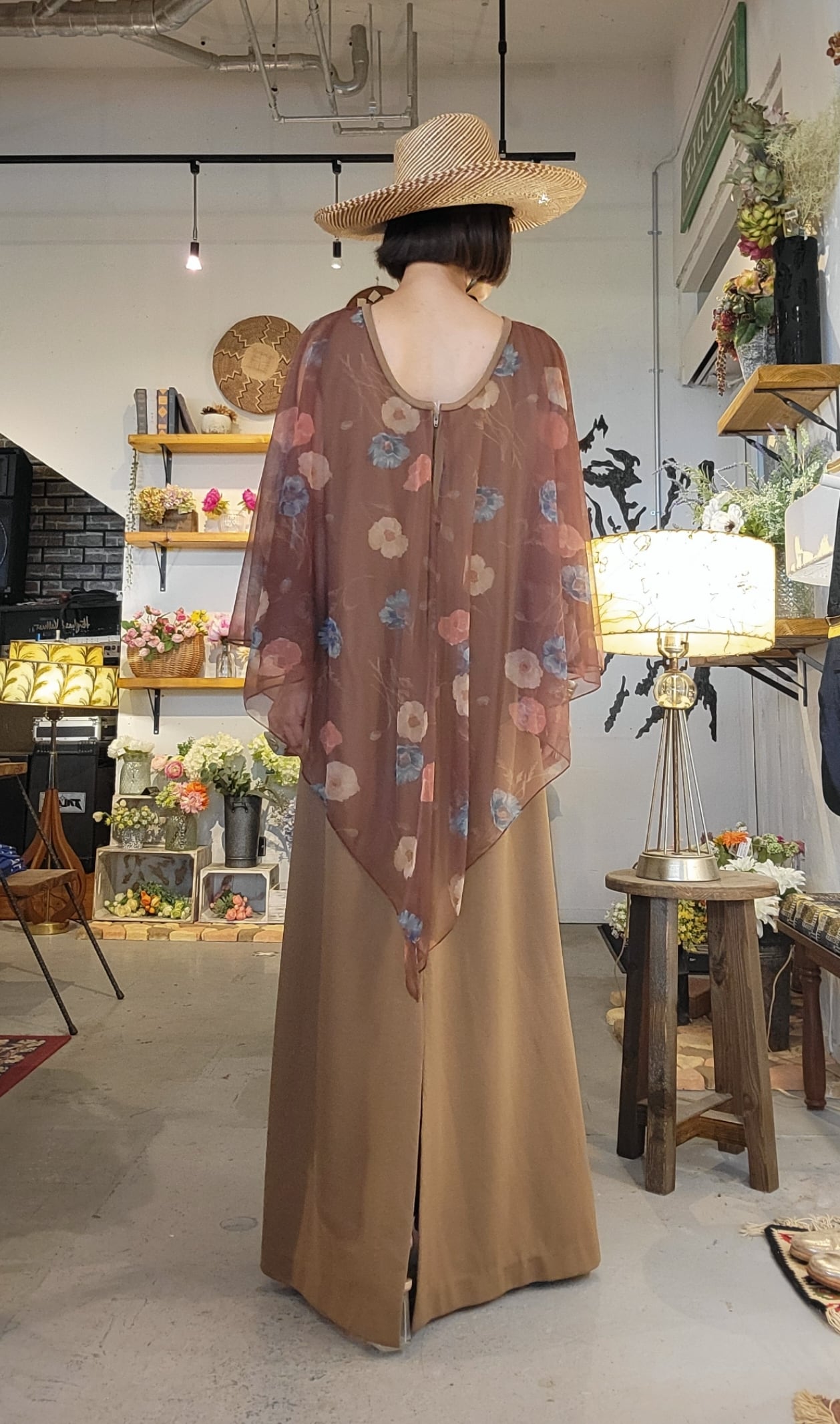 ヴィンテージのマキシドレス。ノースリーブドレスにシアー素材のケープがドッキングしたデザインです。素材表記はありませんがポリエステルのようです。ゆったりしたサイズ感で体のラインを拾わず幅広いサイズに対応可能。ノースリーブの涼しさを保ちつつ、ケープで肌の露出を控えめに。1枚で仕上がる落ち着いた色味のヴィンテージドレスです。