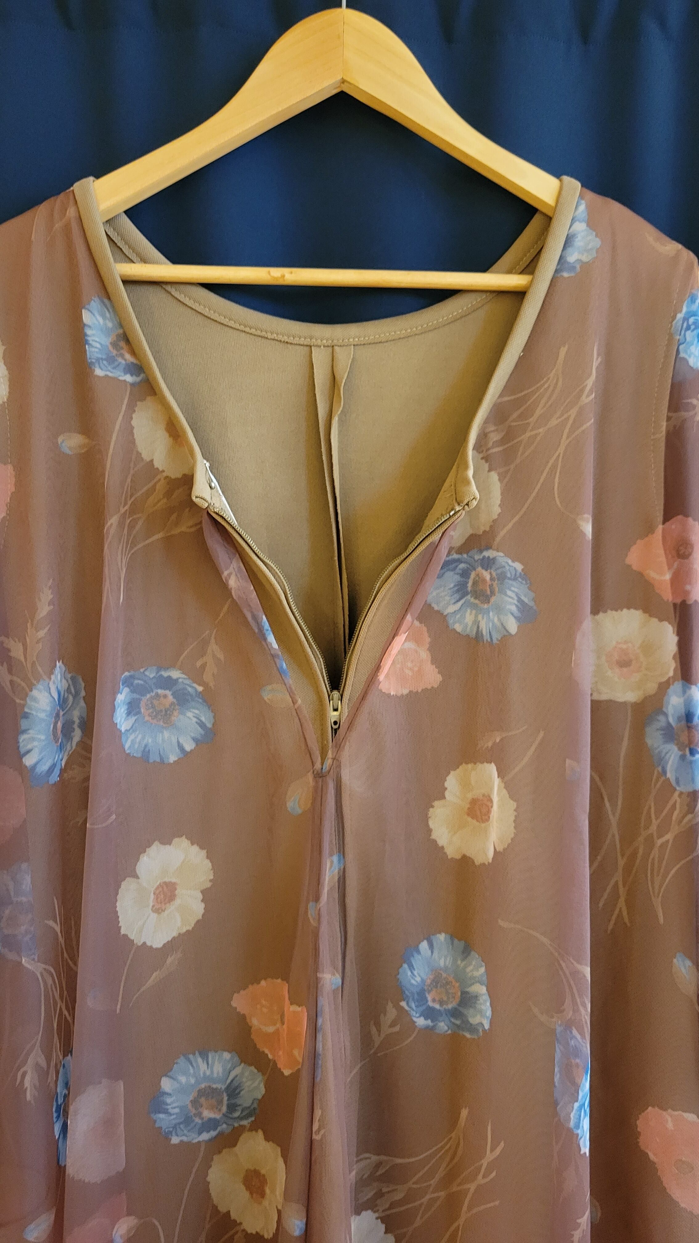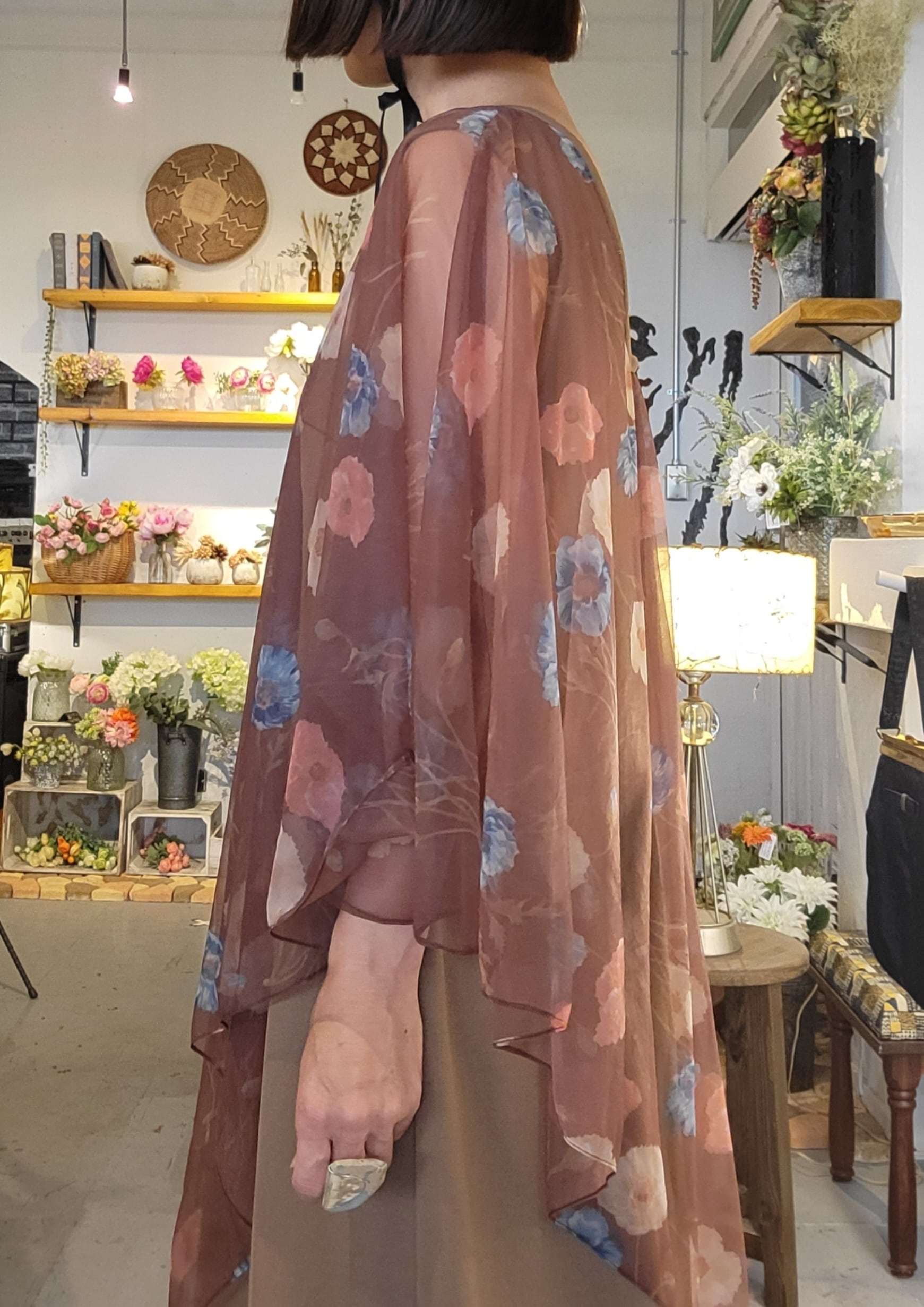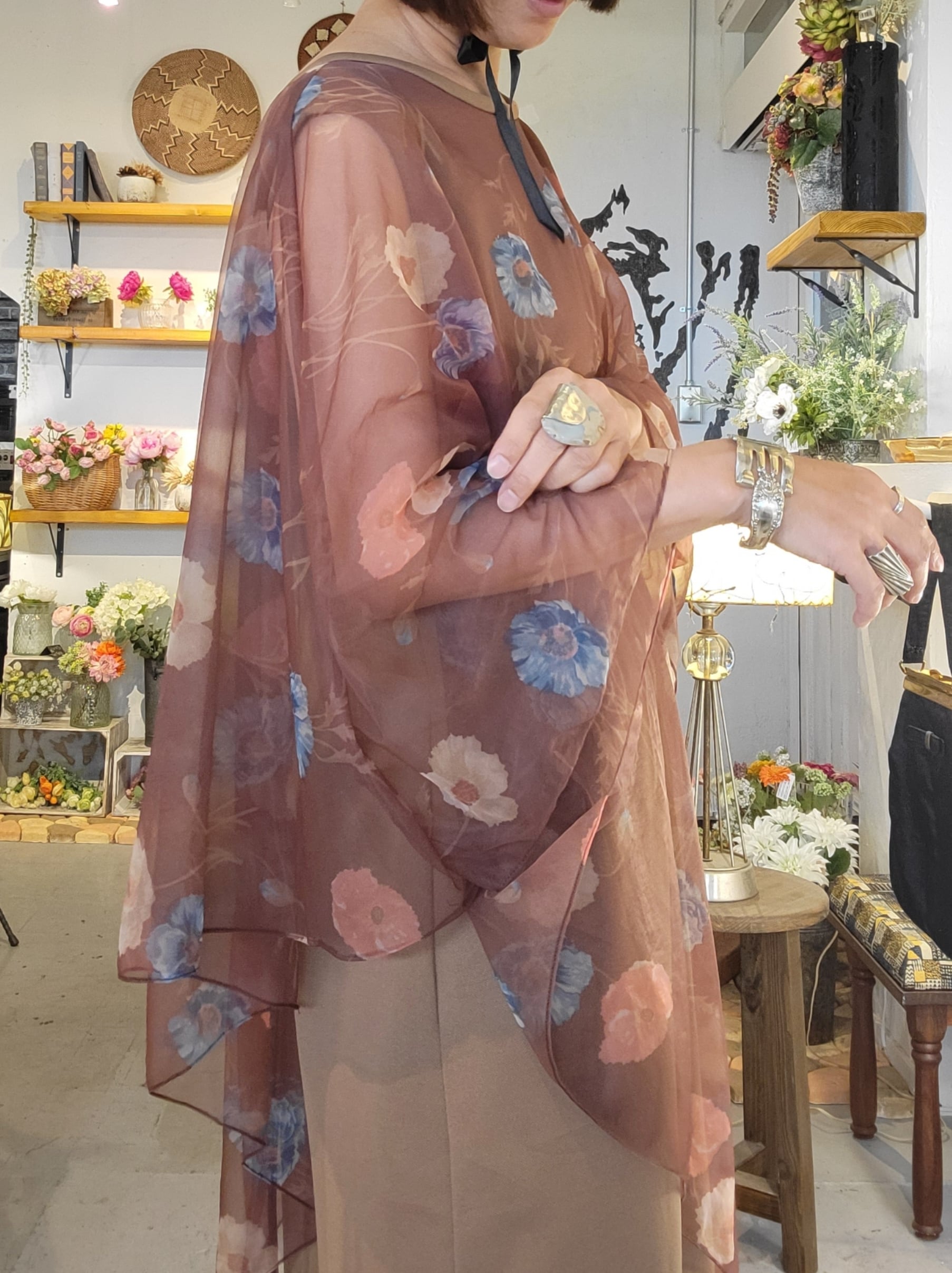 ヴィンテージのマキシドレス。ノースリーブドレスにシアー素材のケープがドッキングしたデザインです。素材表記はありませんがポリエステルのようです。ゆったりしたサイズ感で体のラインを拾わず幅広いサイズに対応可能。ノースリーブの涼しさを保ちつつ、ケープで肌の露出を控えめに。1枚で仕上がる落ち着いた色味のヴィンテージドレスです。