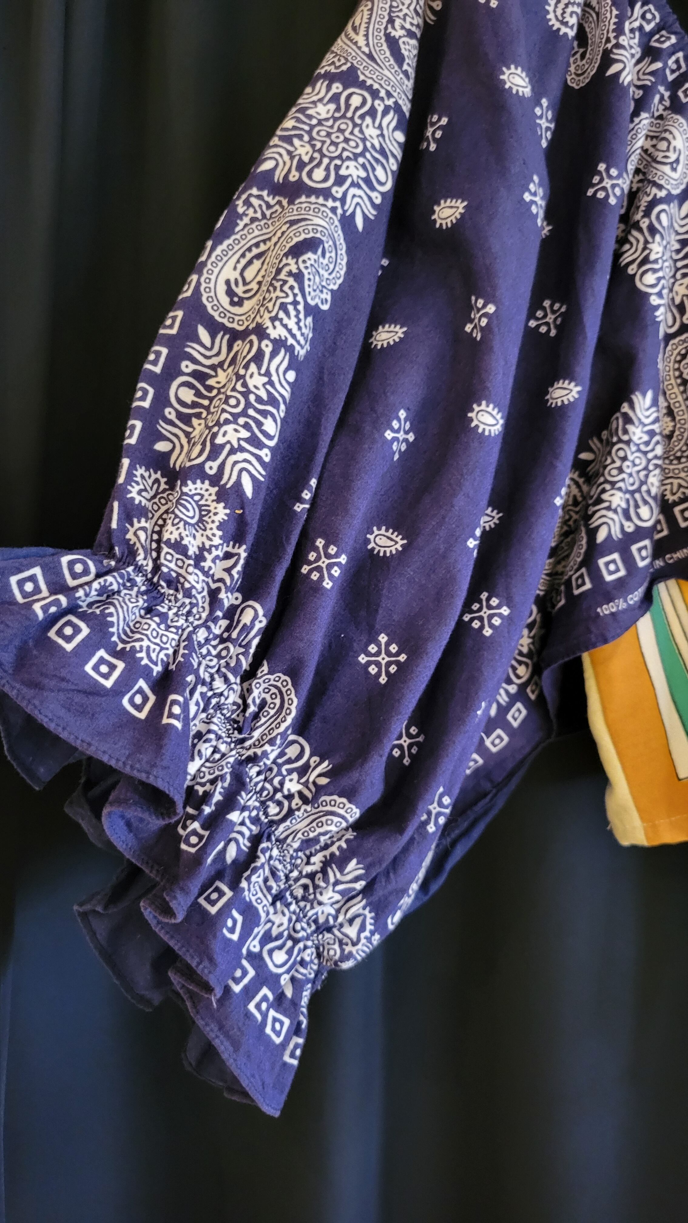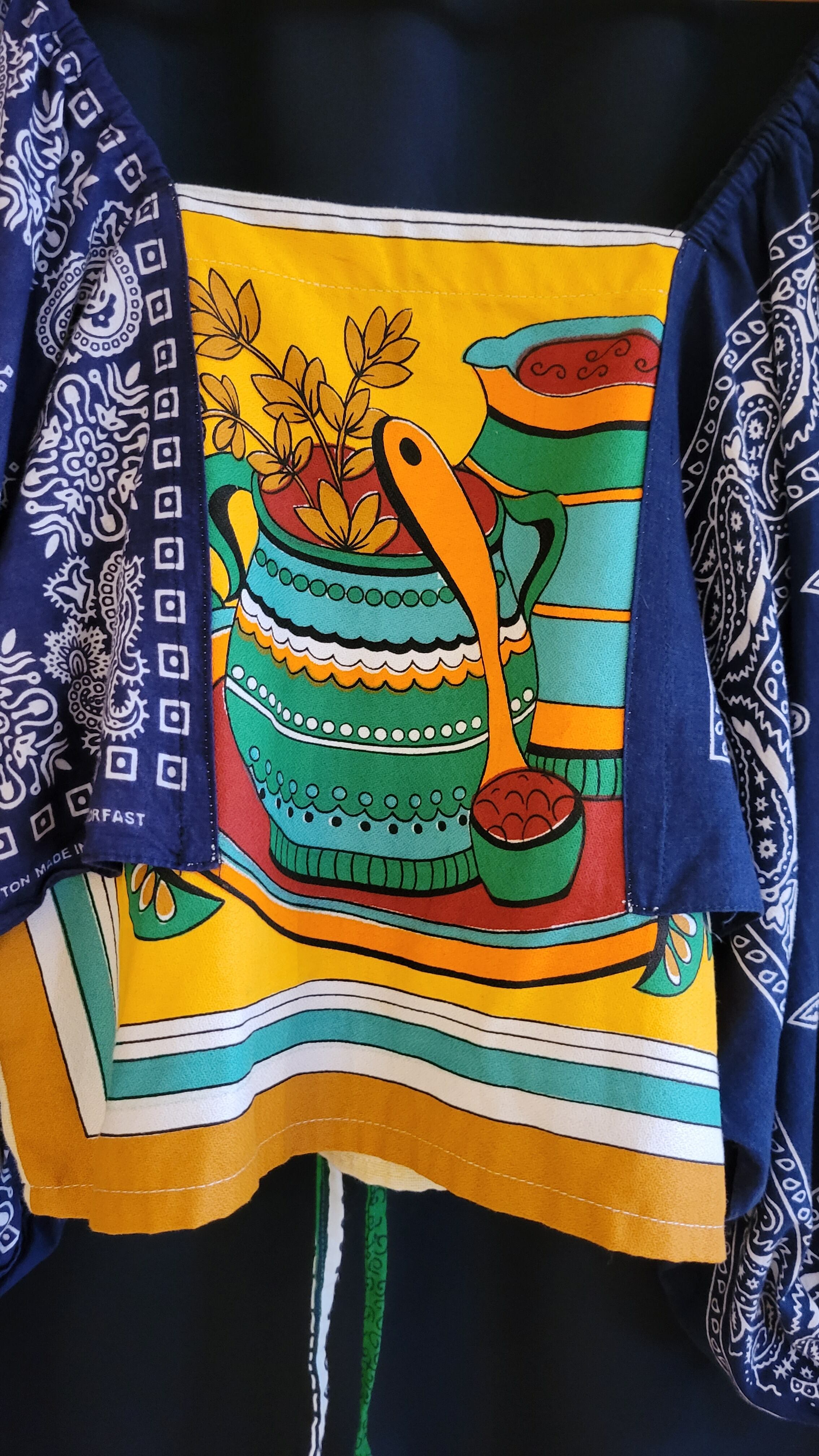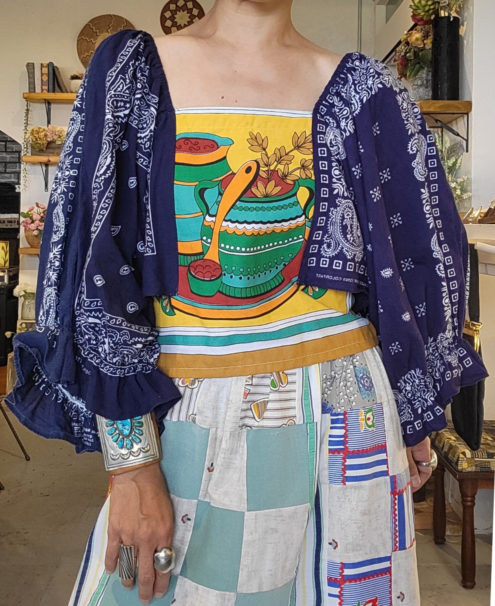 ヴィンテージクロスとバンダナを使用したリメイクトップス。素材はコットンです。前後で柄が異なり、バックリボンをきゅっと結ぶとバックスタイルの表情が豊かに。短め丈ですのでハイウエストのボトムとの相性抜群です。