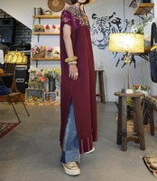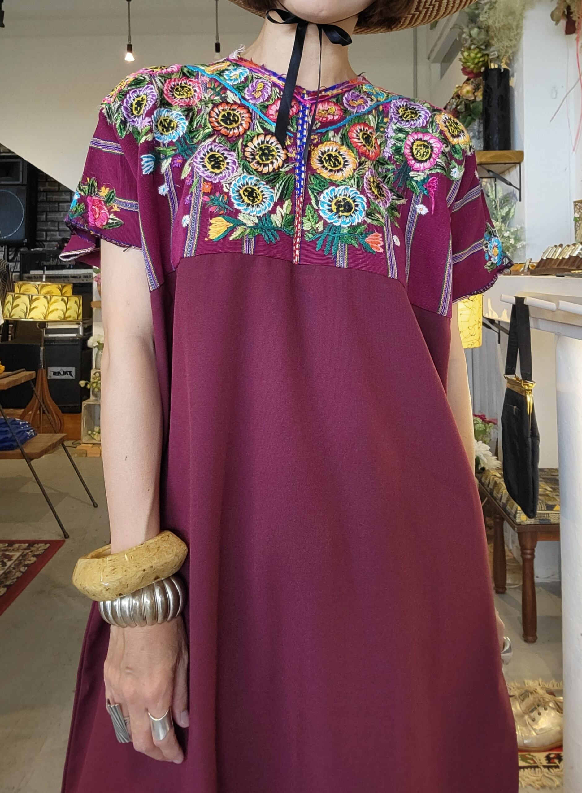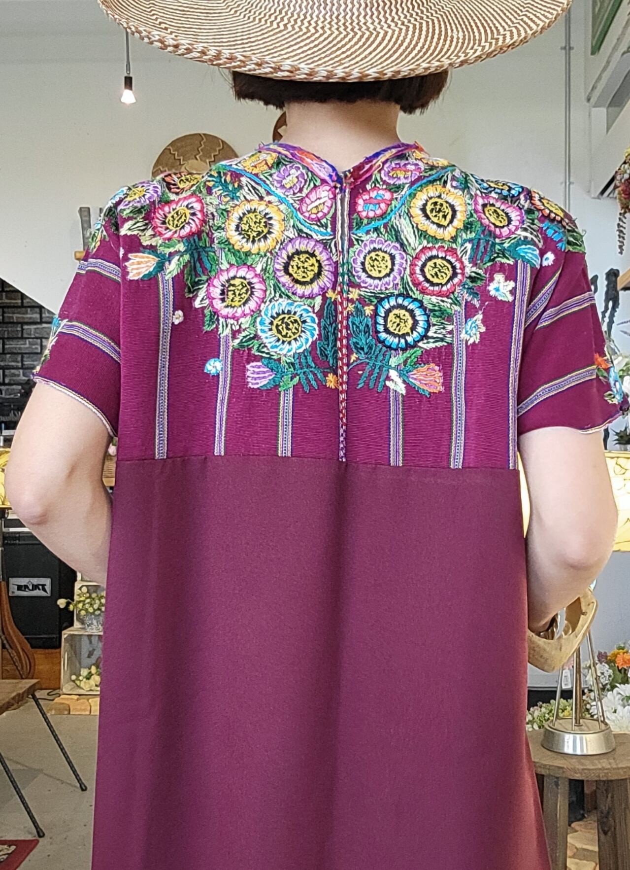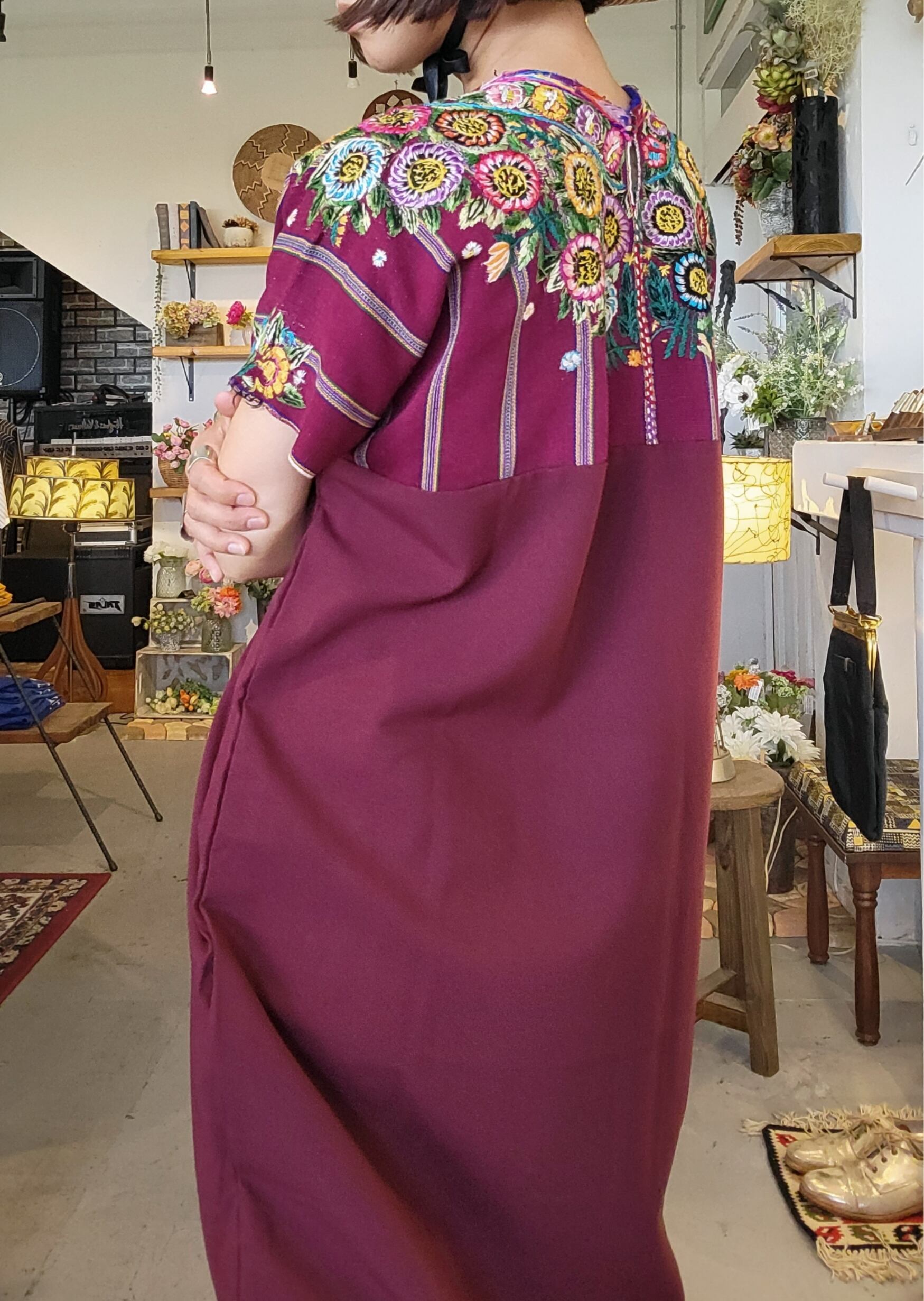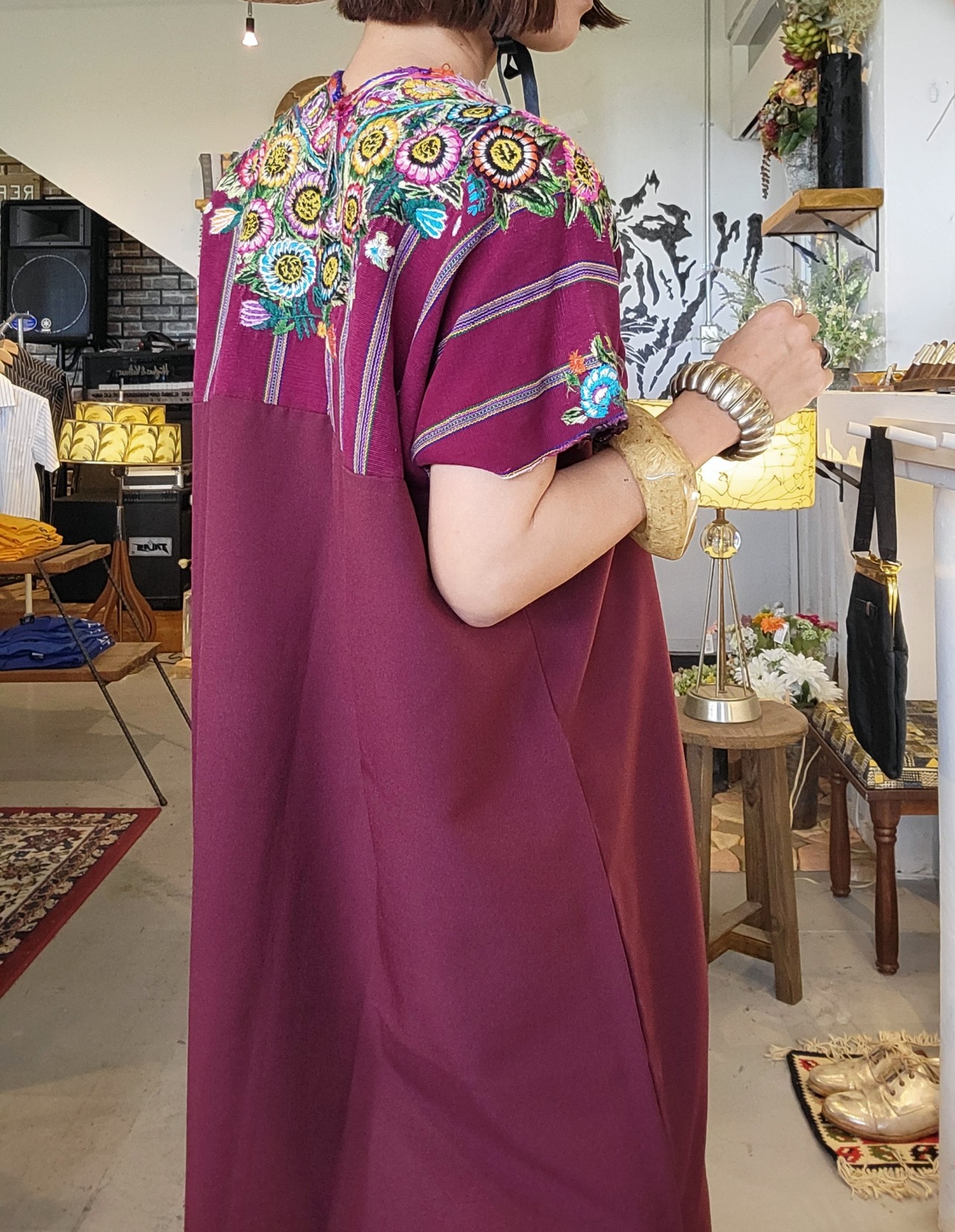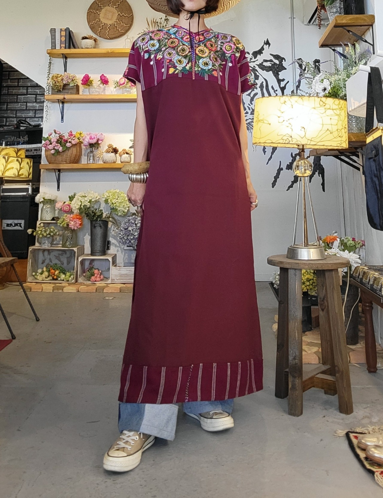 メキシコ オアハカ刺繍が美しいヴィンテージのマキシドレス。素材表記はありませんが、刺繍が施された上部はやわらかいピケ素材、それ以外の部分はやや厚手で落ち感のあるポリエステルのよう素材感です。伸縮性、透け感はなく1枚で着られます。後ろの首もとにホックがひとつ付いています。左のみ裾からサイドスリットが46cm入っているため足さばきもスムーズです。