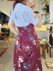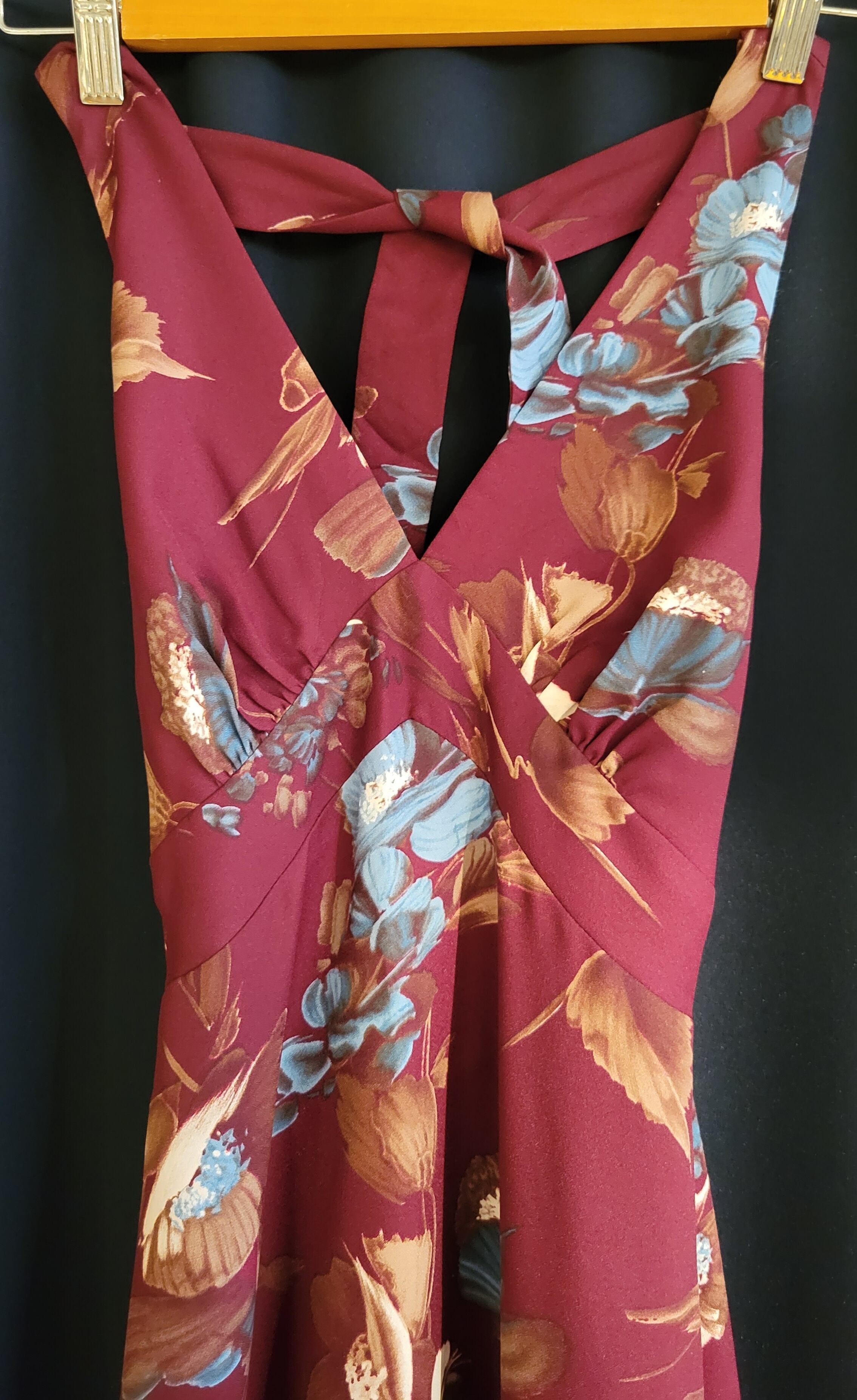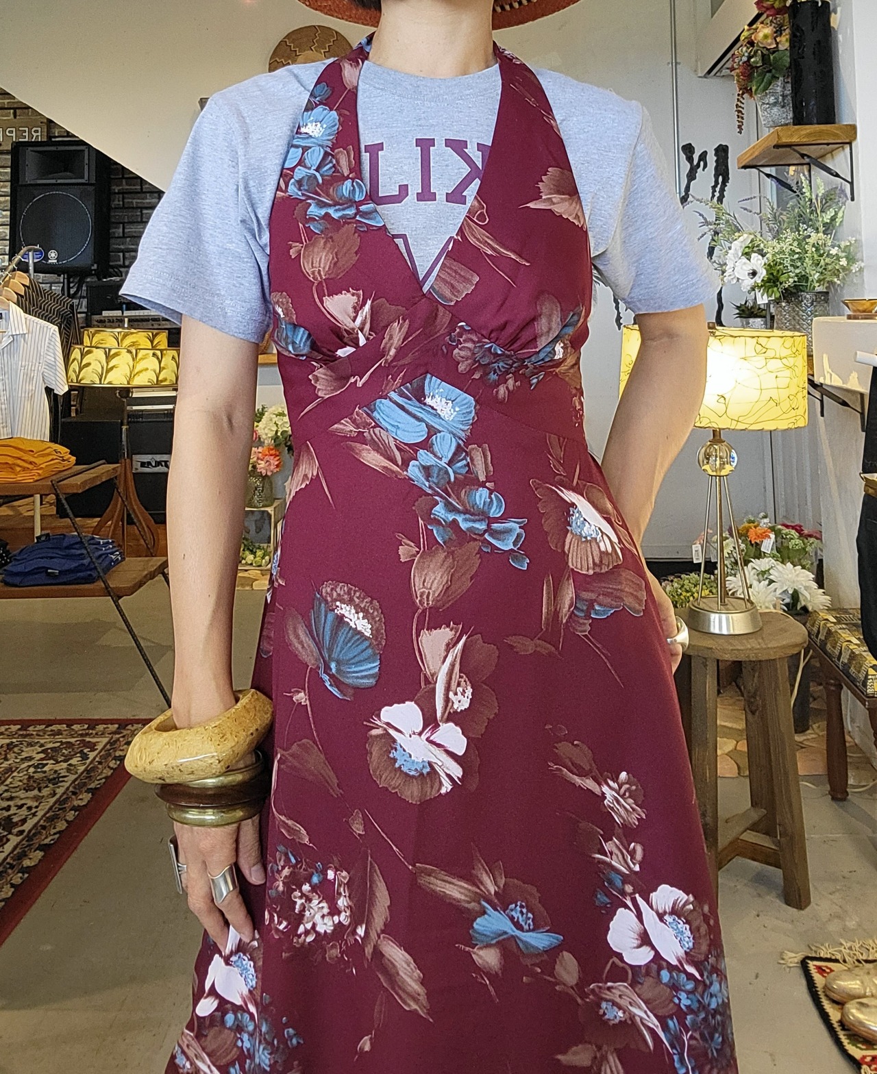ヴィンテージのホルターネックマキシドレス素材はポリエステル100 バックはシャーリングゴム仕様、ファスナーはついていません。バスト下から裾にかけて緩やかに広がる綺麗なAラインシルエットが大人の雰囲気です。ほぼ未使用のようです。