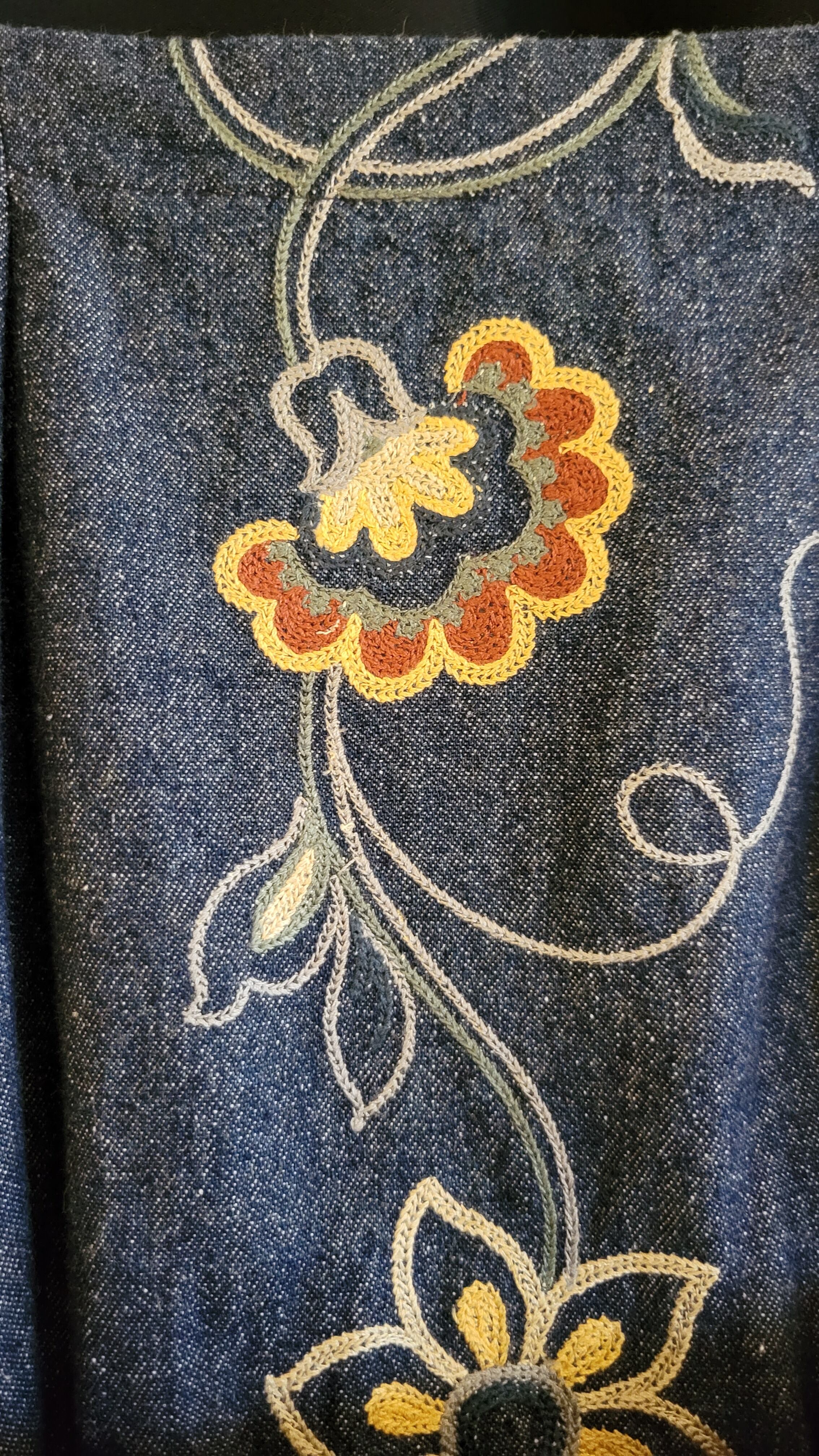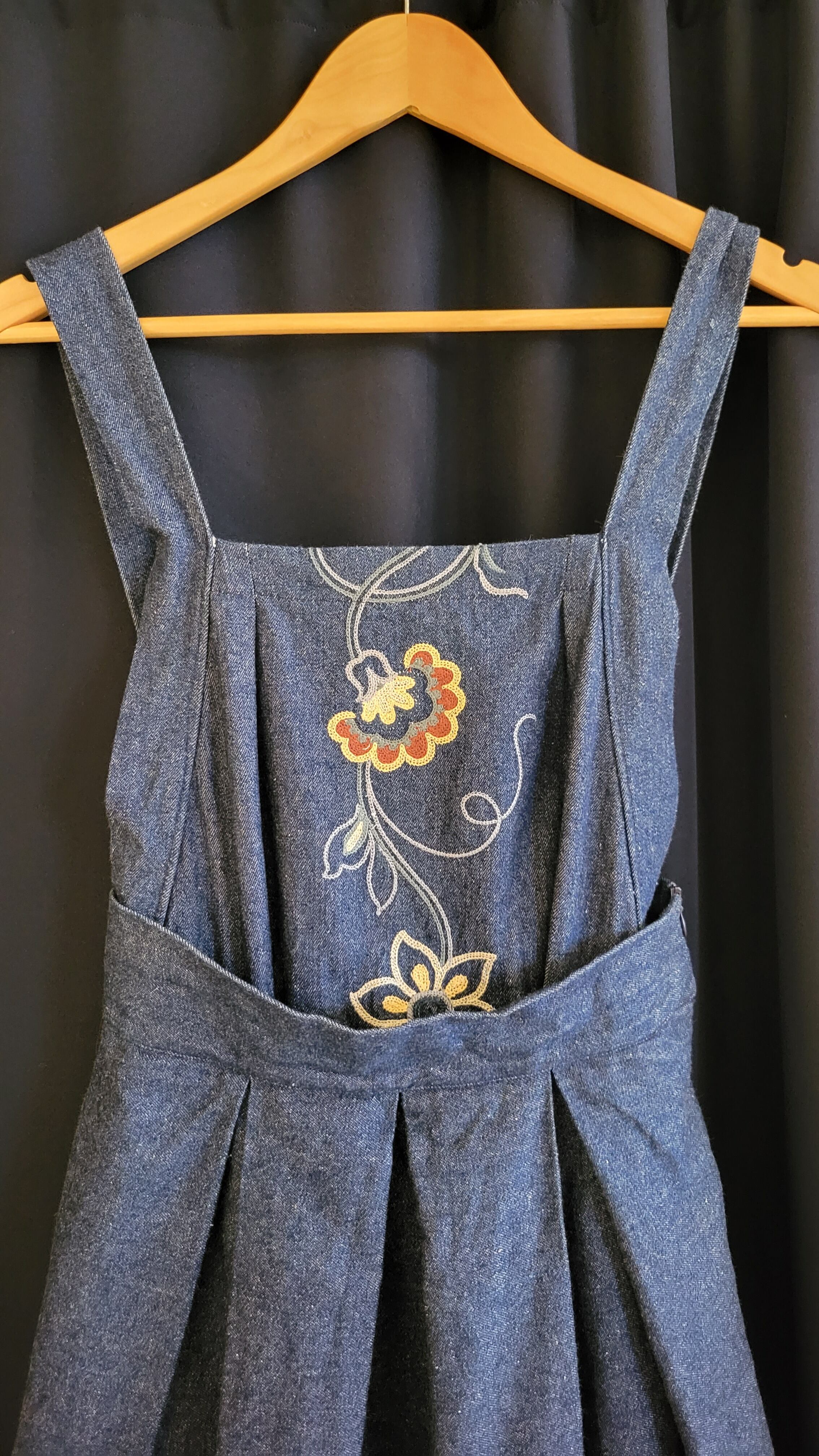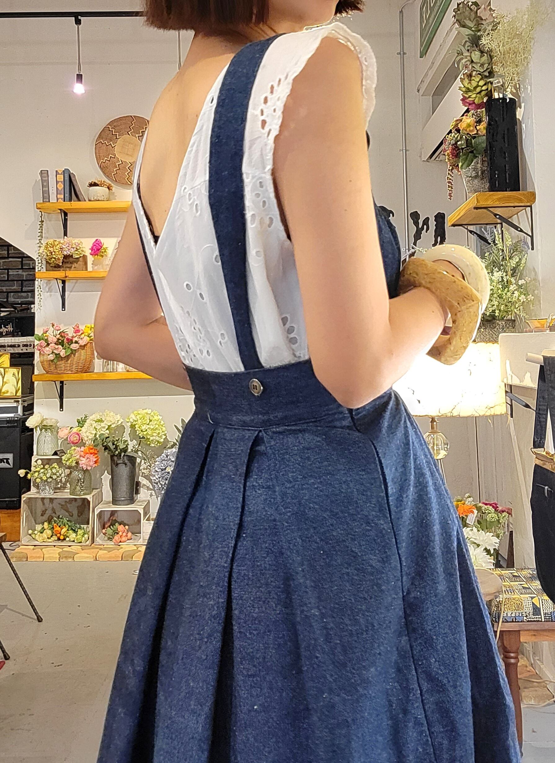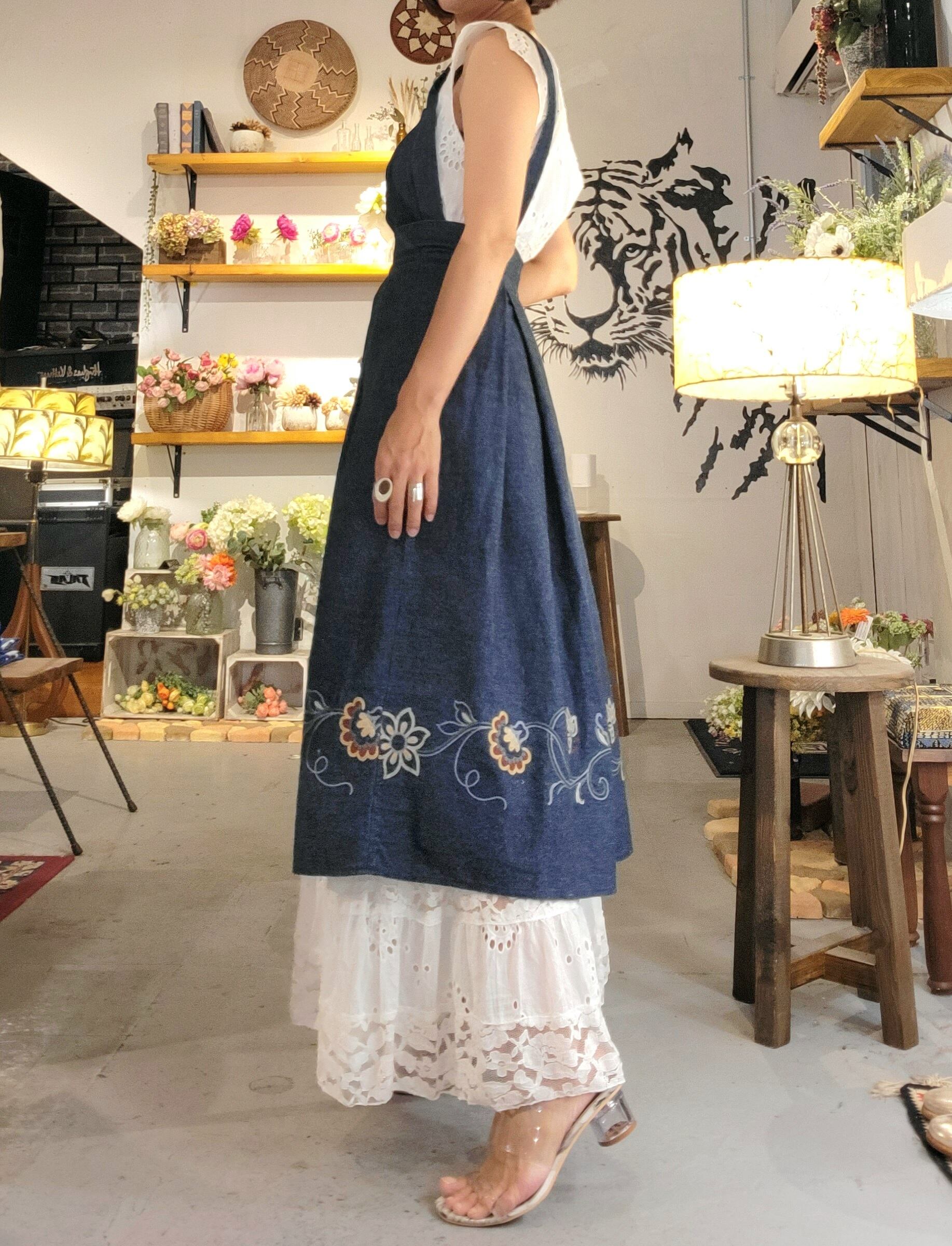 ヴィンテージのデニムエプロンスカート。ほぼ未使用の張り感の残るしっかりしたデニムです。ウエスト左サイドにジッパー付き。胸当てと裾に入ったチェーンステッチ刺繍がアクセントに。しっかりした張り感によるプリーツのボリュームが魅力です。