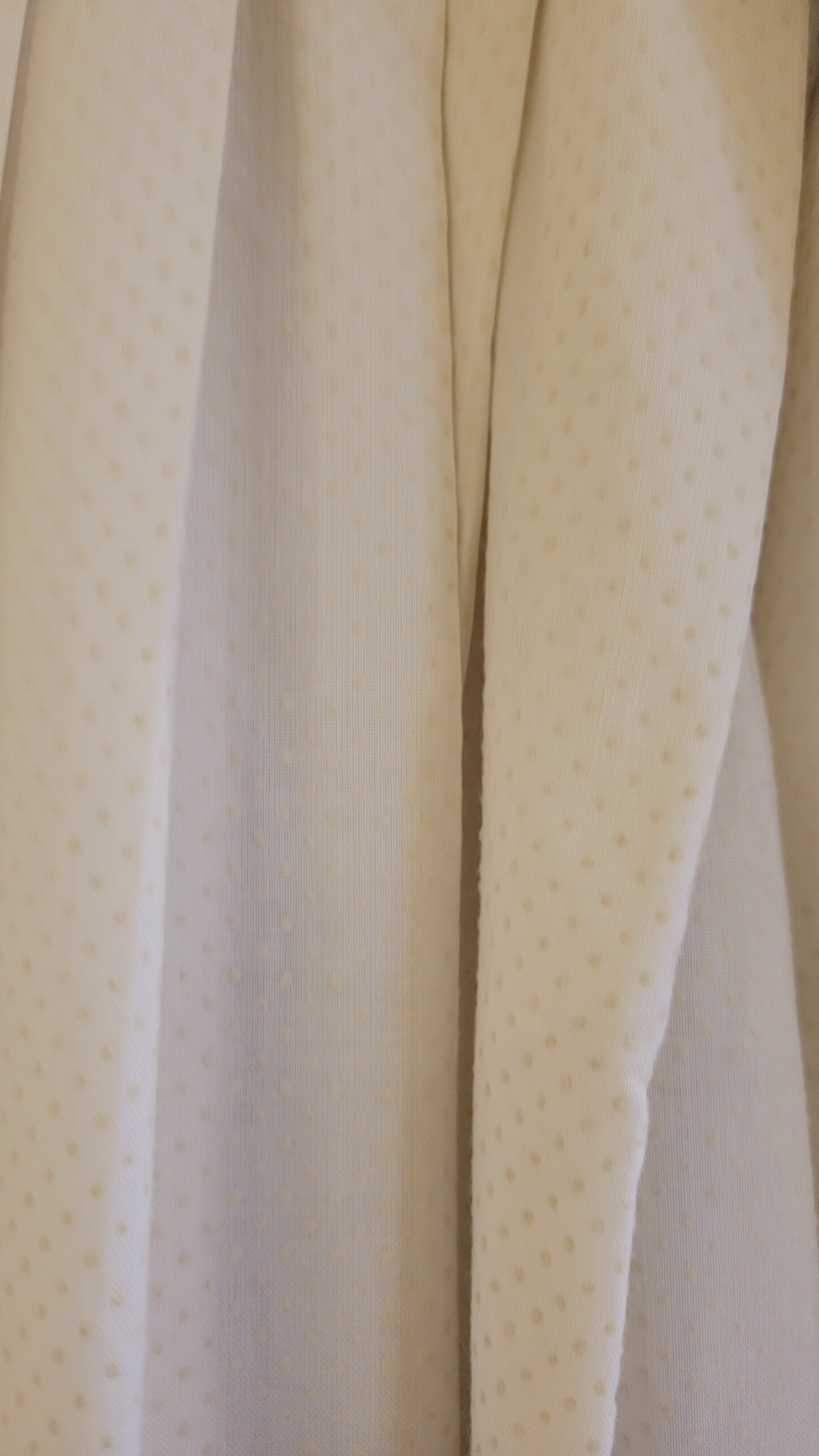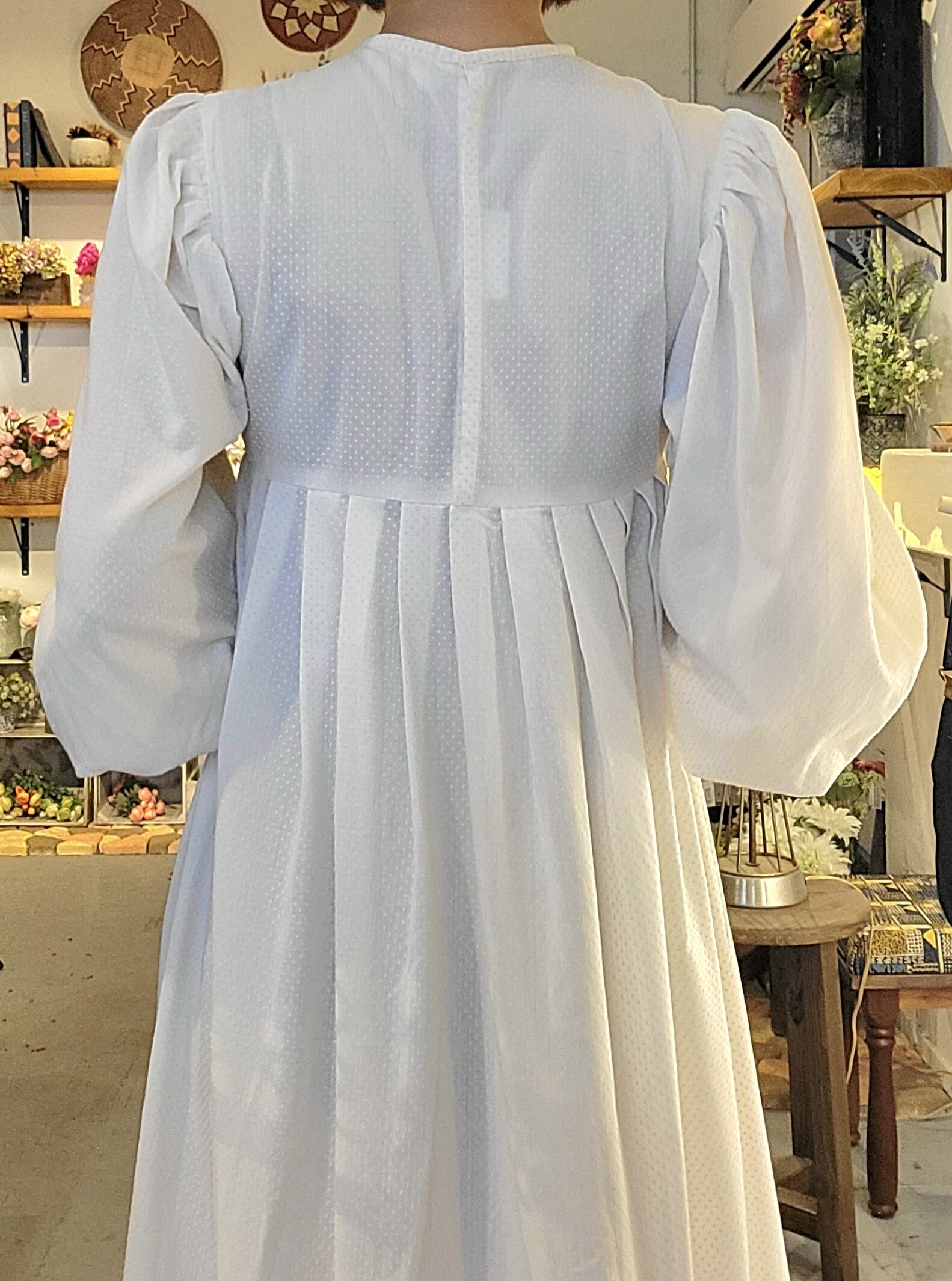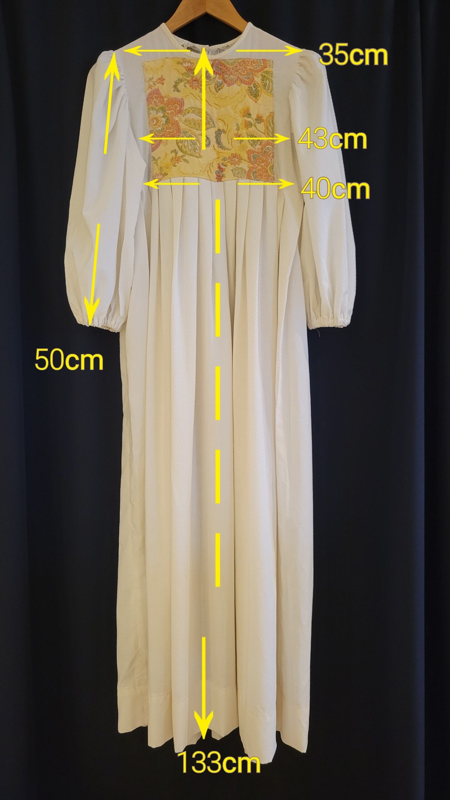 胸元にゴブラン織りの別布があしわられたヴィンテージマキシドレス。素材表記はありませんがコットンのようです。生地は立体的な浮き出る細かいドット柄。バックにファスナーは無く、小さなスナップボタンがひとつ付いています。ハイウエスト位置での切り替えはスタイルを良く見せてくれます。