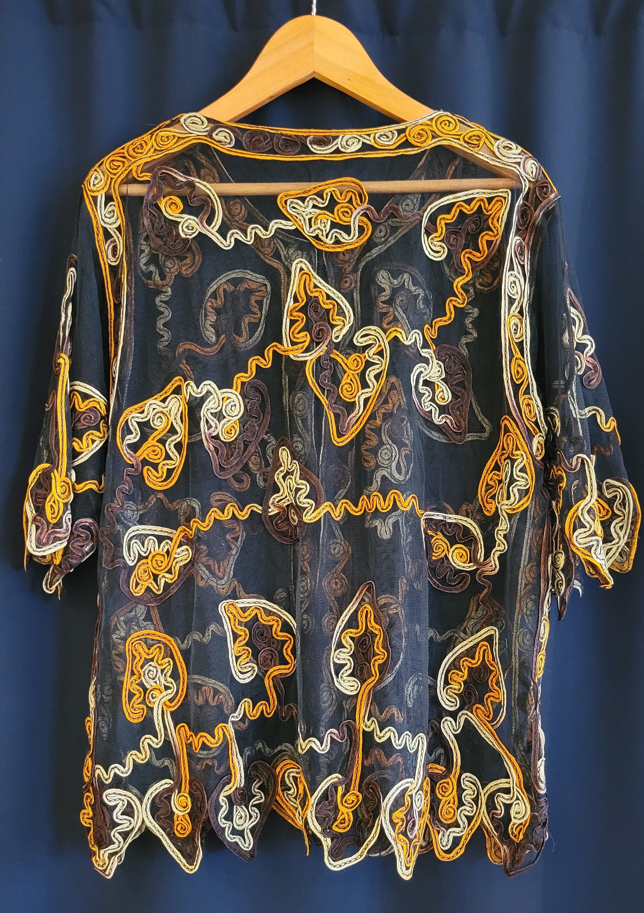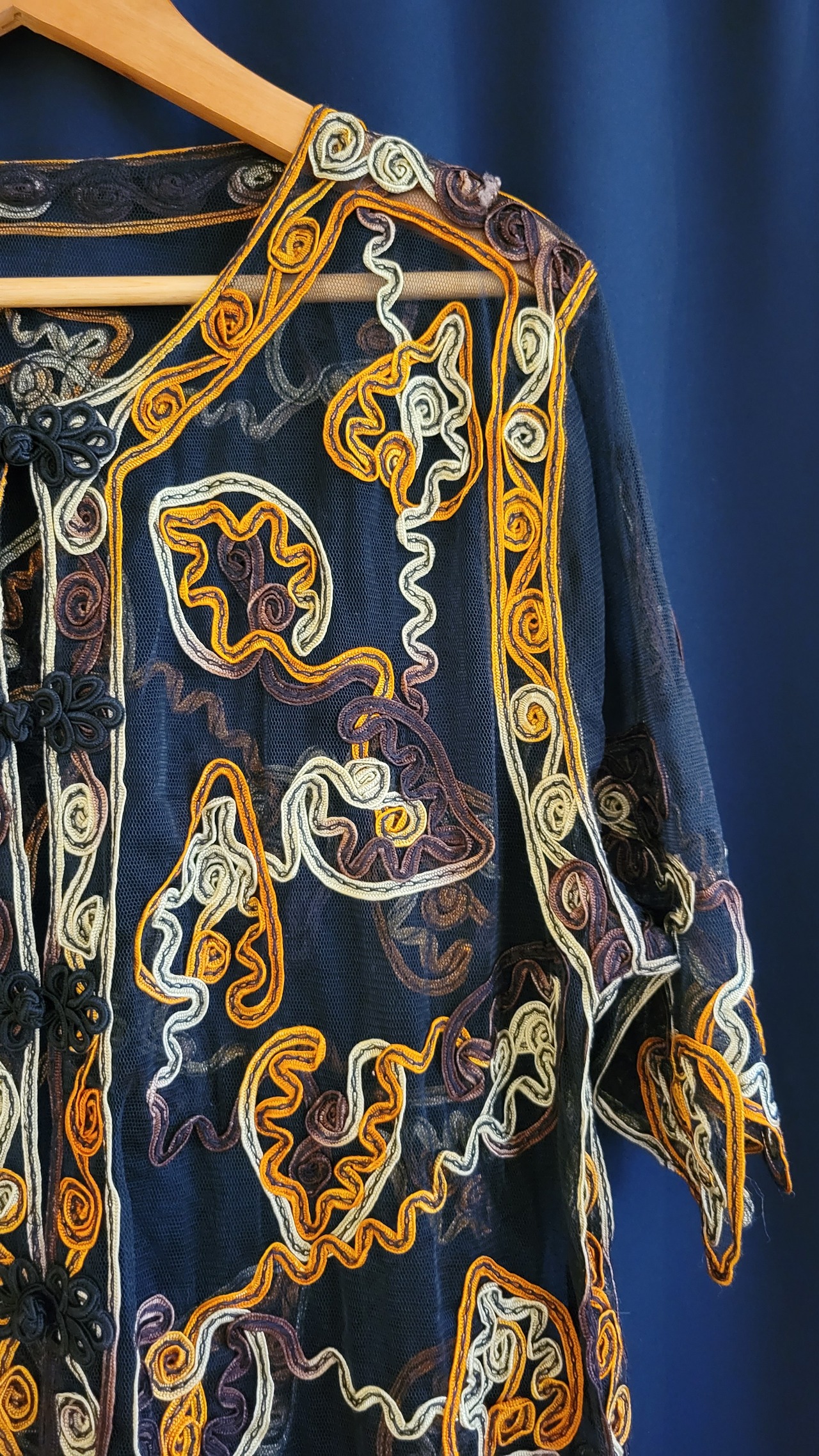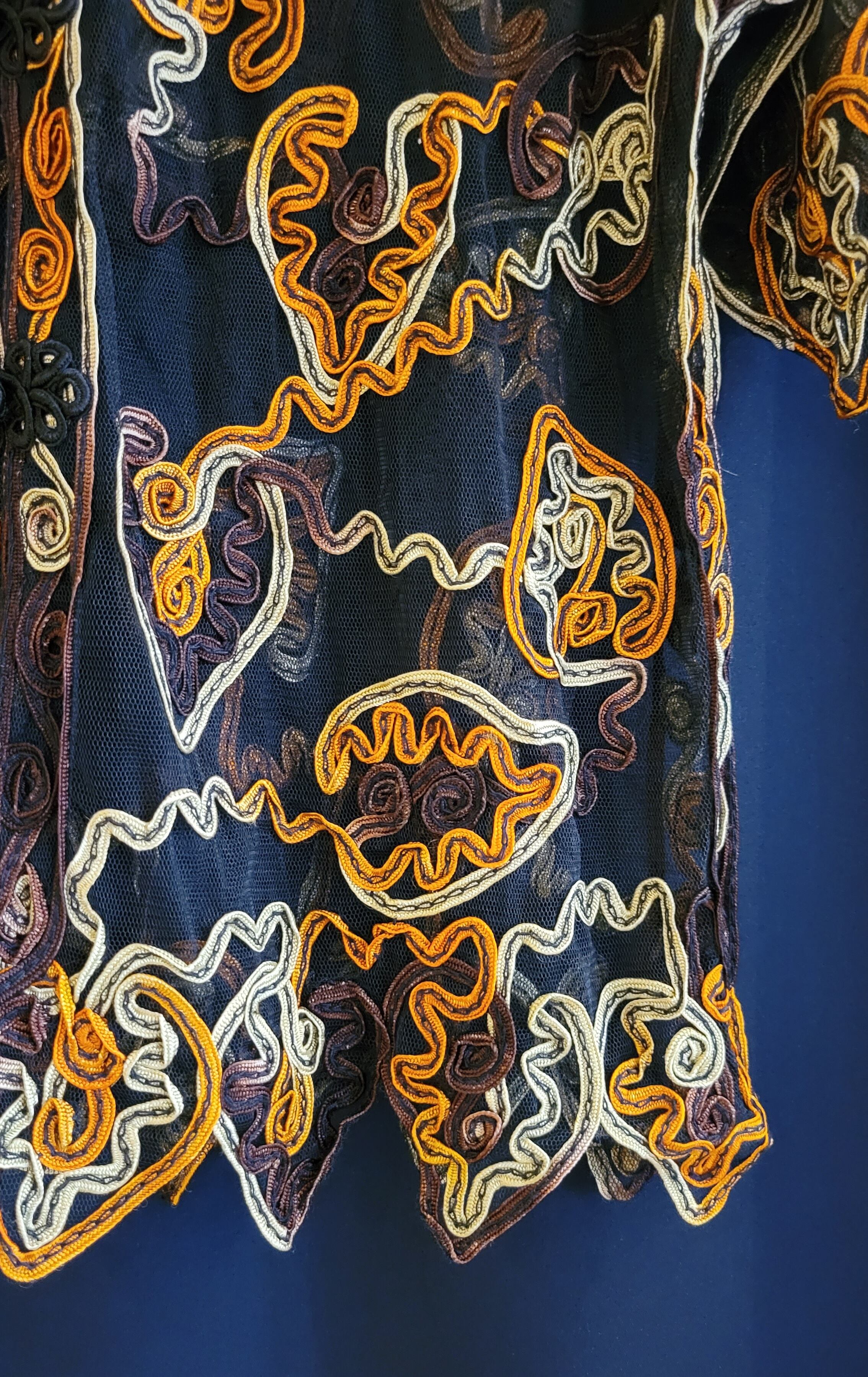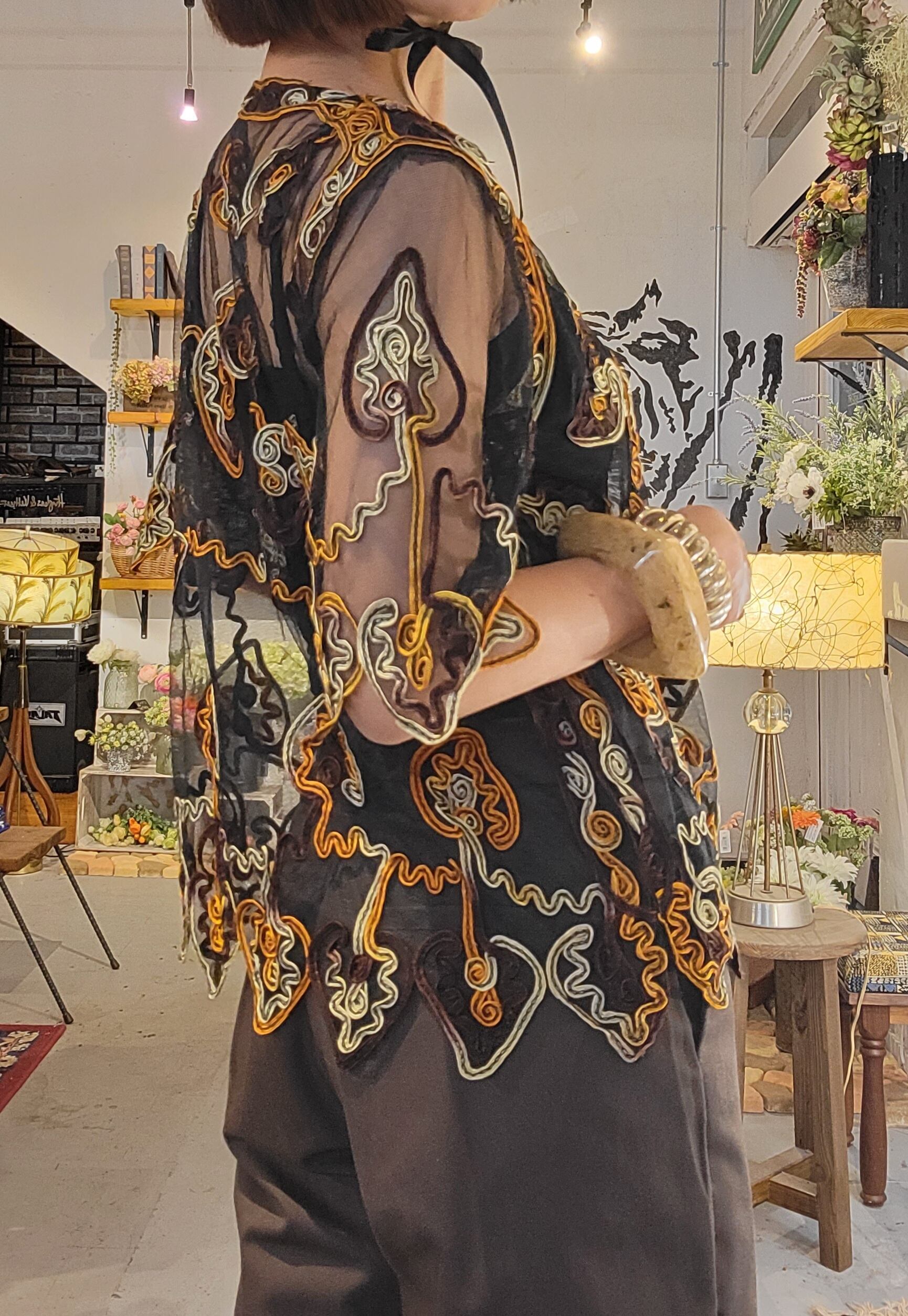 ヴィンテージのチャイナ風チュールトップス。素材表記はありませんがナイロンまたはポリエステルのチュールのようです。全体に施されたコード刺繍が華やかながらも、落ち着いたら色合いが派手すぎず渋めのスタイリングが叶います。