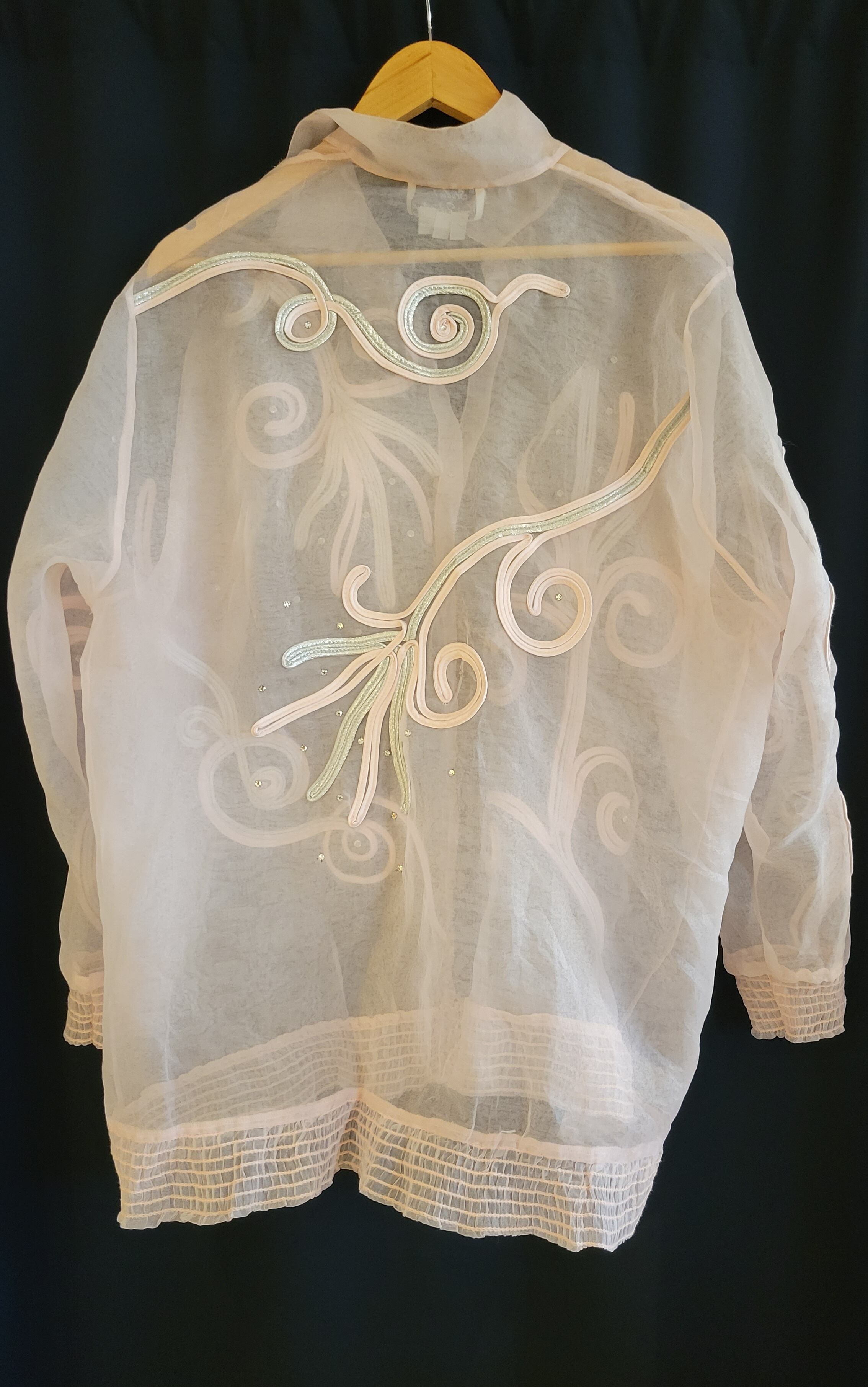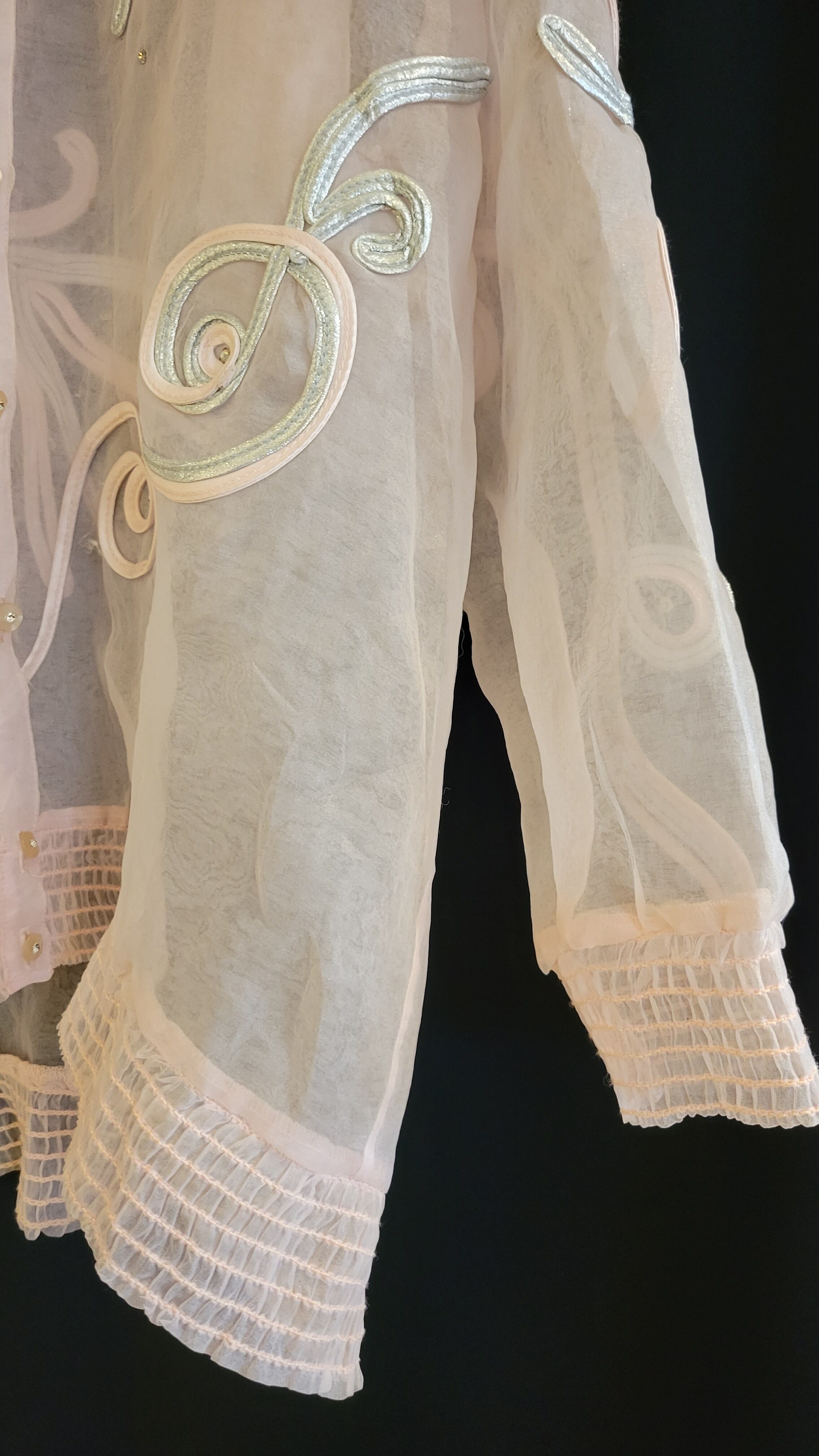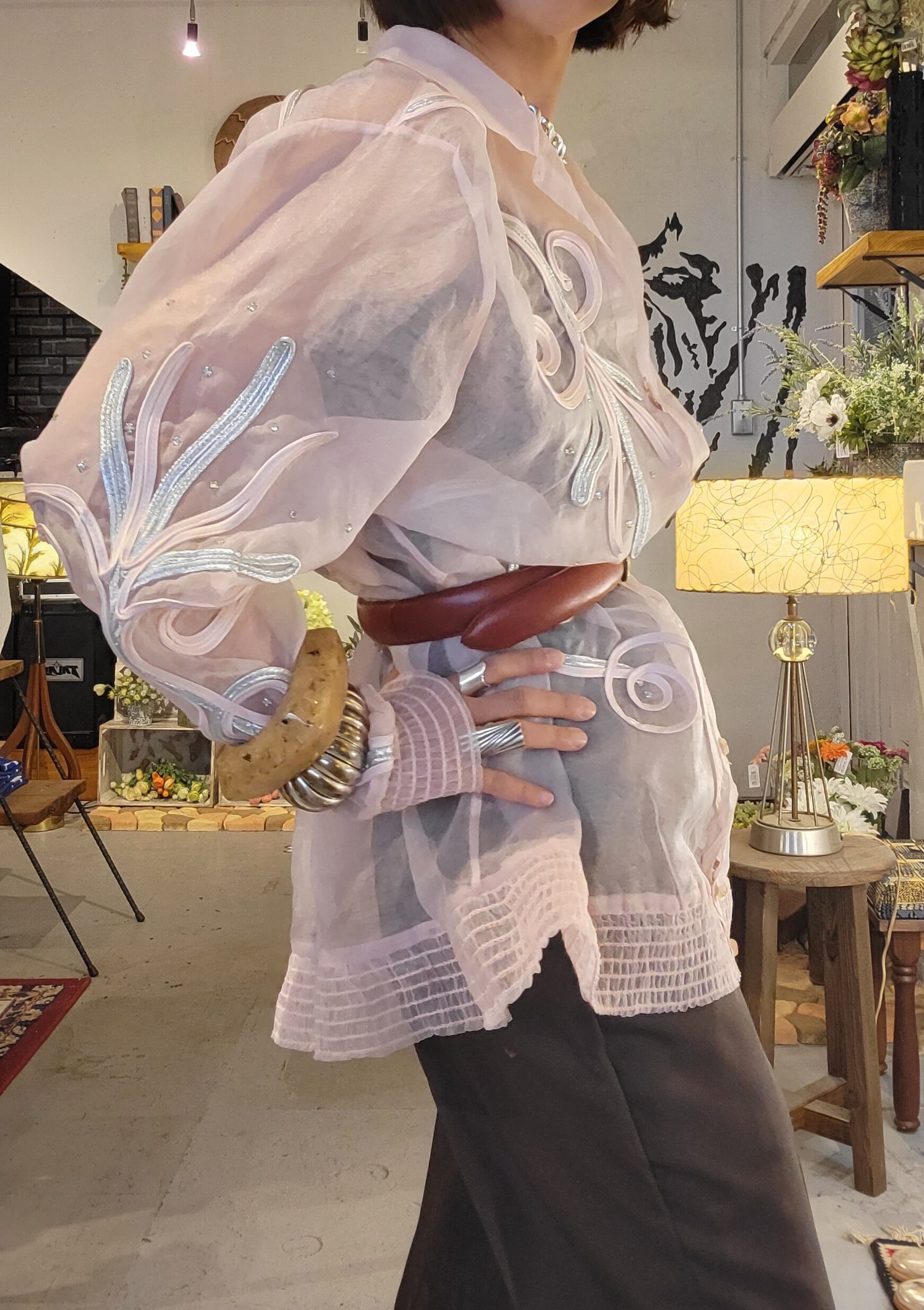 ヴィンテージのオーガンジー素材のトップス。素材表記はありませんがナイロンのような素材感です。張り感があります。大胆なコード刺繍やヴィンテージボタンが華やか。オーバーサイズでこなれた雰囲気の出せる印トップスです。*一番上のボタンホールの上辺りに約1ミリほどの小さなシミがあります。画像をご確認ください。