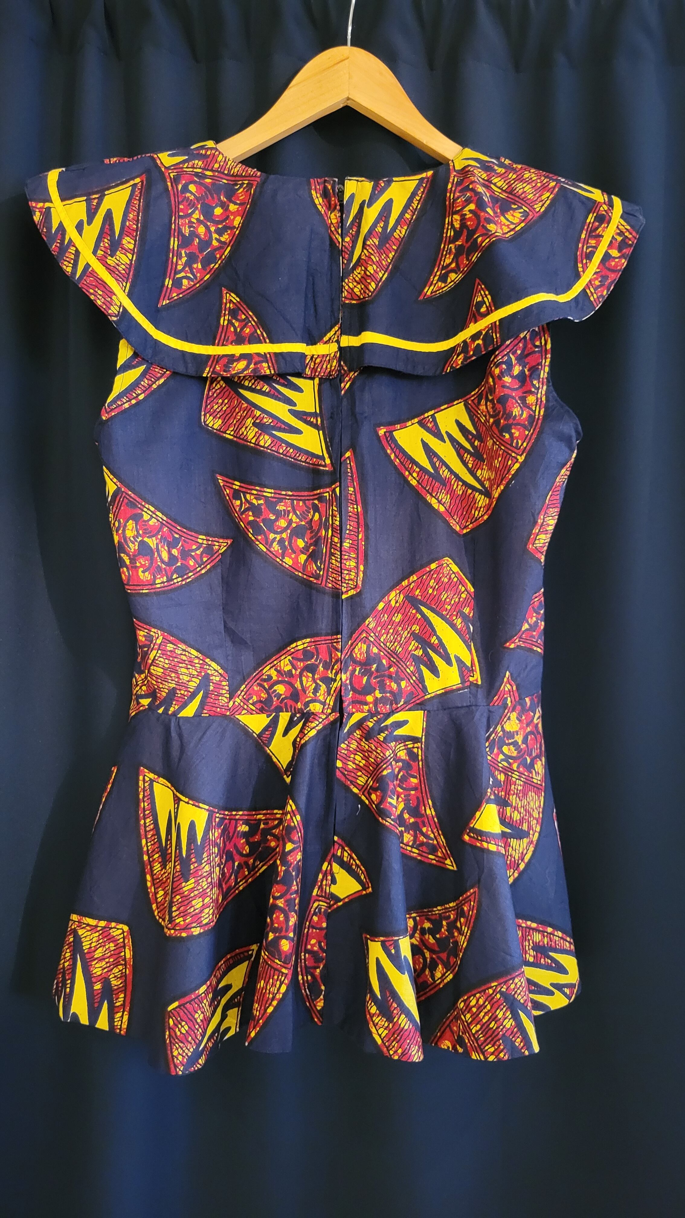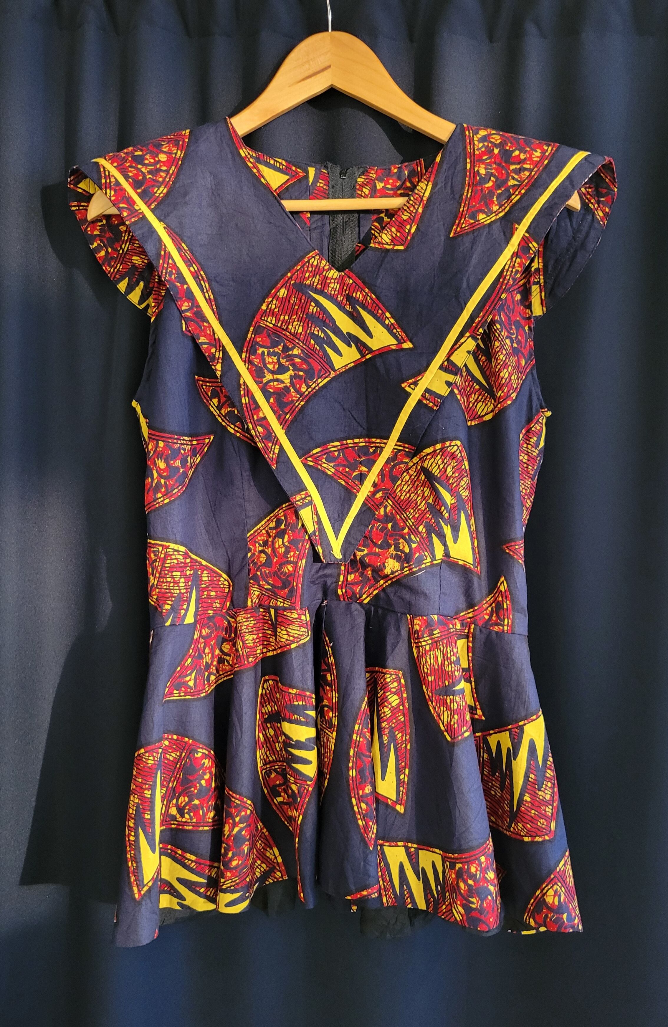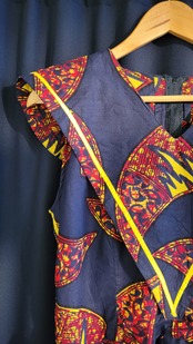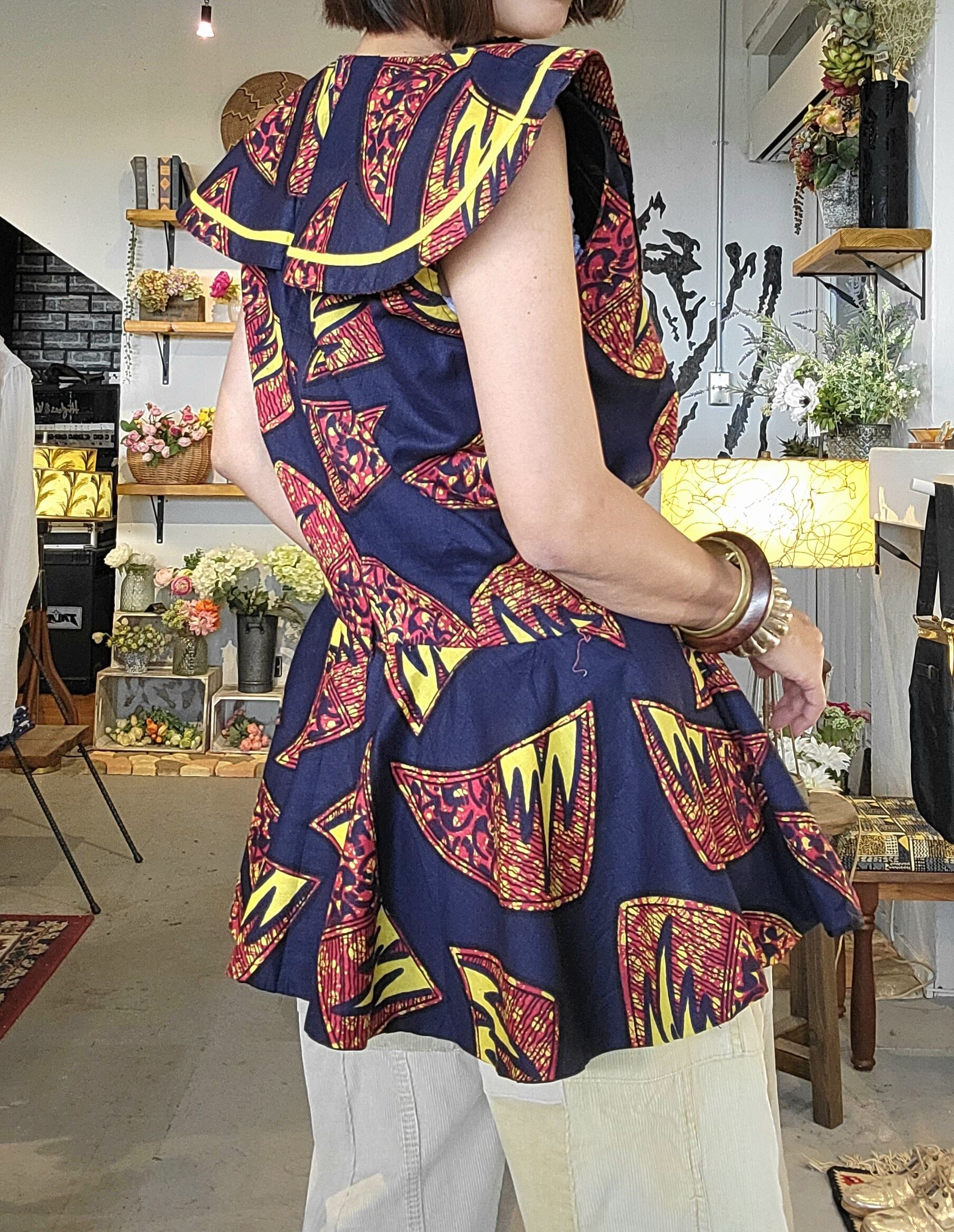 アフリカンバティックのヴィンテージトップス。素材表記はありませんが張りのあるしっかりしたコットンです。バックファスナーは腰下まで深く開き着脱が楽です。大きめサイズですが、アームホールが広い点を除いては身幅・ウエストはそこまで大きくありません。見せるインナーを着て大きめに着ることも可能です。