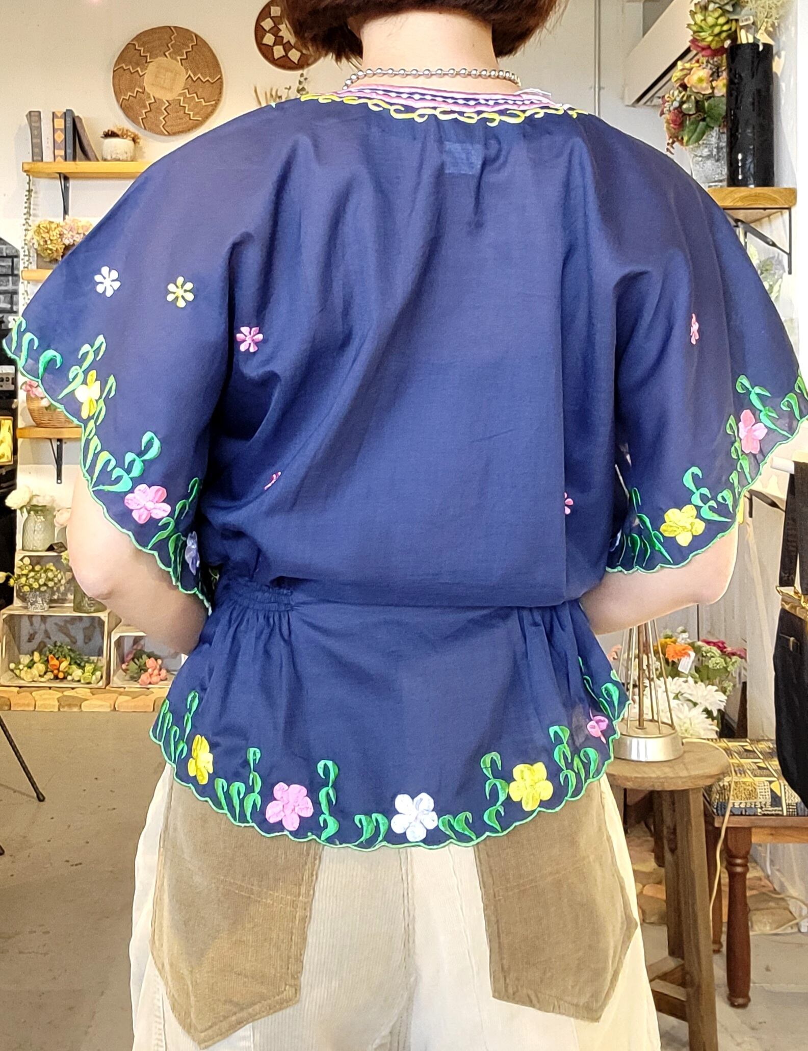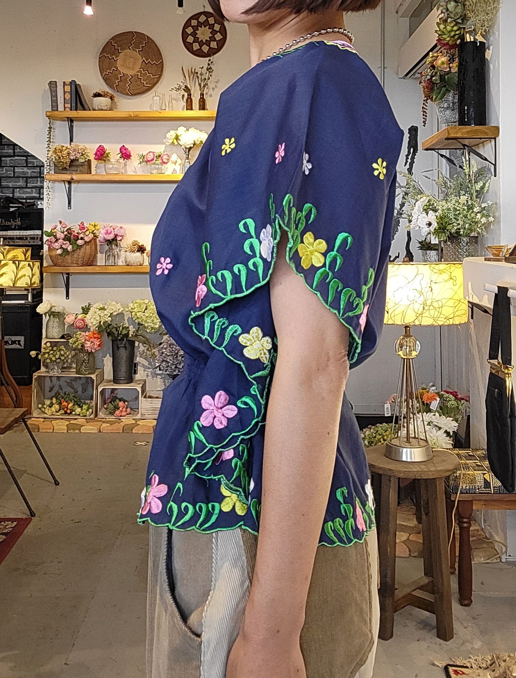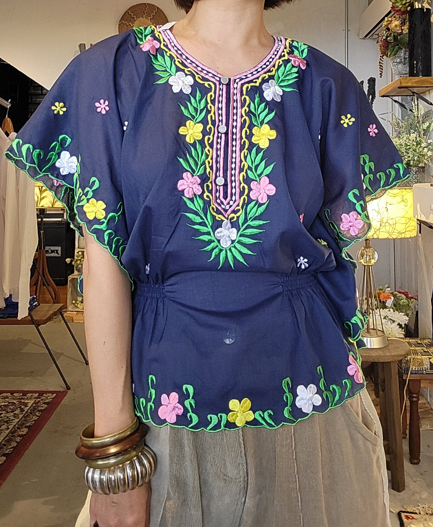 フィリピン刺繍のヴィンテージトップス。素材はポリエステル65% コットン35%です。若干の透け感があります。ネイビーの地にカラフルな刺繍が映えます。パンツにもスカートにも合わせやすい丈感です。
