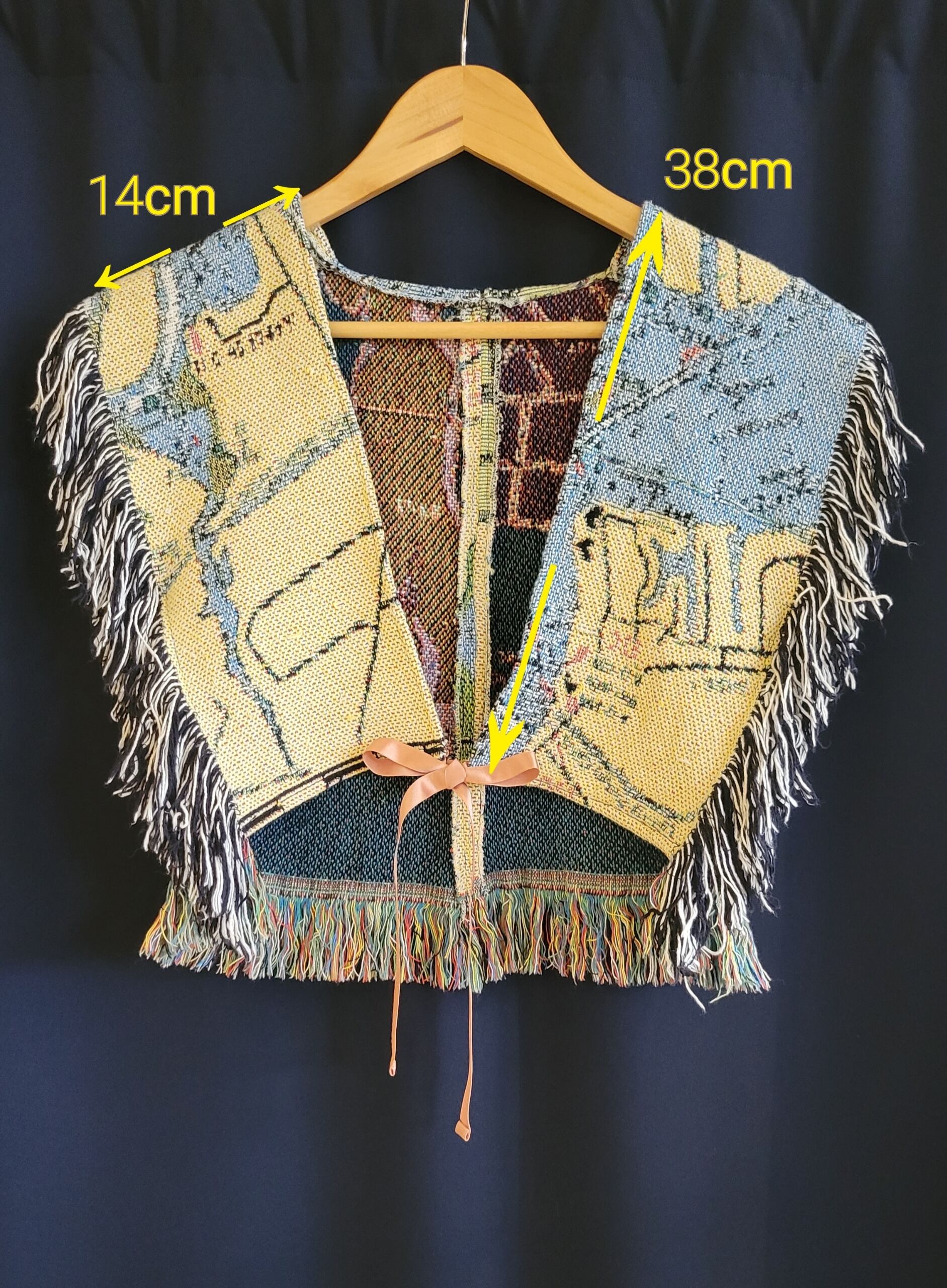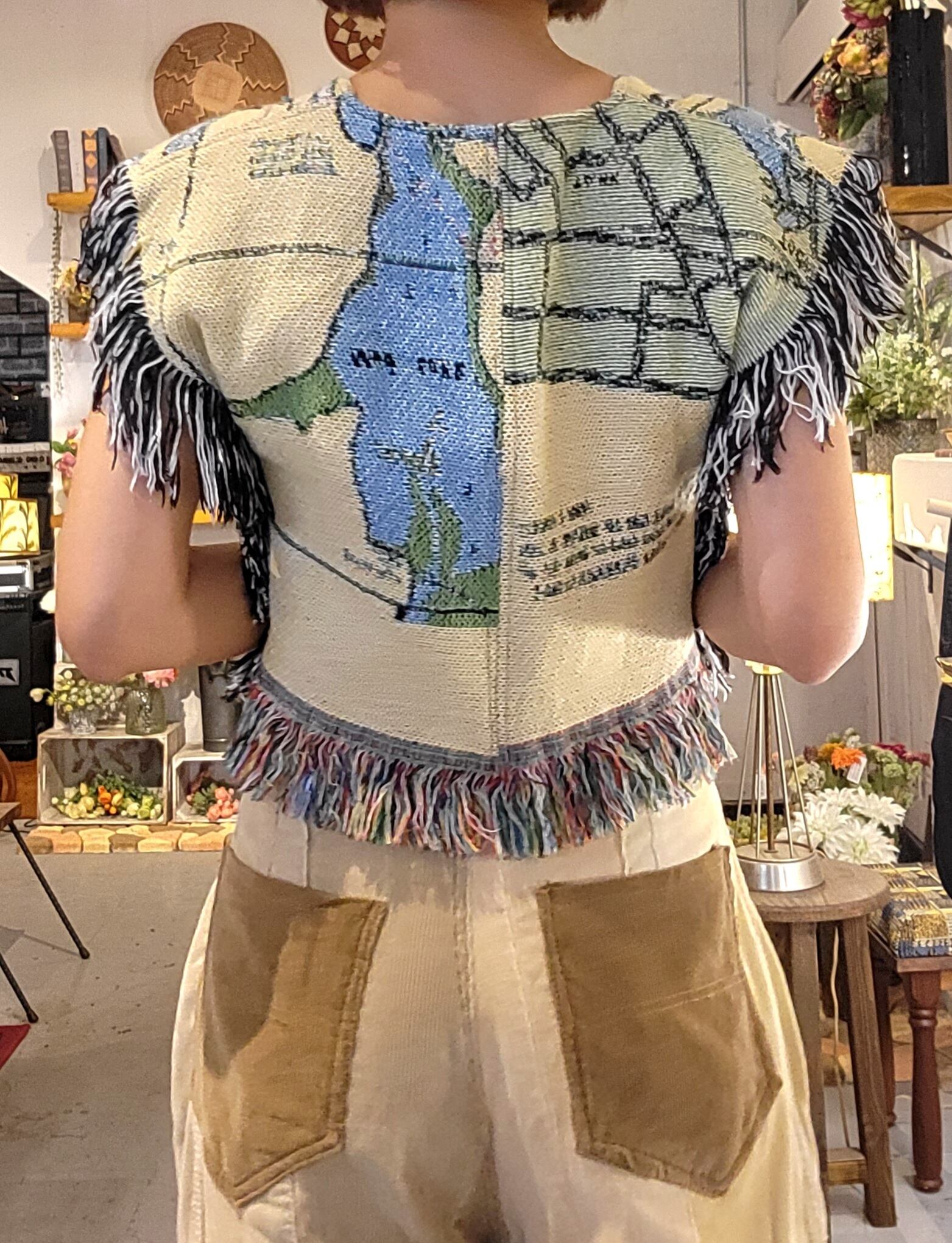 ヴィンテージのパイル地ブランケットを使用したリメイクベスト。フロントオープンでリボンが付いています。裏地は無く、粗めのパイル地でやや起毛しているので真夏に着るは少し暑いかもしれません。ショート丈でハイウエストボトムとの相性抜群です。