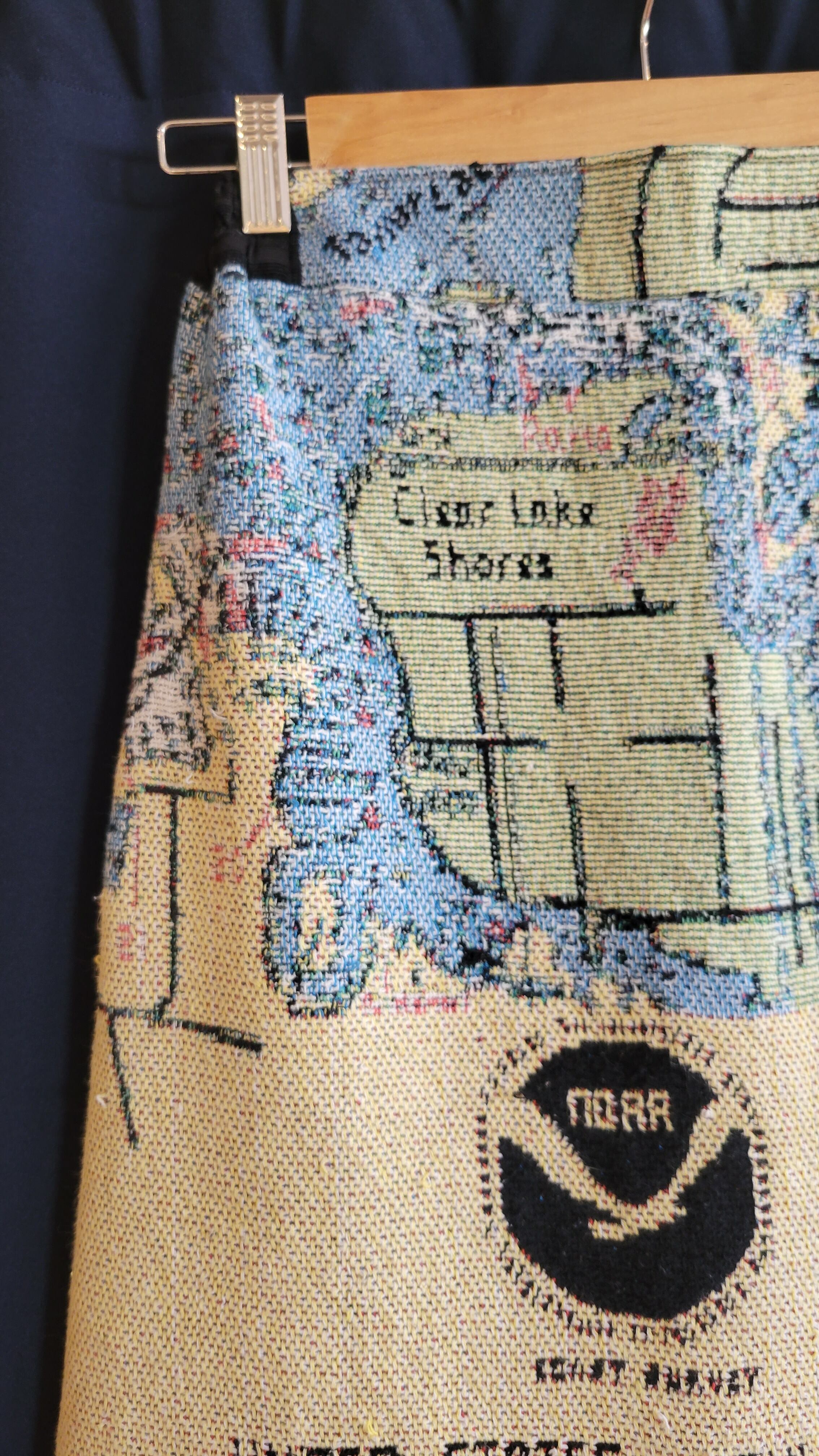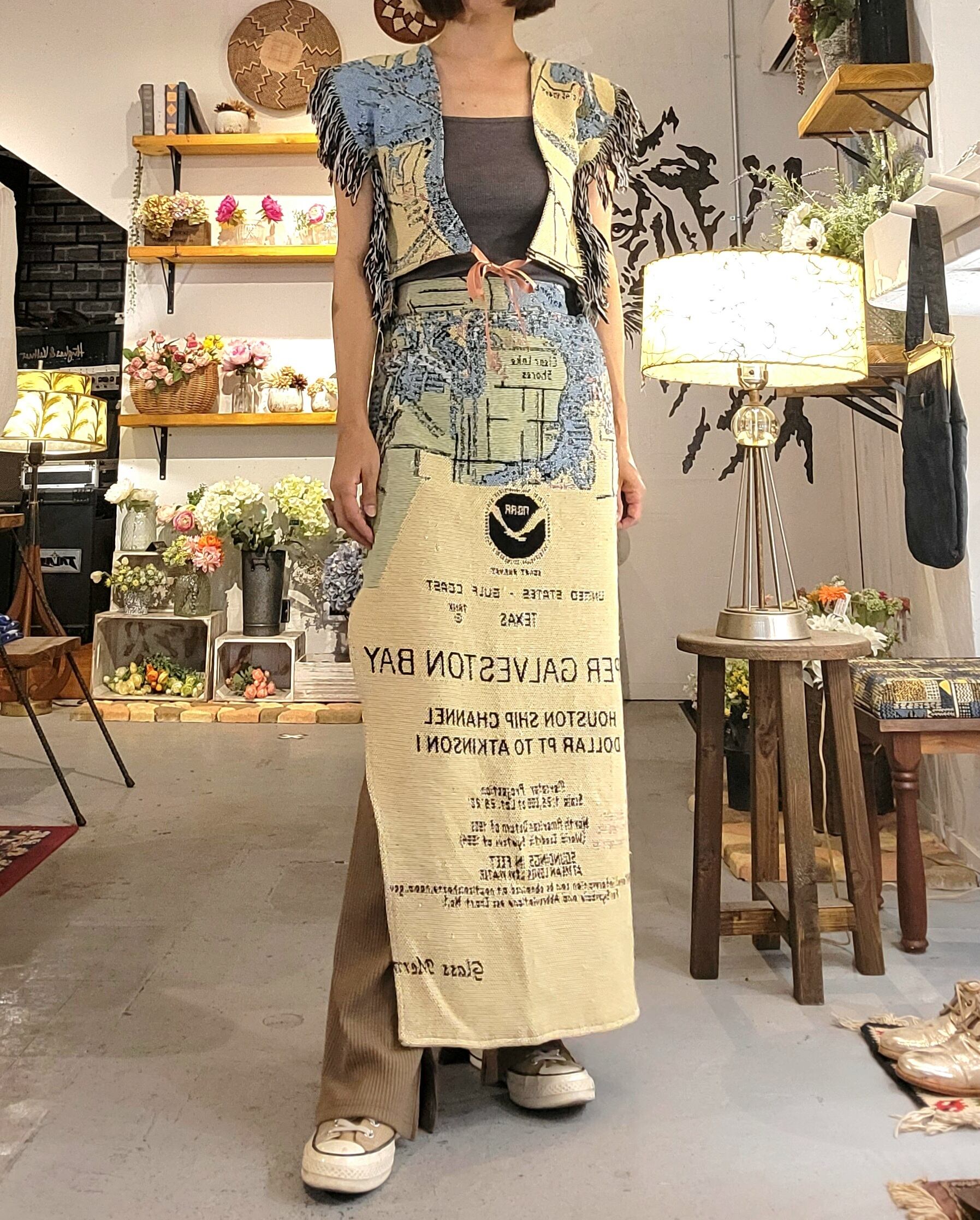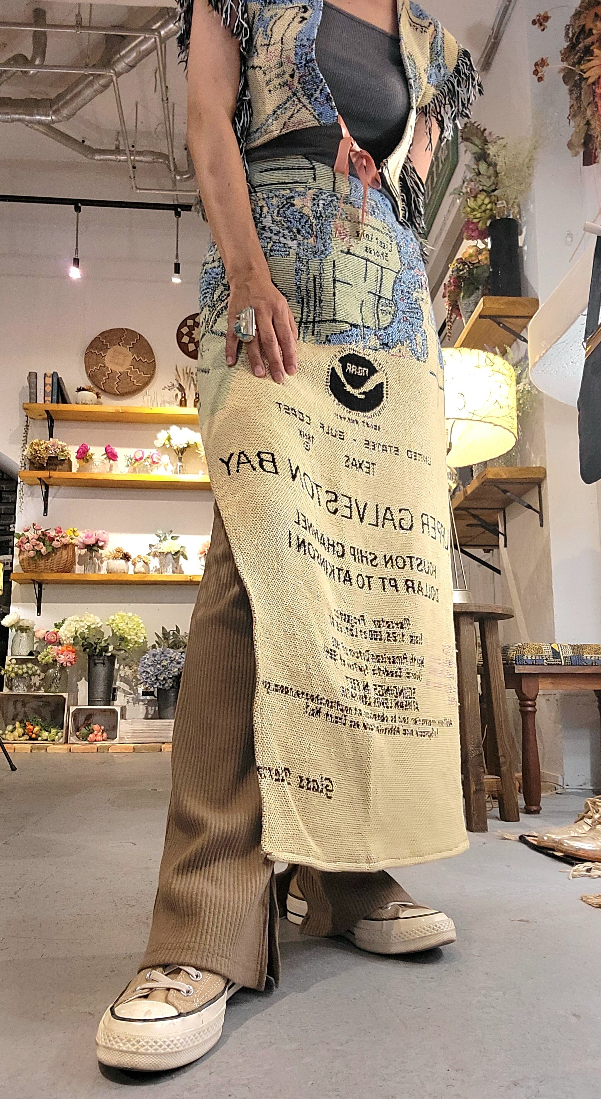 ヴィンテージのブランケットを使用したリメイクスカート。素材表記はありませんが、裏地は無く粗めのパイル地でやや起毛しているので真夏に着るには少し暑いかもしれません。ウエストはバックがゴム仕様。左サイドに深めのスリット入り、オープンスカートのようなデザインです。*織り生地表面のループが飛び出しているところが数ヶ所ありますので画像でご確認ください。