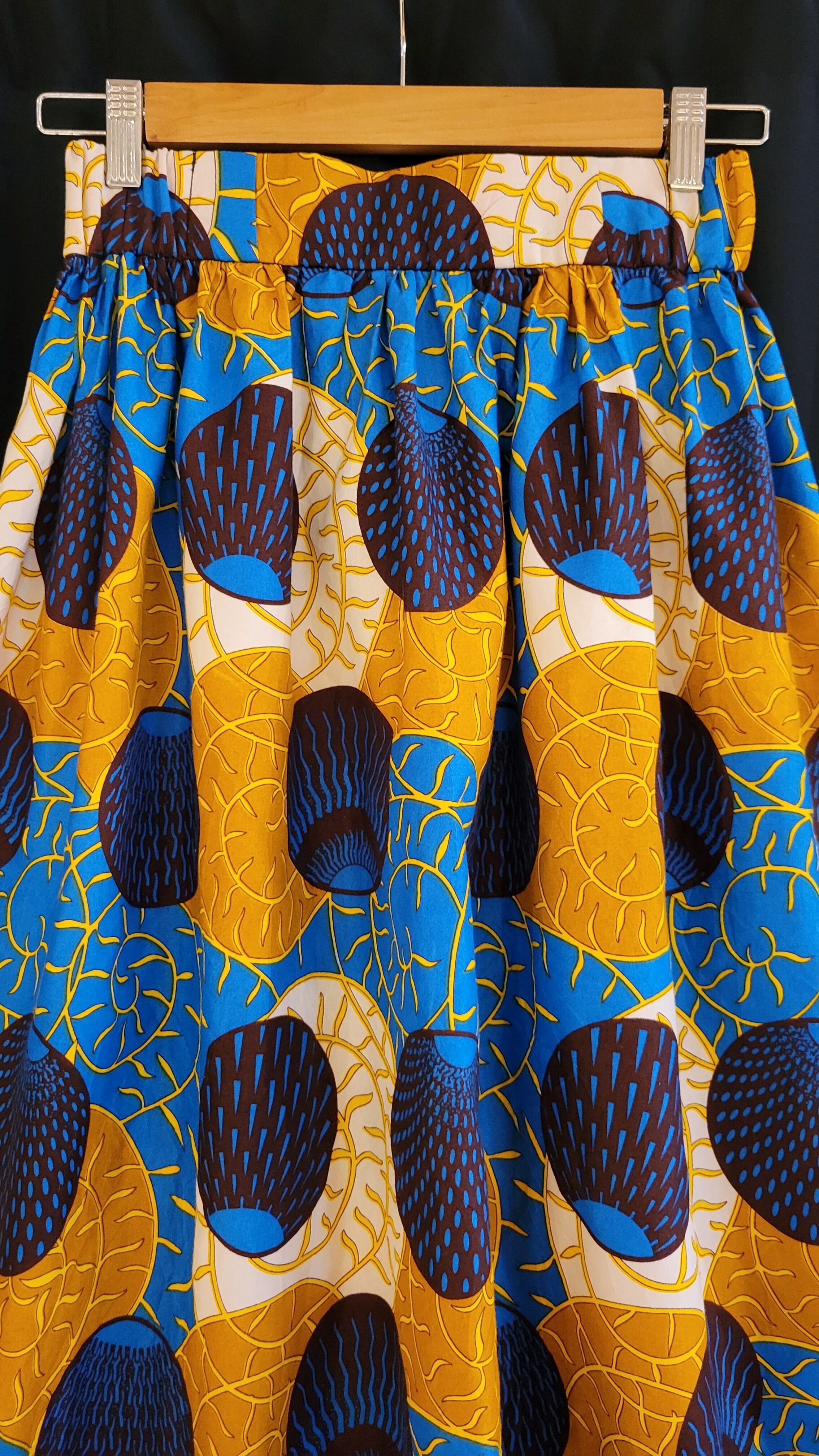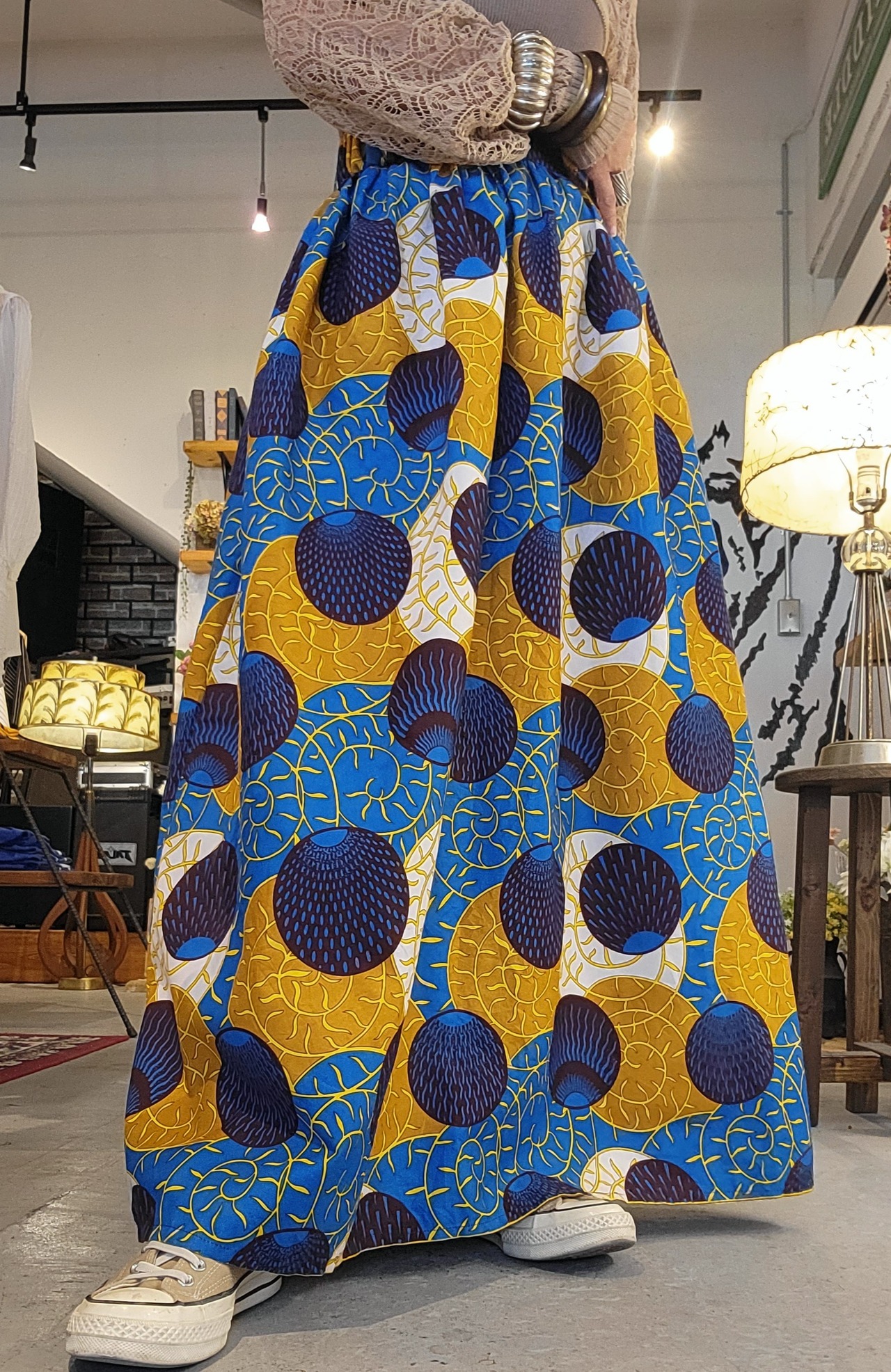 ヴィンテージのアフリカンプリントのギャザーマキシスカート。素材表記はありませんがコットンです。バックがゴム仕様でウエストサイズに幅があります。生地をたっぷり使用しており、素材の張り感も相まってボリュームあるシルエットをキープできます。