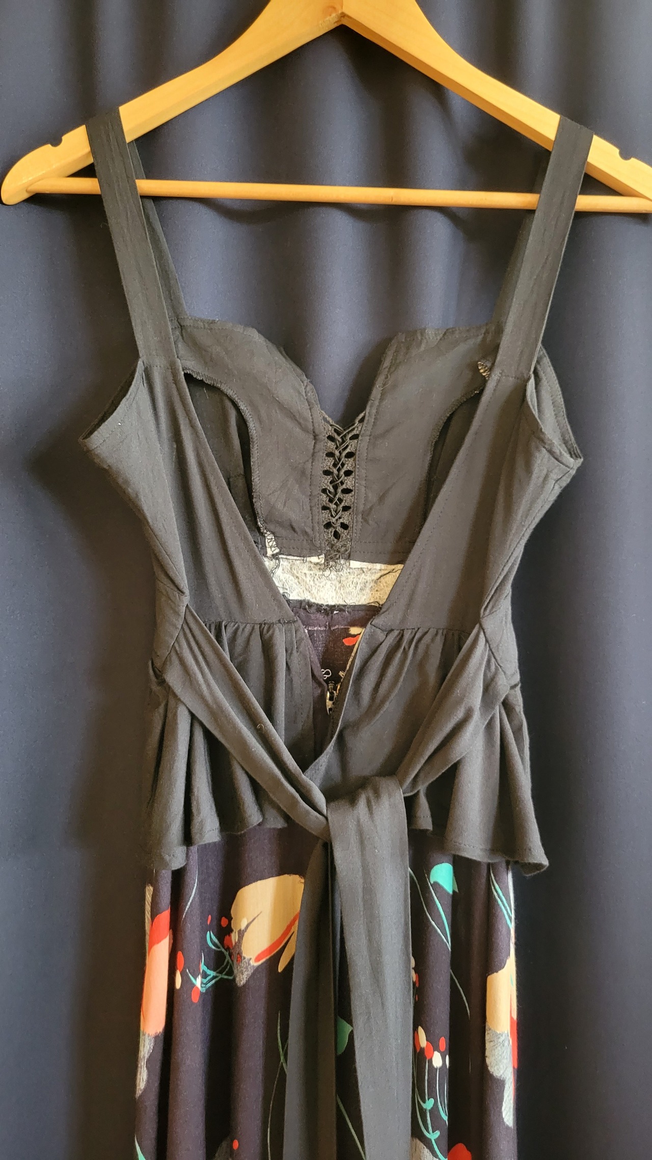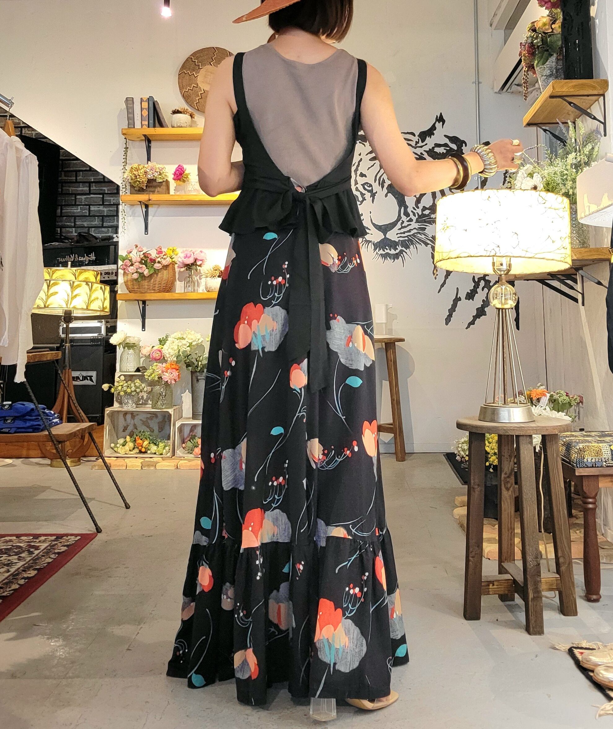 ヴィンテージのマキシドレス。素材表記はありませんが柔らかな肌触りでレーヨンのような落ち感があります。バックファスナーは腰の位置まで上がり、背中部分はオープンになります。胸元のカットラインやレースアップ、ハイウエスト位置のペプラムデザイン等、ディテールの可愛らしいヴィンテージドレスです。