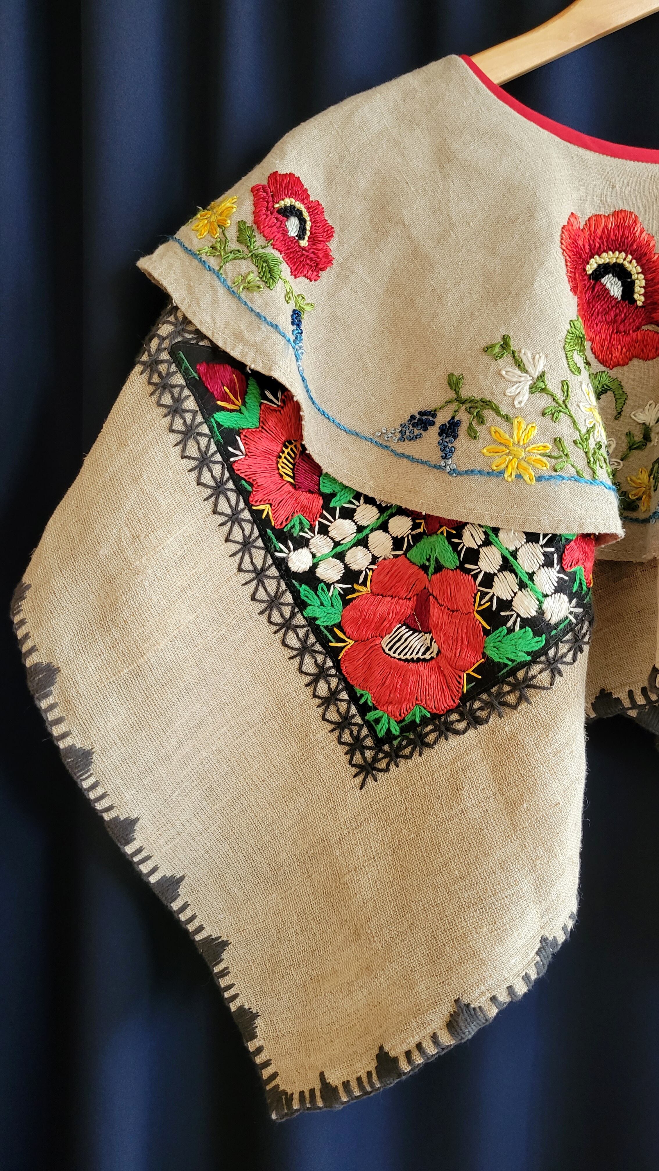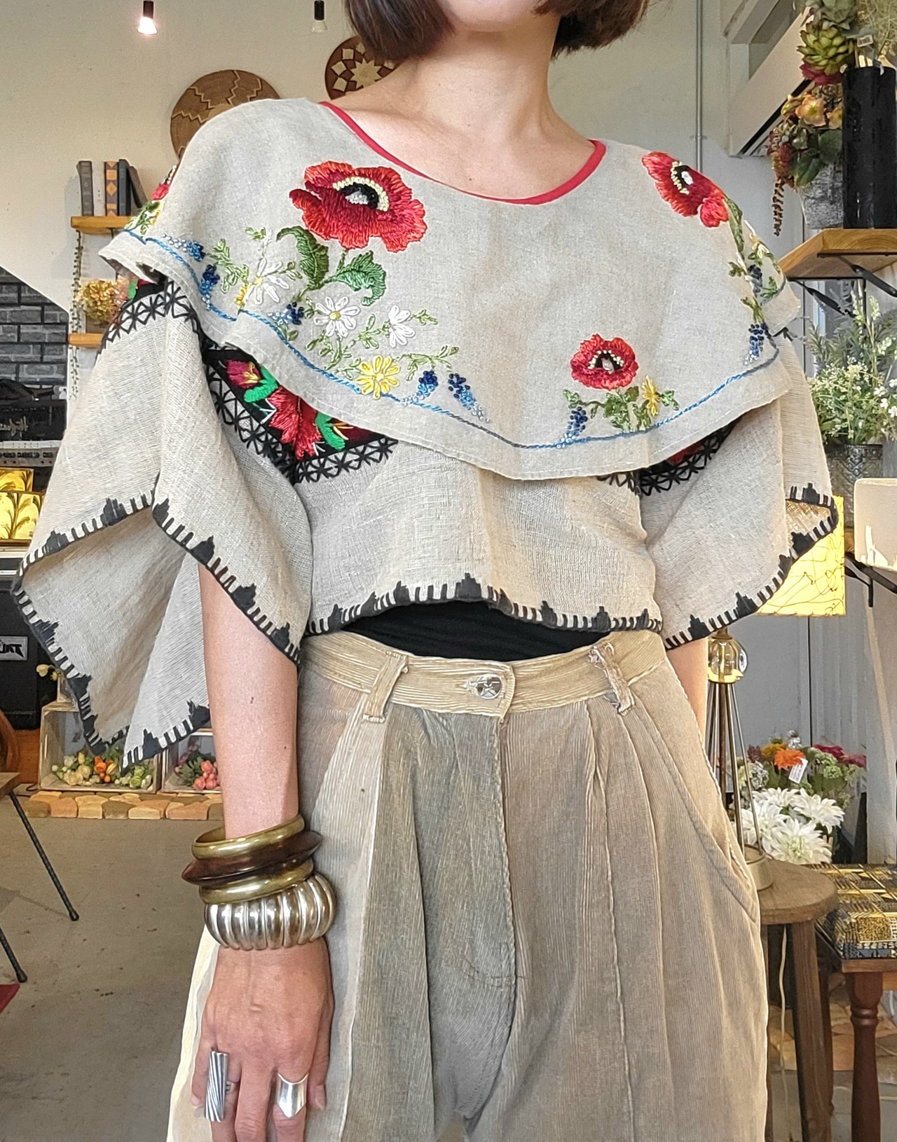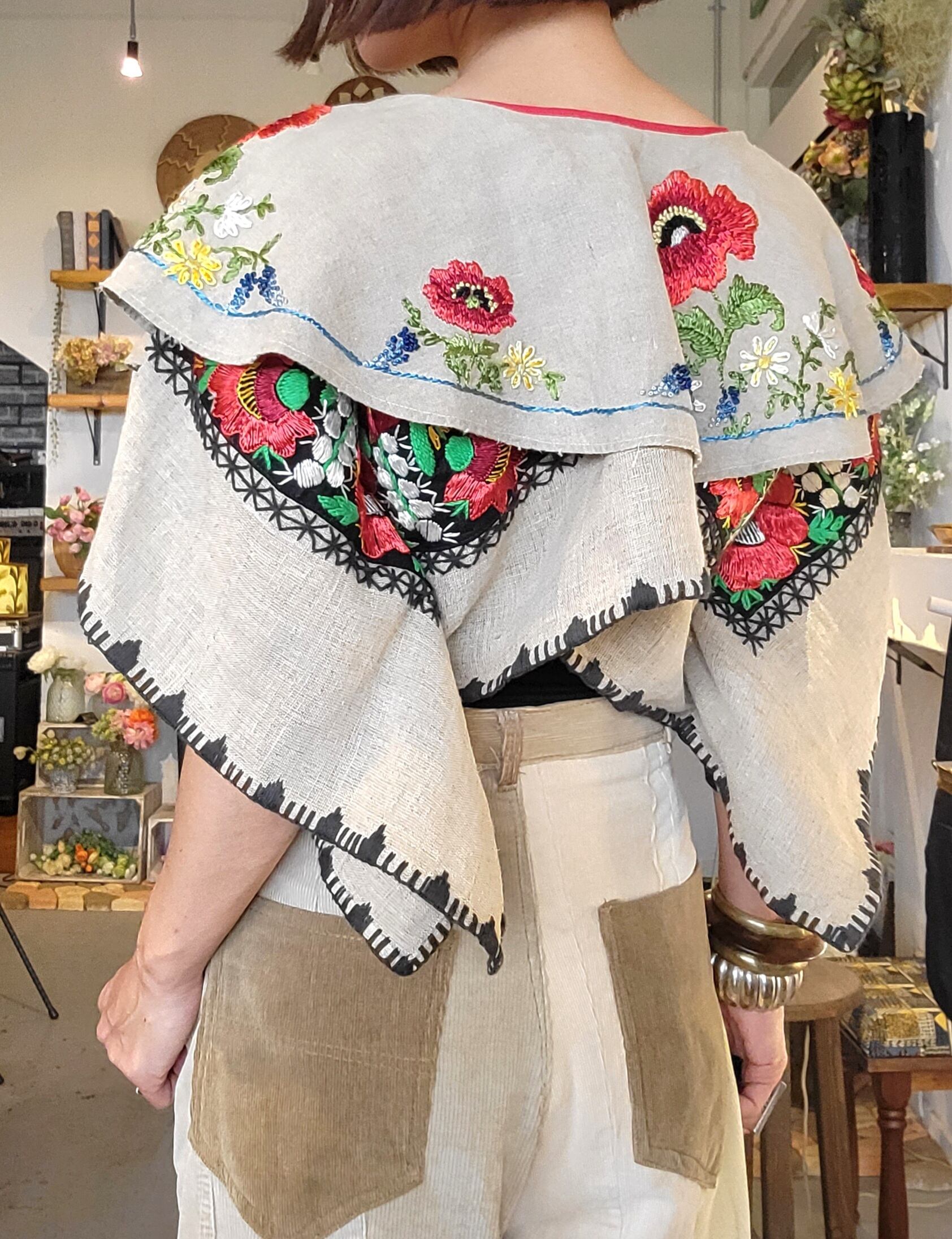 ヴィンテージのテーブルクロスを使用したリメイクプルオーバートップス。素材はリネンです。しっかり張り感があるため波打つようなフレアシルエットがかないます。ポンチョのようにも見えますがサイドが縫われており腕が通せるため、着用時にずれることなく安定感があります。実際の色味は着用画像に近いです。手刺繍が可愛らしく、ショート丈のためハイウエストボトムとの相性も抜群です。