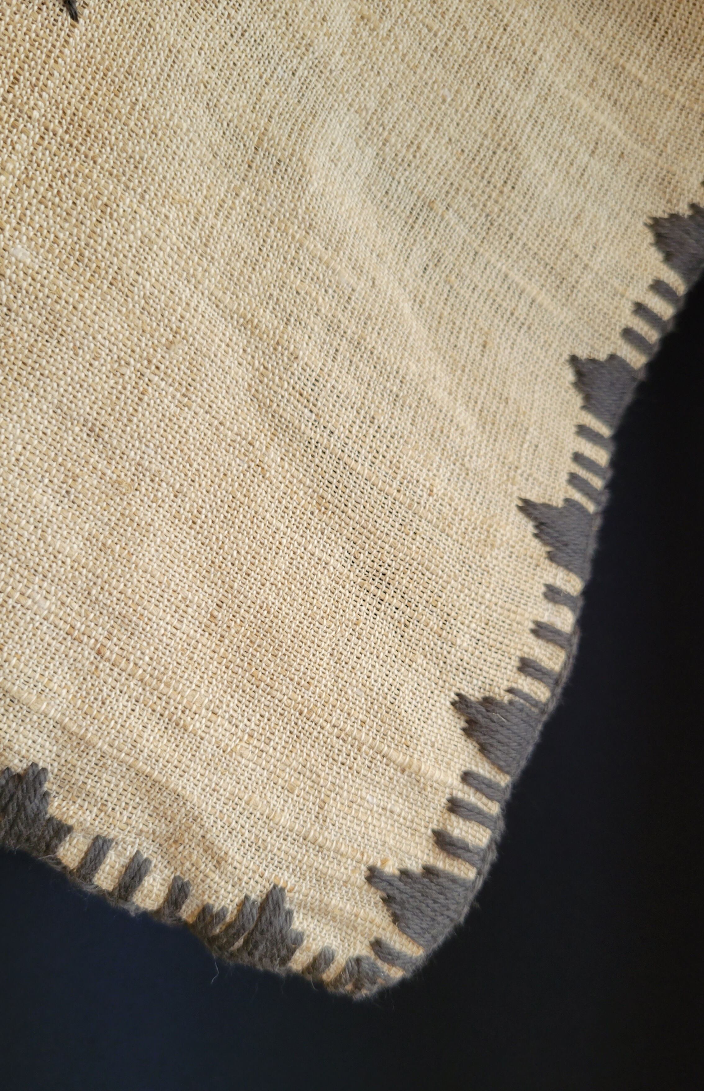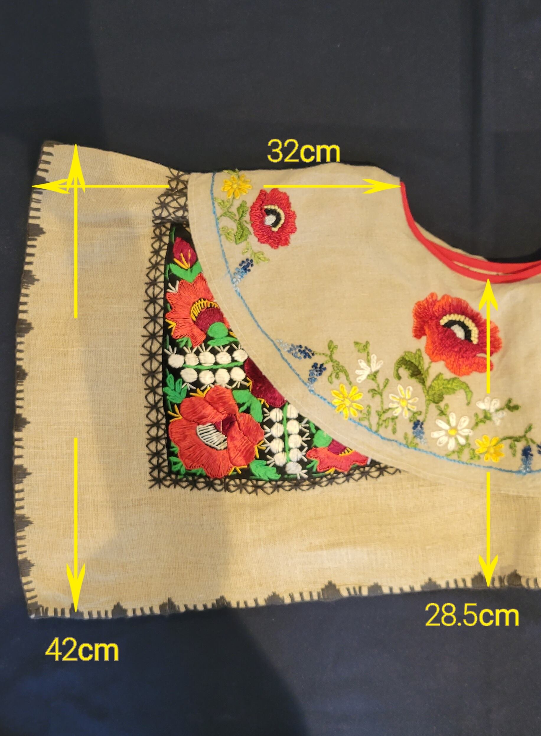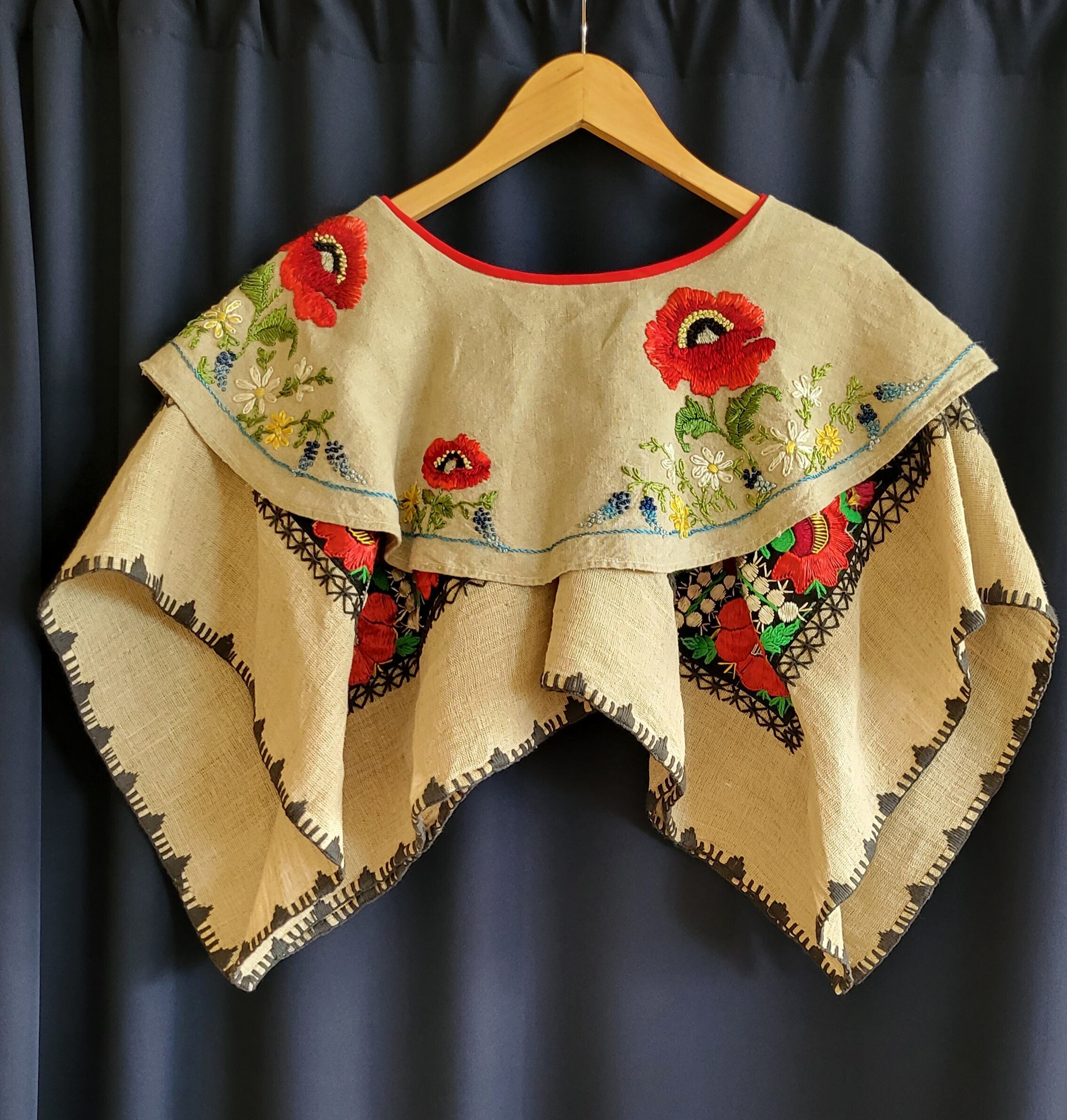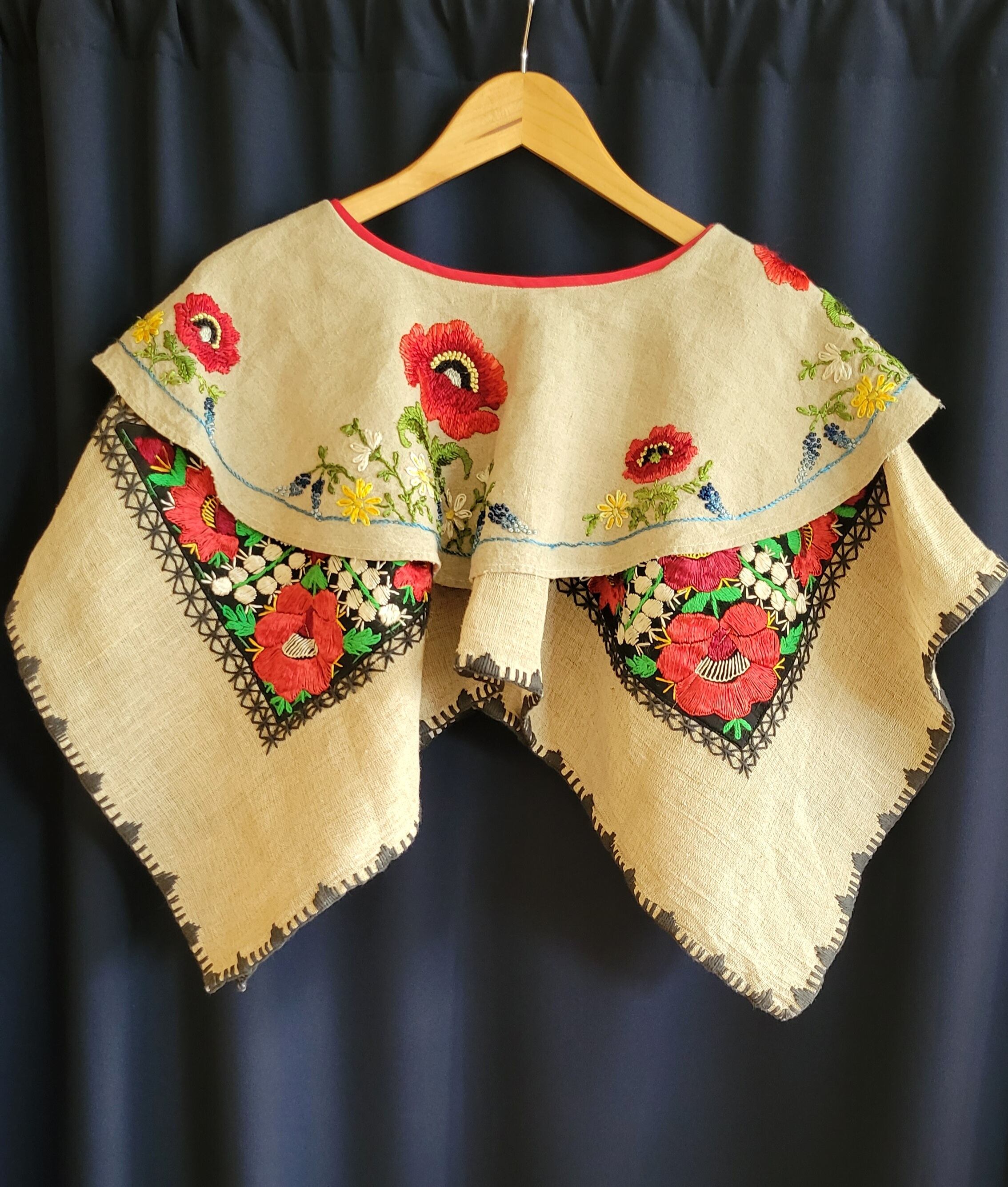 ヴィンテージのテーブルクロスを使用したリメイクプルオーバートップス。素材はリネンです。しっかり張り感があるため波打つようなフレアシルエットがかないます。ポンチョのようにも見えますがサイドが縫われており腕が通せるため、着用時にずれることなく安定感があります。実際の色味は着用画像に近いです。手刺繍が可愛らしく、ショート丈のためハイウエストボトムとの相性も抜群です。